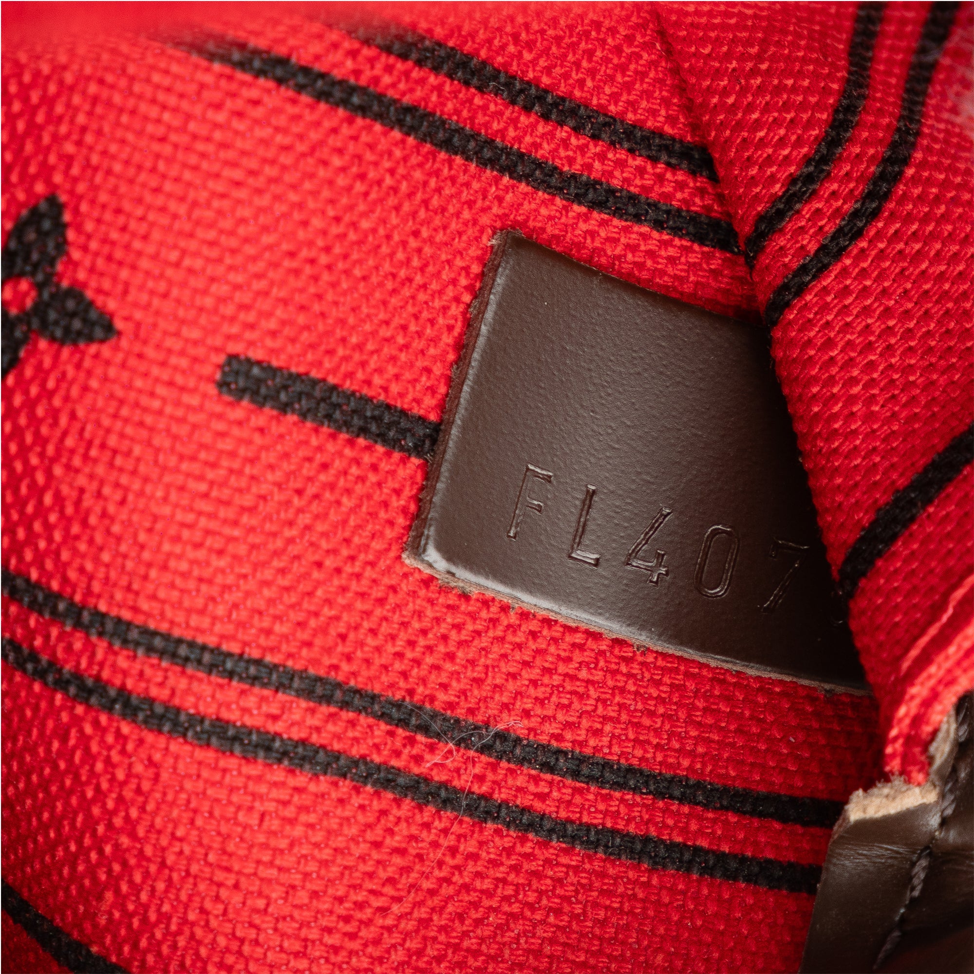 Product Details: Brown LV Damier Ebene Neverfull GM Tote Bag. The Neverfull GM features a damier canvas body with leather trim, flat leather shoulder straps, an open top with lobster claw hook closure, and an interior zip pocket. 12.6″ L x 15.7″ W x 7.9″ D, 8.3″ drop. Serial number FL4078.