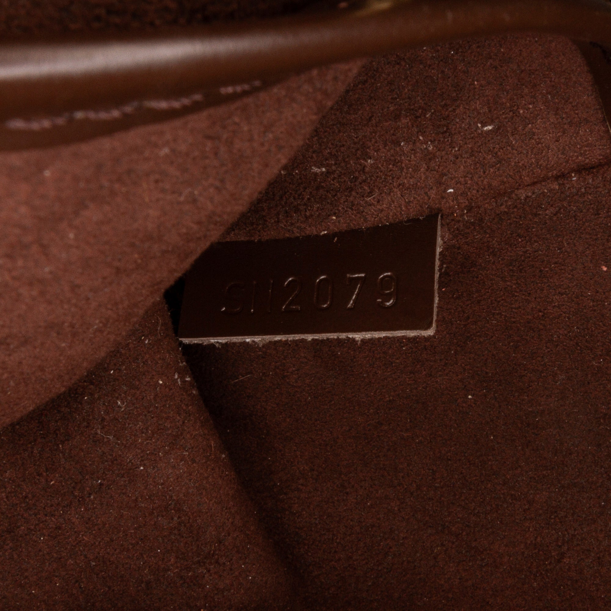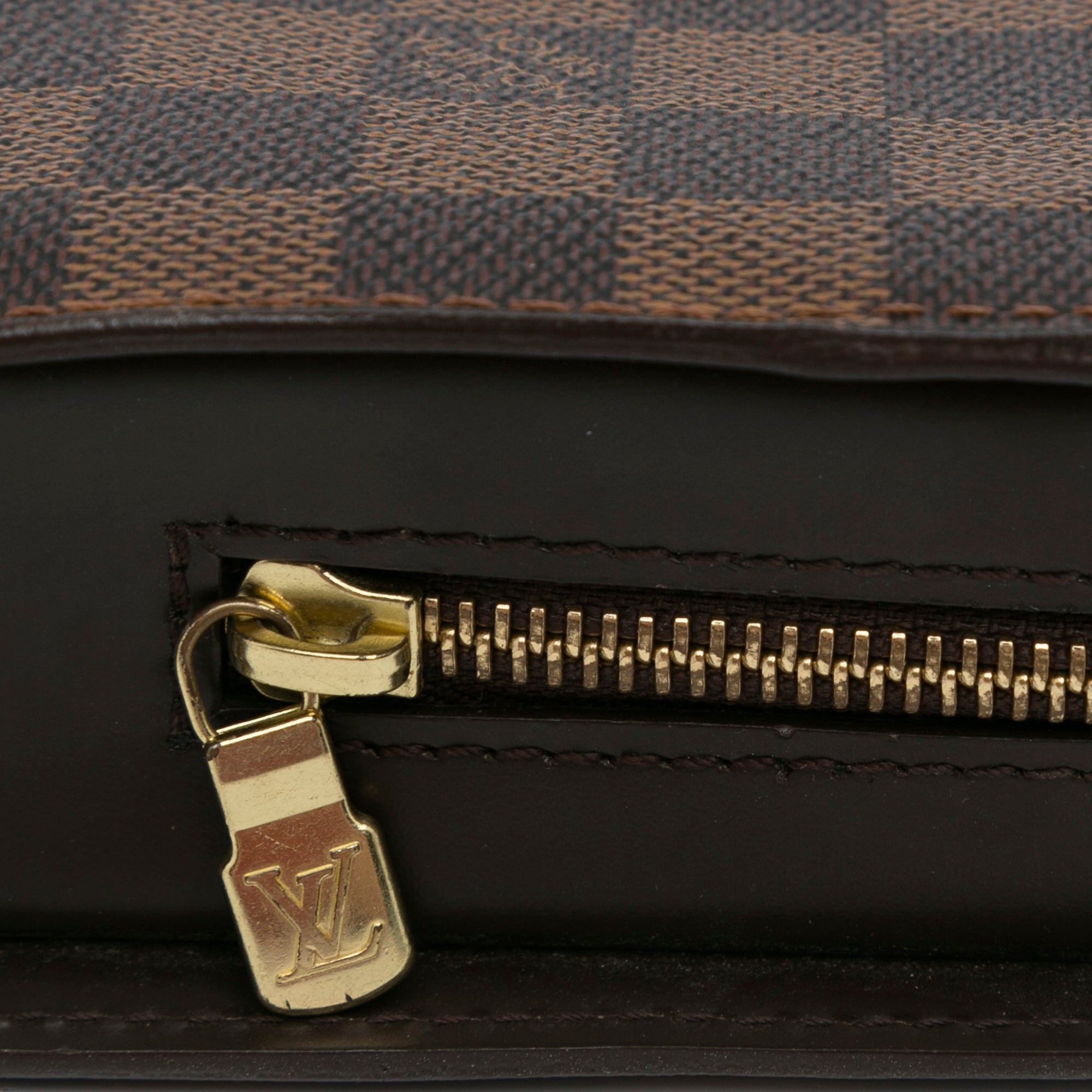 Product Details: Brown LV Damier Ebene Saint Louis Pochette Clutch Bag. The Saint Paul features a damier ebene canvas body with leather trim, flat leather wrist strap, and exterior slip pockets. 5.9″ L x 9.6″ W x 1.6″ D, 8.7″ drop. Serial number SN2079.
