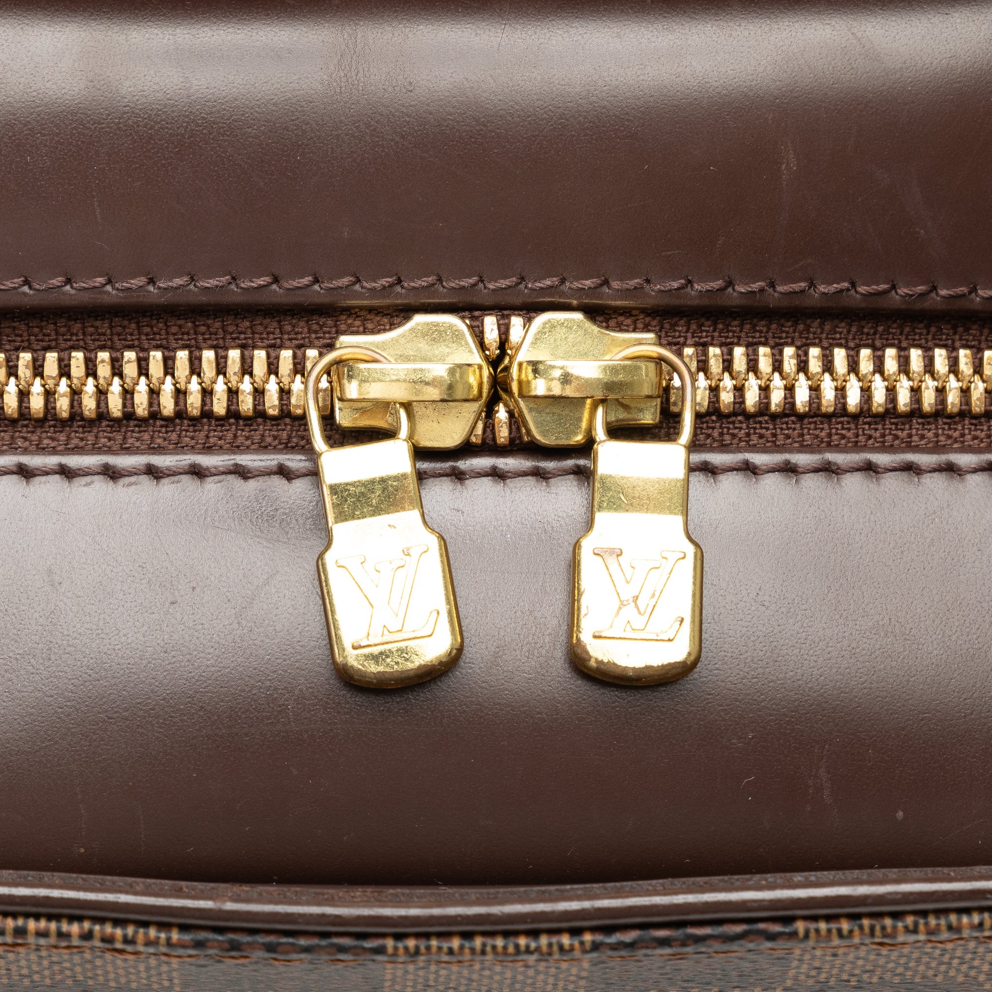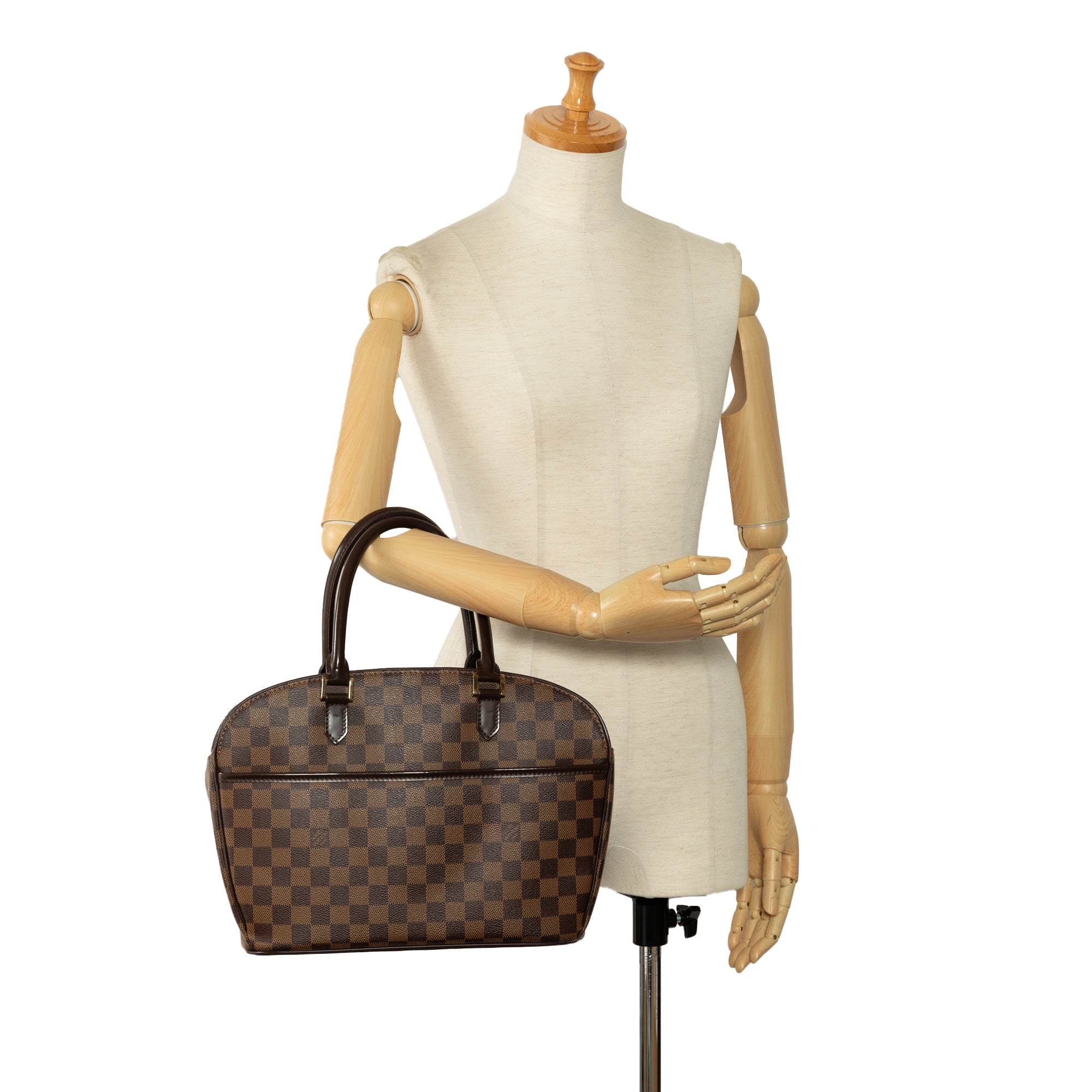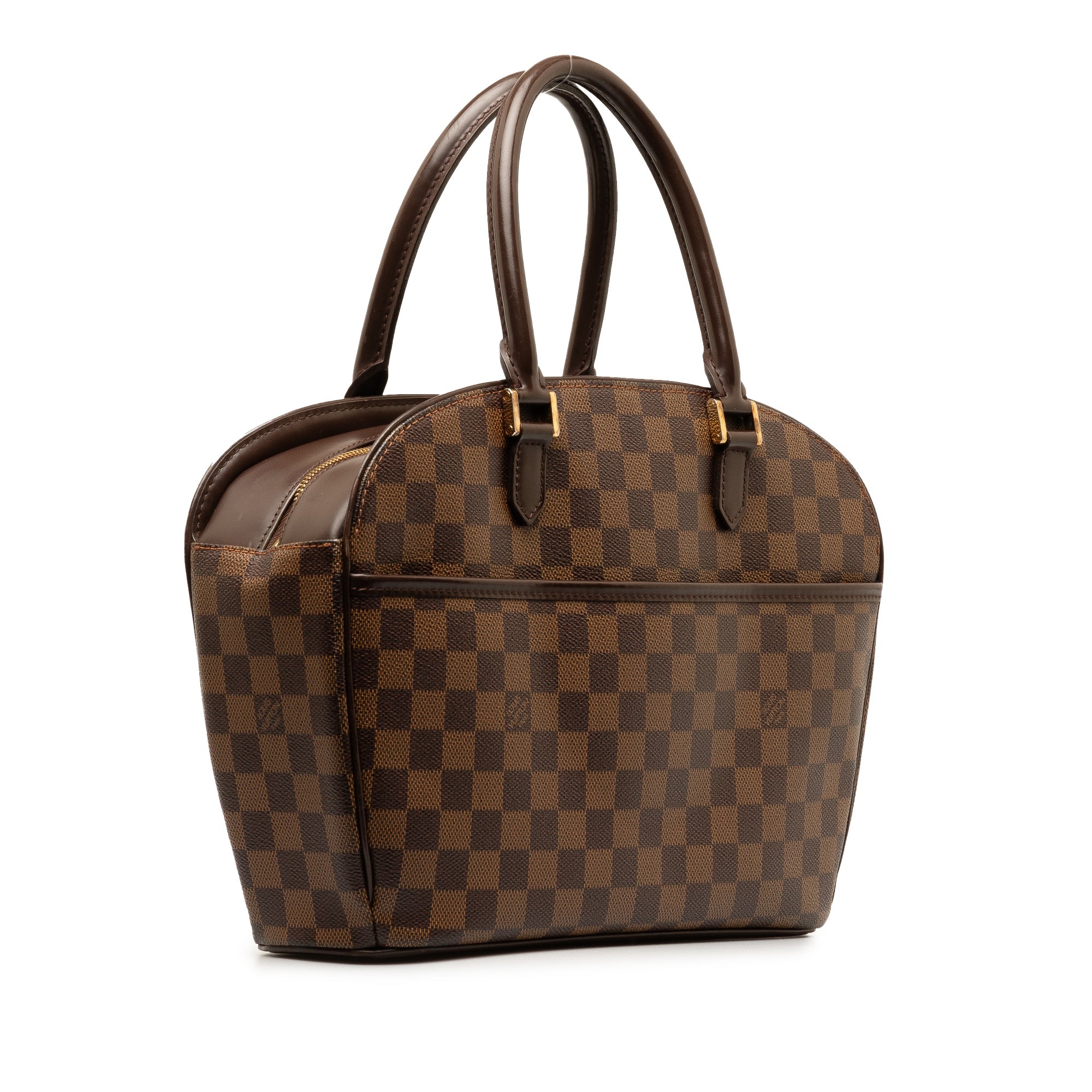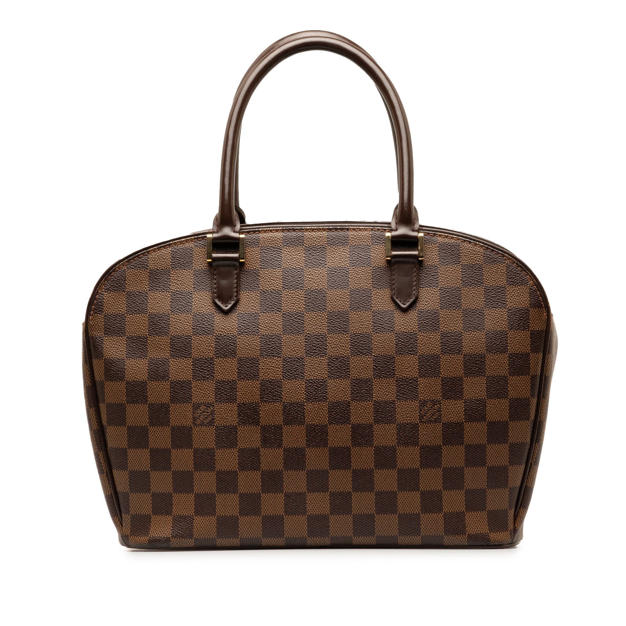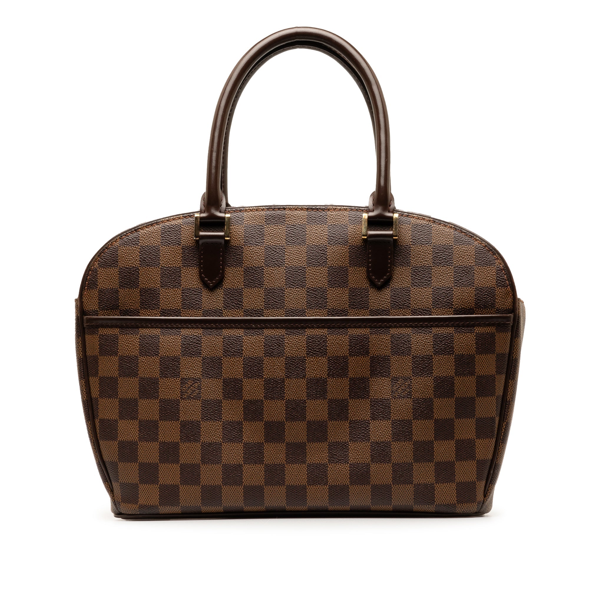 Product Details: Brown LV Damier Ebene Sarria Horizontal Handbag. The Sarria Horizontal features a damier ebene canvas body with leather trim, rolled leather handles, a top zip closure, an exterior open pocket, and interior slip pockets. 9.4″ L x 11.4″ W x 3.7″ D, 5.3″ drop. Serial number AR0085.