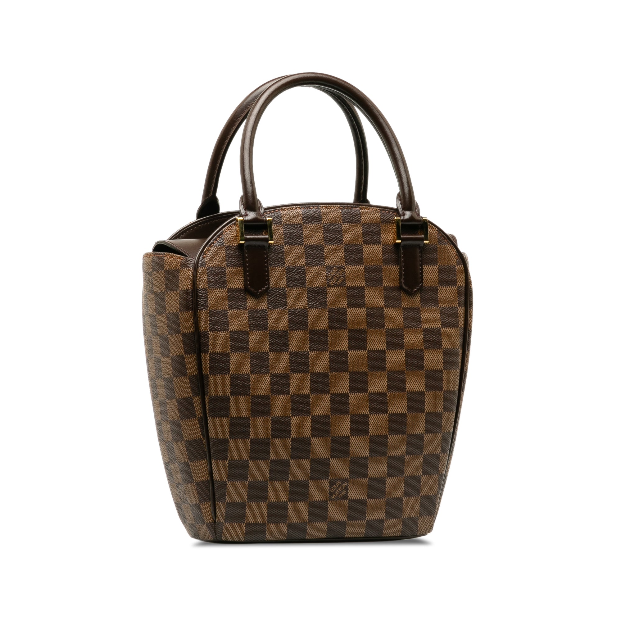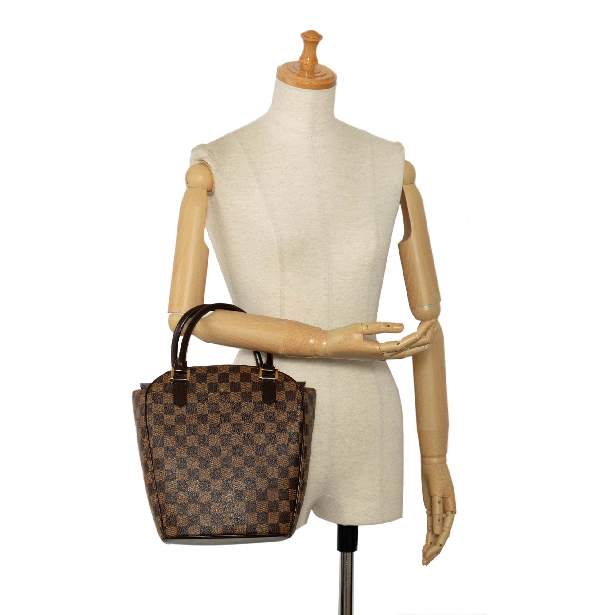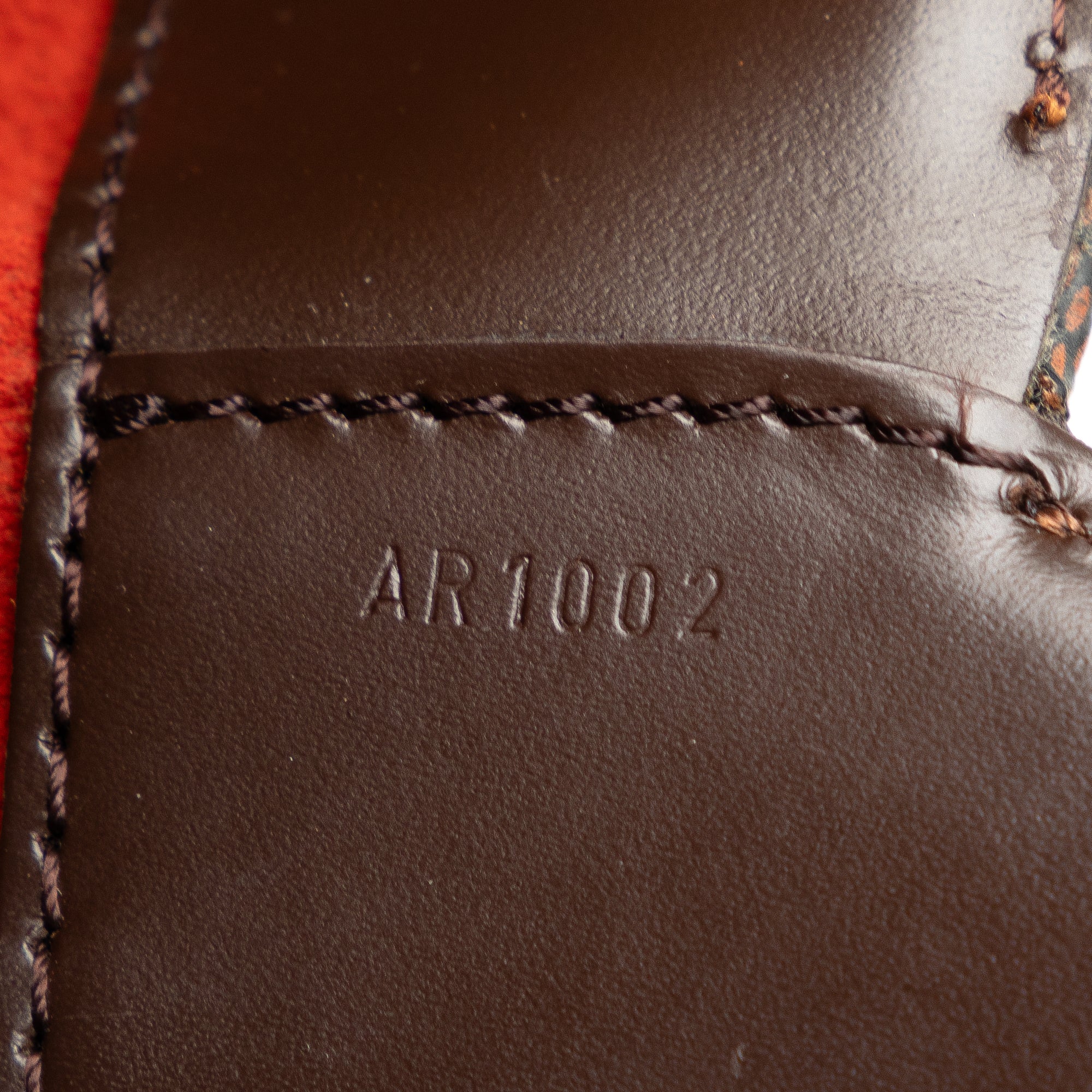 Product Details: Brown LV Damier Ebene Sarria Seau Handbag. The Sarria Seau features a damier canvas body, rolled leather handles, a fold-in flap leather closure, and interior zip and slip pockets. 10.2″ L x 9.1″ W x 3.1″ D, 3.9″ drop. Serial number AR1002.