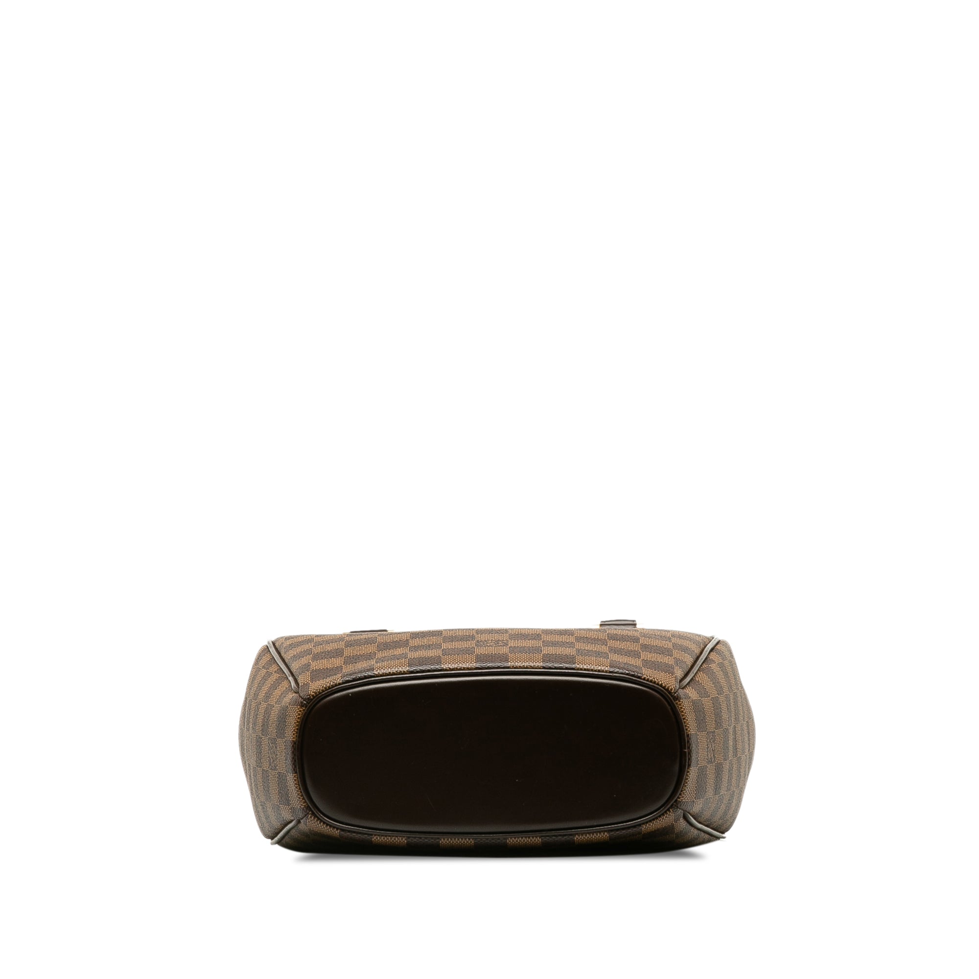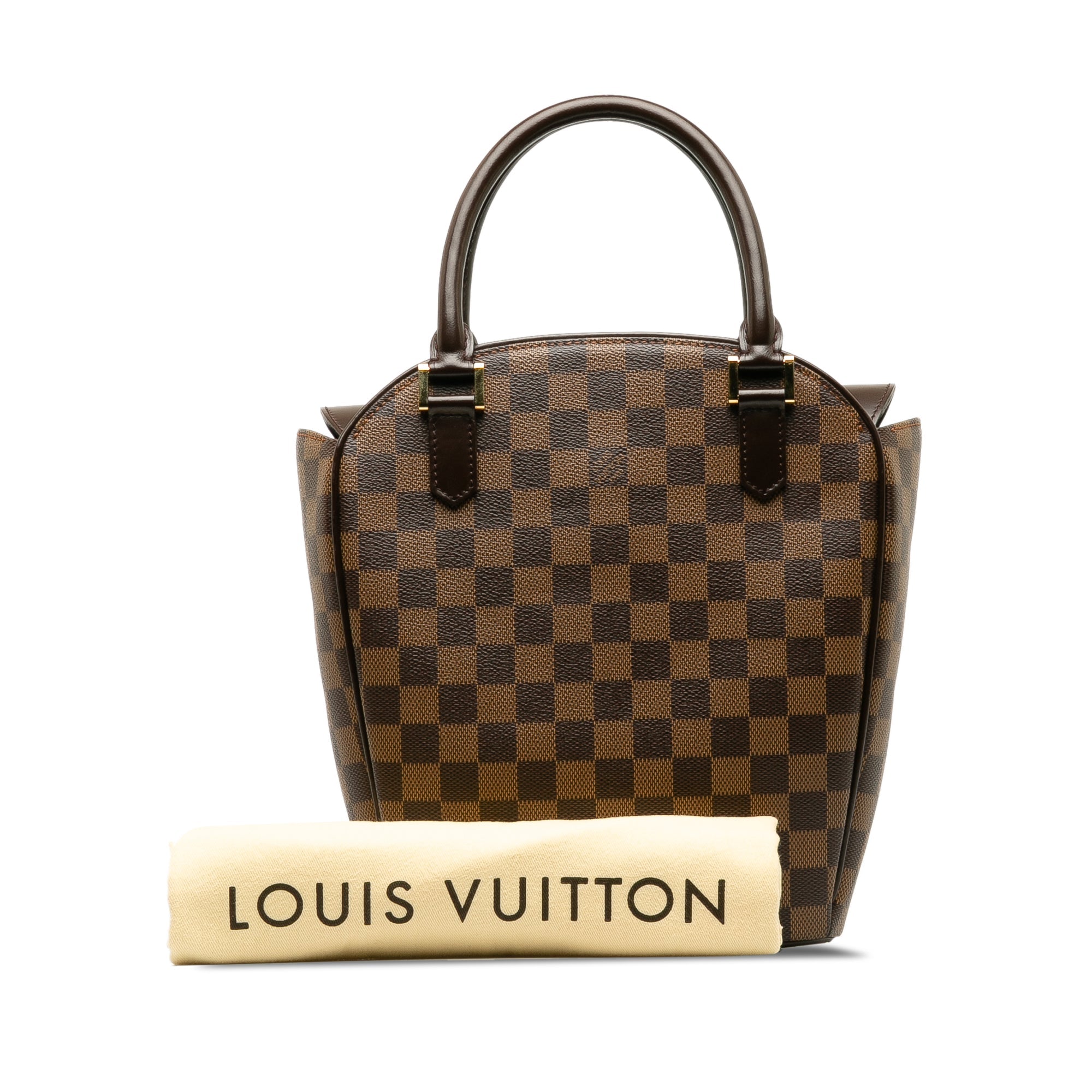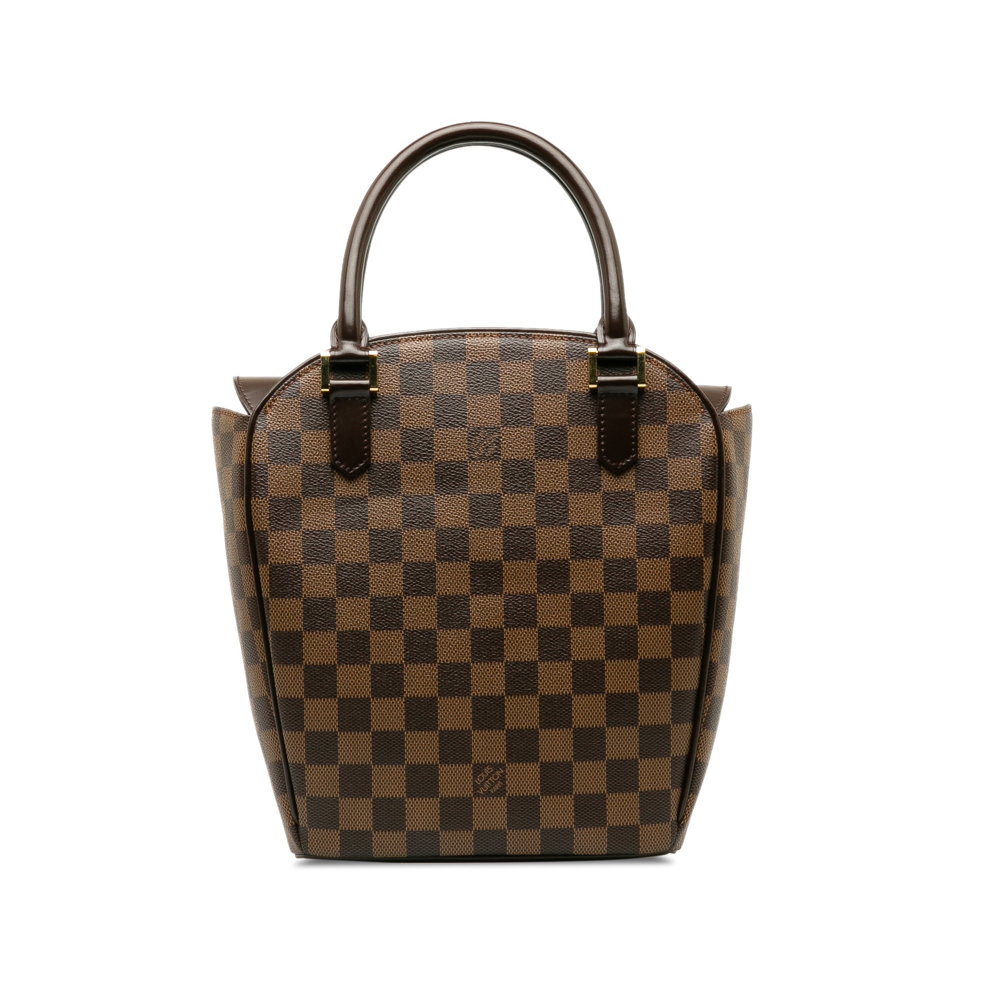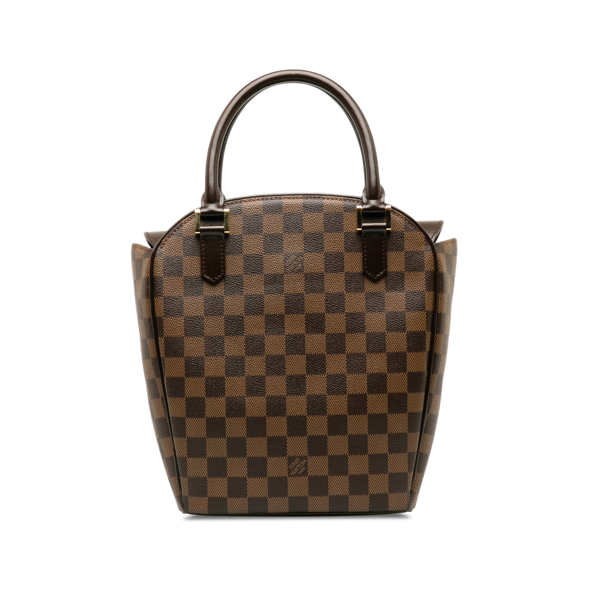 Product Details: Brown LV Damier Ebene Sarria Seau Handbag. The Sarria Seau features a damier canvas body, rolled leather handles, a fold-in flap leather closure, and interior zip and slip pockets. 10.2″ L x 9.1″ W x 3.1″ D, 3.9″ drop. Serial number AR1002.