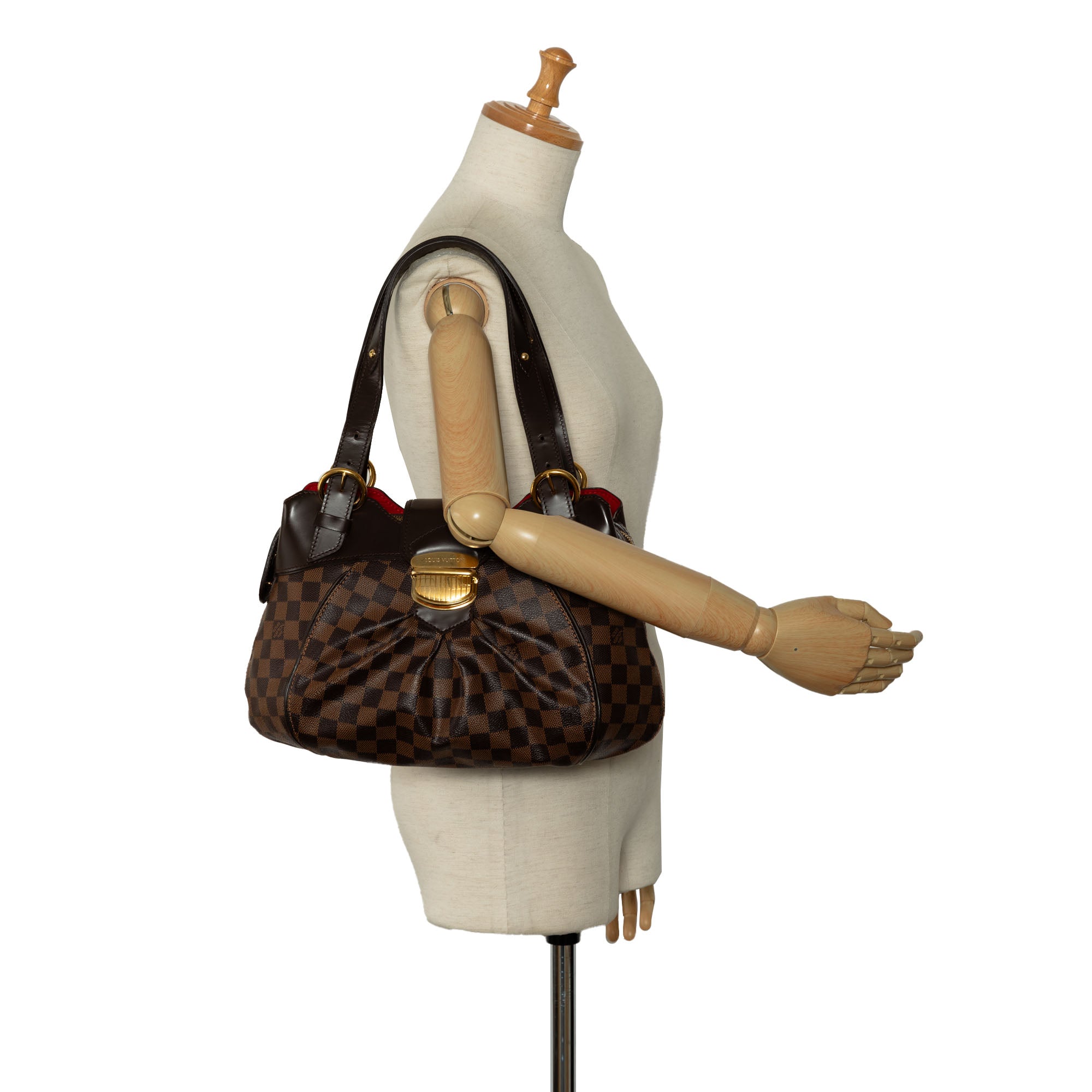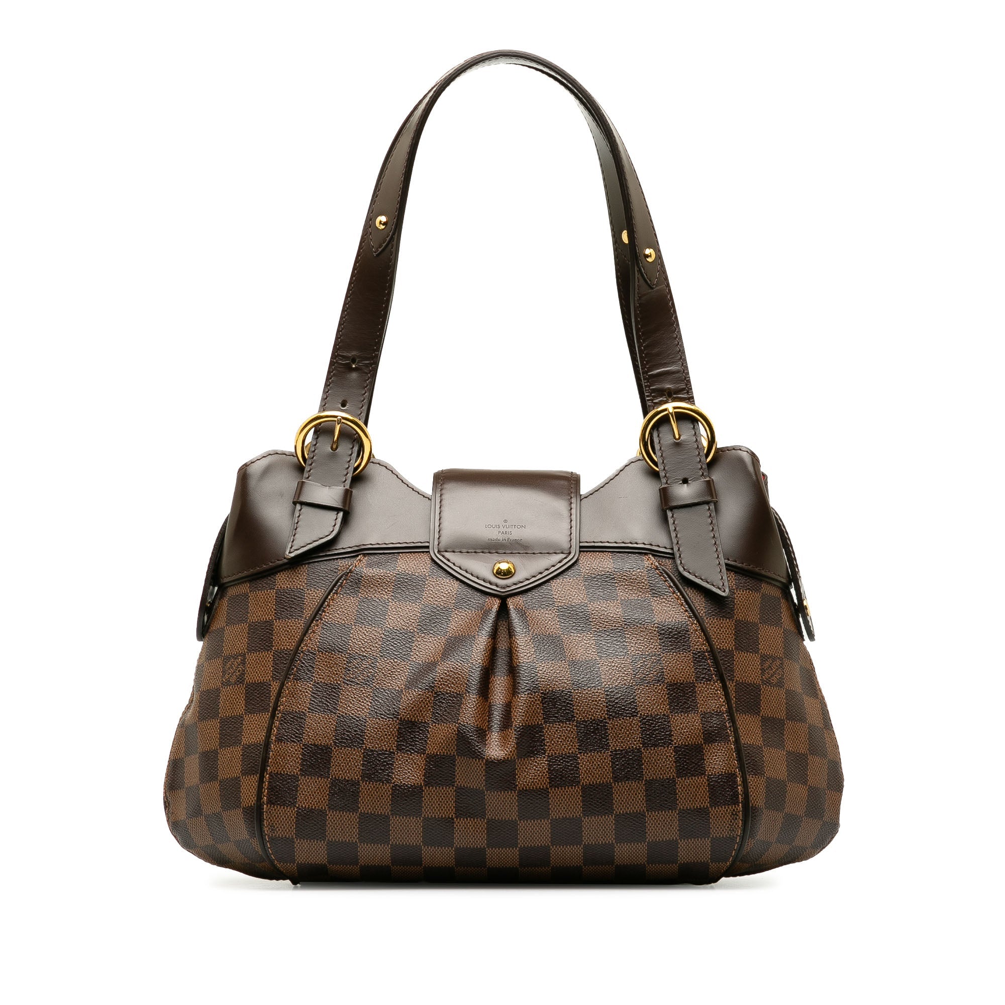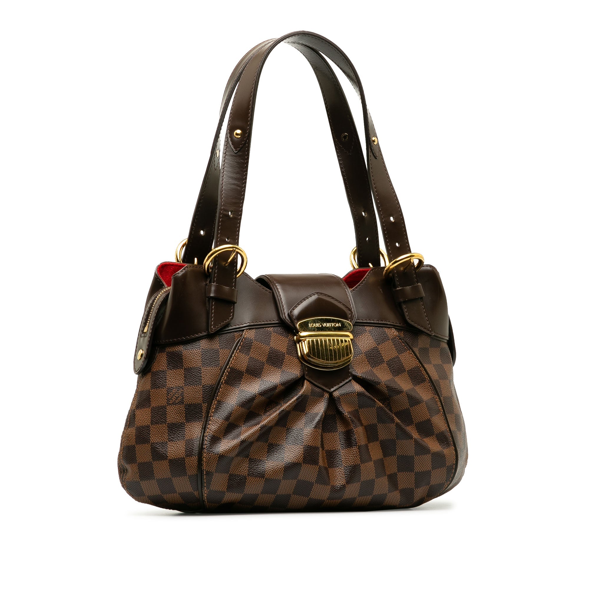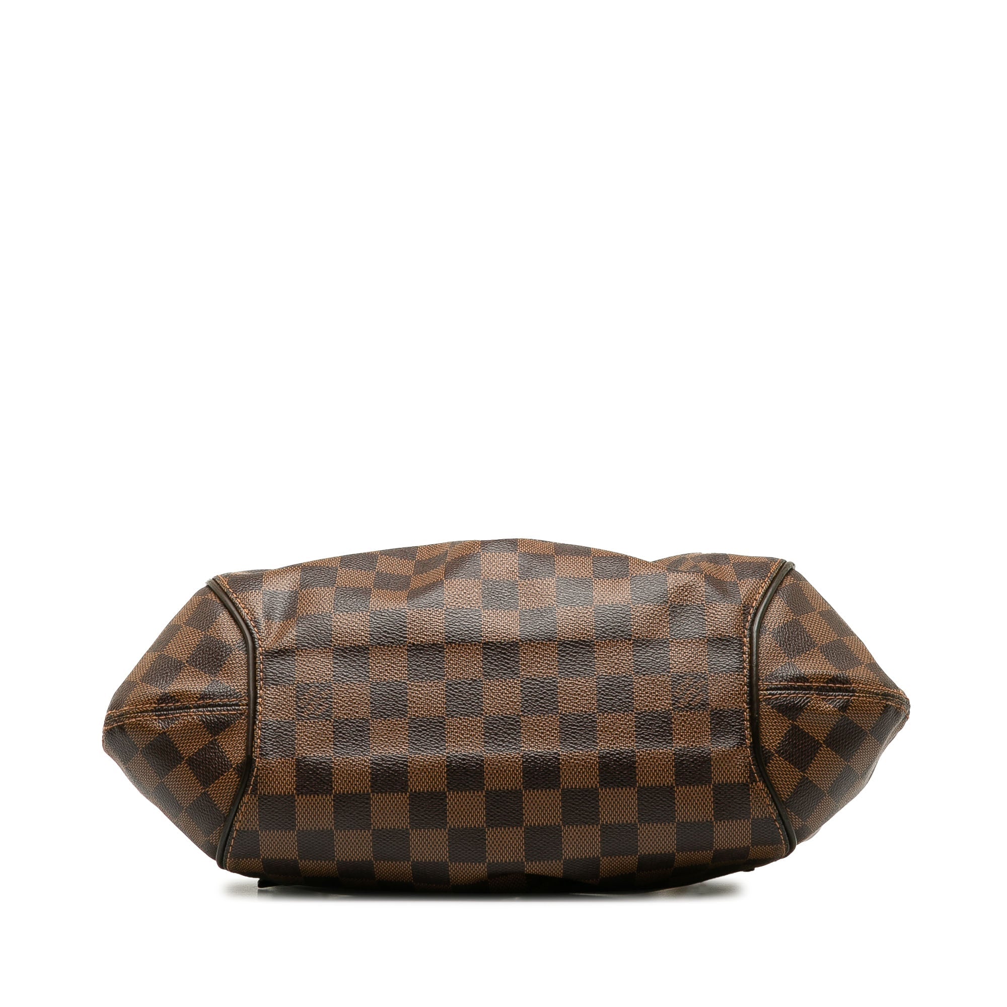 Product Details: Brown LV Damier Ebene Sistina PM Shoulder Bag. The Sistina PM features a damier canvas body, flat leather handles, front strap with push lock closure, interior compartments with top zip closure, and interior open pockets. 14.6″ L x 3.1″ W x 10.6″ D. Serial number FL1141.