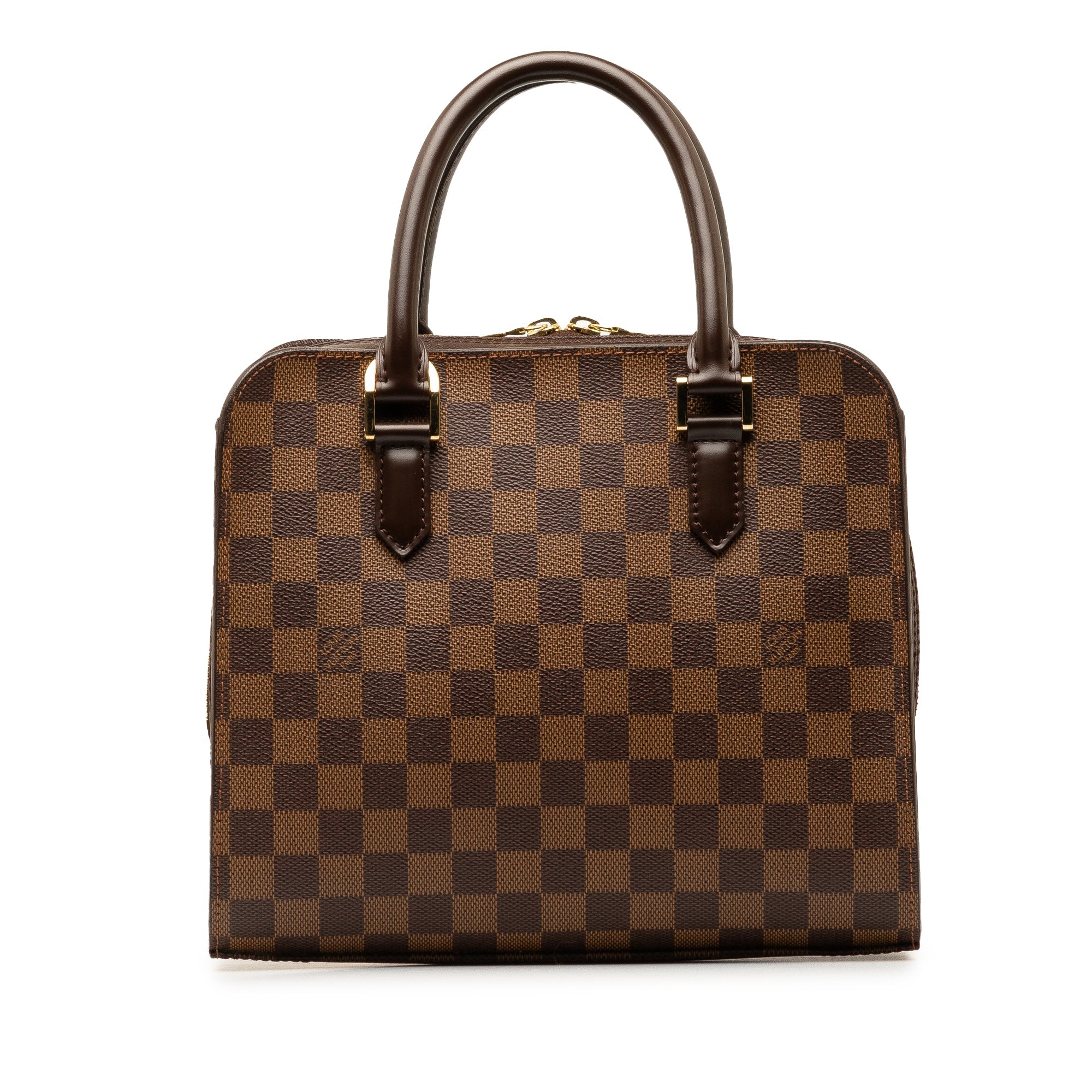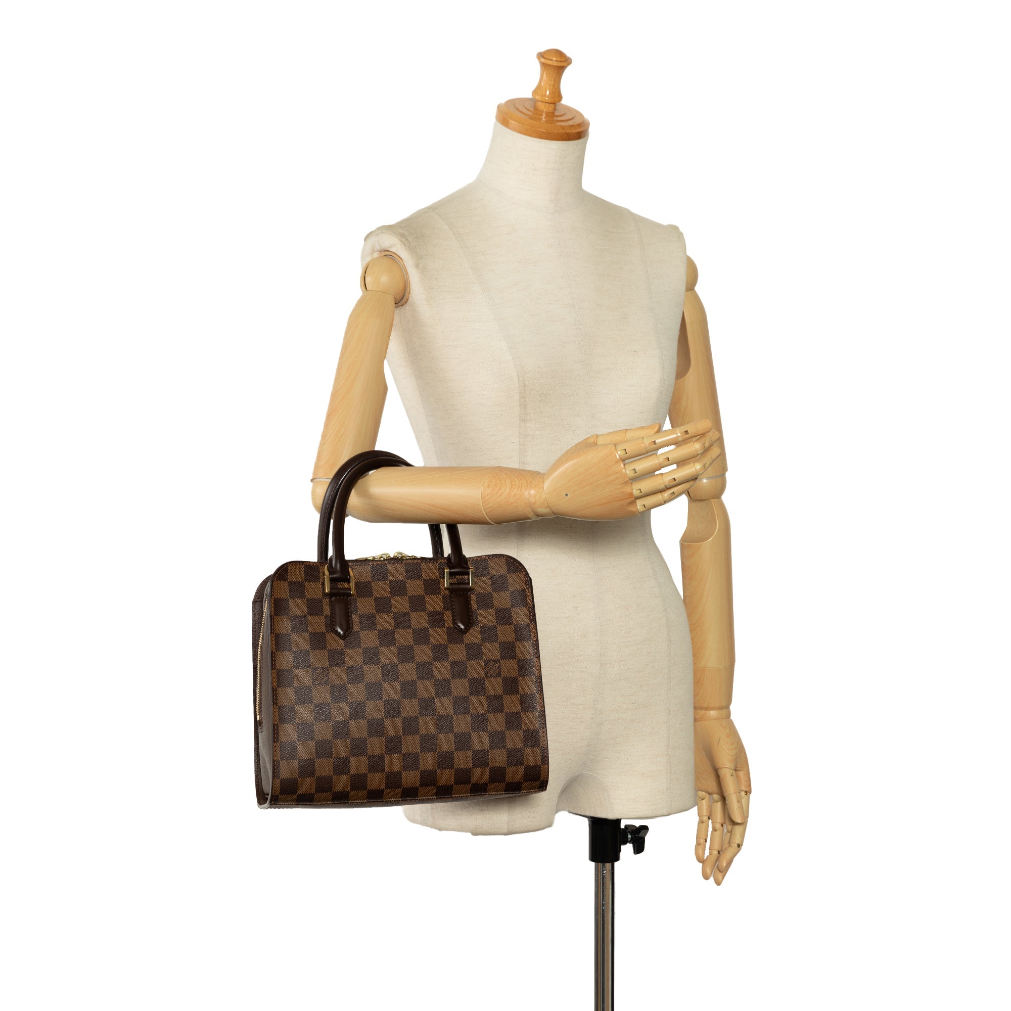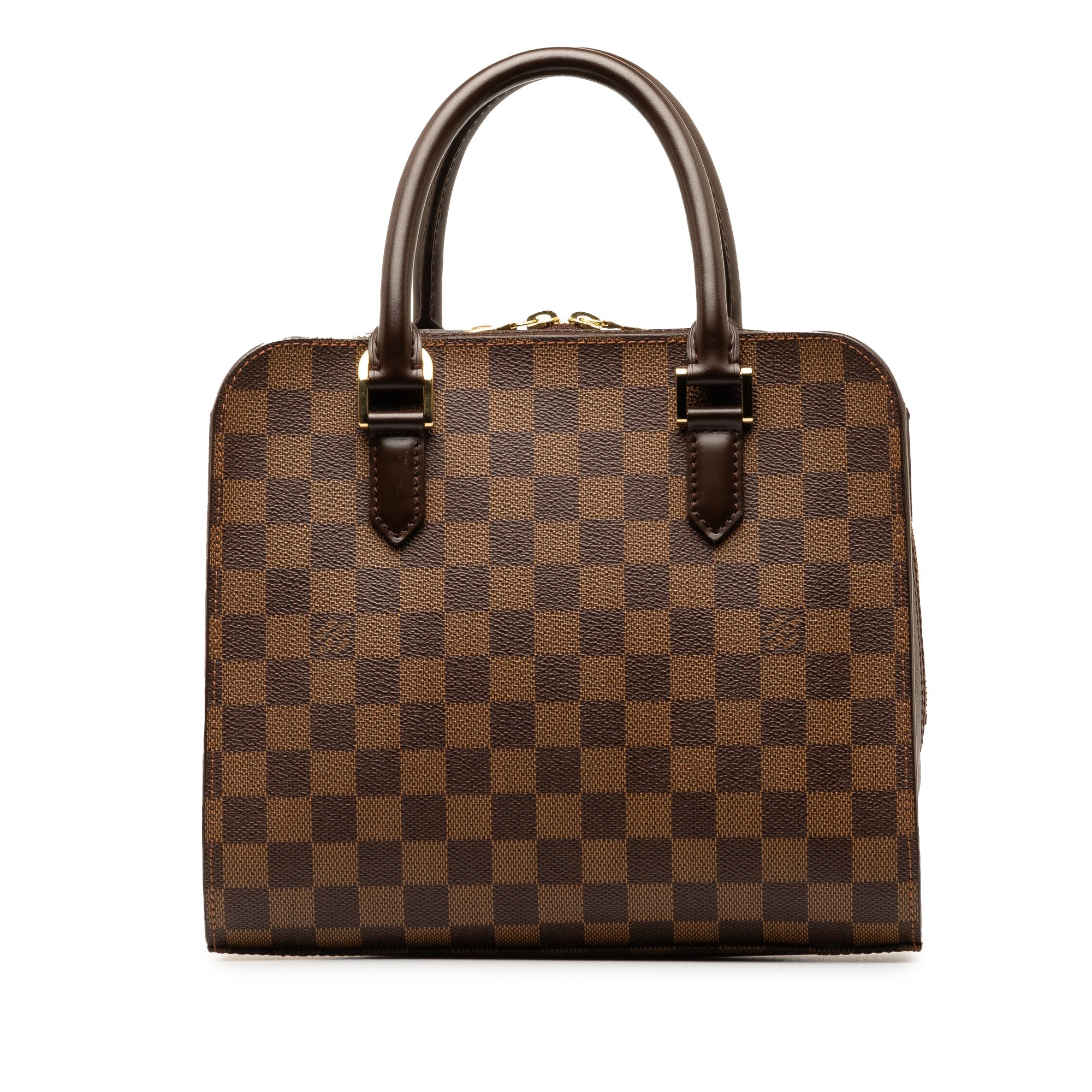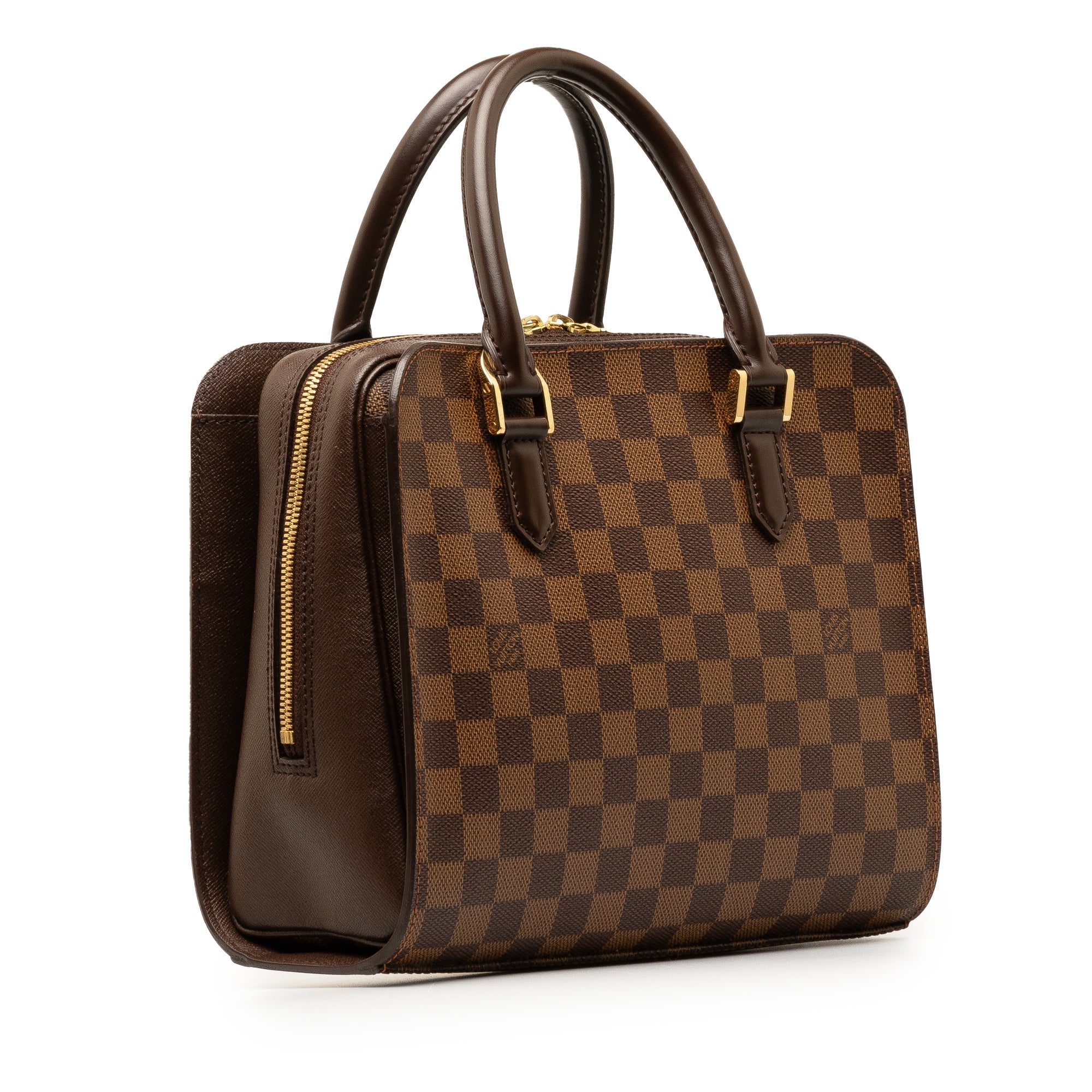 Product Details: Brown LV Damier Ebene Triana Handbag. The Triana features a damier ebene canvas body, rolled leather handles, a top zip closure, and an interior zip pocket. 10.2″ L x 9.1″ W x 4.3″ D, 4.7″ drop. Serial number VI0015.