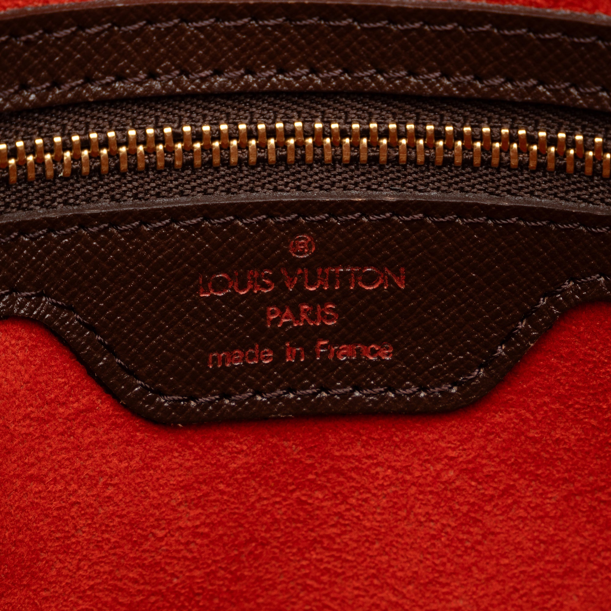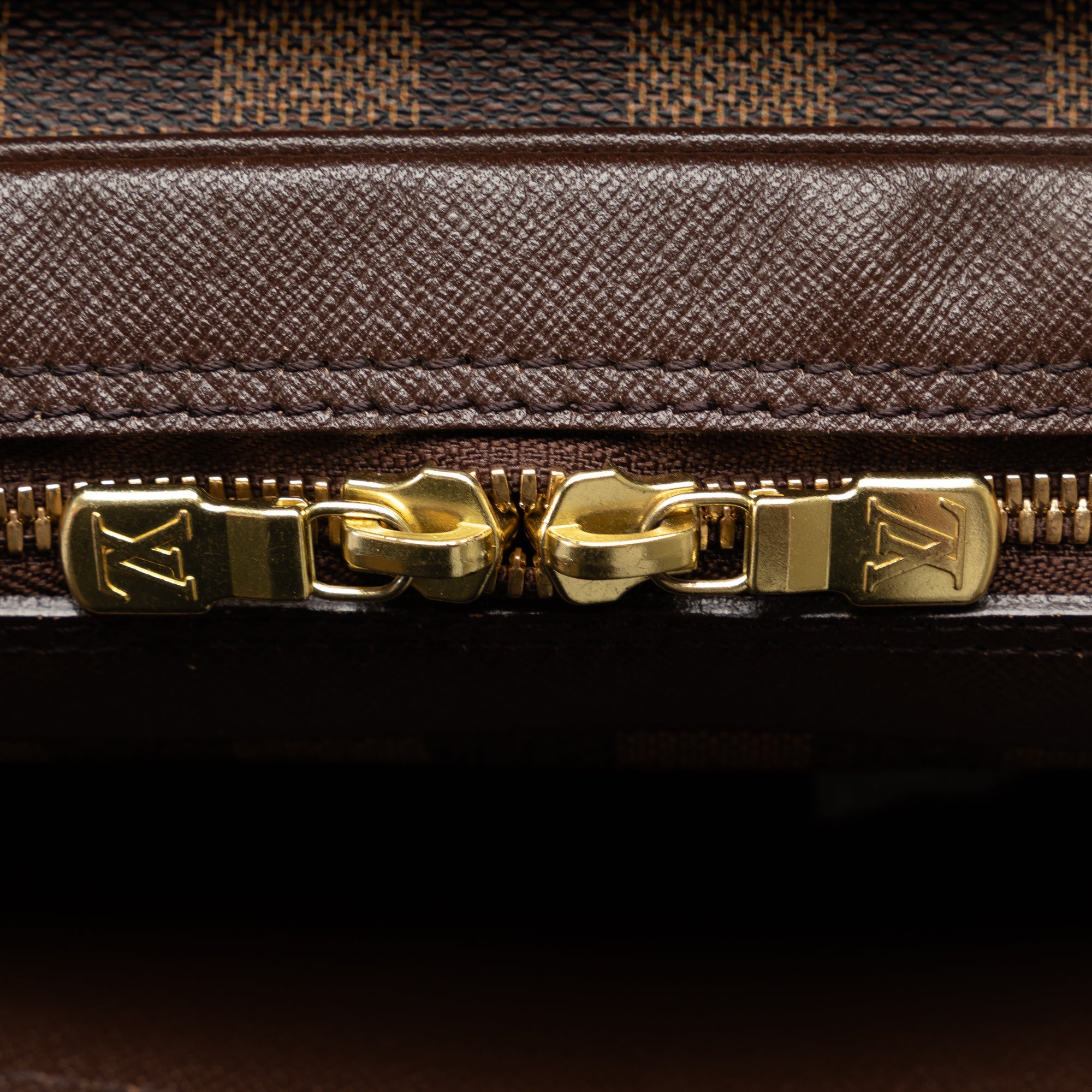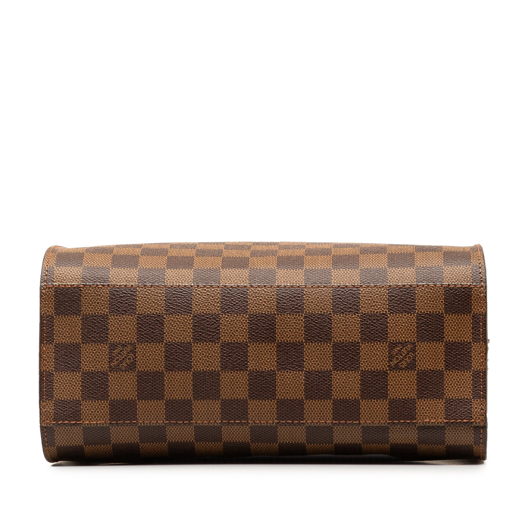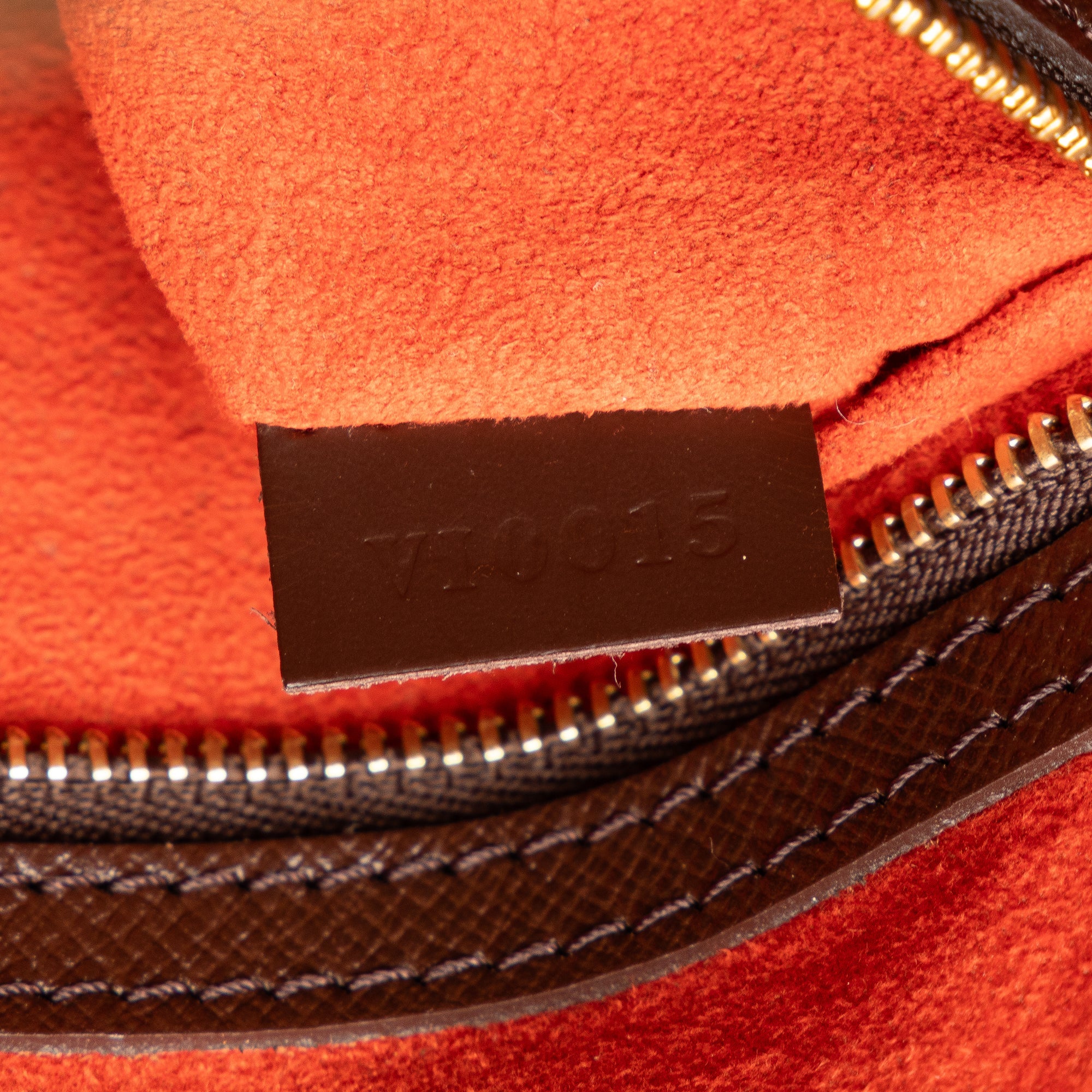 Product Details: Brown LV Damier Ebene Triana Handbag. The Triana features a damier ebene canvas body, rolled leather handles, a top zip closure, and an interior zip pocket. 10.2″ L x 9.1″ W x 4.3″ D, 4.7″ drop. Serial number VI0015.