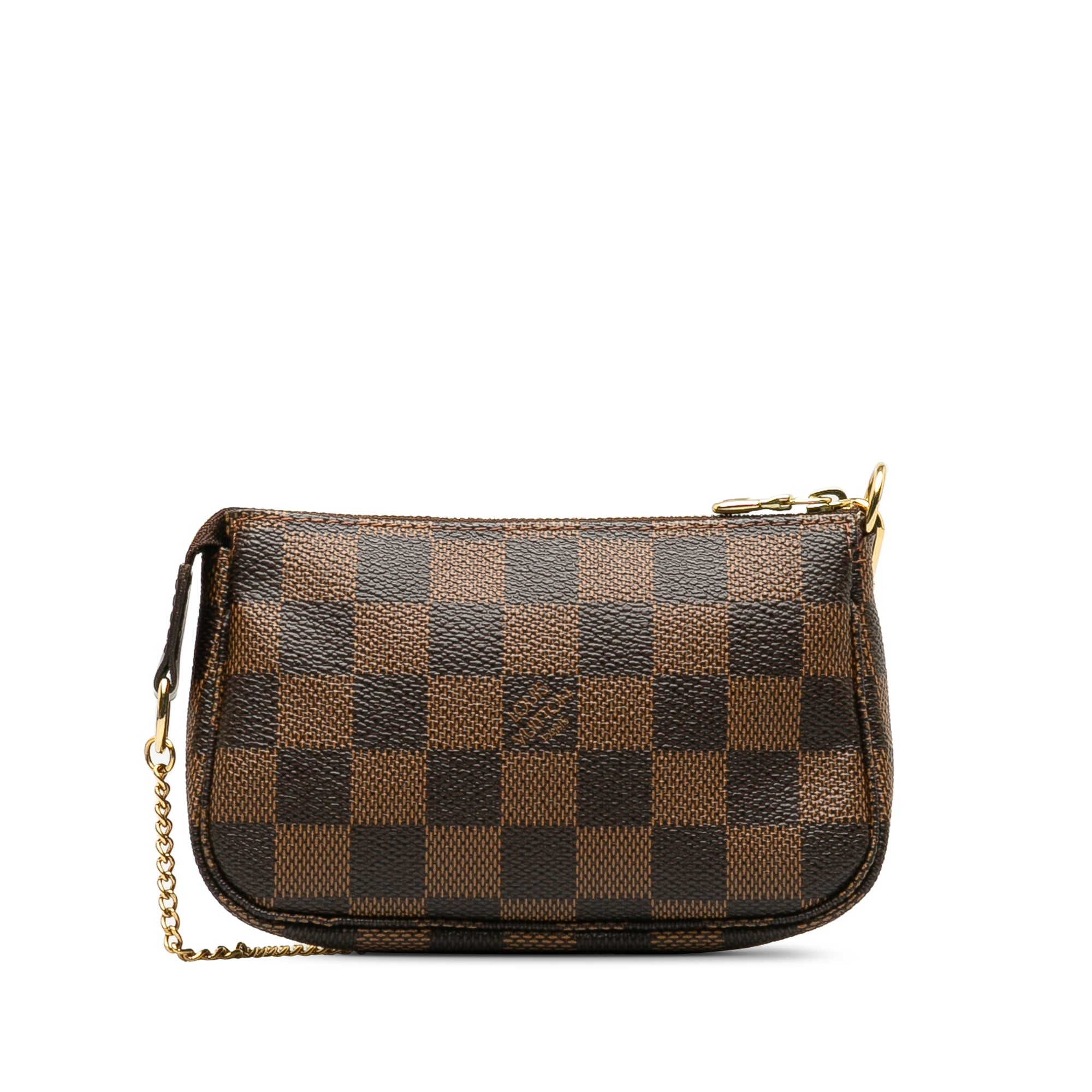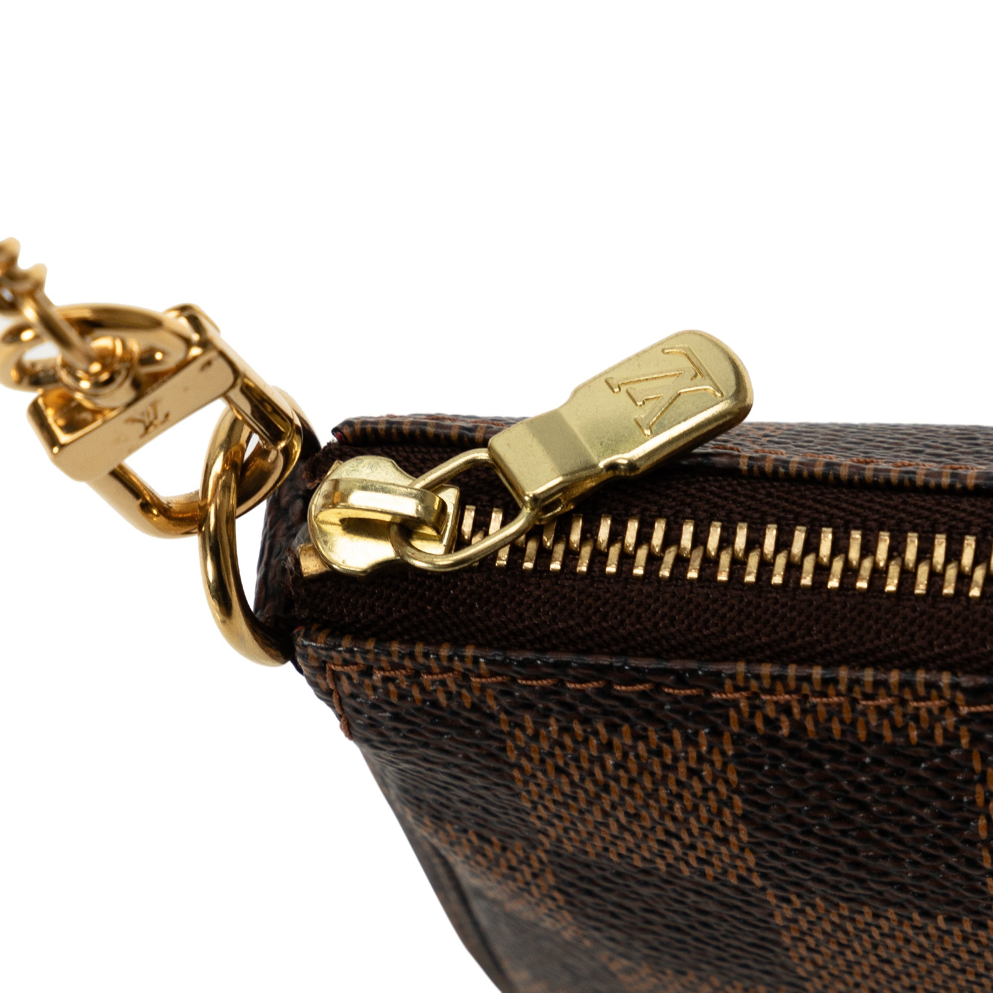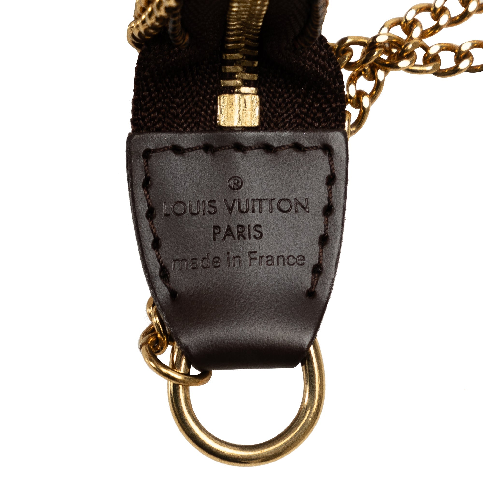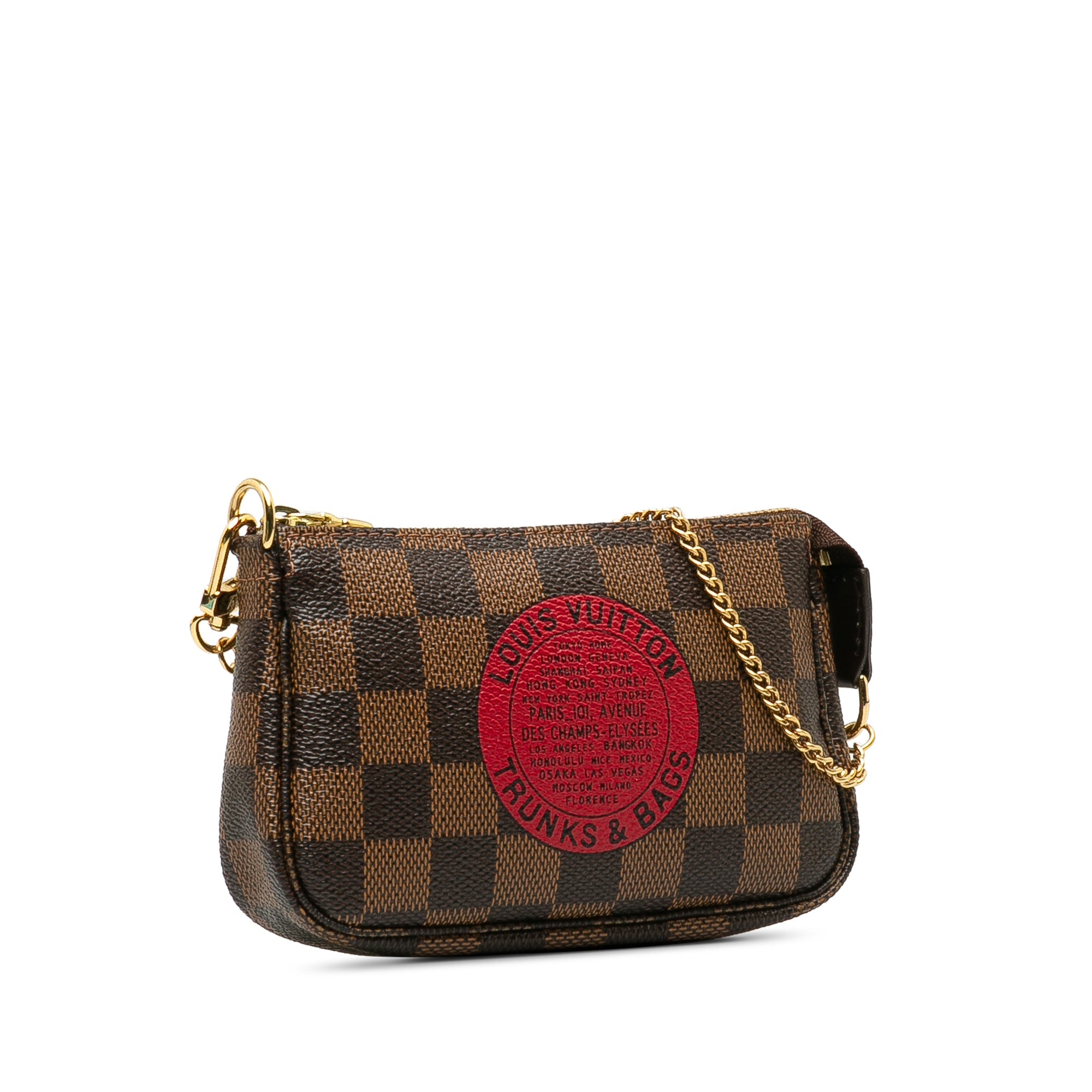 Product Details: Brown LV Damier Ebene Trunks and Bags Mini Pochette Accessoires Shoulder Bag. The Mini Pochette Accessoires TB features a Damier Canvas body with a TB print, a gold-tone chain strap, and top zip closure. 5.9″ L x 3.7″ W x 1.2″ D, 5.5″ drop. Serial number FL1048.