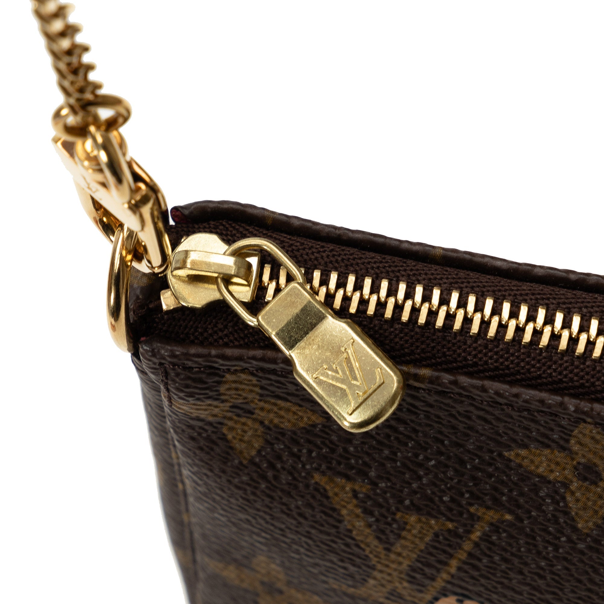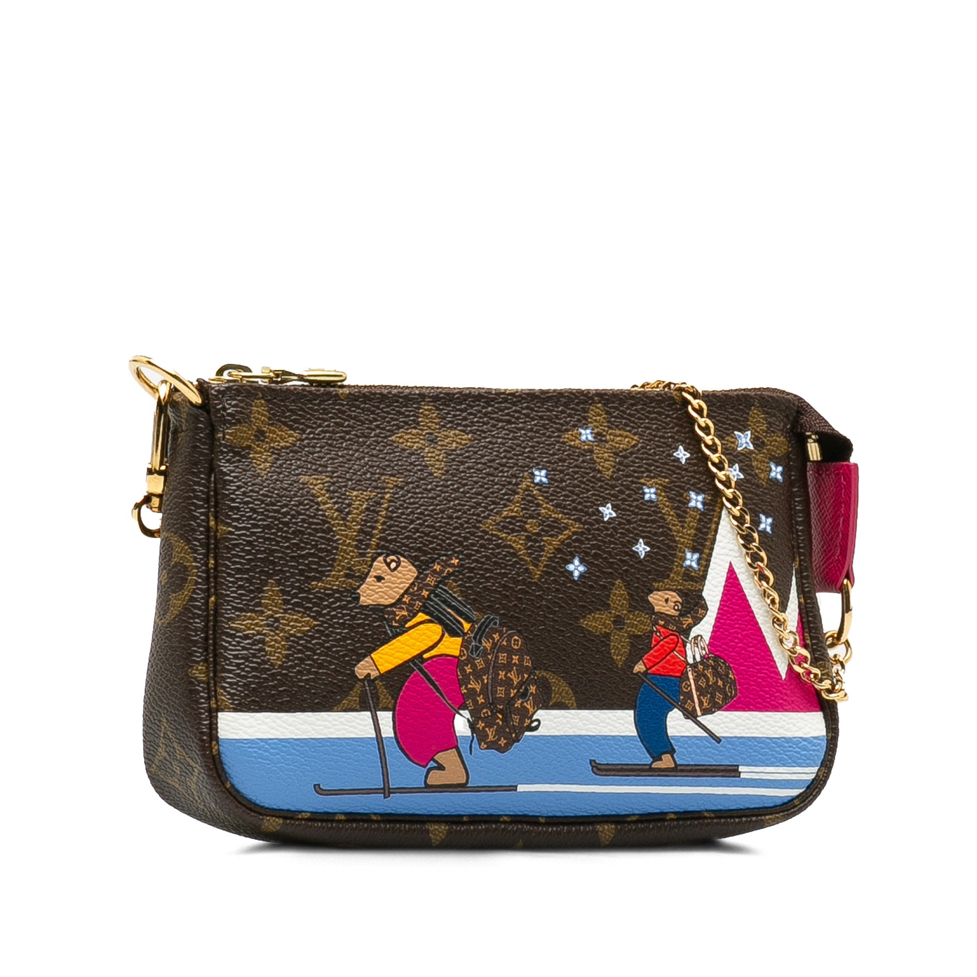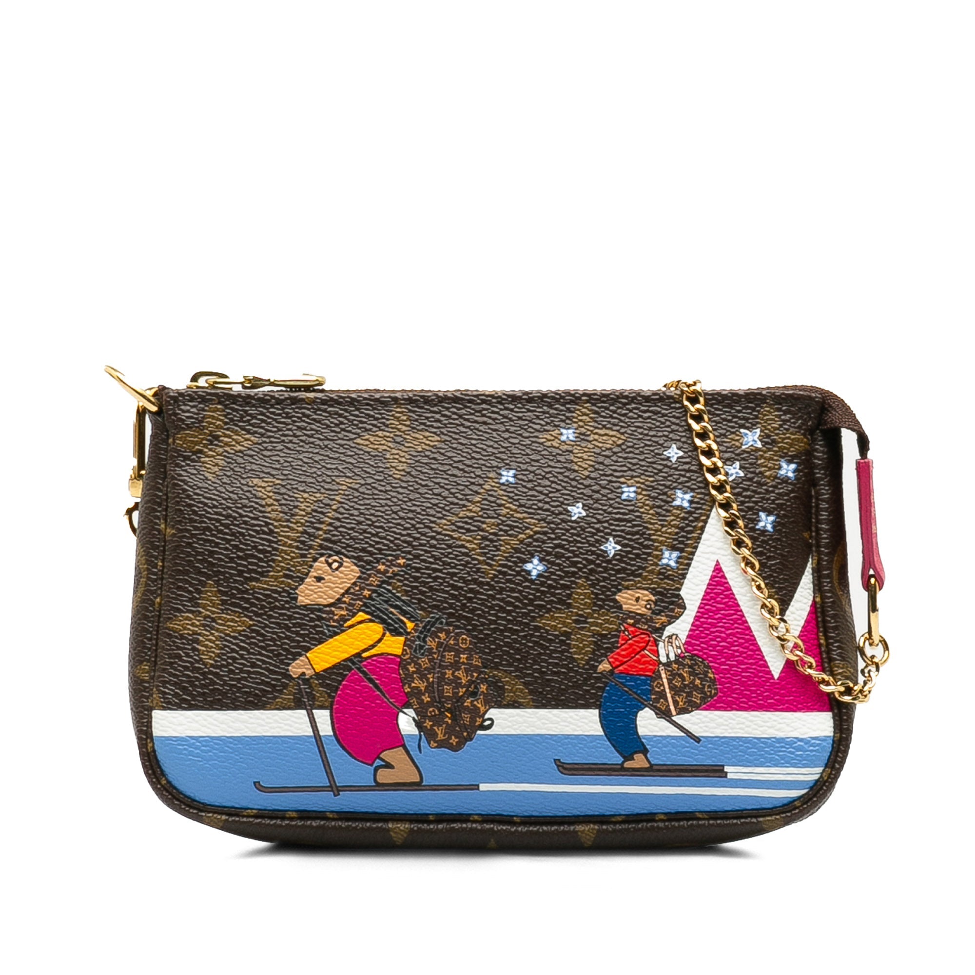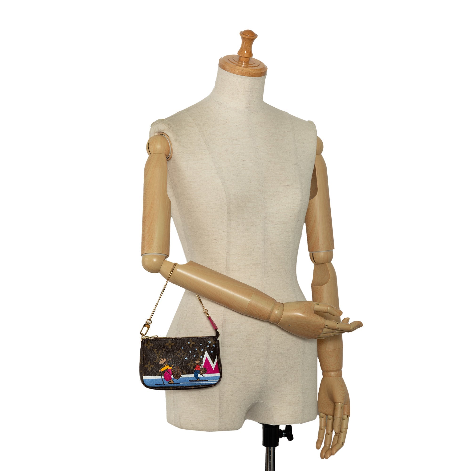 Product Details: Brown LV Monogram Bears on Skis Christmas Animation Mini Pochette Accessories Shoulder Bag. The Mini Pochette Accessoires features a printed monogram canvas body, a gold-tone chain strap, and a top zip closure. 3.9″ L x 5.5″ W x 1.2″ D. Serial number SF4158.