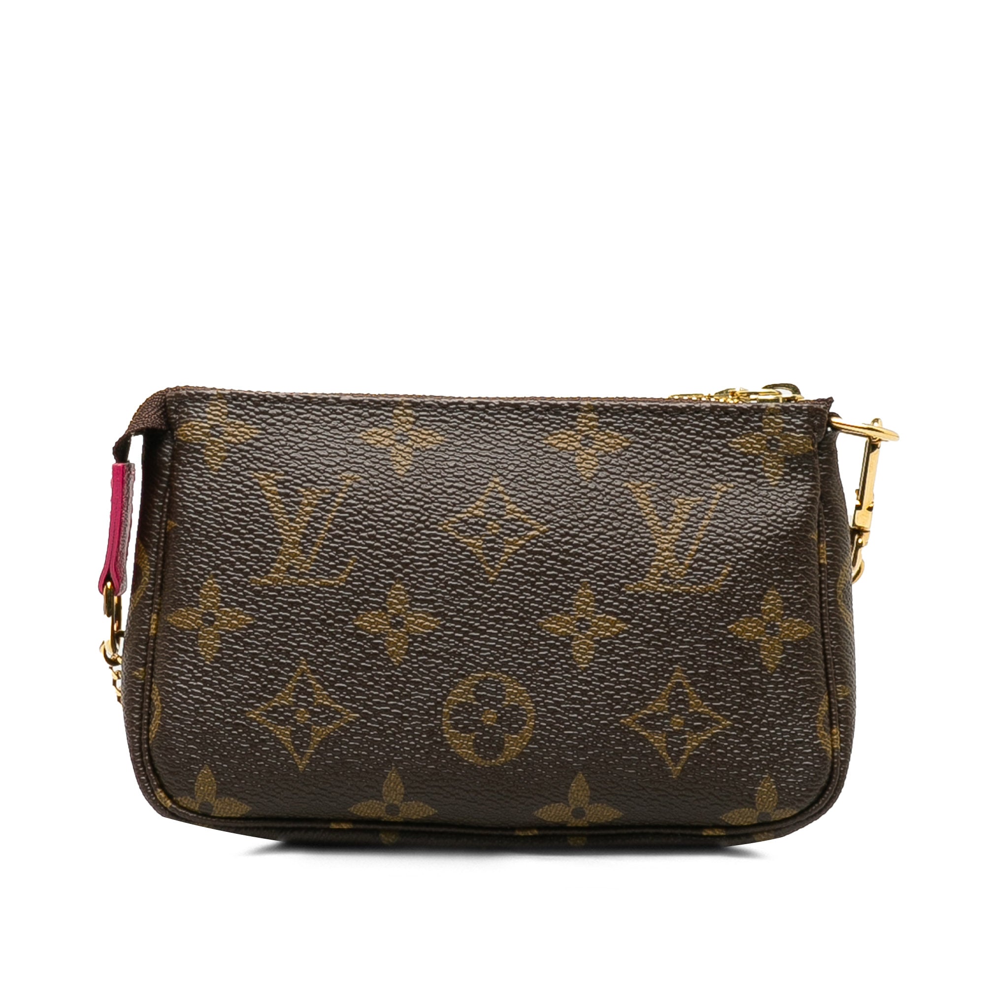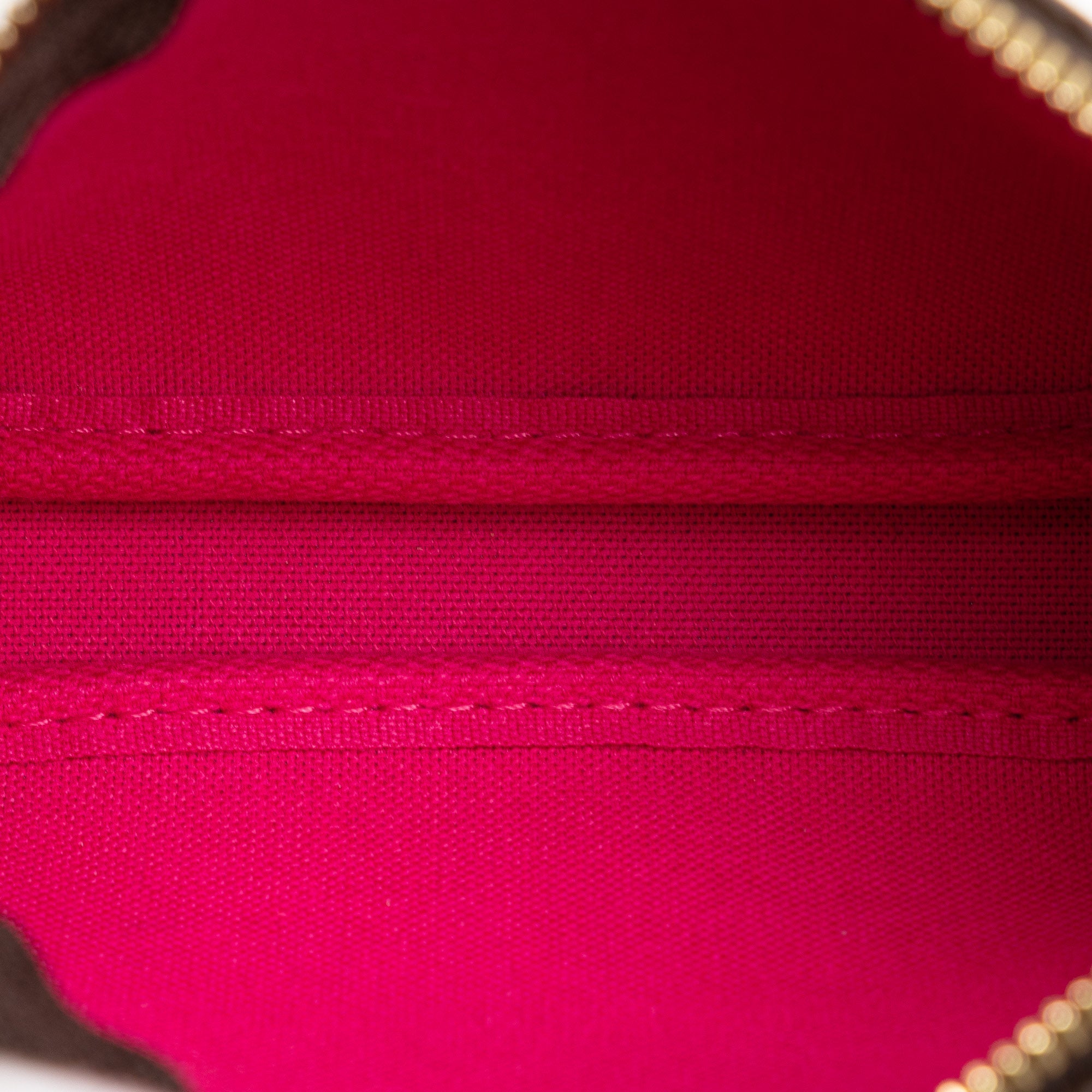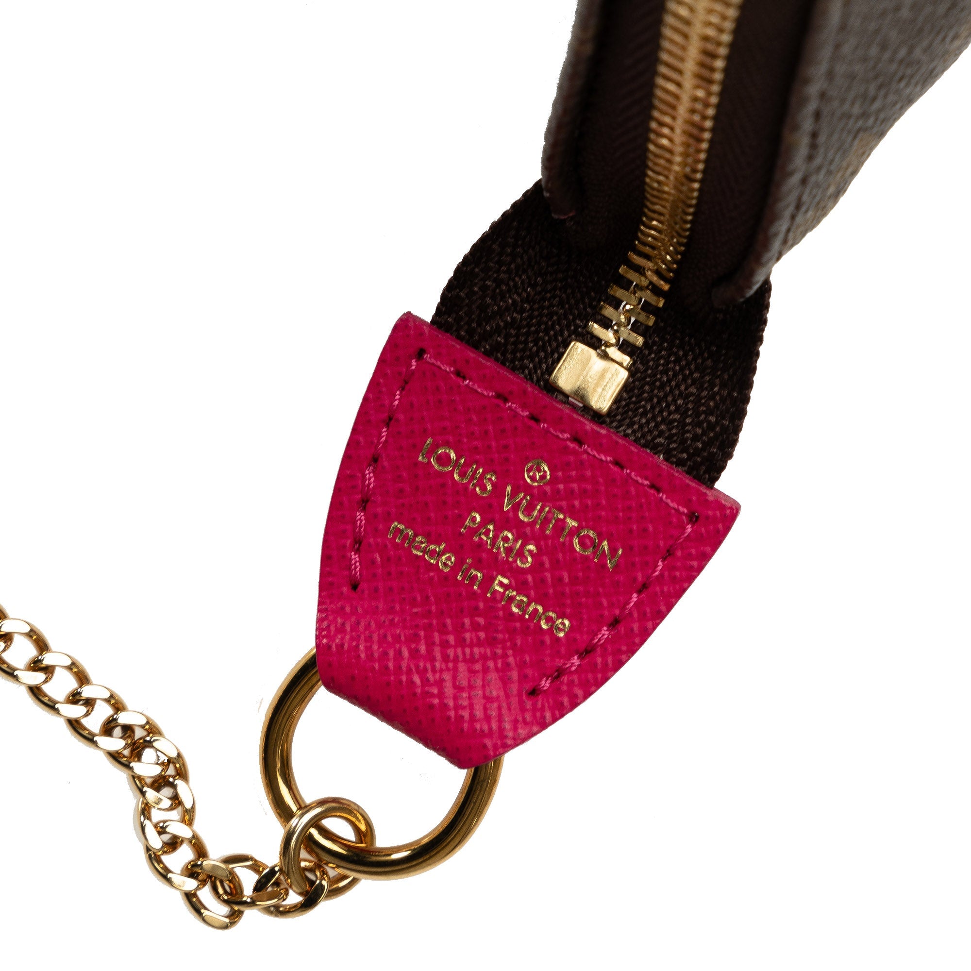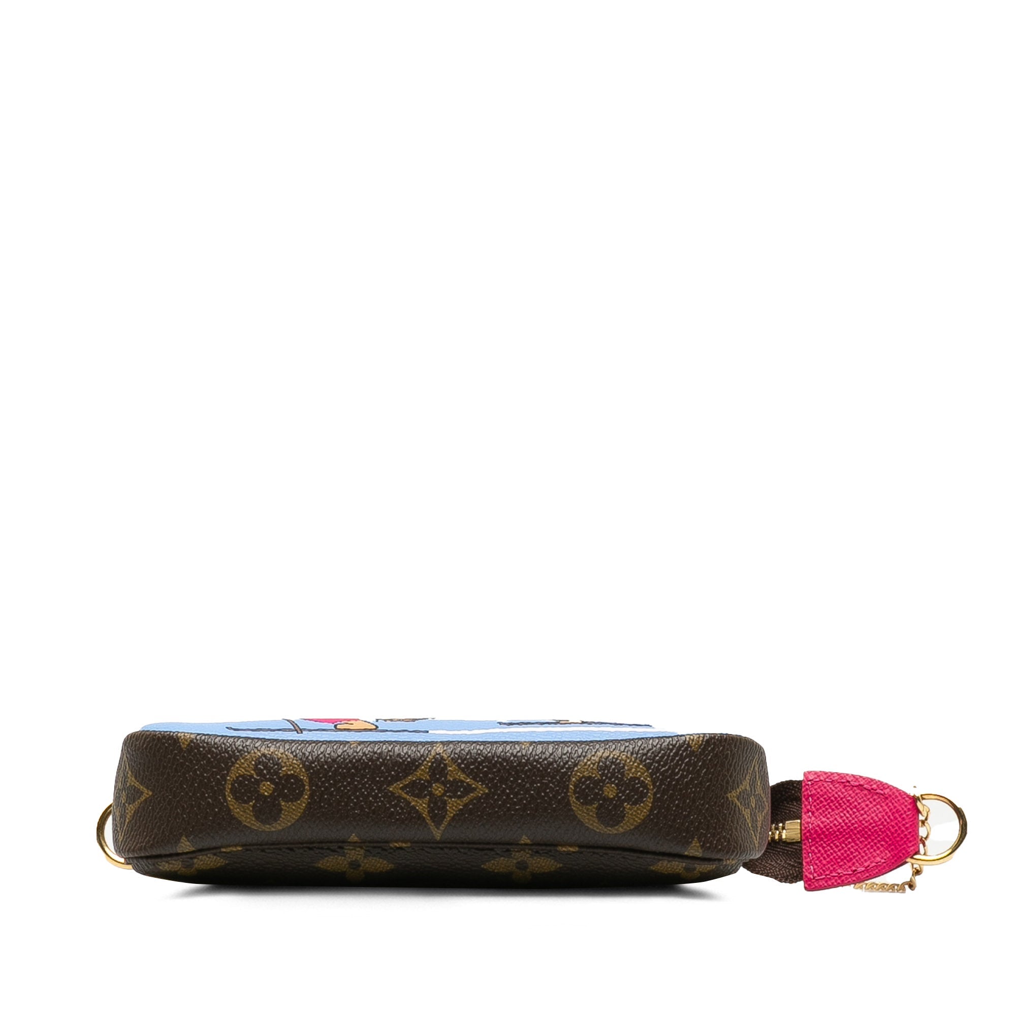 Product Details: Brown LV Monogram Bears on Skis Christmas Animation Mini Pochette Accessories Shoulder Bag. The Mini Pochette Accessoires features a printed monogram canvas body, a gold-tone chain strap, and a top zip closure. 3.9″ L x 5.5″ W x 1.2″ D. Serial number SF4158.