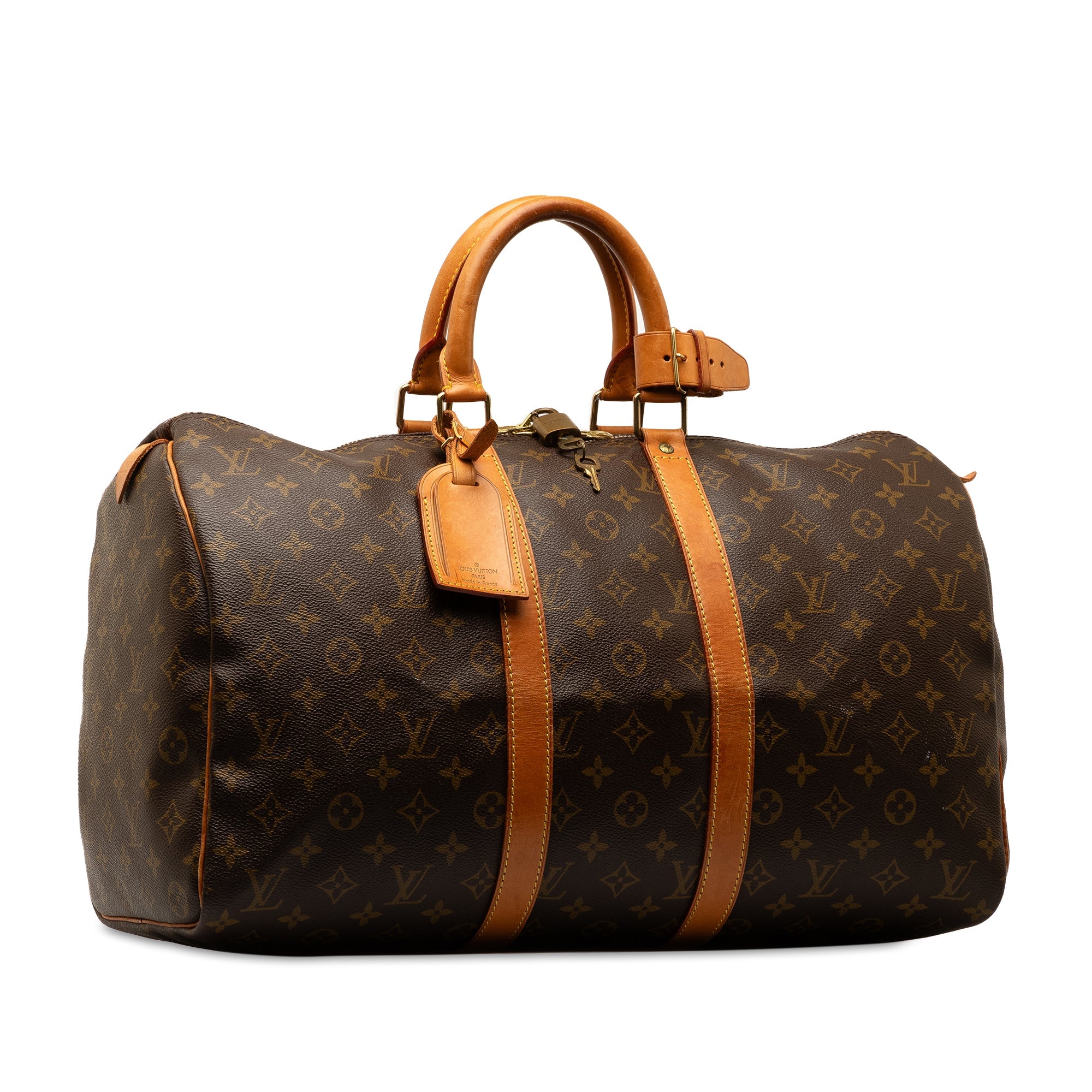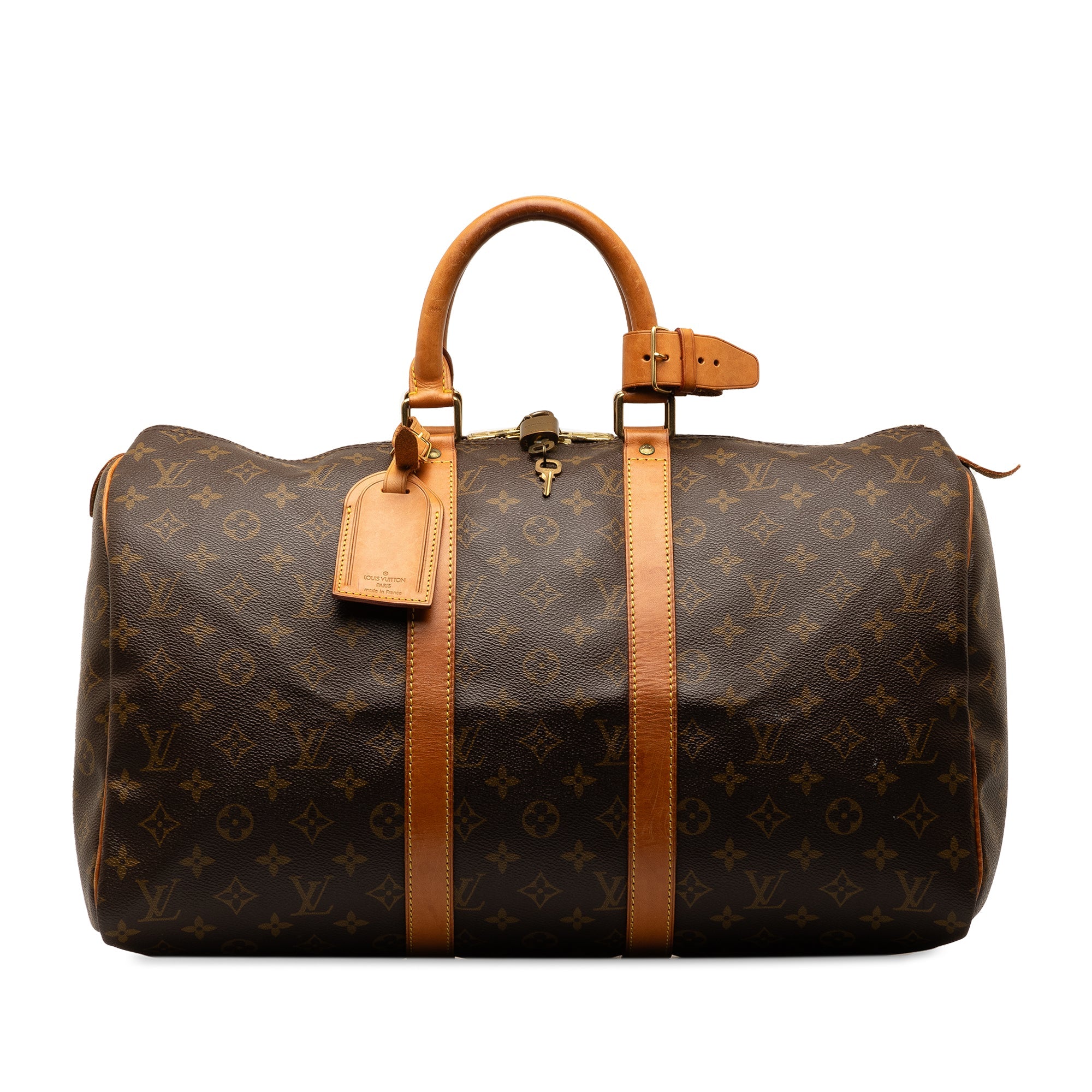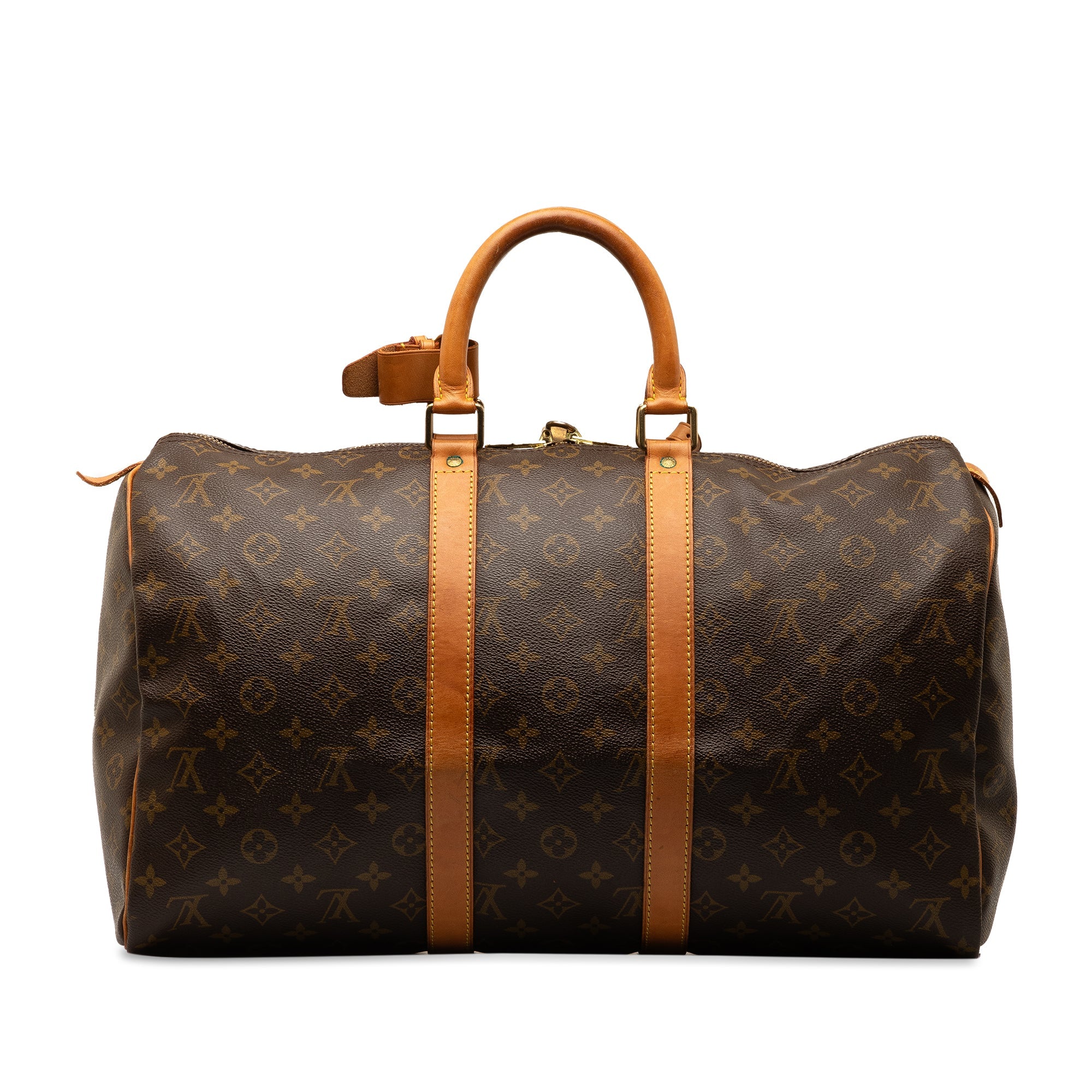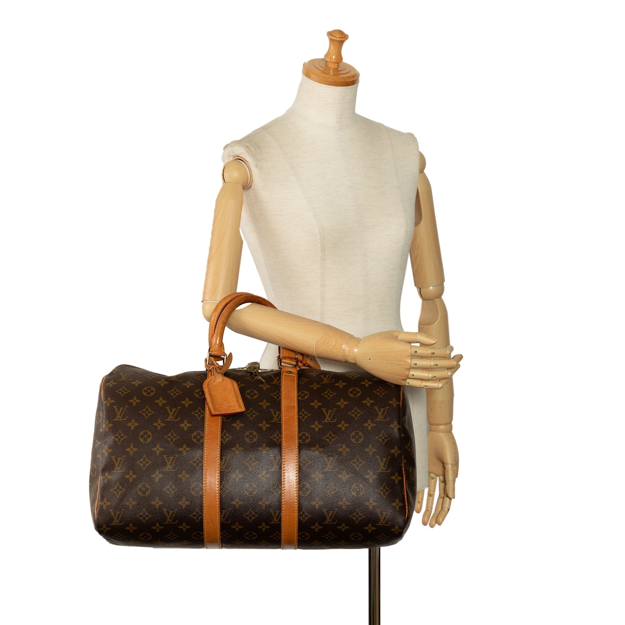 Product Details: Brown LV Monogram Keepall 45 Travel Bag. The Keepall 45 features a monogram canvas body, rolled leather handles, and a top zip closure. 17.7″ L x 17.7″ W x 7.9″ D, 4.3″ drop. Serial number SP0915.