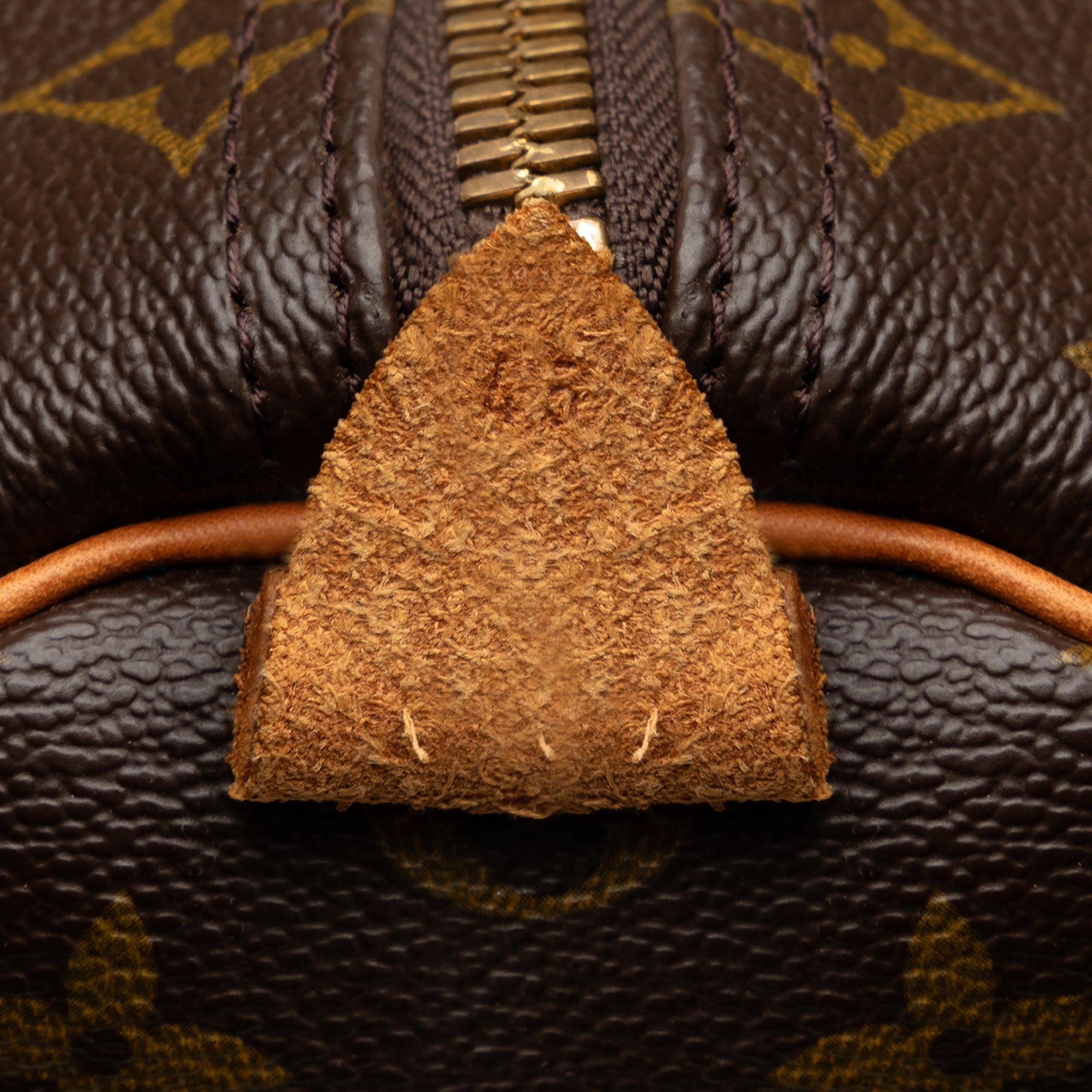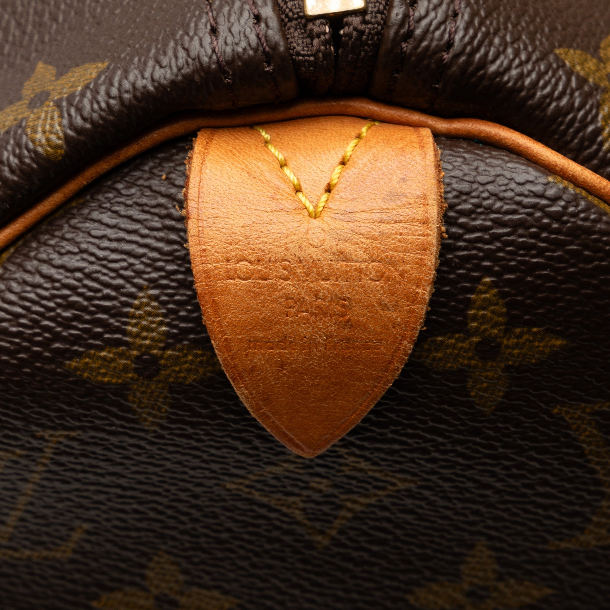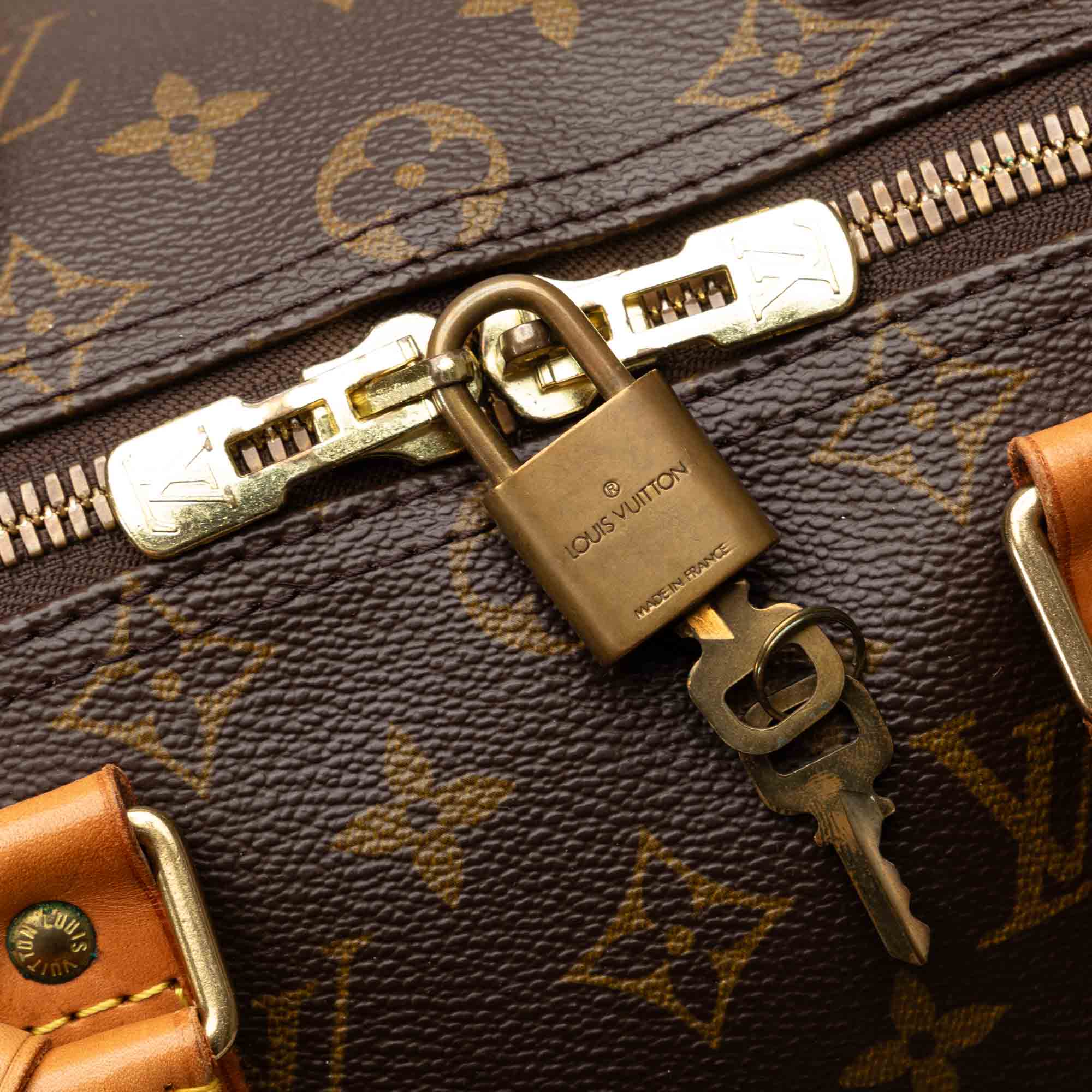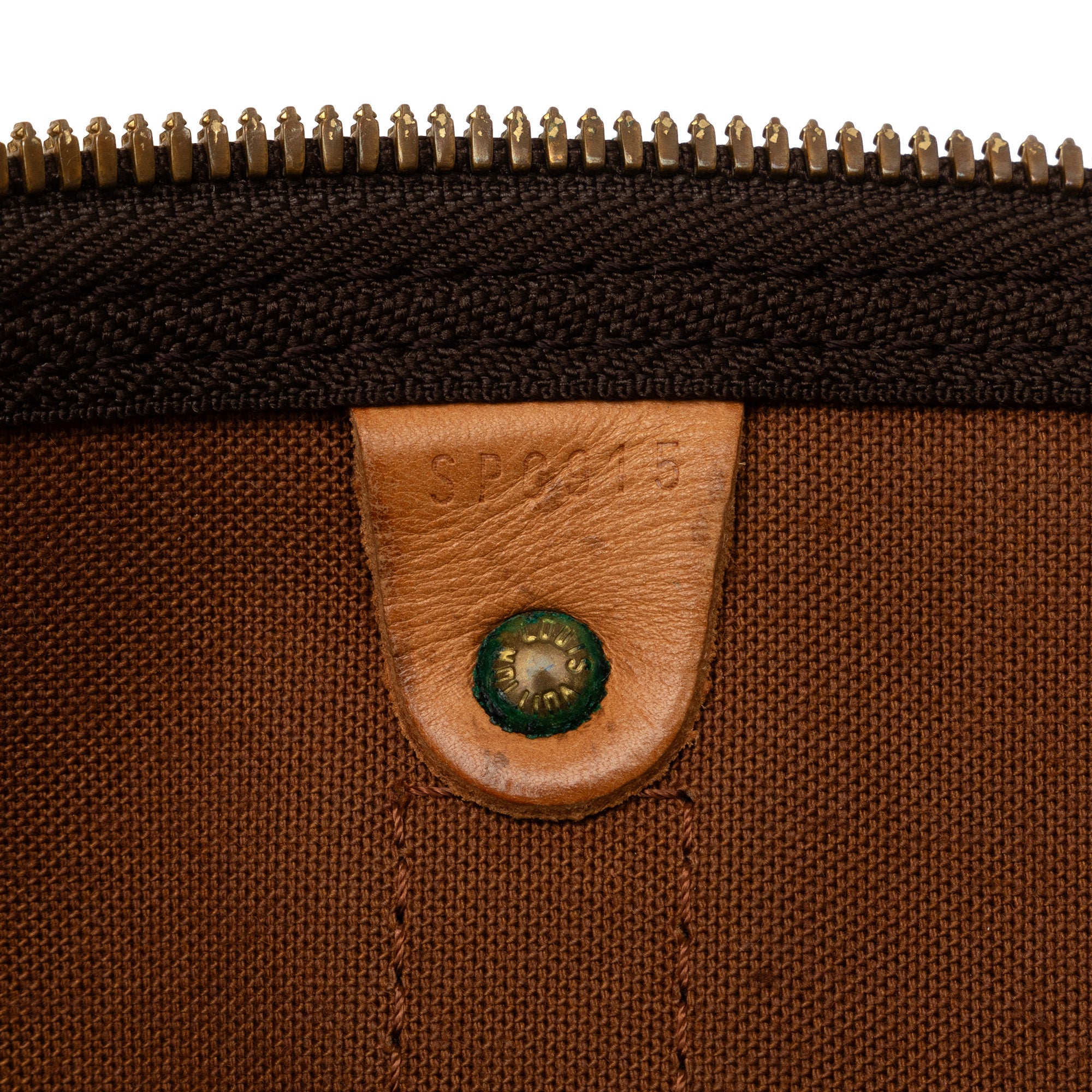 Product Details: Brown LV Monogram Keepall 45 Travel Bag. The Keepall 45 features a monogram canvas body, rolled leather handles, and a top zip closure. 17.7″ L x 17.7″ W x 7.9″ D, 4.3″ drop. Serial number SP0915.