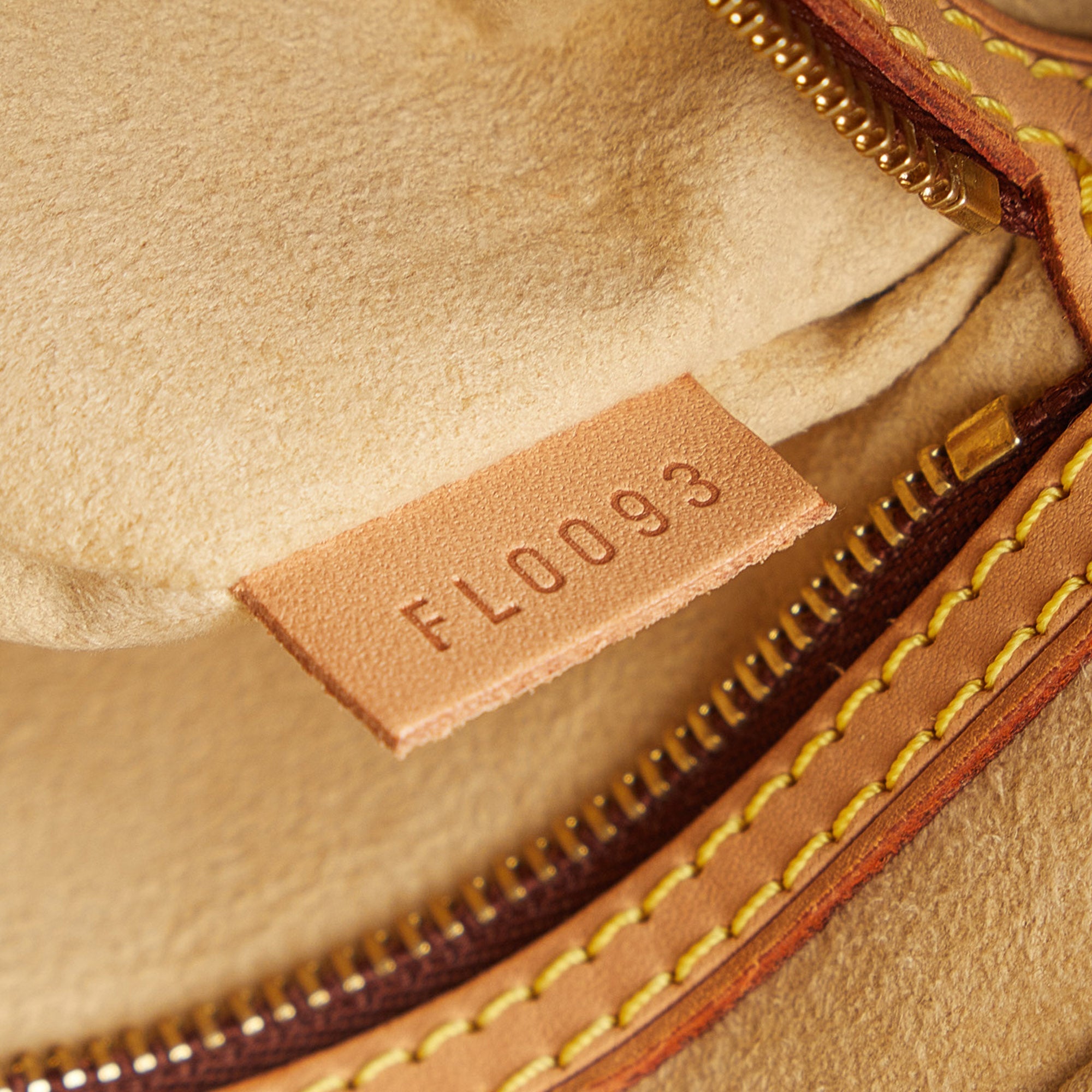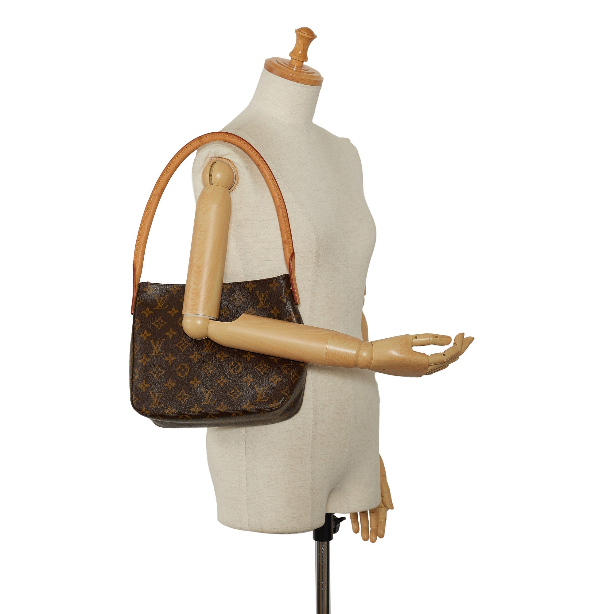 Product Details: Brown LV Monogram Looping MM Shoulder Bag. The Looping MM features a monogram canvas body, a rolled vachetta leather shoulder strap, a top zip closure, and an interior zip pocket. 9.4″ L x 8.3″ W x 4.1″ D. Serial number FL0093.