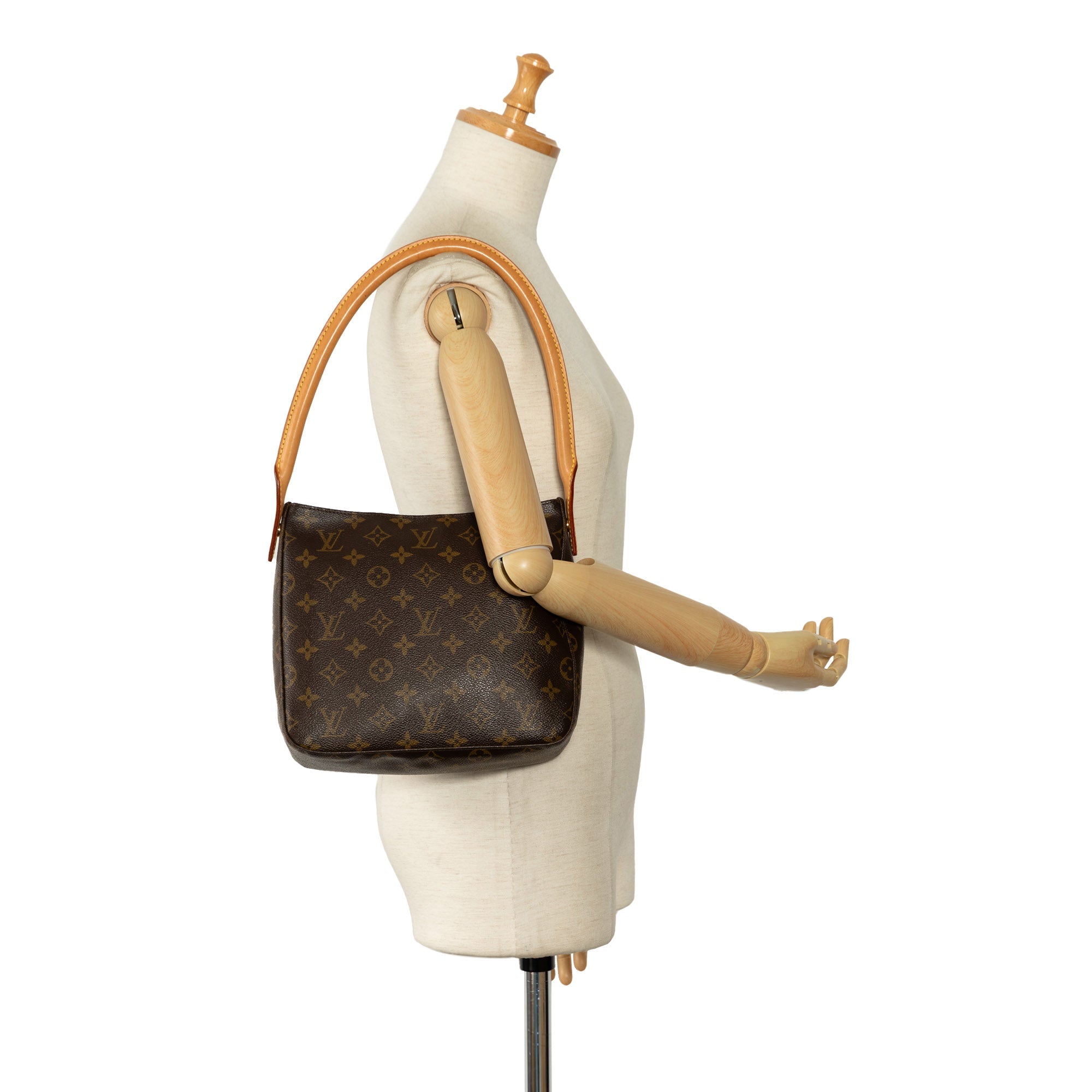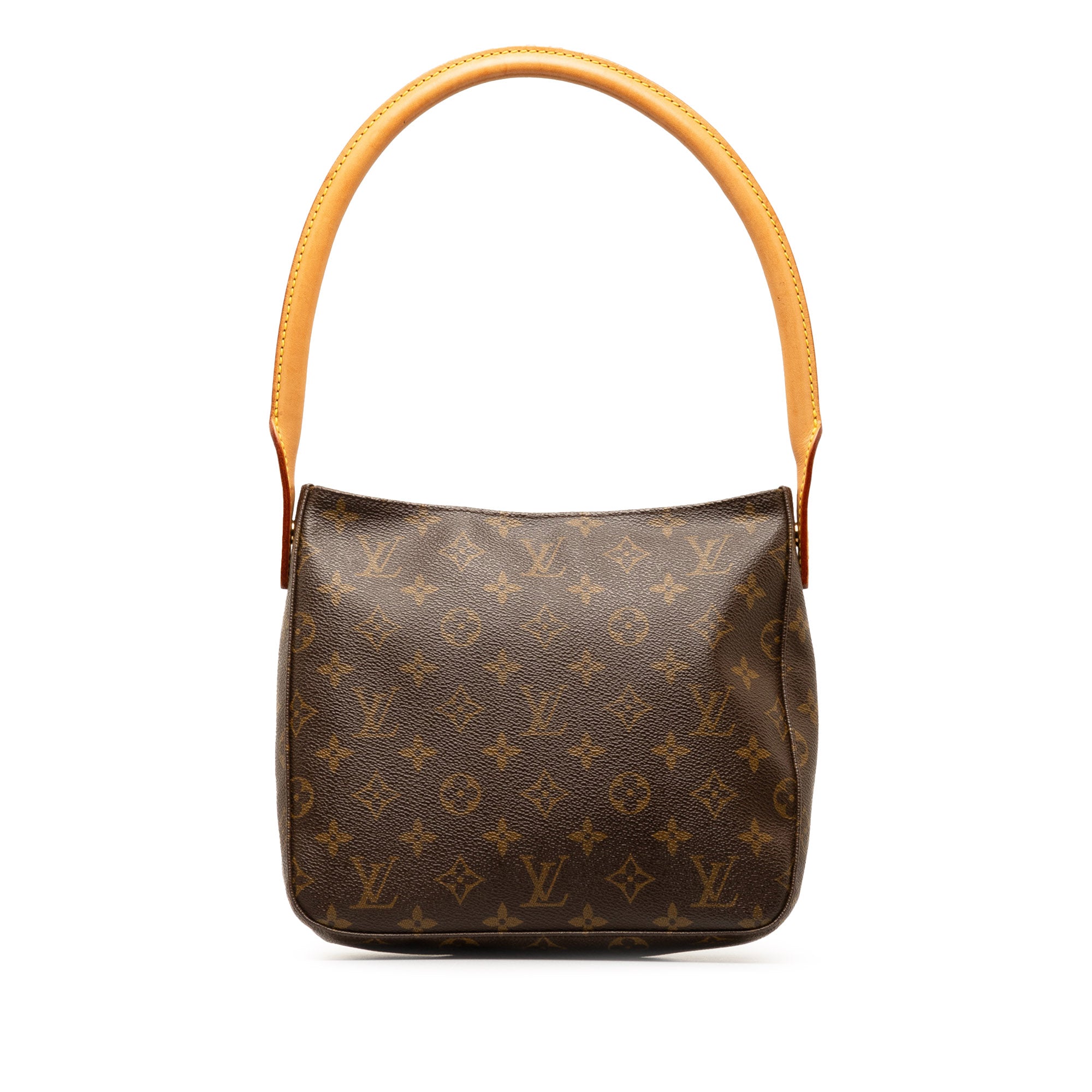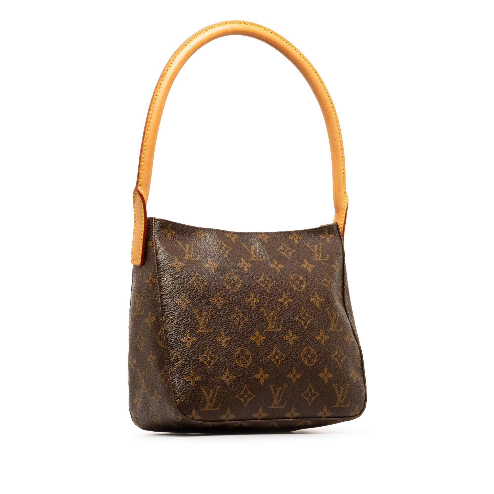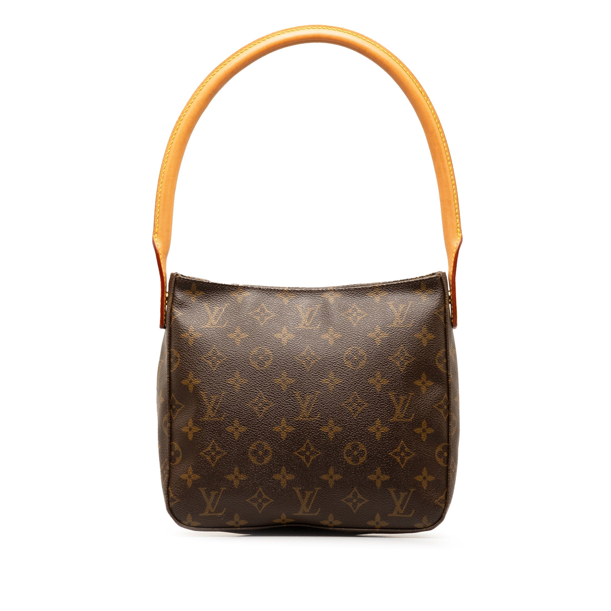 Product Details: Brown LV Monogram Looping MM Shoulder Bag. The Looping MM features a monogram canvas body, a rolled vachetta leather shoulder strap, a top zip closure, and an interior zip pocket. 9.4″ L x 8.3″ W x 4.1″ D. Serial number FL0061.