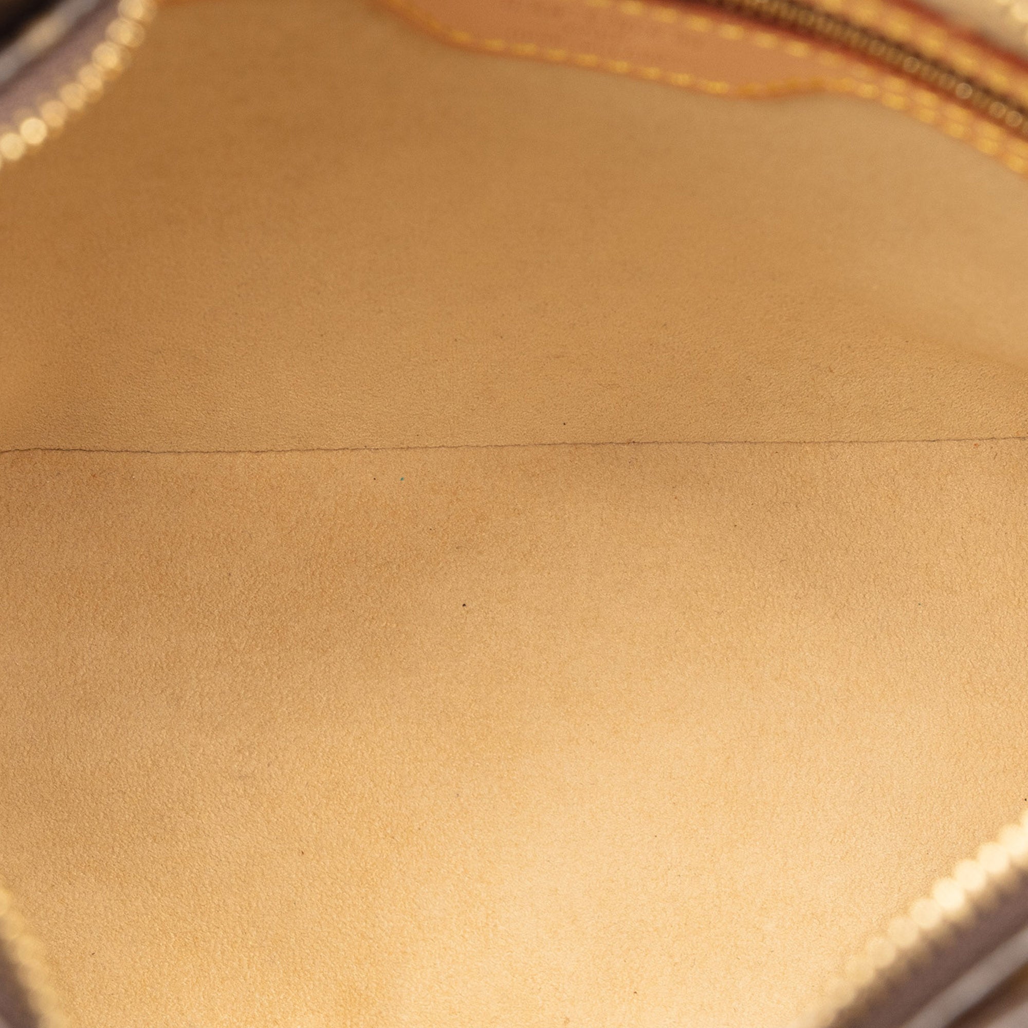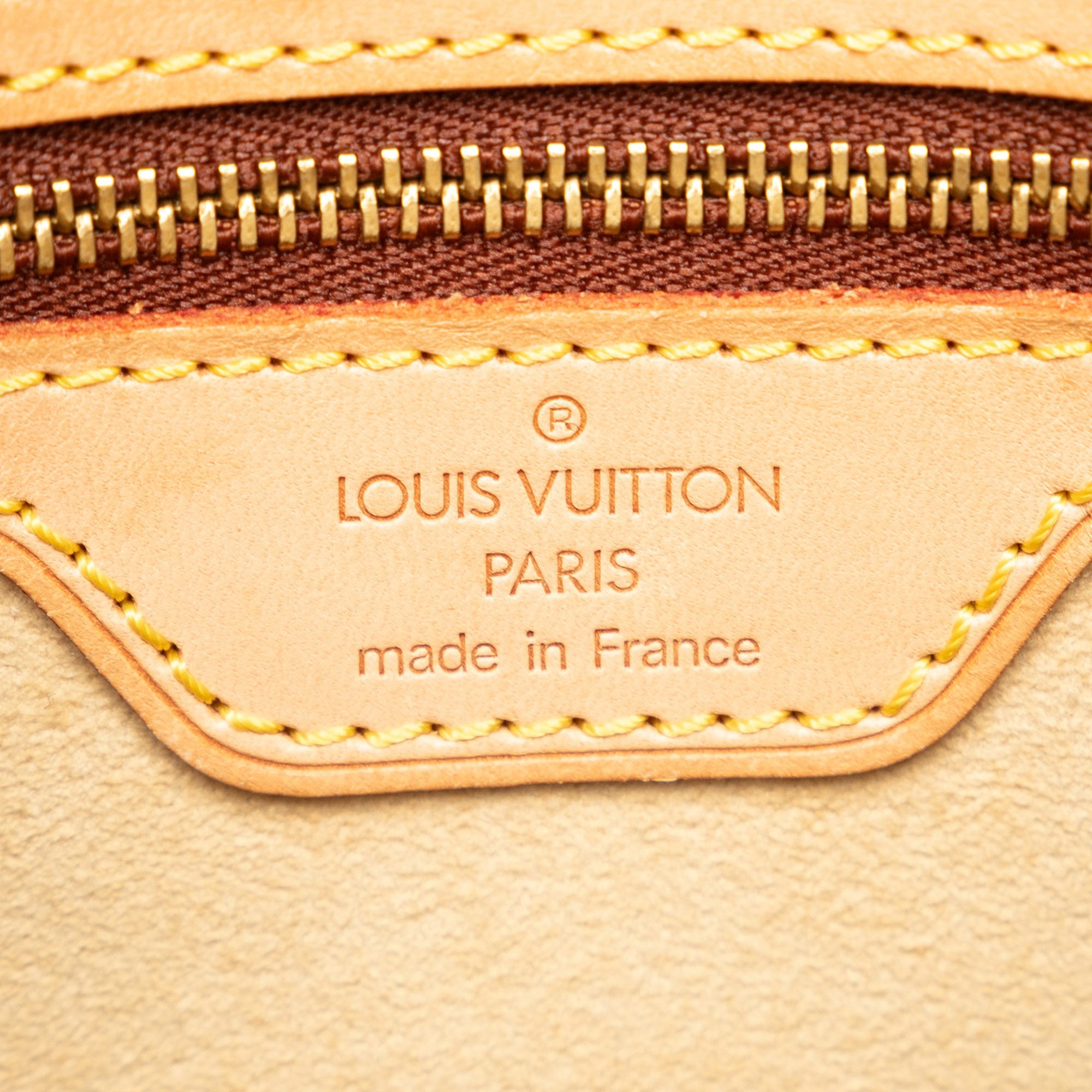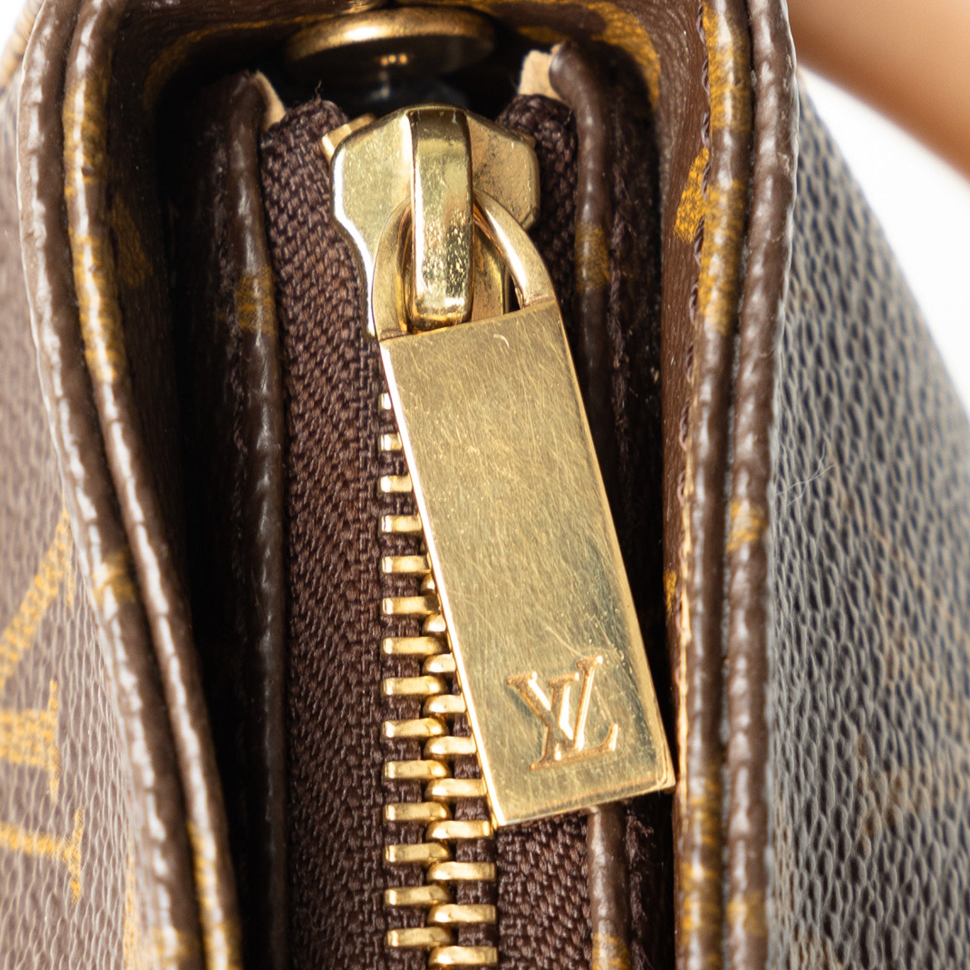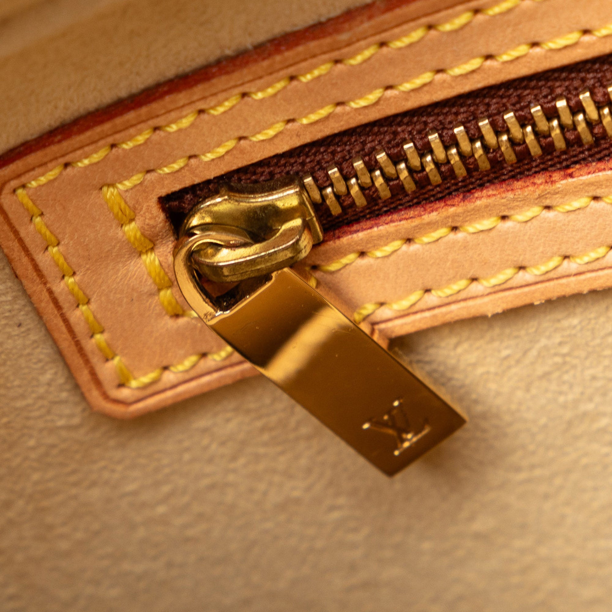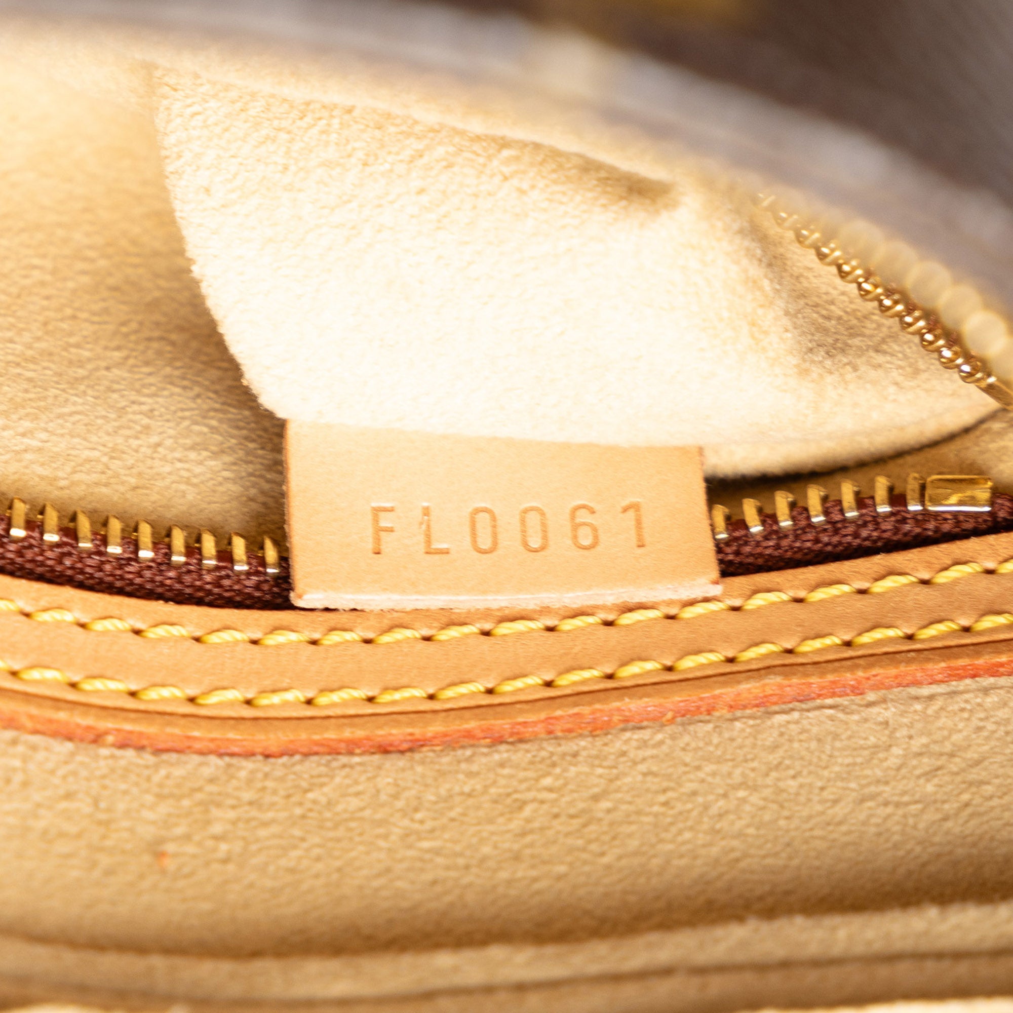 Product Details: Brown LV Monogram Looping MM Shoulder Bag. The Looping MM features a monogram canvas body, a rolled vachetta leather shoulder strap, a top zip closure, and an interior zip pocket. 9.4″ L x 8.3″ W x 4.1″ D. Serial number FL0061.