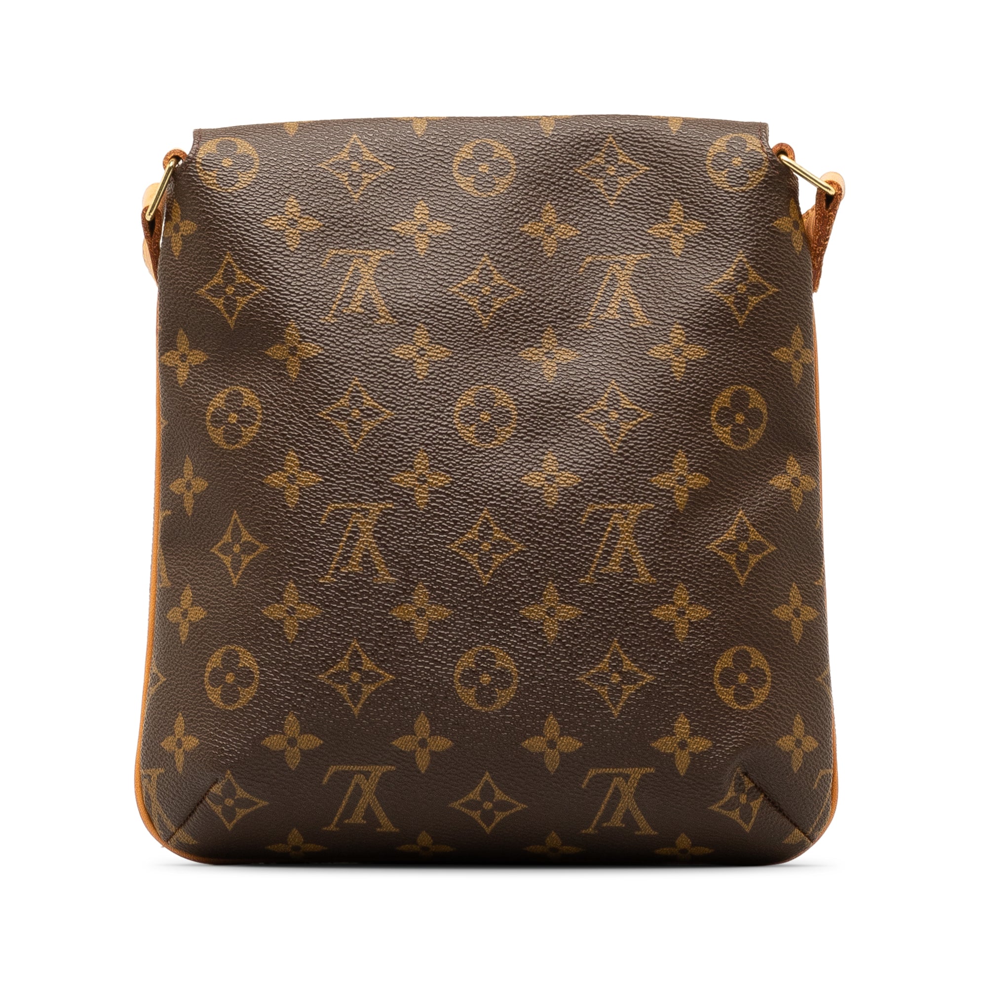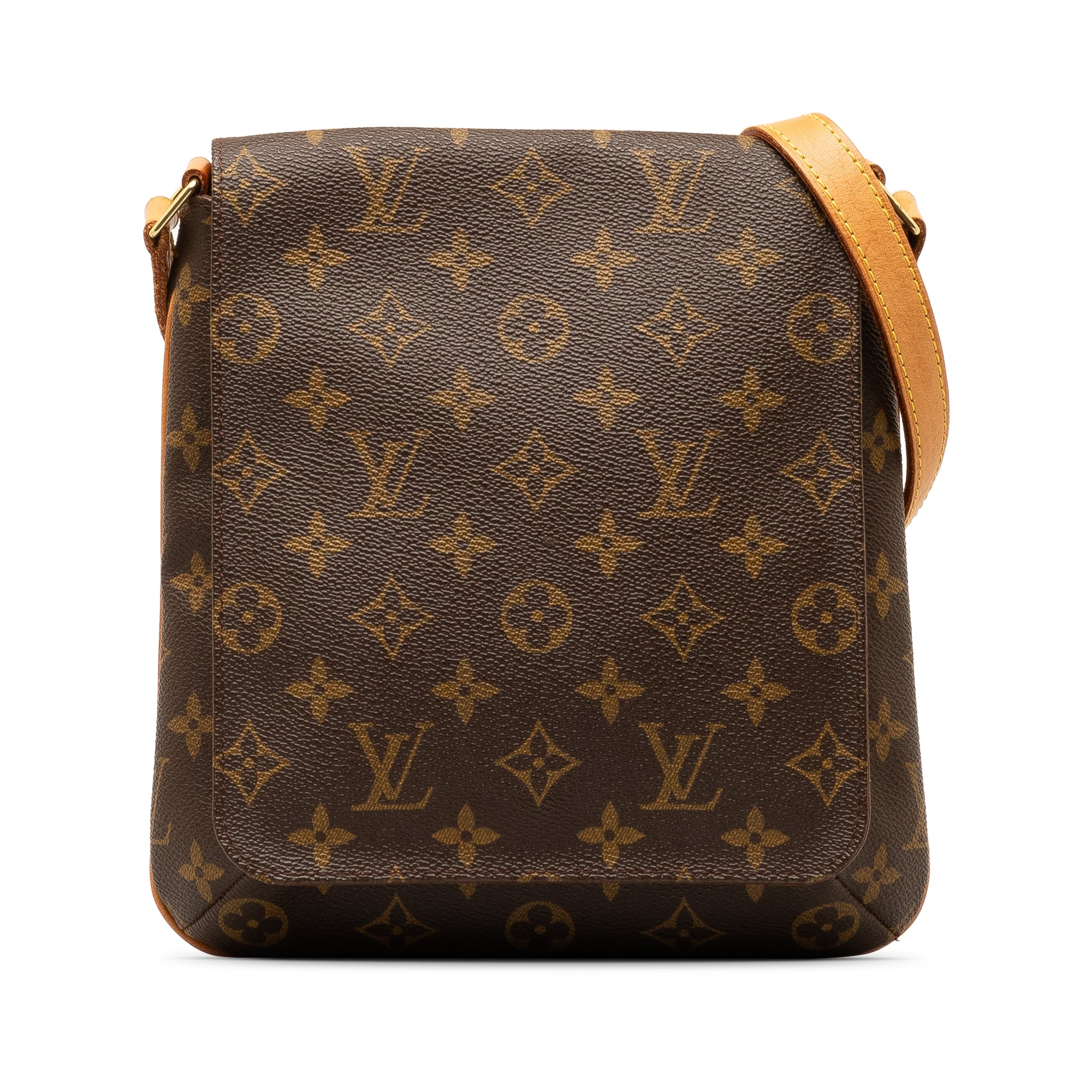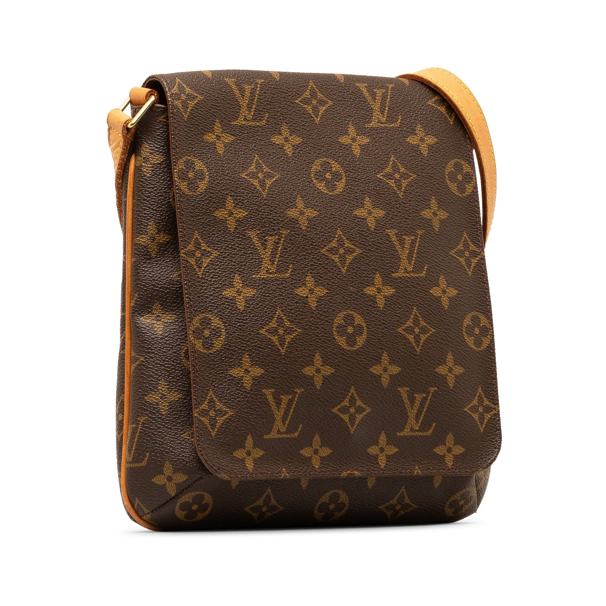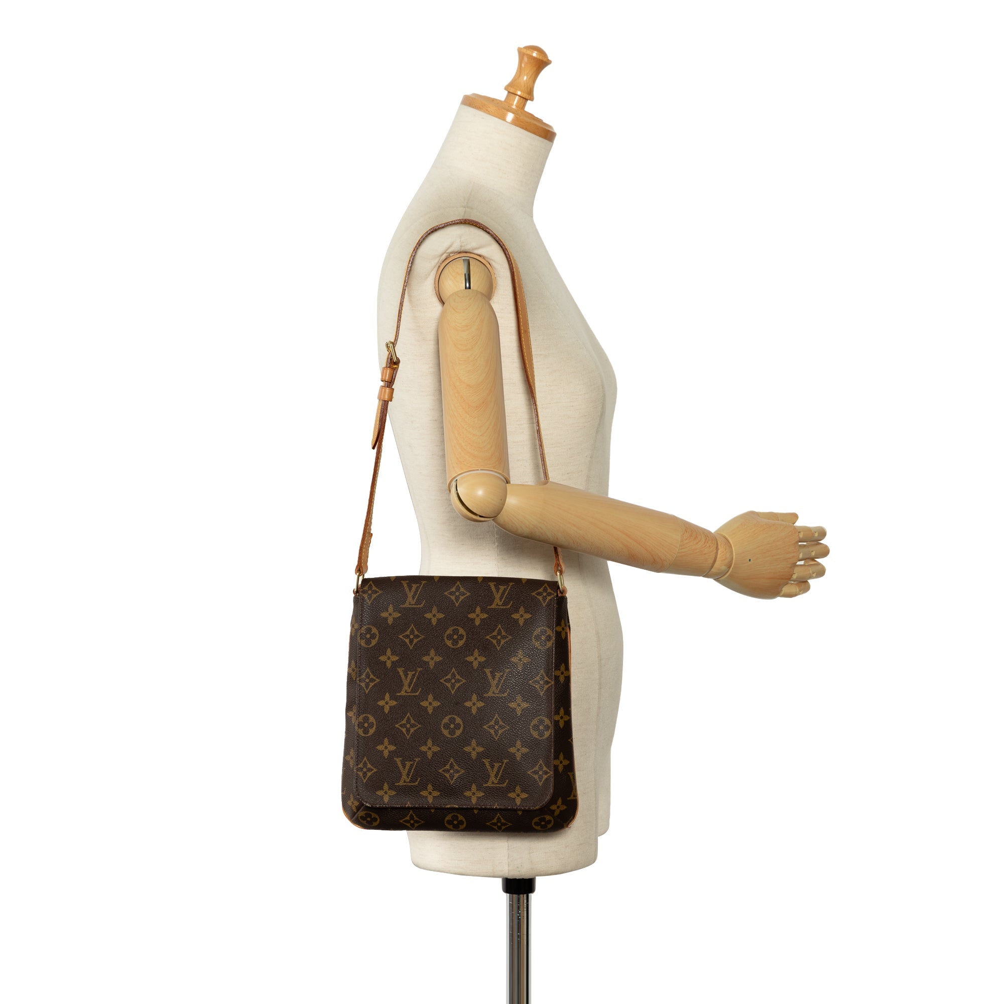 Product Details: Brown LV Monogram Musette Salsa Short Strap Shoulder Bag. The Musette Salsa features a monogram canvas body, an adjustable flat vachetta shoulder strap, a front flap with a magnetic closure, and an interior slip pocket. 9.8″ L x 9.8″ W x 2.8″ D, 12.6″ drop. Serial number LW1919.