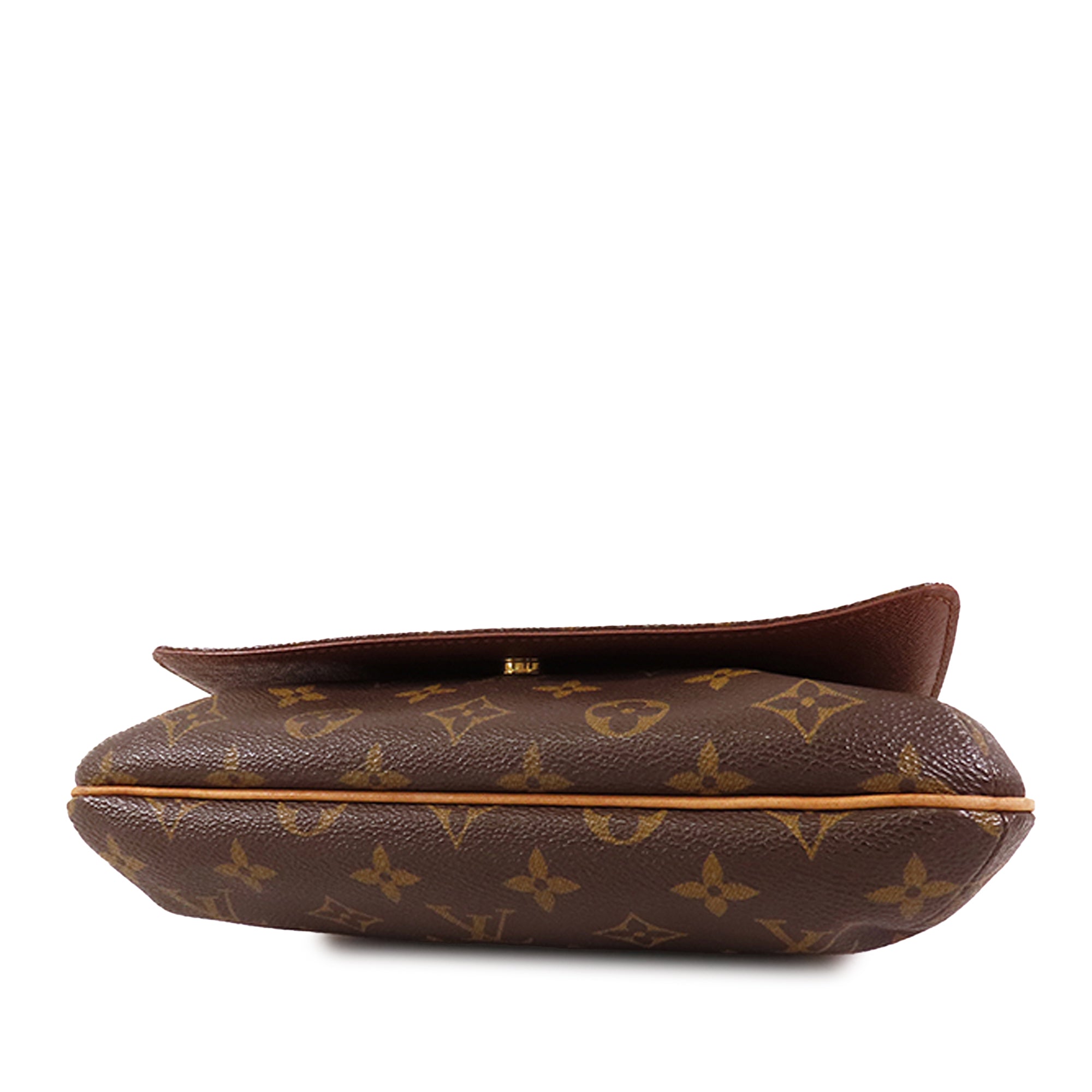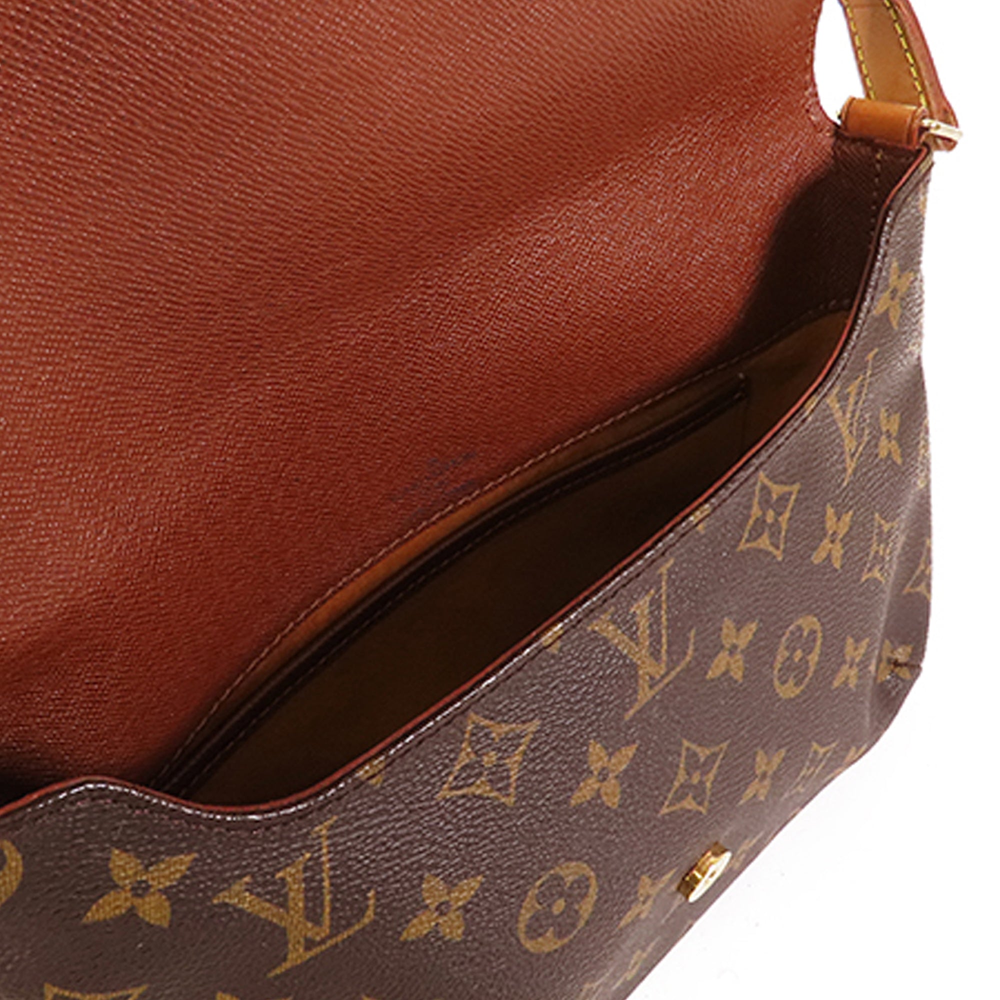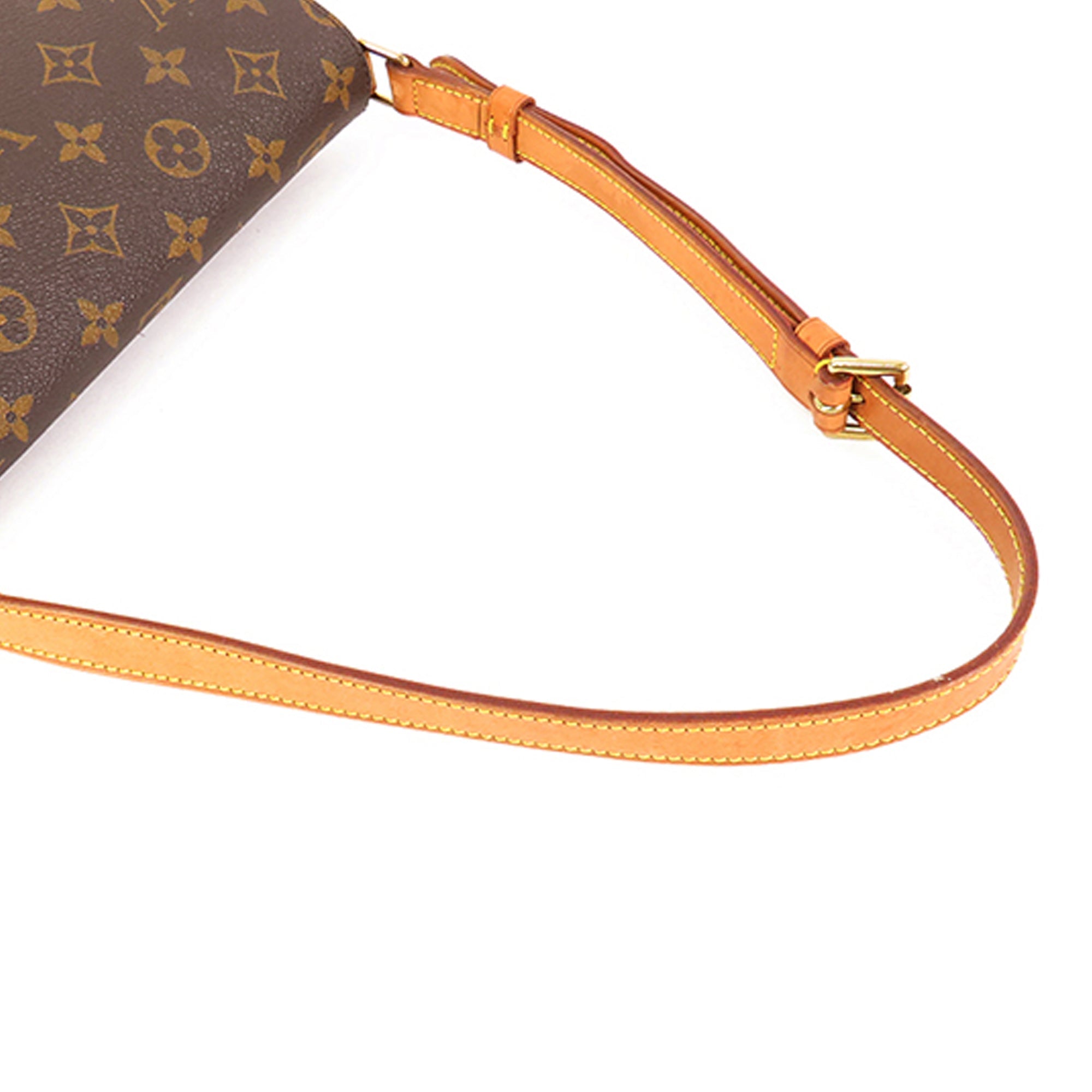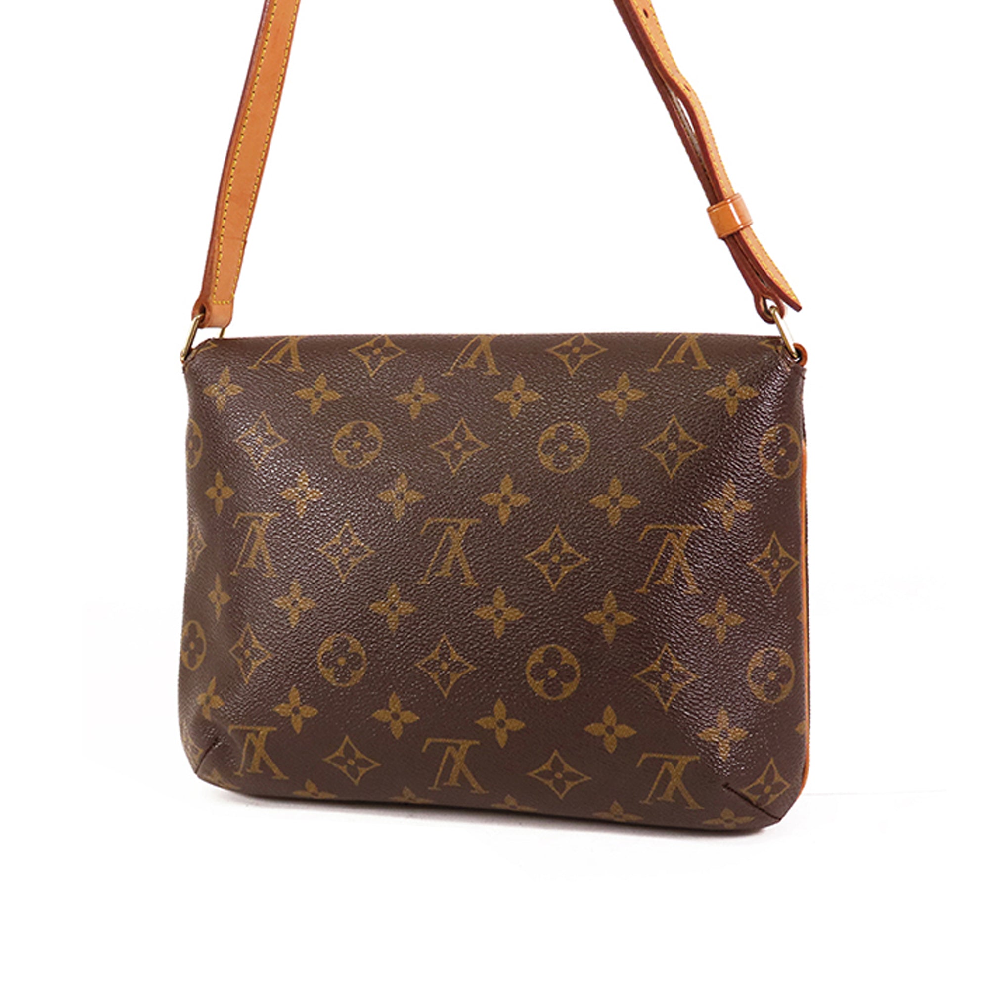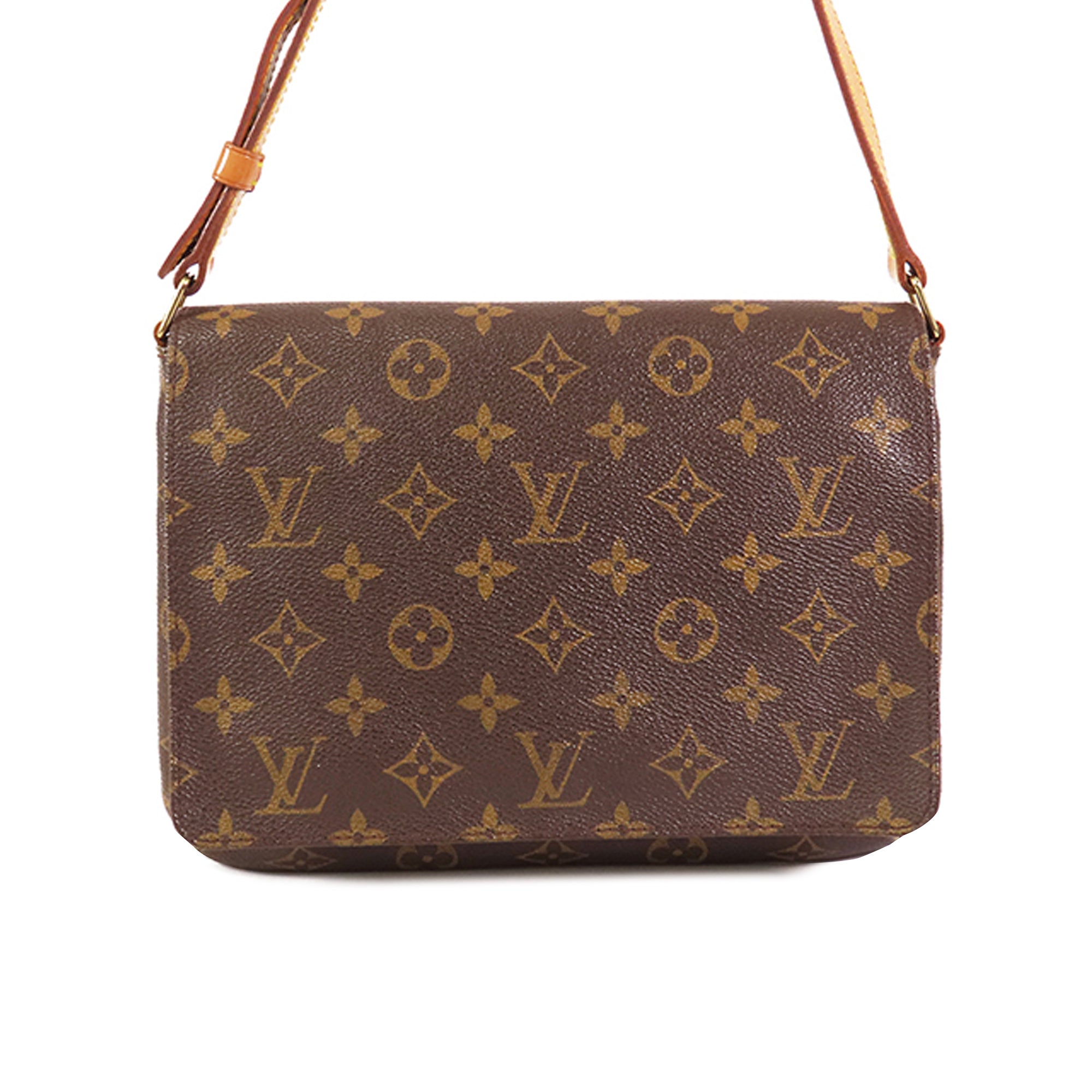 Product Details: Brown LV Monogram Musette Tango Long Strap Crossbody Bag. The Musette Tango features a monogram canvas body, a flat vachetta leather strap, a front flap with a magnetic closure, and an interior slip pocket. 7.5″ L x 9.8″ W x 2″ D. Serial number SP1000.