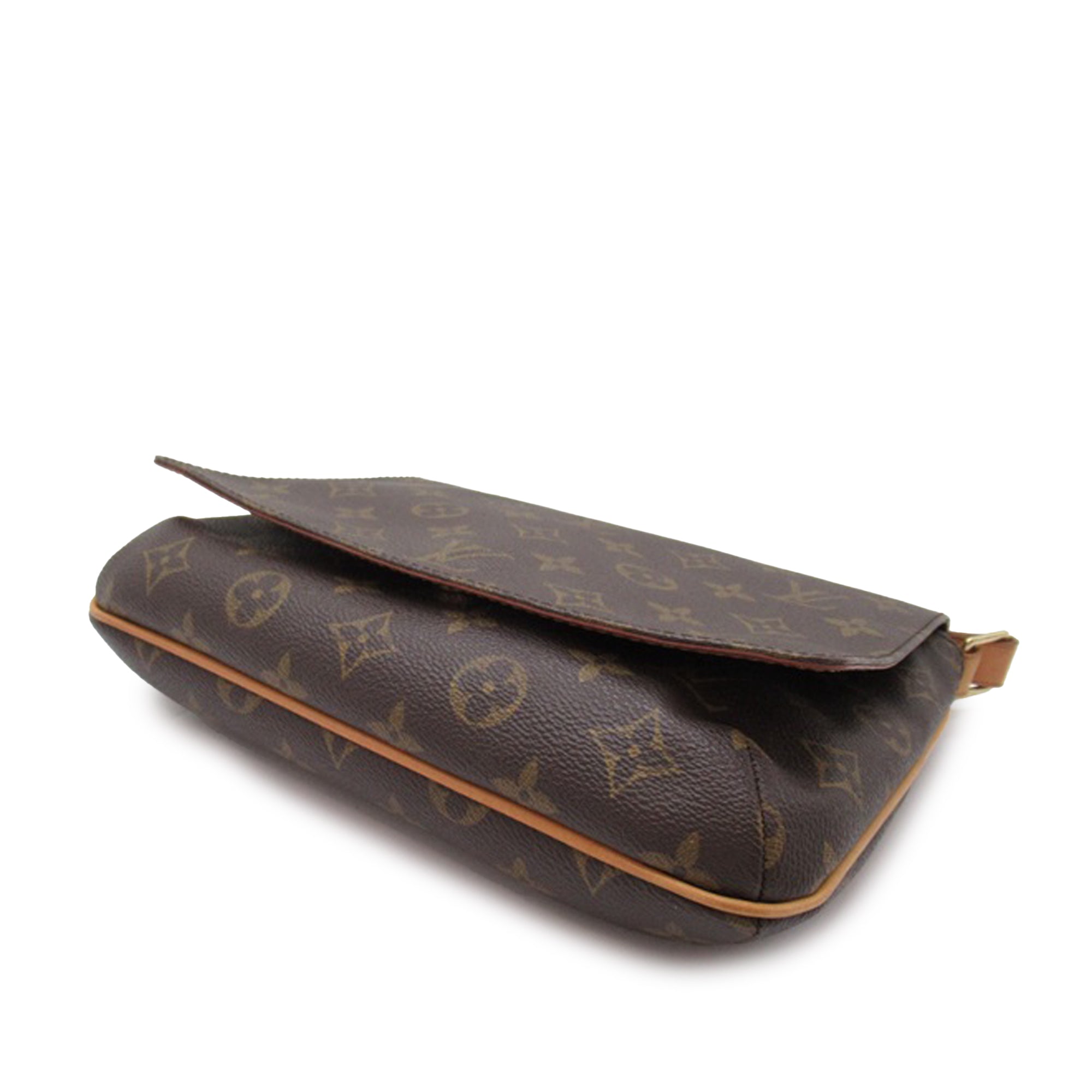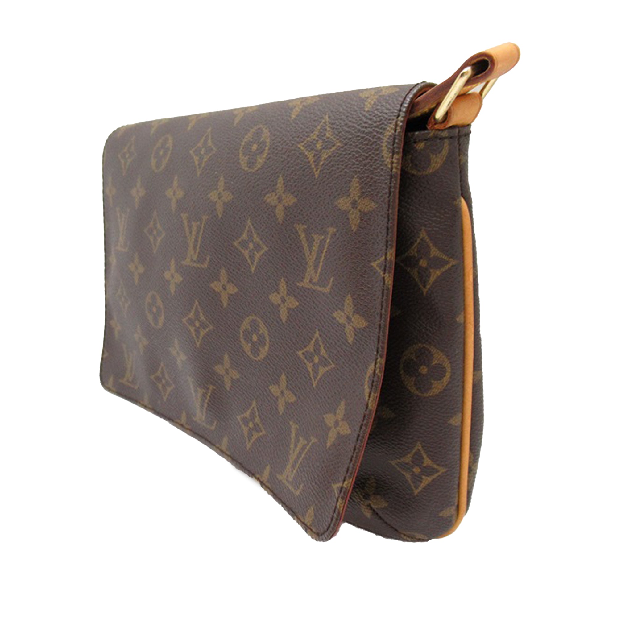 Product Details: Brown LV Monogram Musette Tango Short Strap Shoulder Bag. The Musette Tango features a monogram canvas body, a vachetta leather shoulder strap, a front flap with magnetic snap closure, and an interior slip pocket. 10″ L x 7.3″ W x 2.6″ D. Serial number SP0071.
