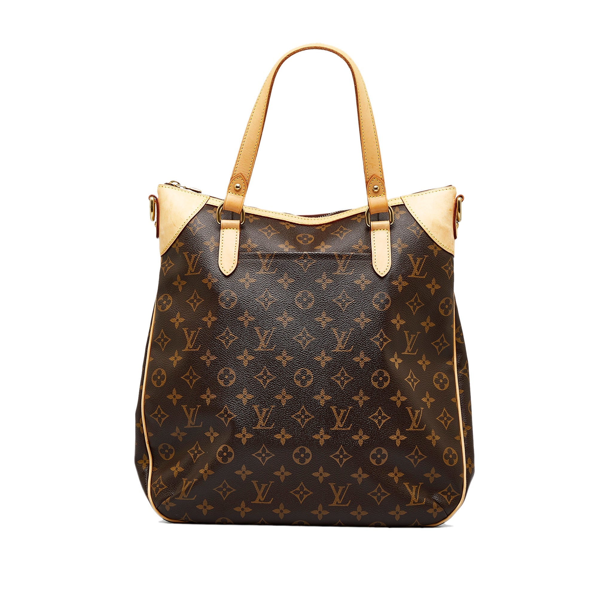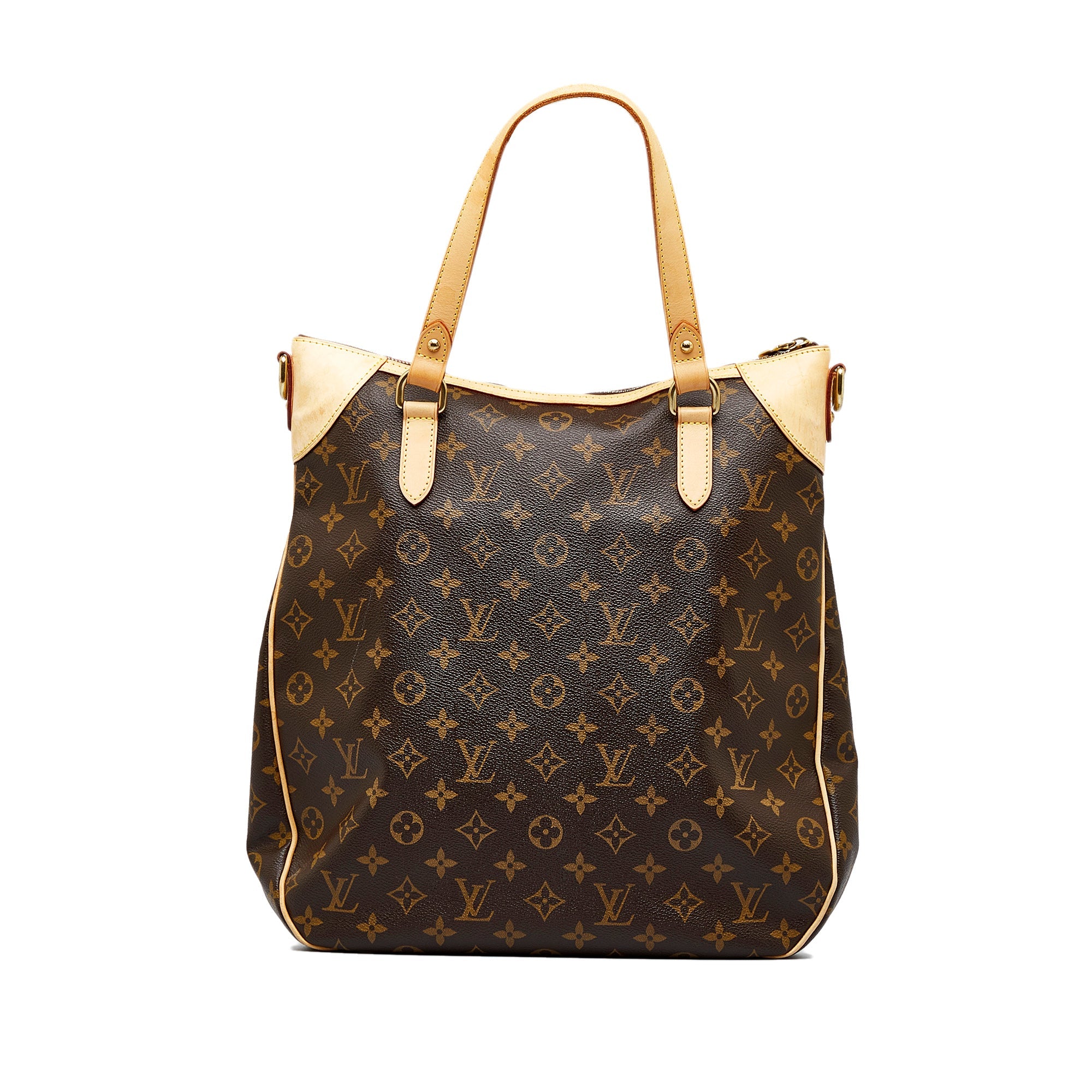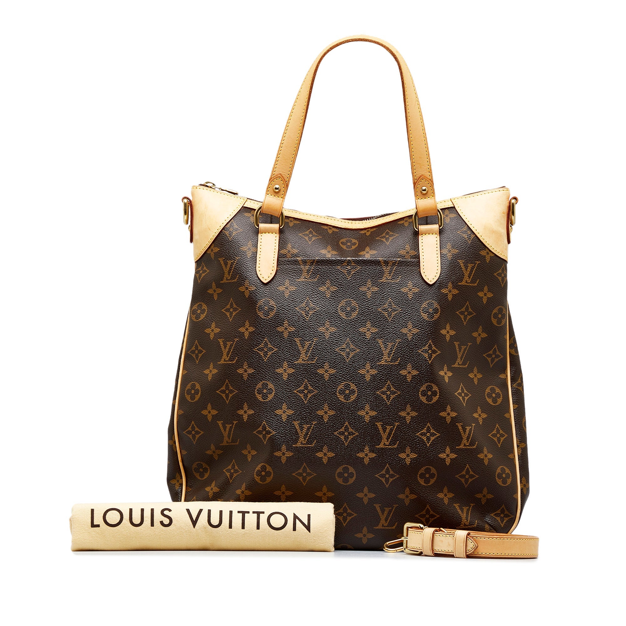 Product Details: Brown LV Monogram Odeon GM Satchel. The Odeon GM features a monogram canvas body with vachetta leather trim, flat leather straps, a detachable flat leather strap, a top zip closure, an exterior slip pocket, and interior slip pockets. 14.6″ L x 11″ W x 2″ D, 6.3″ drop. Serial number DU4098.