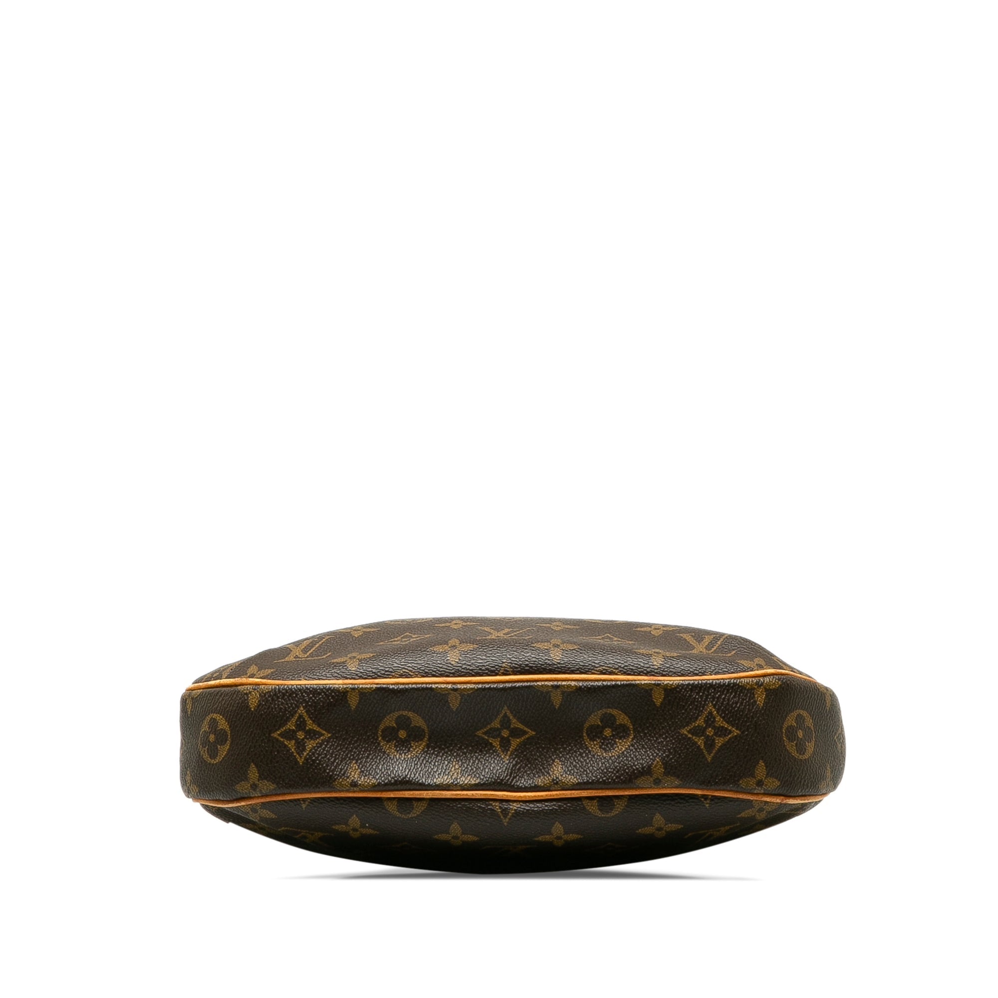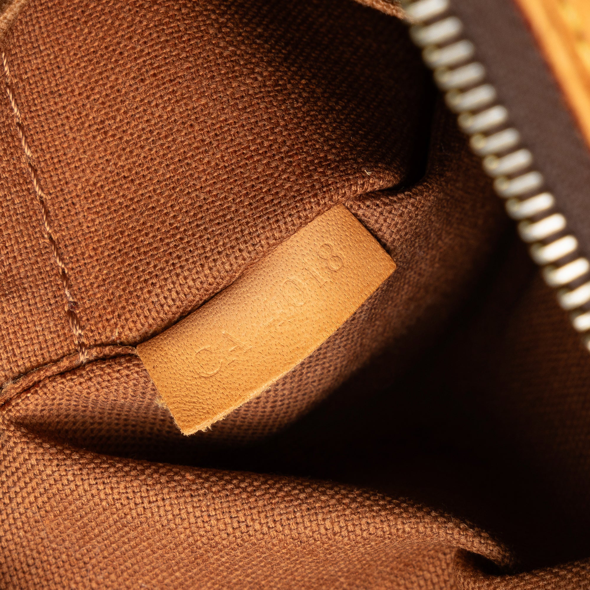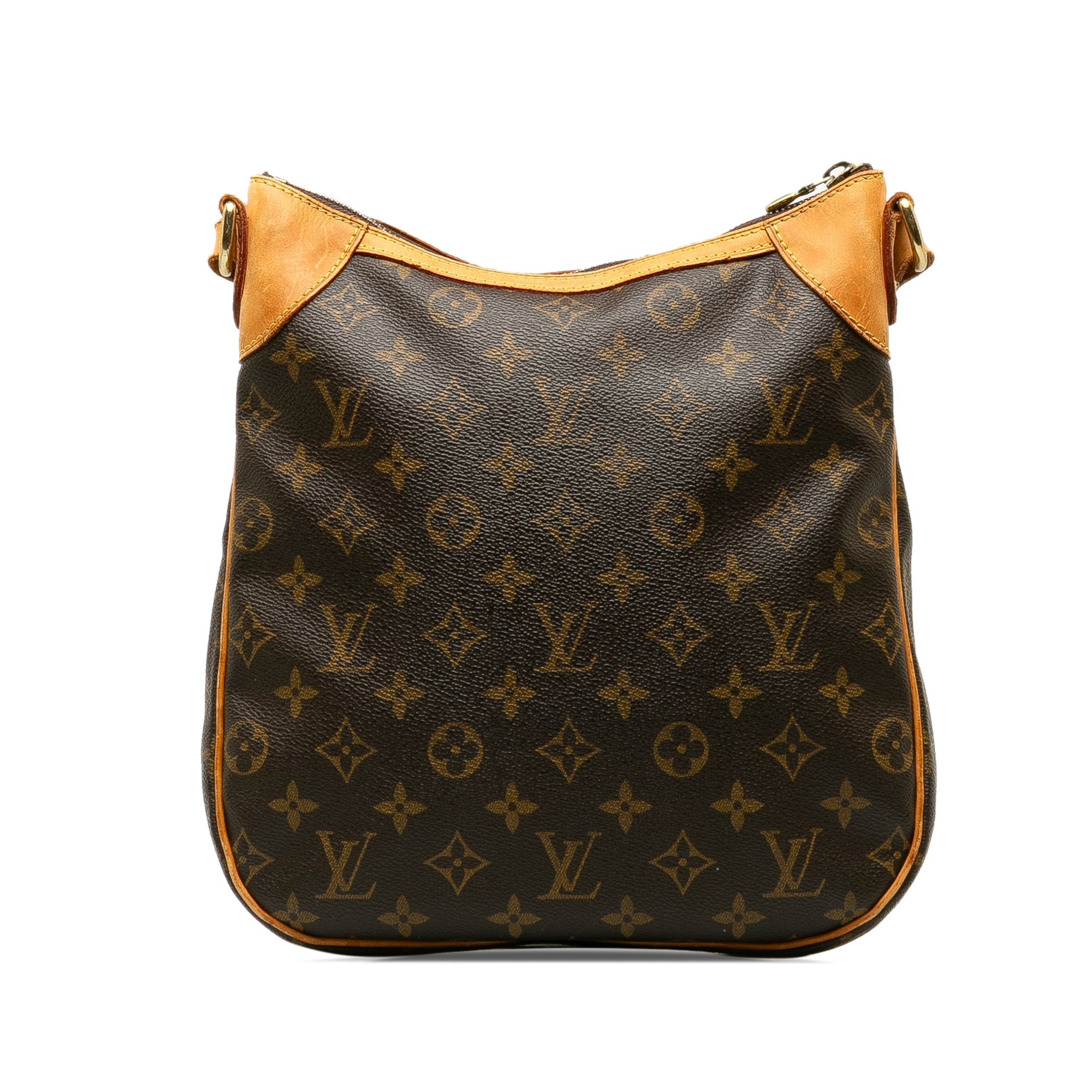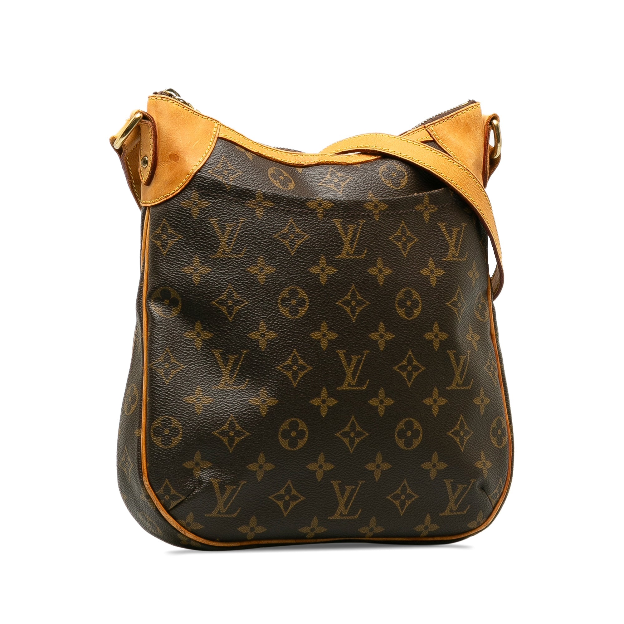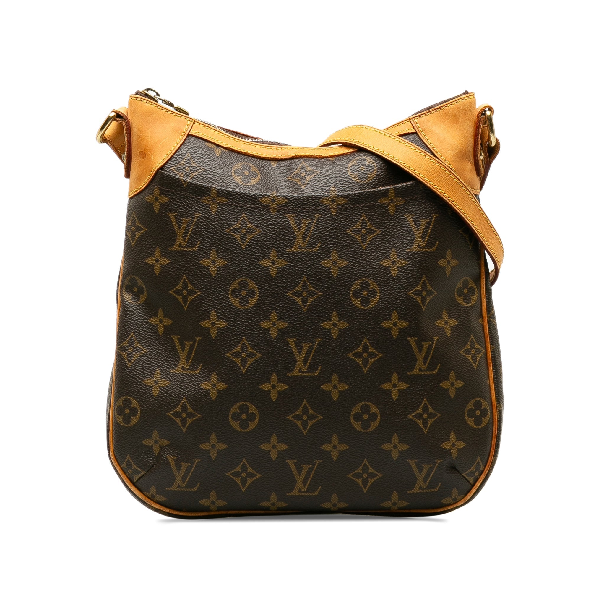 Product Details: Brown LV Monogram Odeon PM Crossbody Bag. The Odeon PM features a monogram canvas body with vachetta leather trim, an exterior front slip pocket, an adjustable flat leather strap, a top zip closure, and interior slip pockets. 10.6″ L x 10.2″ W x 1.8″ D. Serial number CA4018.