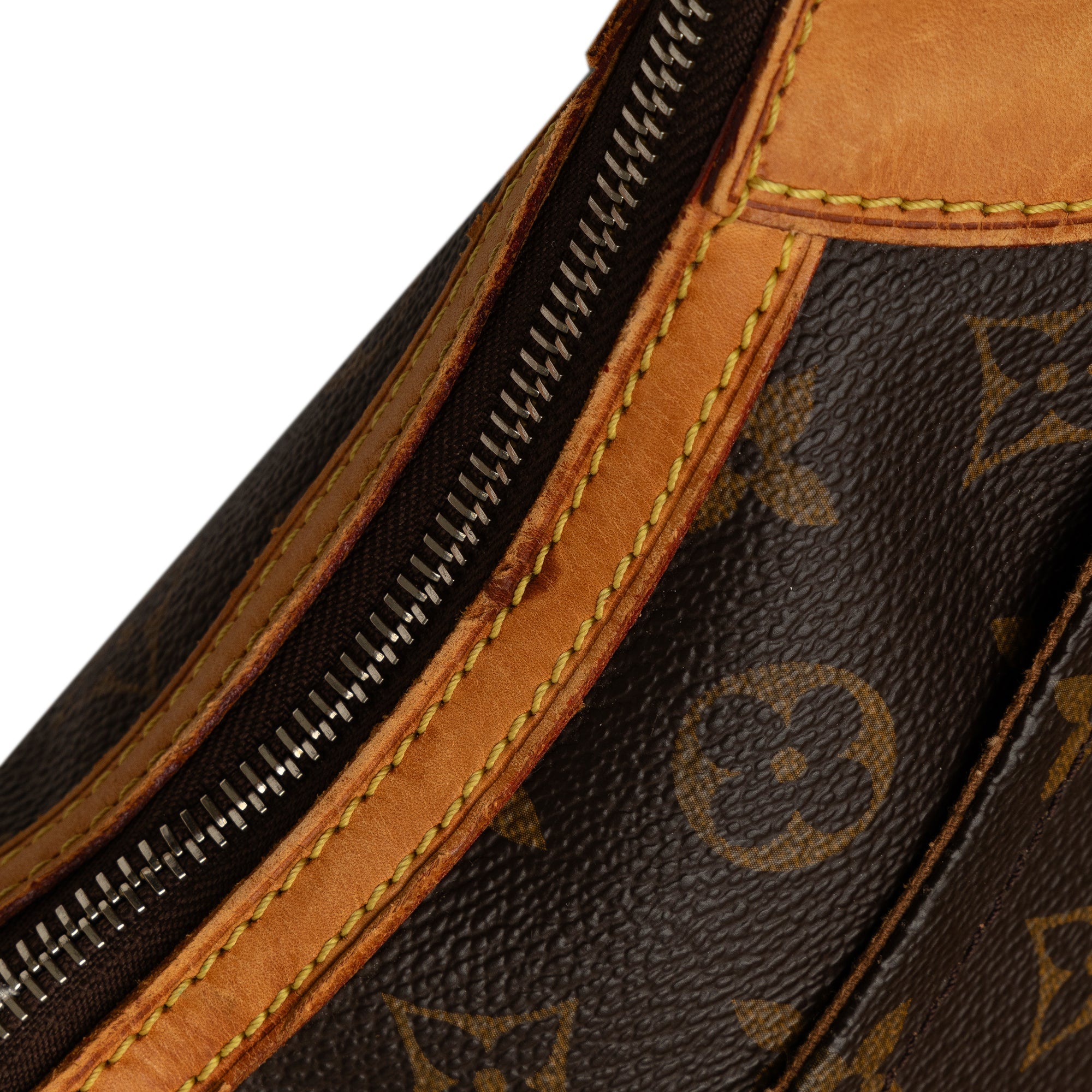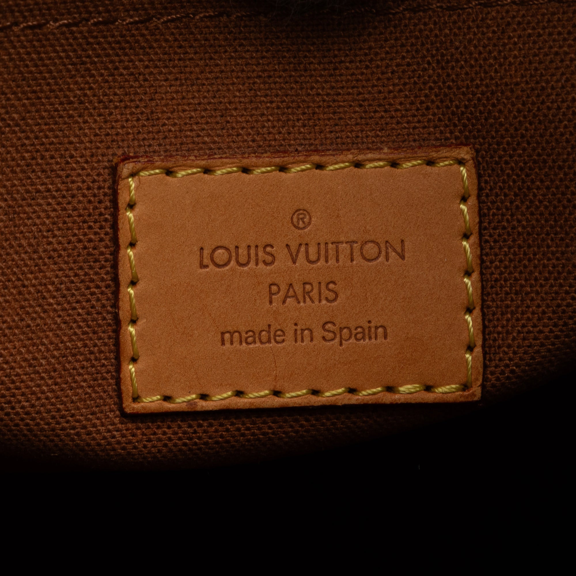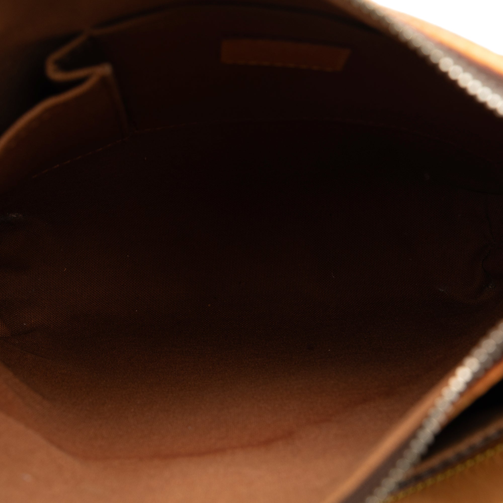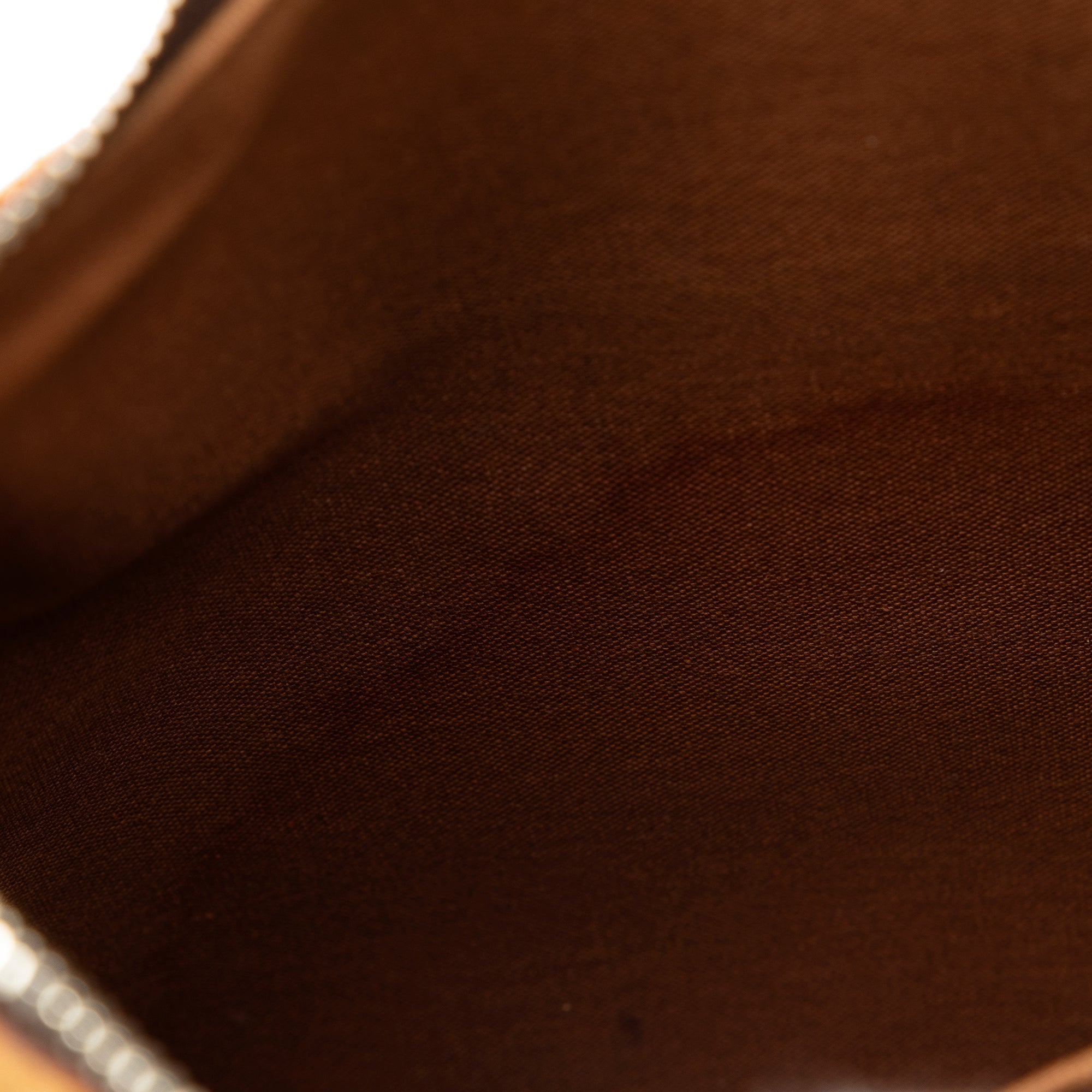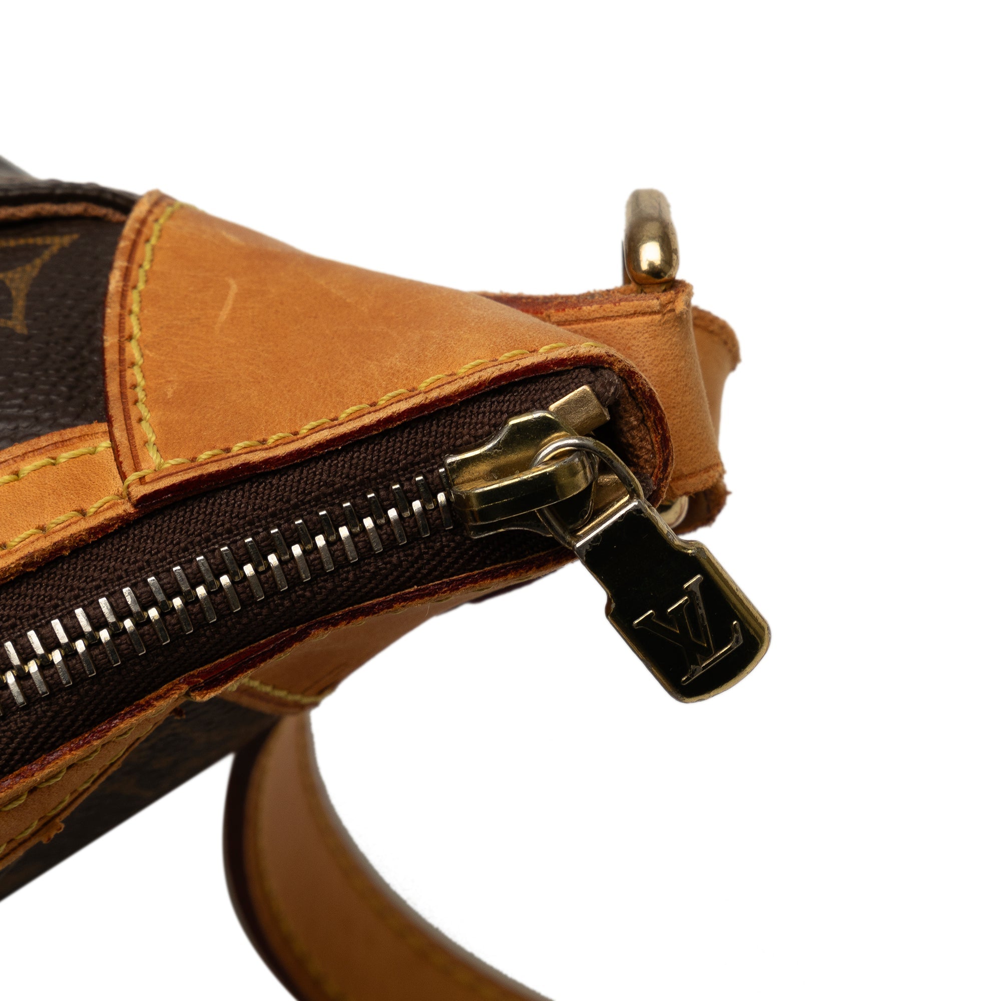 Product Details: Brown LV Monogram Odeon PM Crossbody Bag. The Odeon PM features a monogram canvas body with vachetta leather trim, an exterior front slip pocket, an adjustable flat leather strap, a top zip closure, and interior slip pockets. 10.6″ L x 10.2″ W x 1.8″ D. Serial number CA4018.