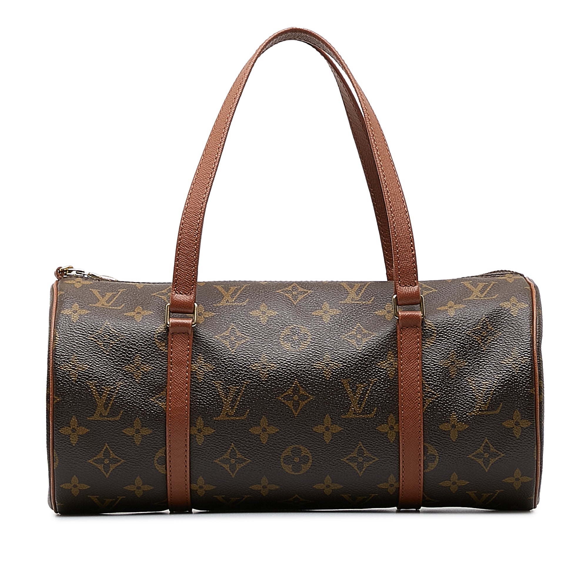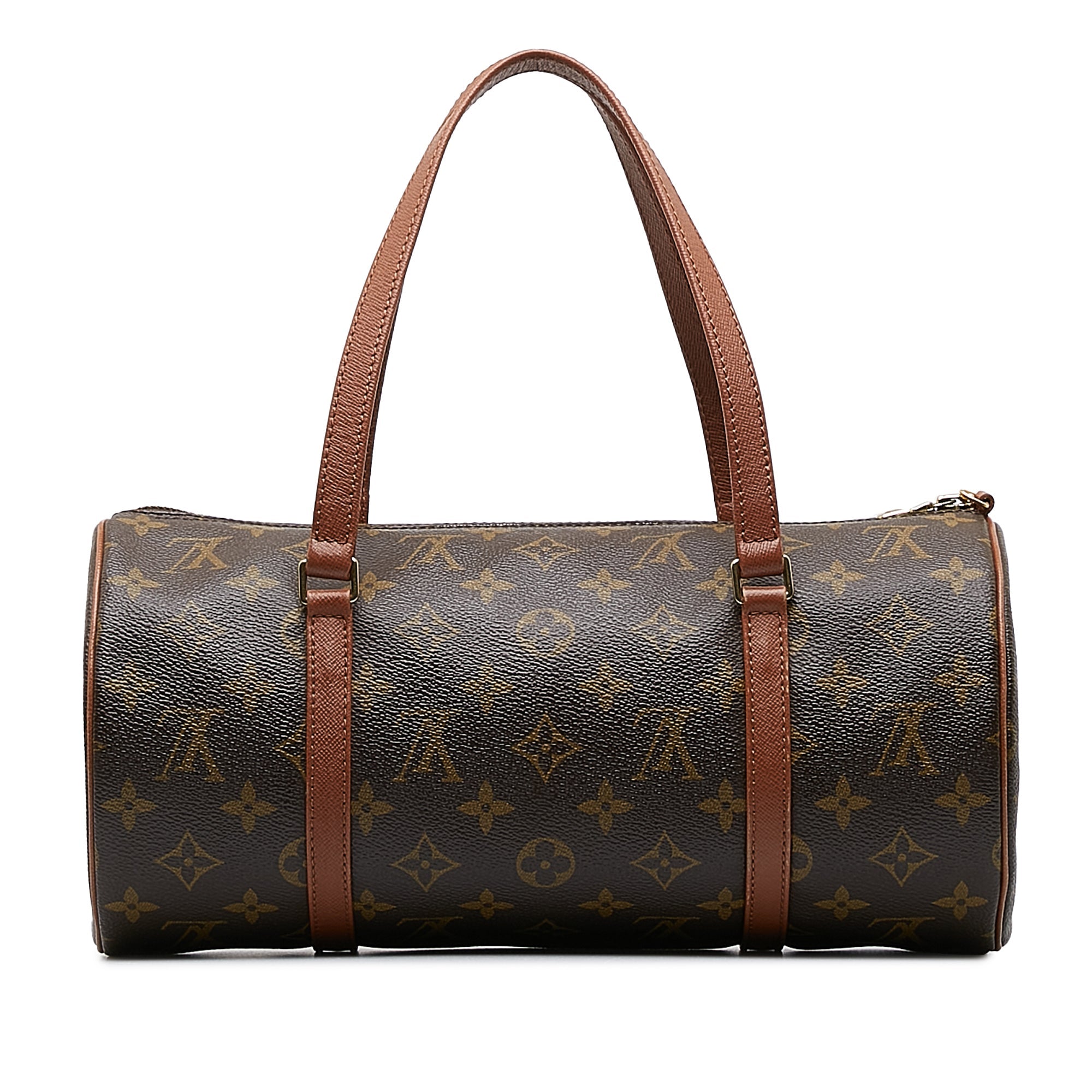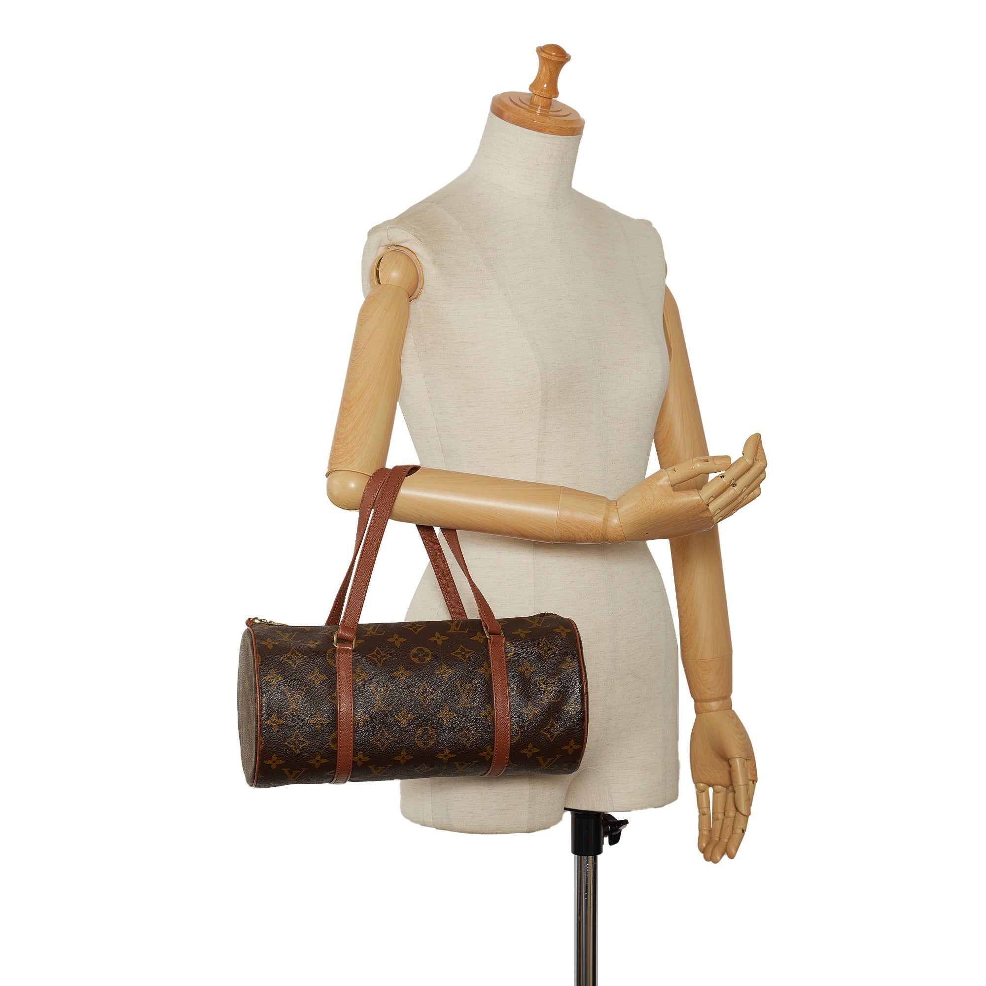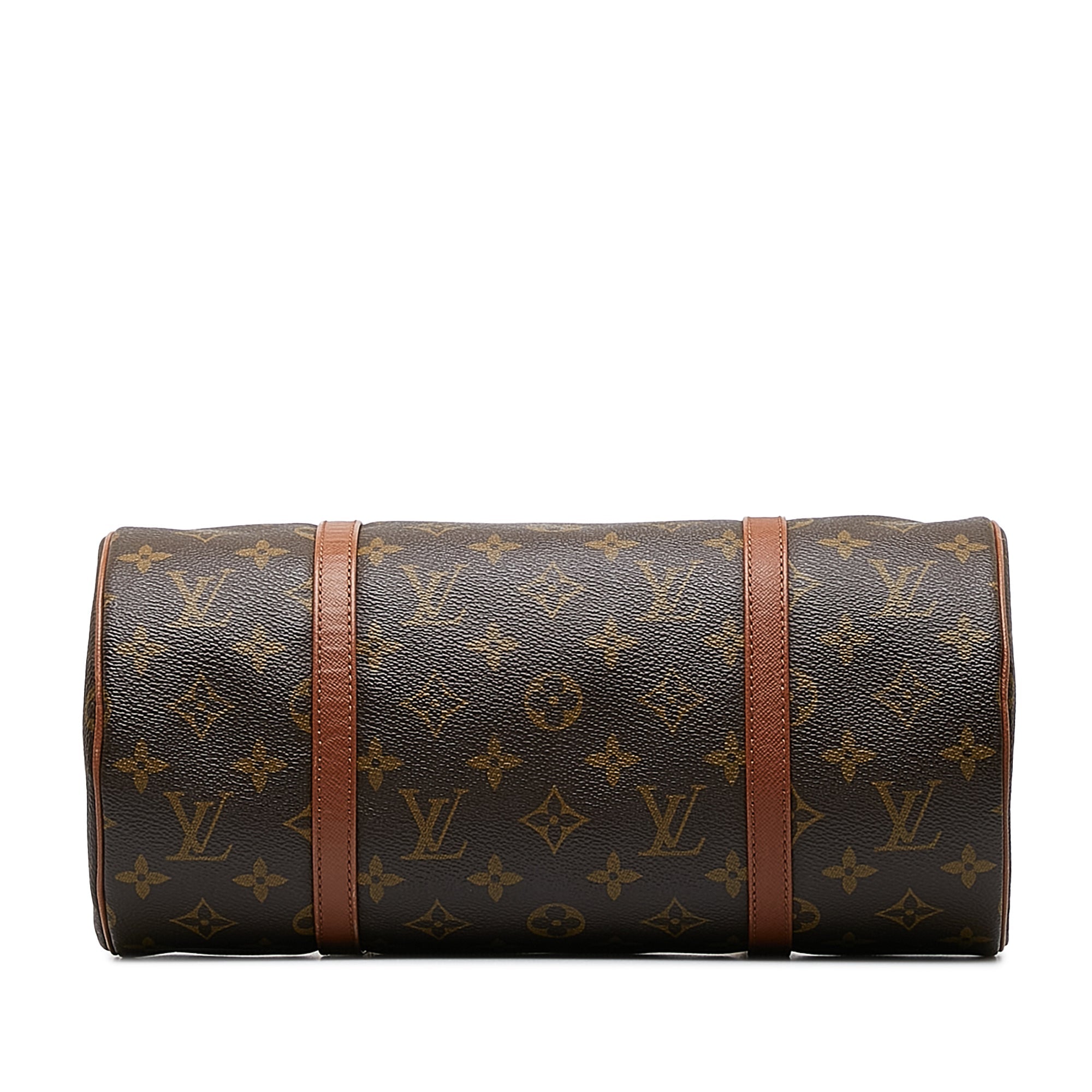Product Details: Brown LV Monogram Papillon 30 Handbag. The Papillon 30 features a monogram canvas body with vachetta leather trim, flat vachetta leather handles, and a top zip closure. 5.9″ L x 11.8″ W x 5.9″ D, 6.7″ drop. Serial number N00936.
