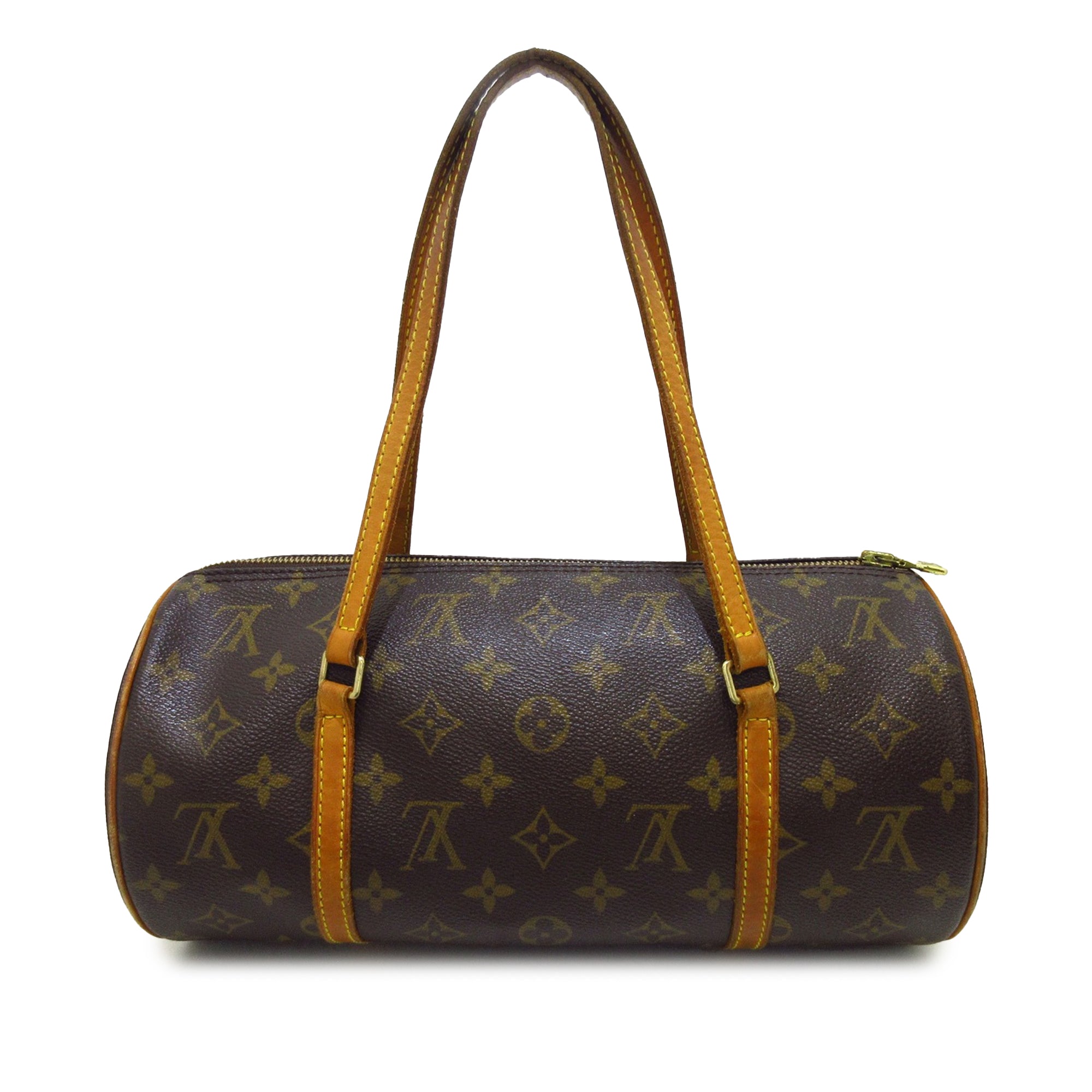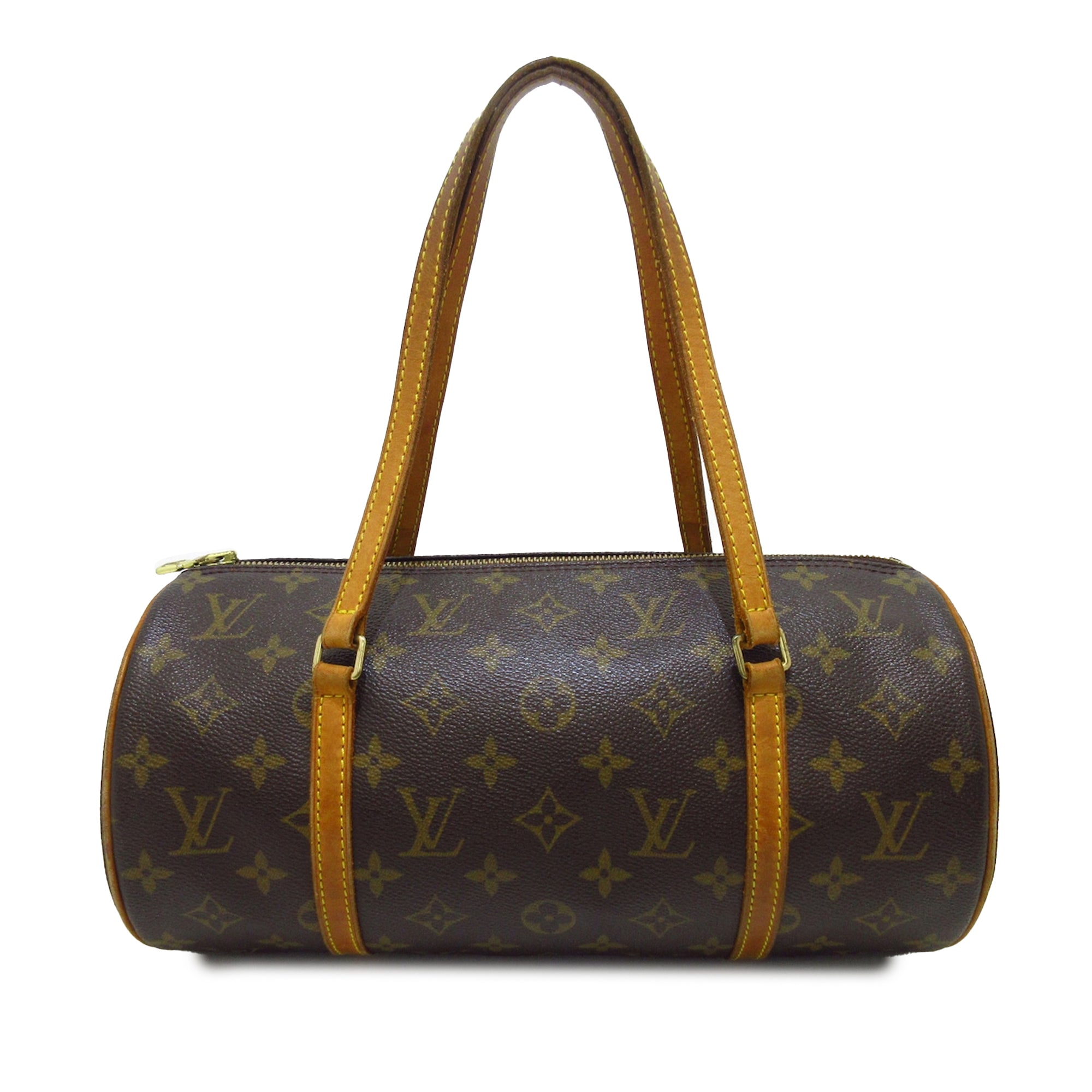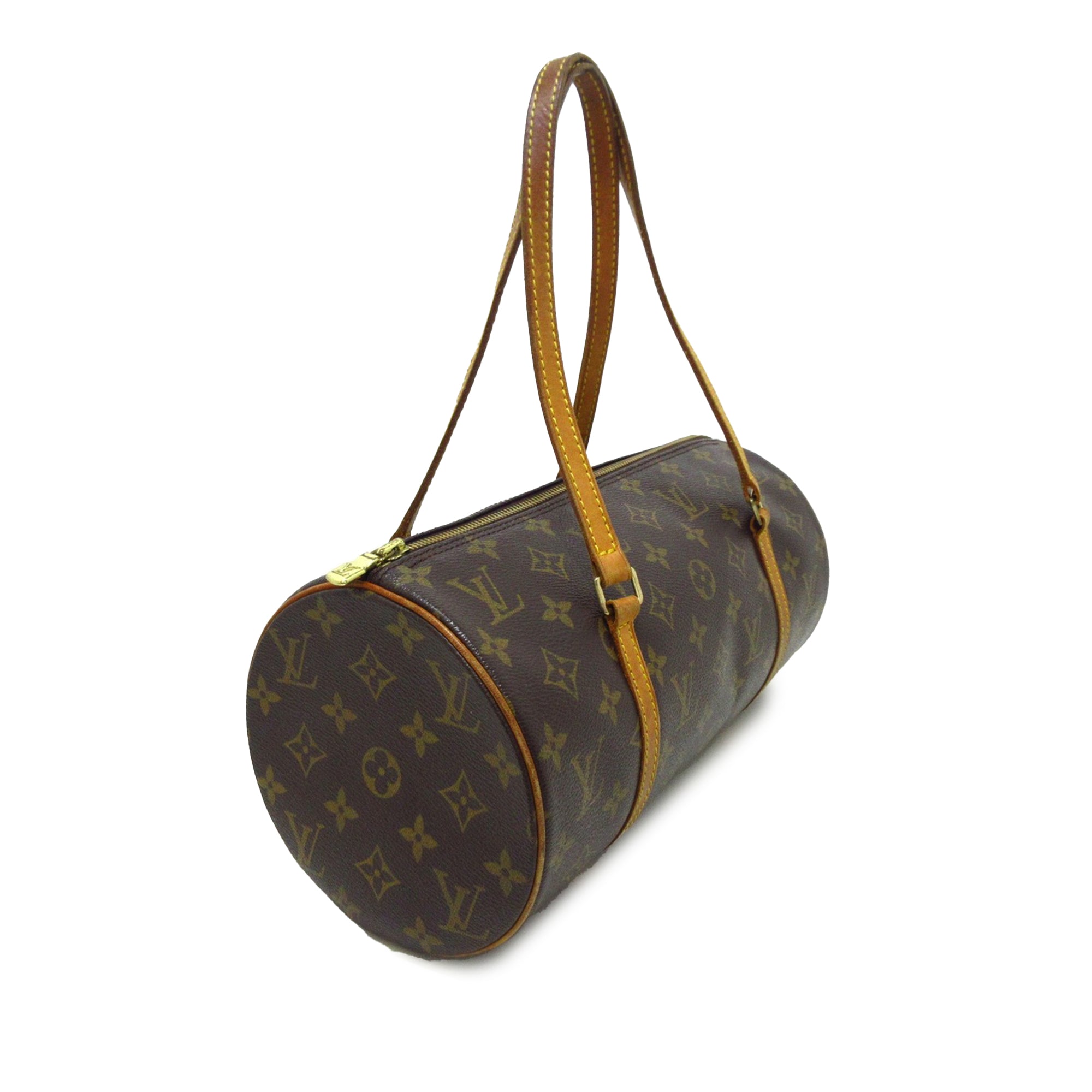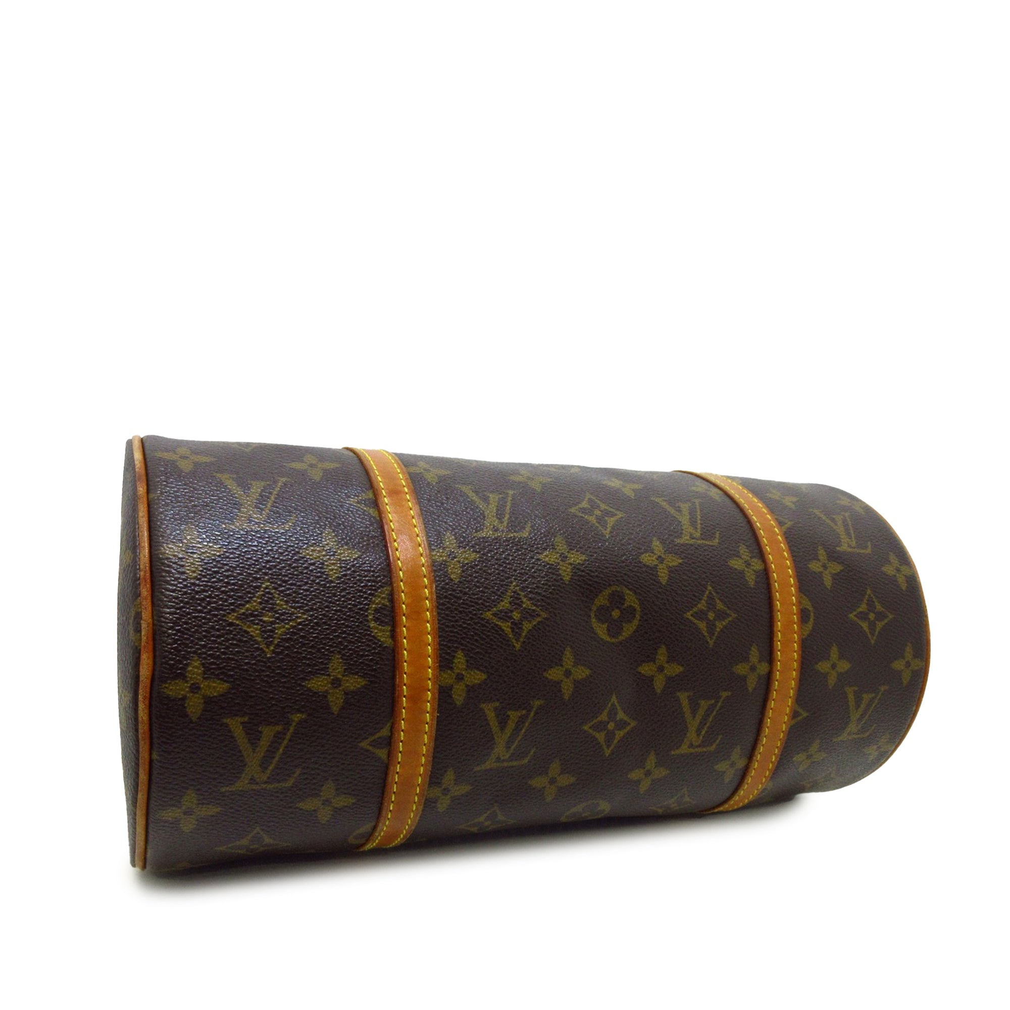 Product Details: Brown LV Monogram Papillon 30 Handbag. The Papillon 30 features a monogram canvas body with vachetta leather trim, flat vachetta leather handles, and a top zip closure. 5.9″ L x 11.8″ W x 5.9″ D, 6.3″ drop. Serial number MB0053.