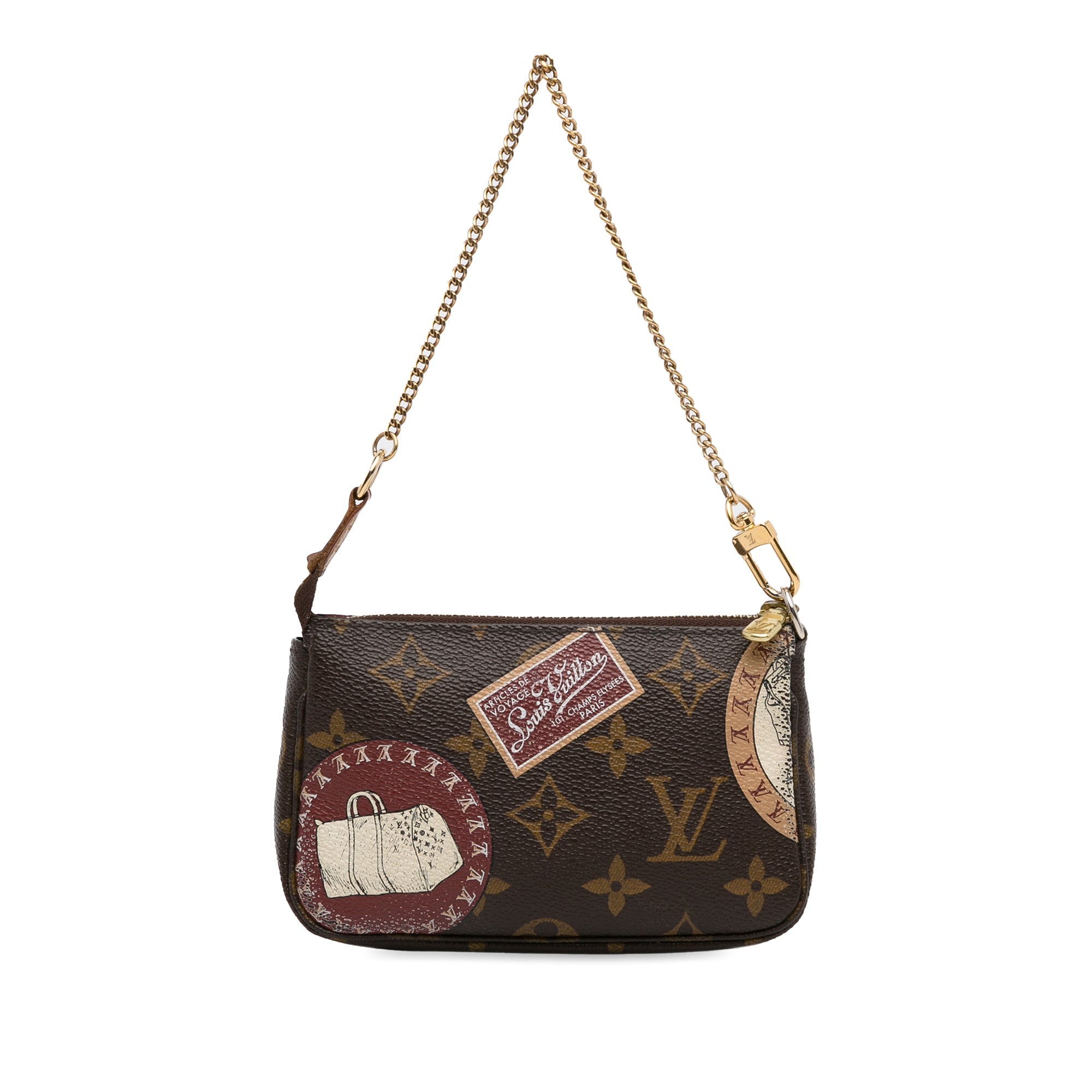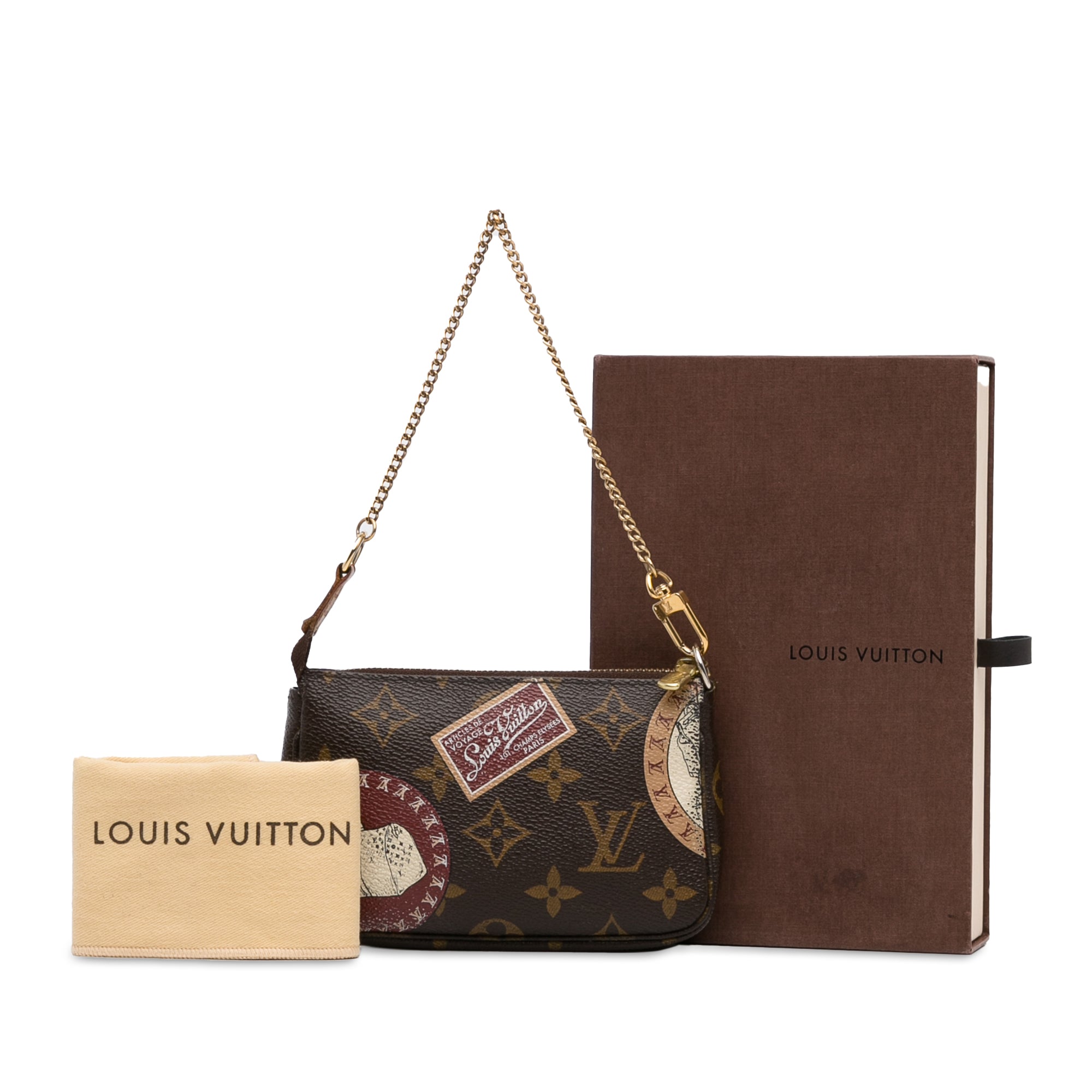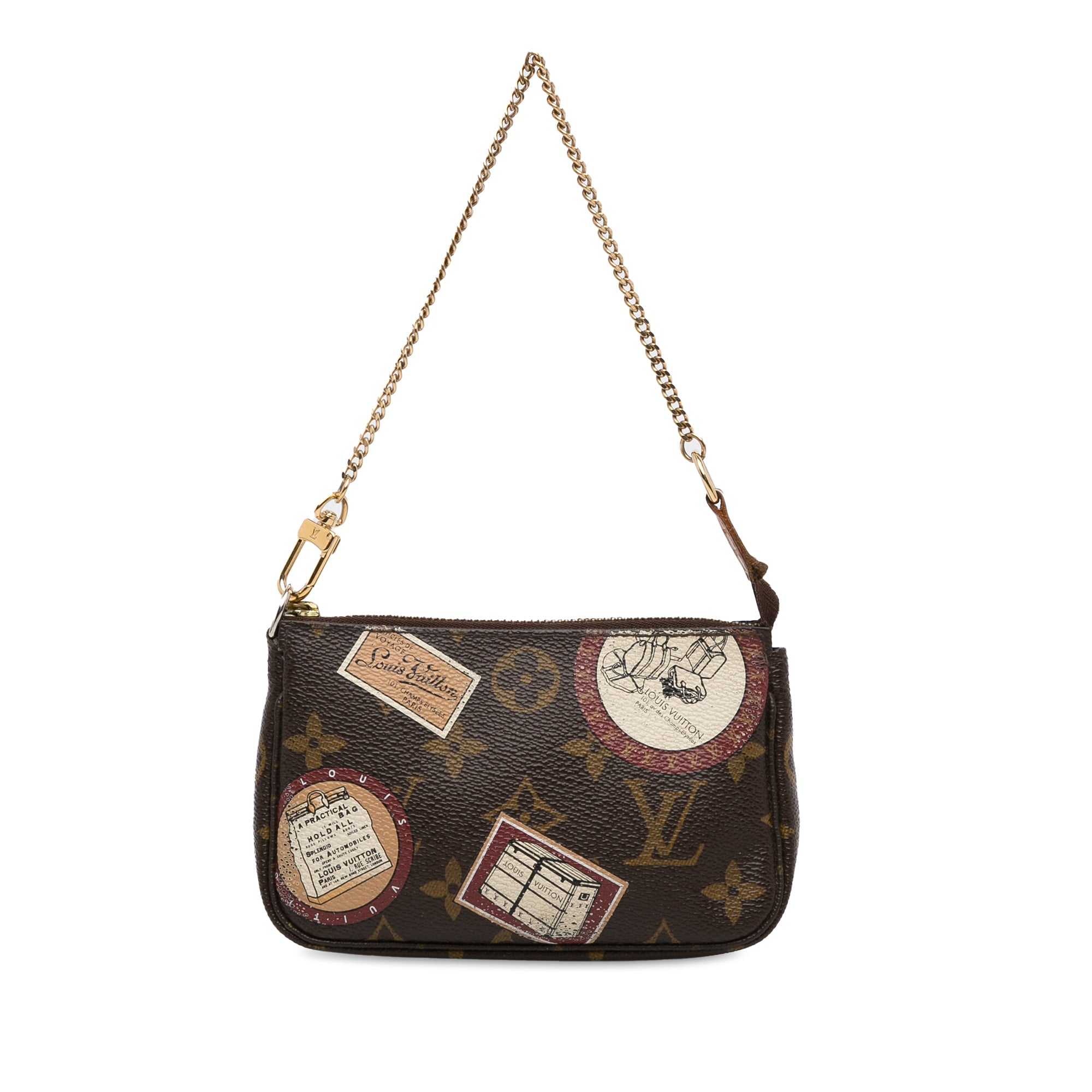 Product Details: Brown LV Monogram Patch Mini Pochette Accessoires Shoulder Bag. The Mini Pochette Accessoires features a monogram canvas body, a gold-tone chain strap, and a top zip closure. 3.7″ L x 5.9″ W x 1.2″ D, 11.8″ drop. Serial number FL2009.