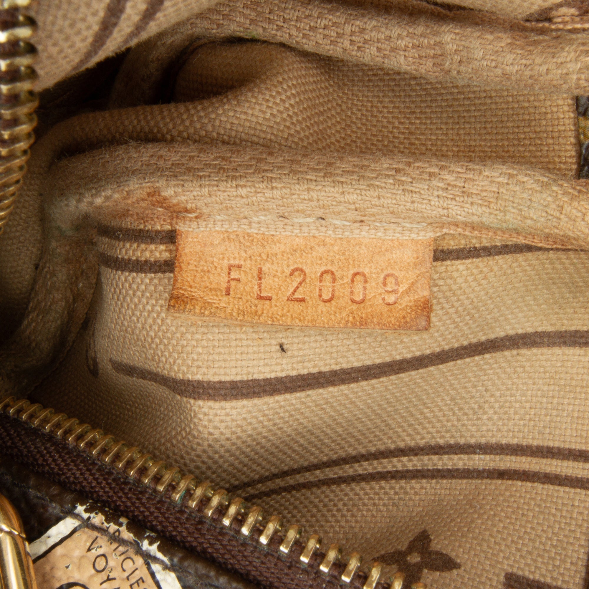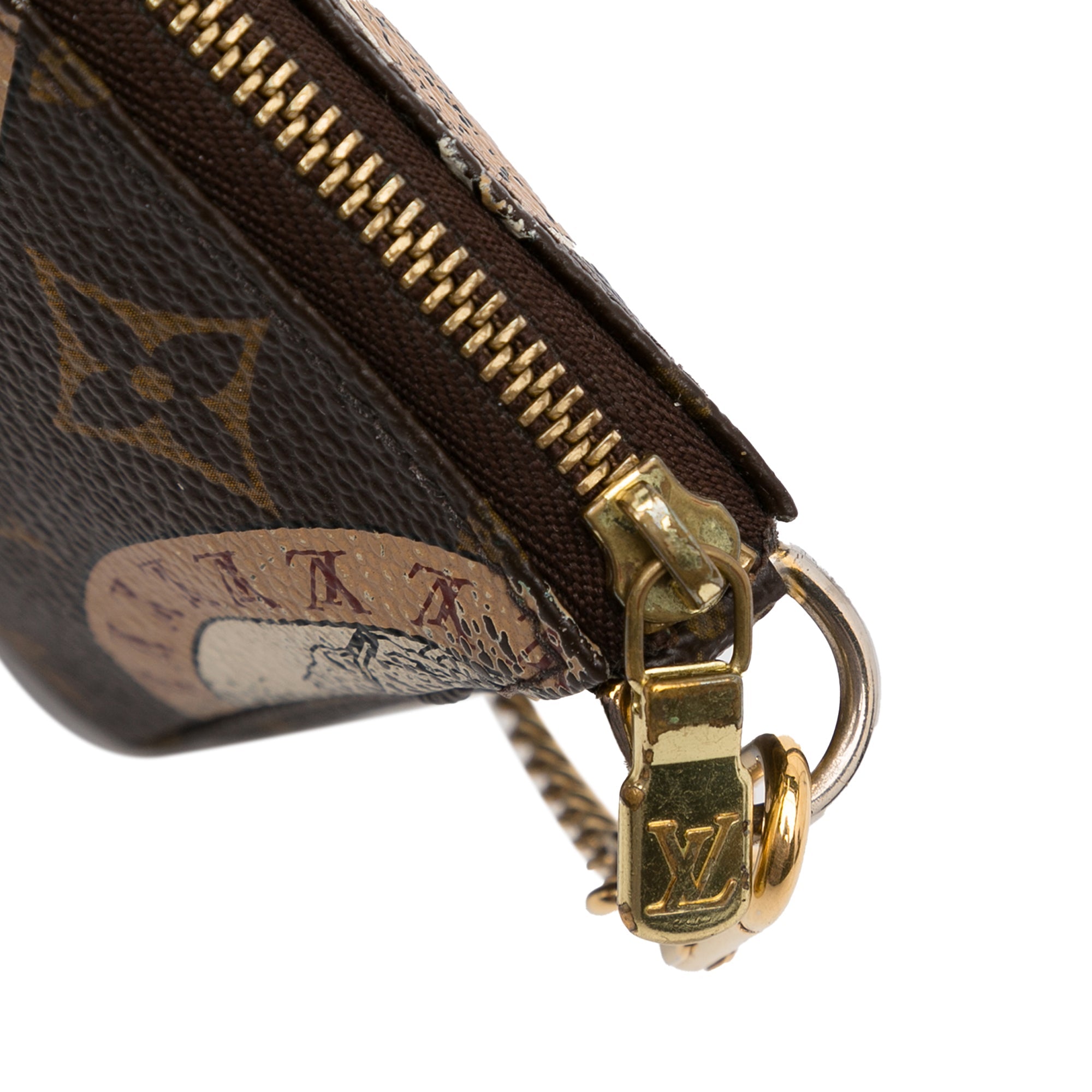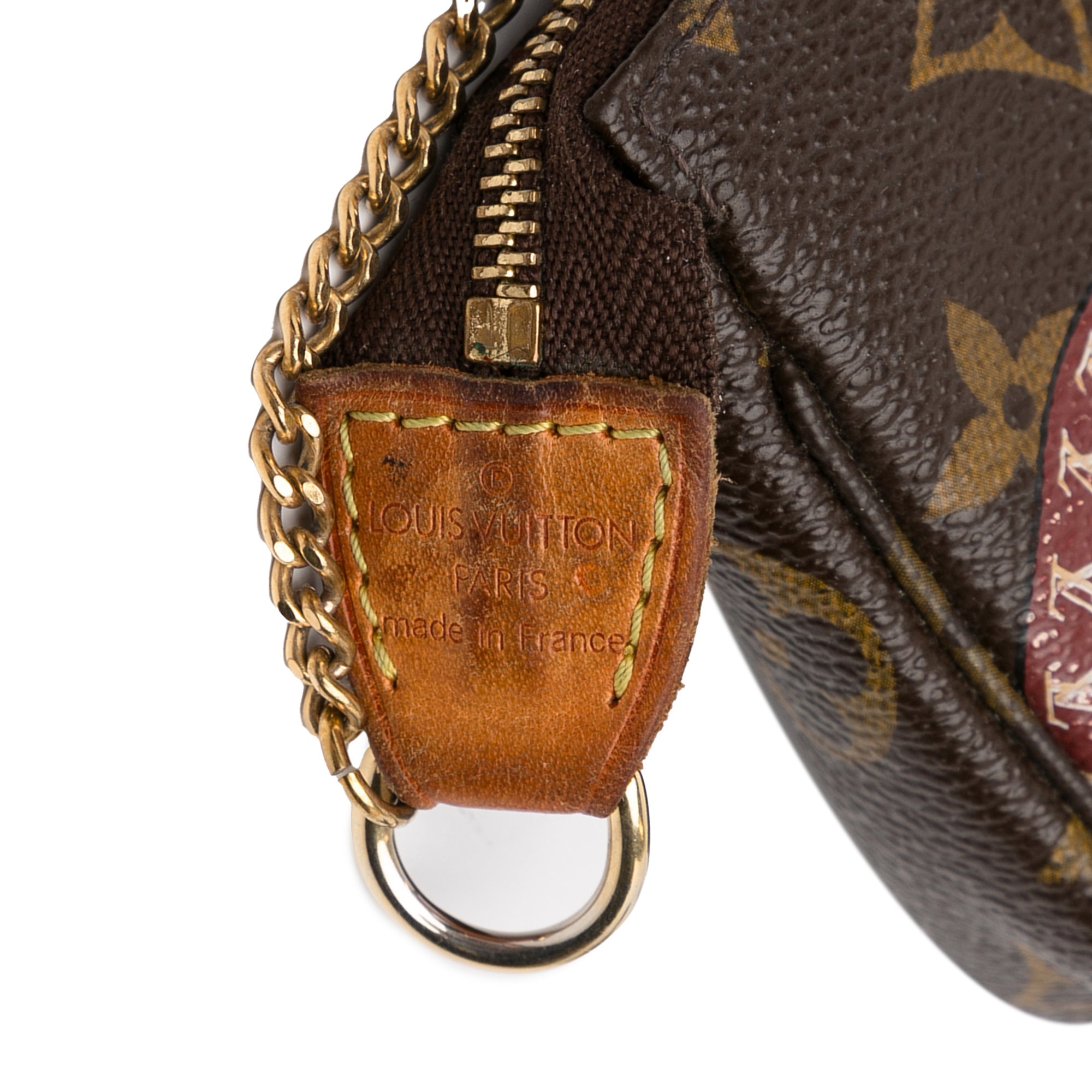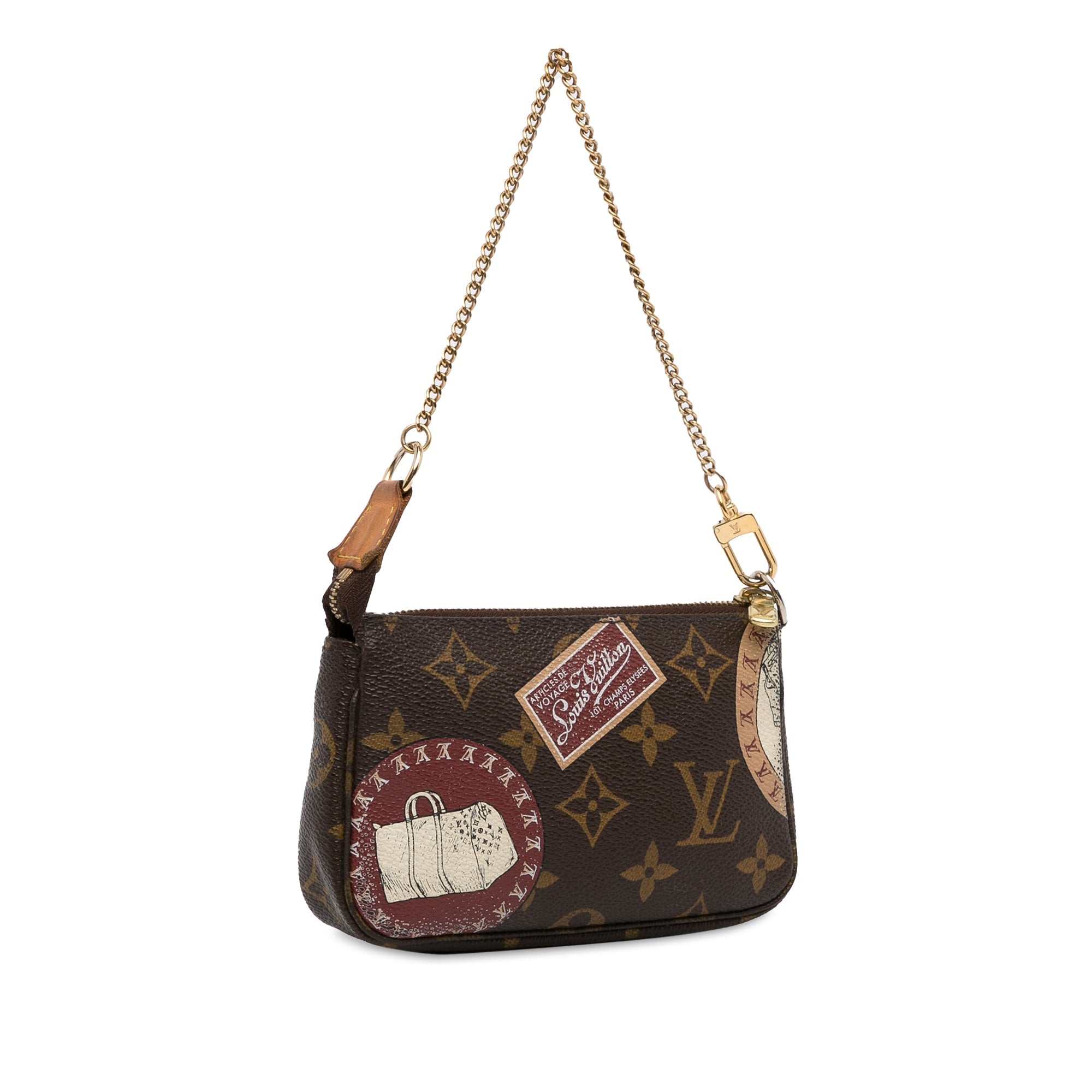 Product Details: Brown LV Monogram Patch Mini Pochette Accessoires Shoulder Bag. The Mini Pochette Accessoires features a monogram canvas body, a gold-tone chain strap, and a top zip closure. 3.7″ L x 5.9″ W x 1.2″ D, 11.8″ drop. Serial number FL2009.