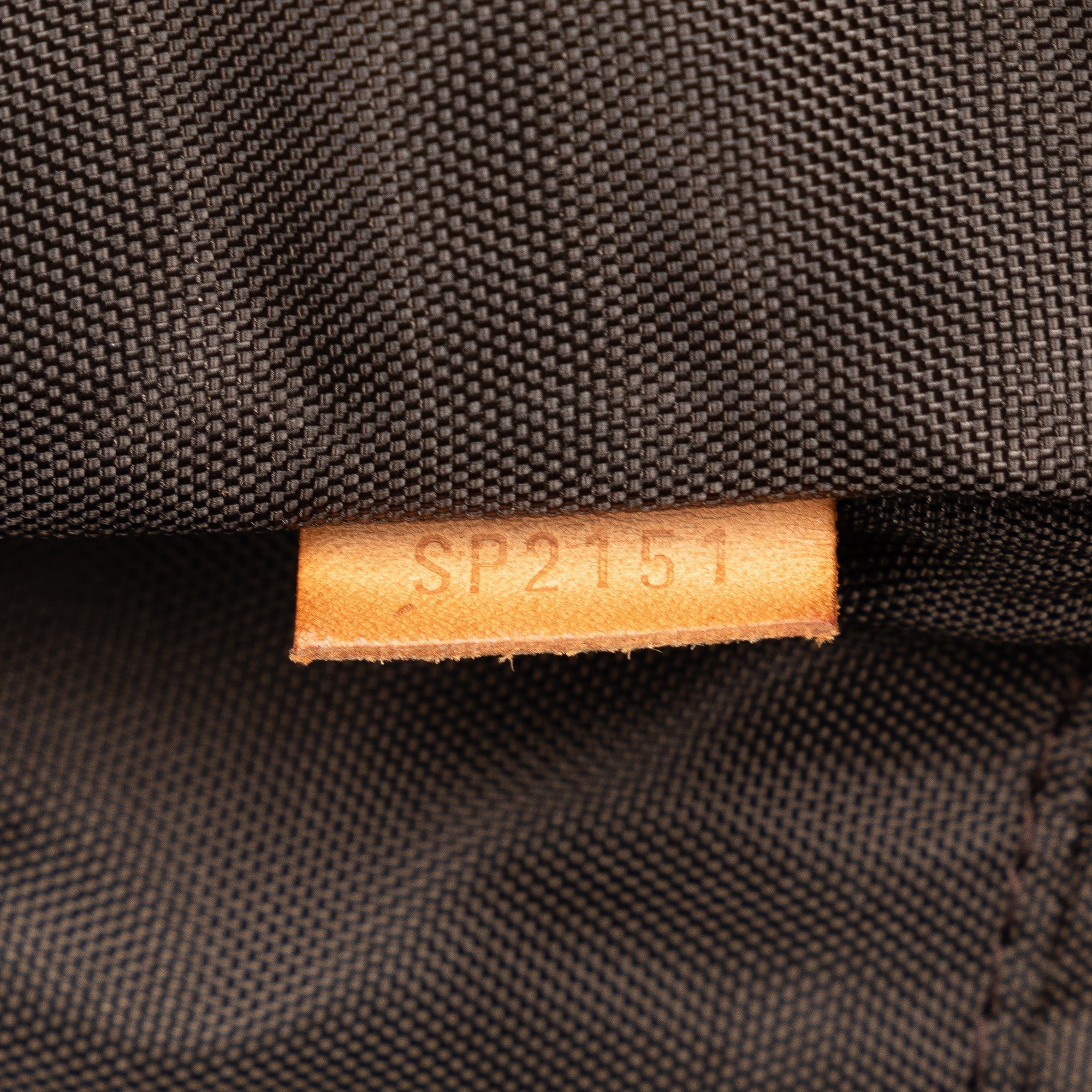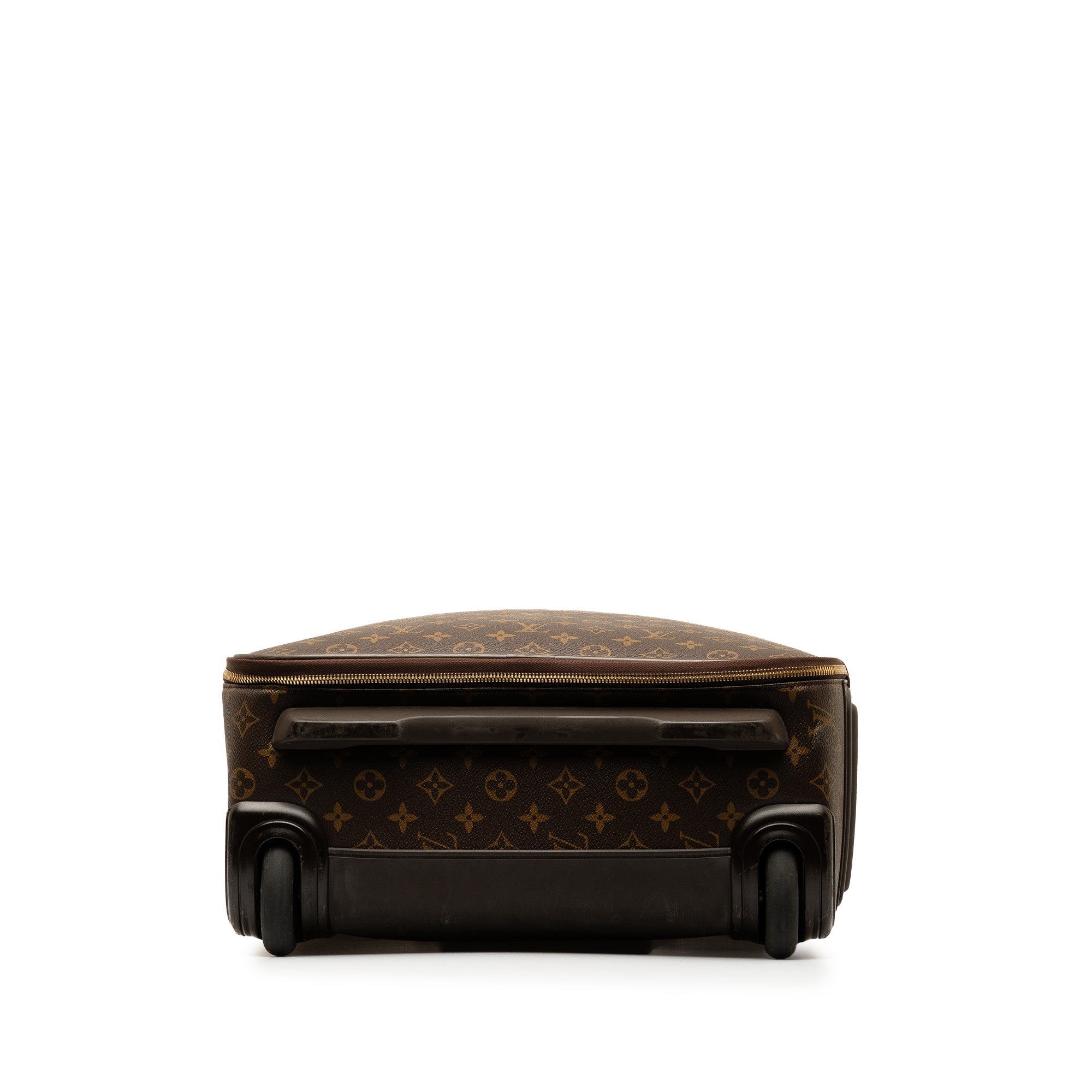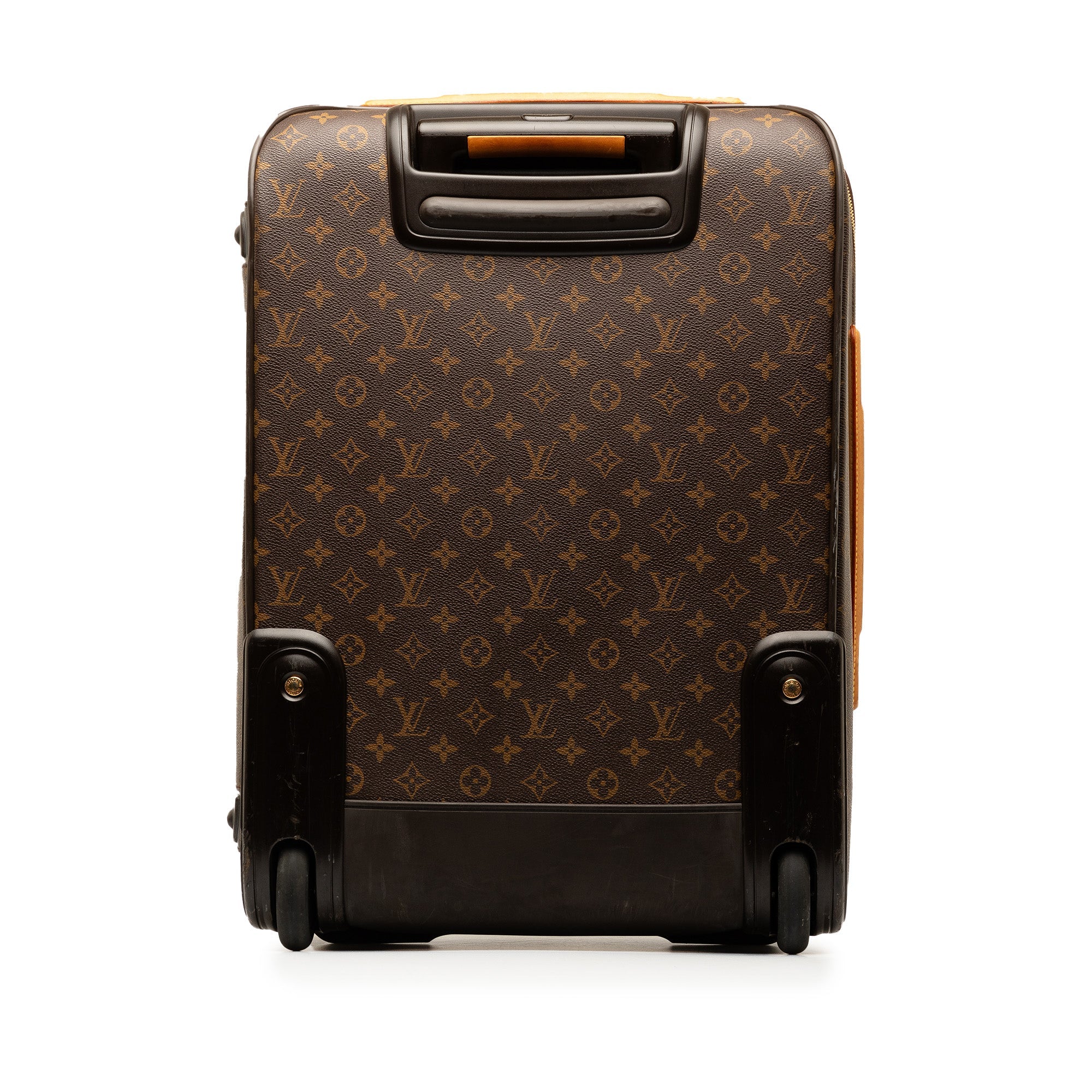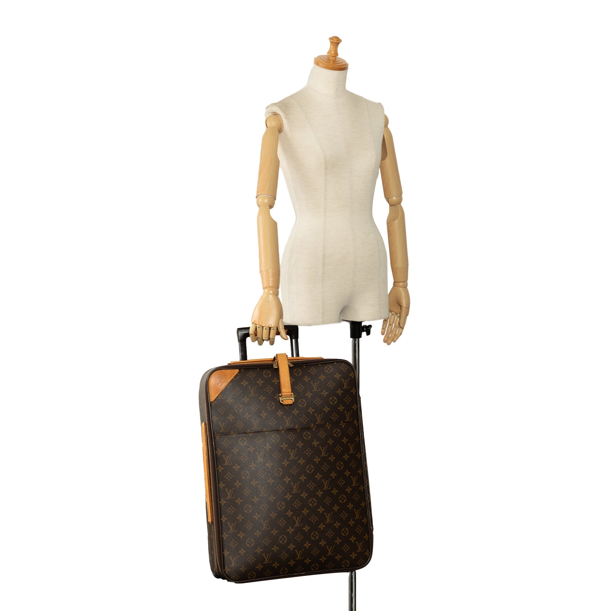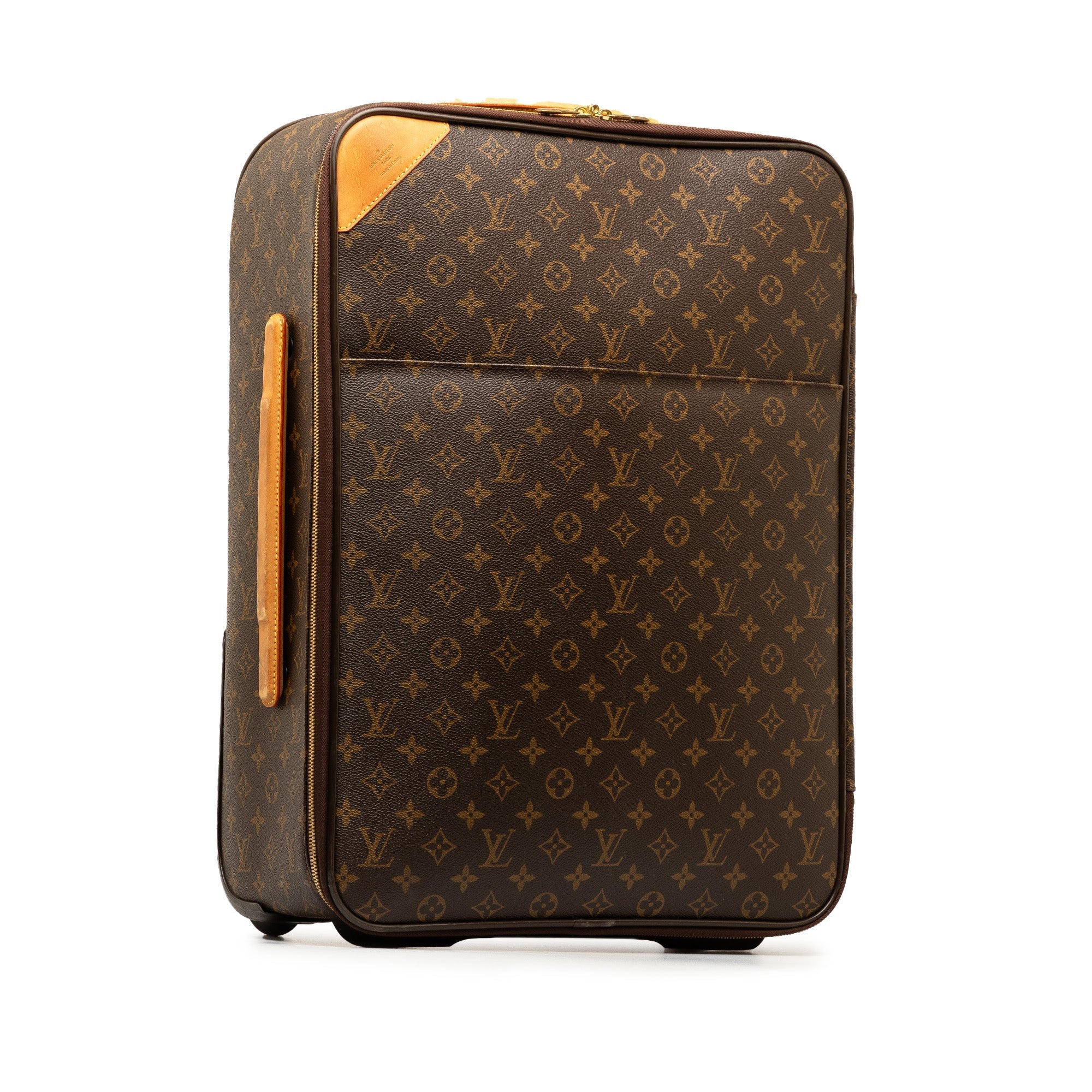 Product Details: Brown LV Monogram Pegase 55 Travel Bag. The Pegase 55 features a monogram canvas body, dual wheels, a retractable top handle, a flat vachetta leather side handle, a zip-around closure, a front zip pocket, and interior zip pockets. 22.2″ L x 14.2″ W x 5.9″ D, 15.7″ drop. Serial number SP2151.