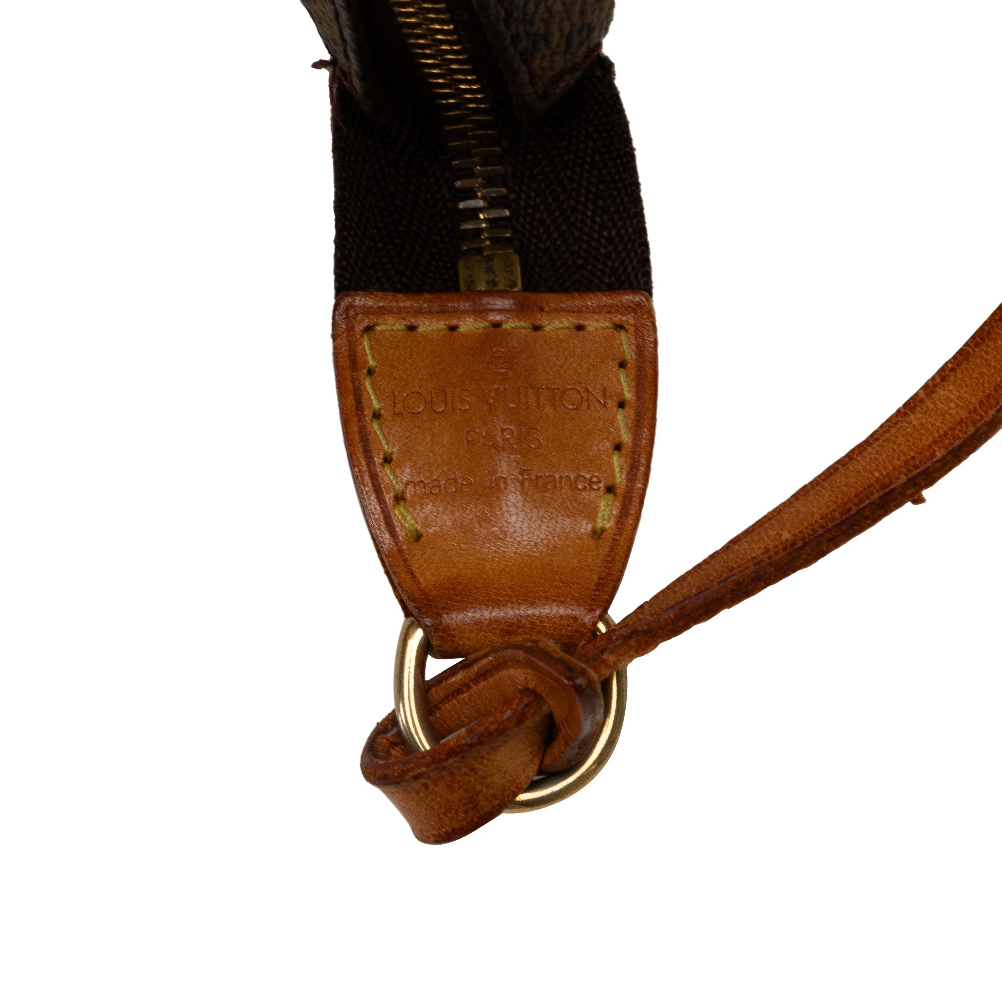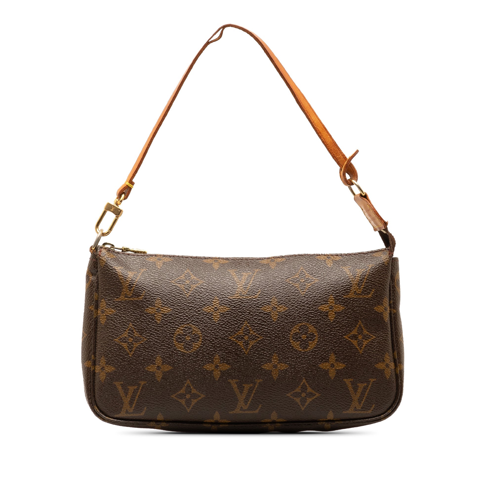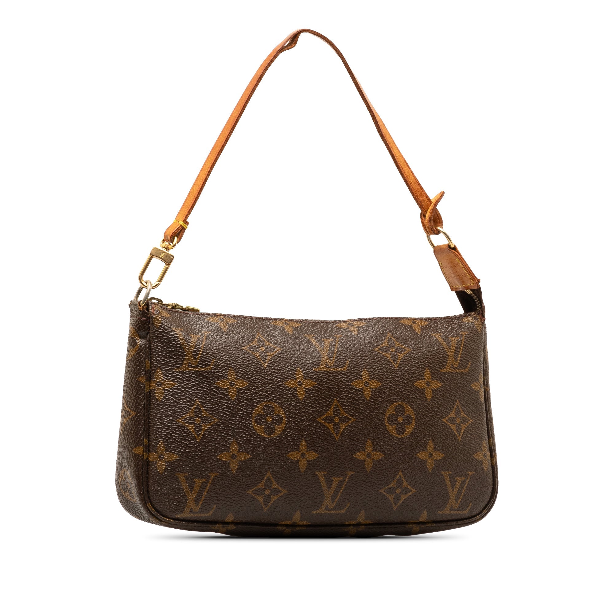 Product Details: Brown LV Monogram Pochette Accessoires Shoulder Bag. The Pochette Accessoires features a monogram canvas body, a flat vachetta leather handle, and a top zip closure. 5.1″ L x 8.3″ W x 1.2″ D, 5.7″ drop. Serial number AR1918.