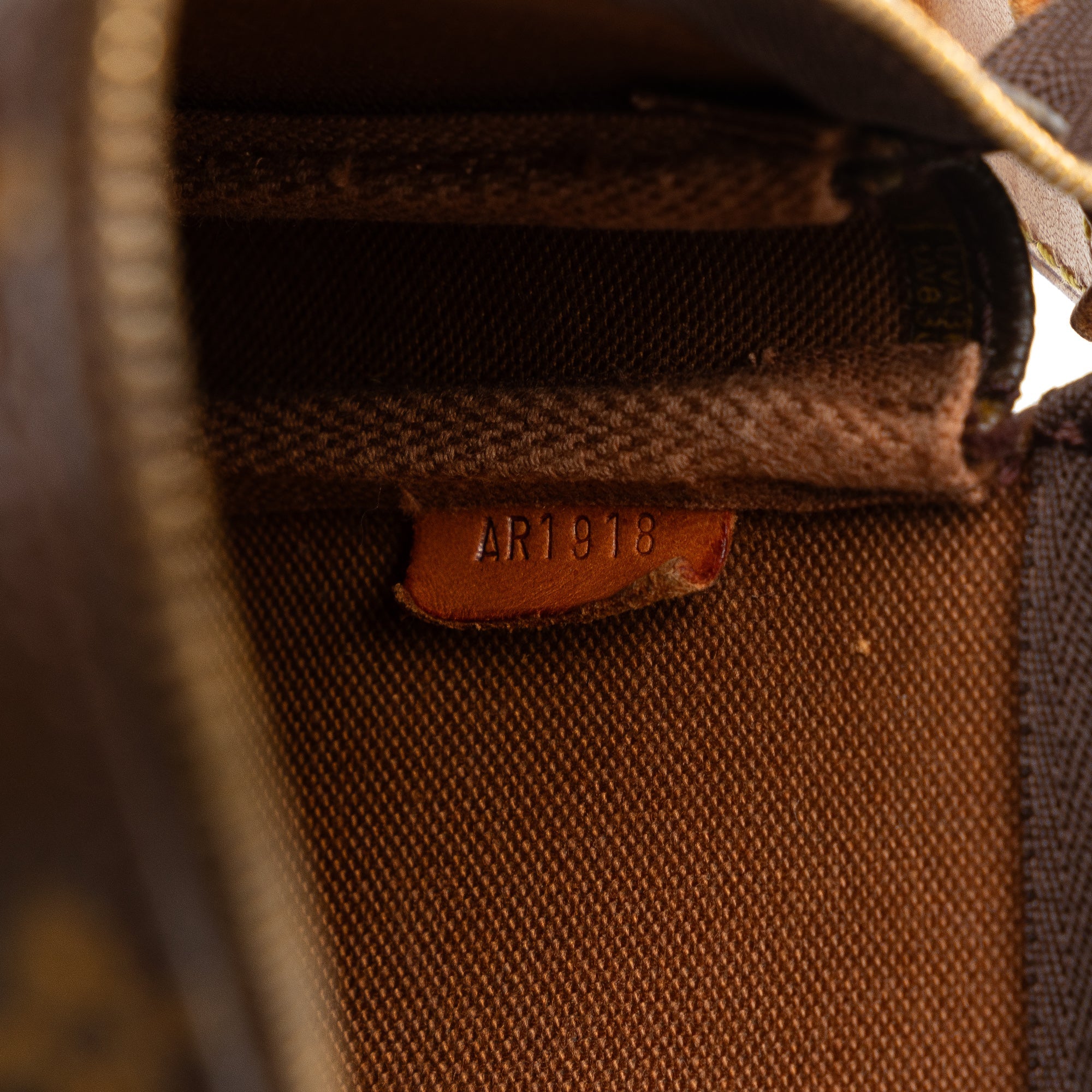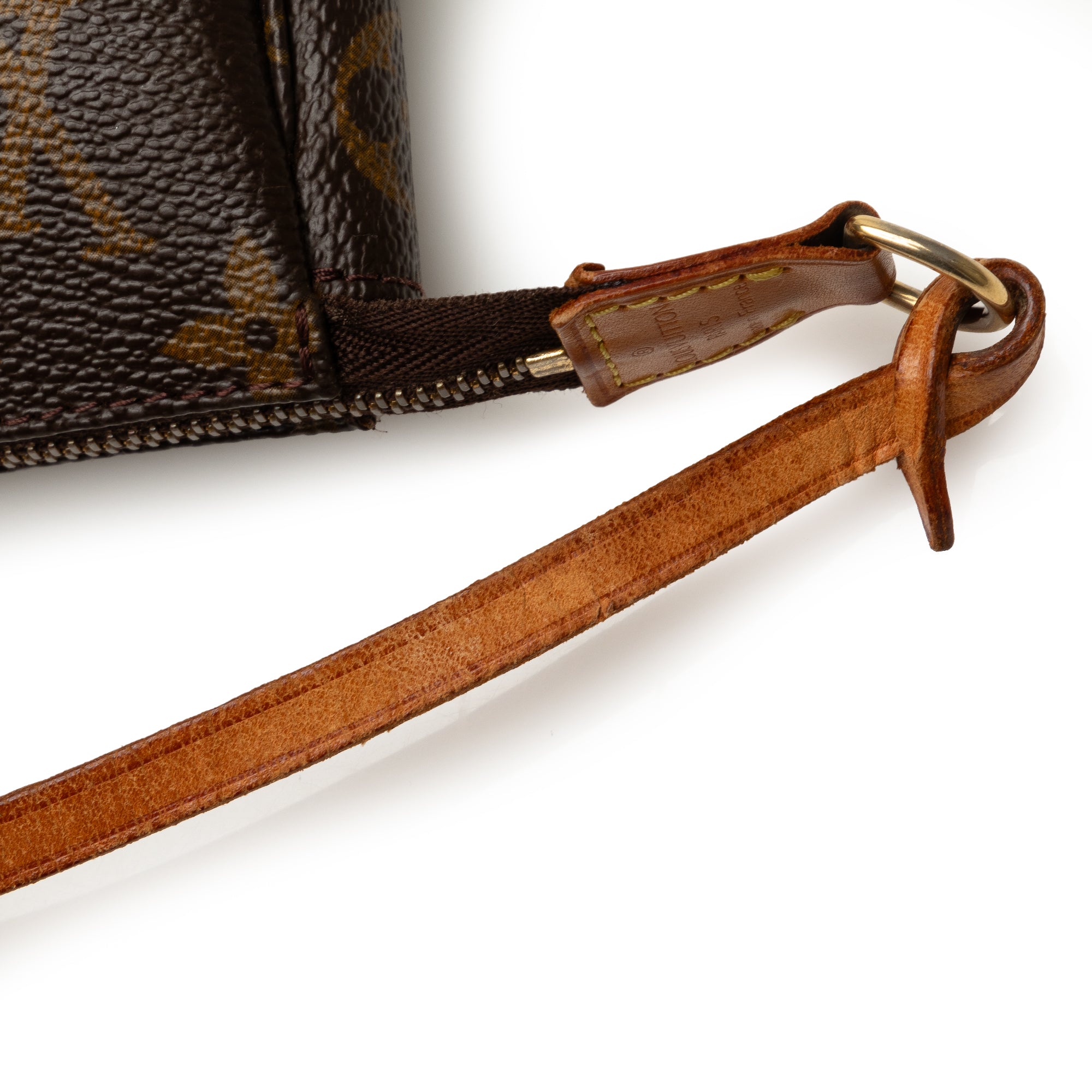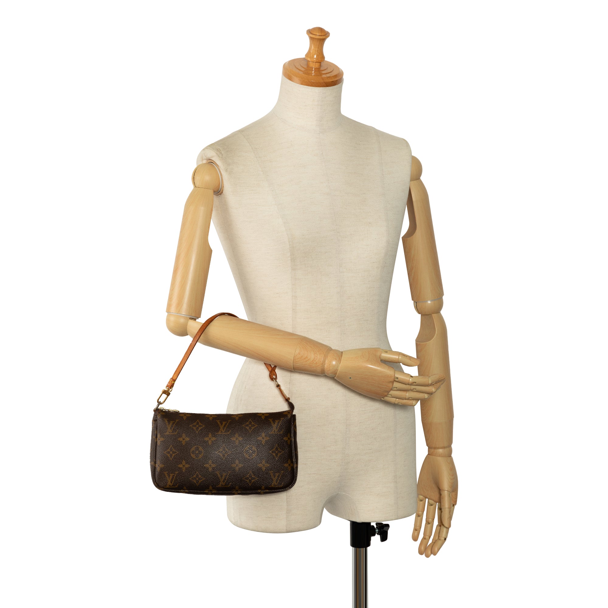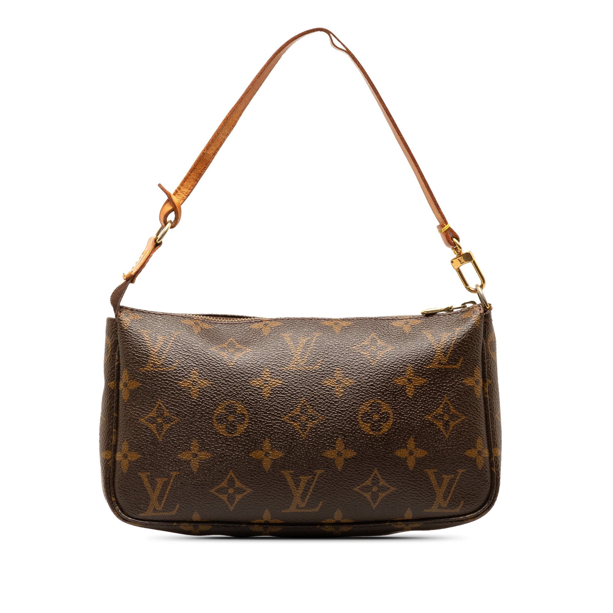 Product Details: Brown LV Monogram Pochette Accessoires Shoulder Bag. The Pochette Accessoires features a monogram canvas body, a flat vachetta leather handle, and a top zip closure. 5.1″ L x 8.3″ W x 1.2″ D, 5.7″ drop. Serial number AR1918.
