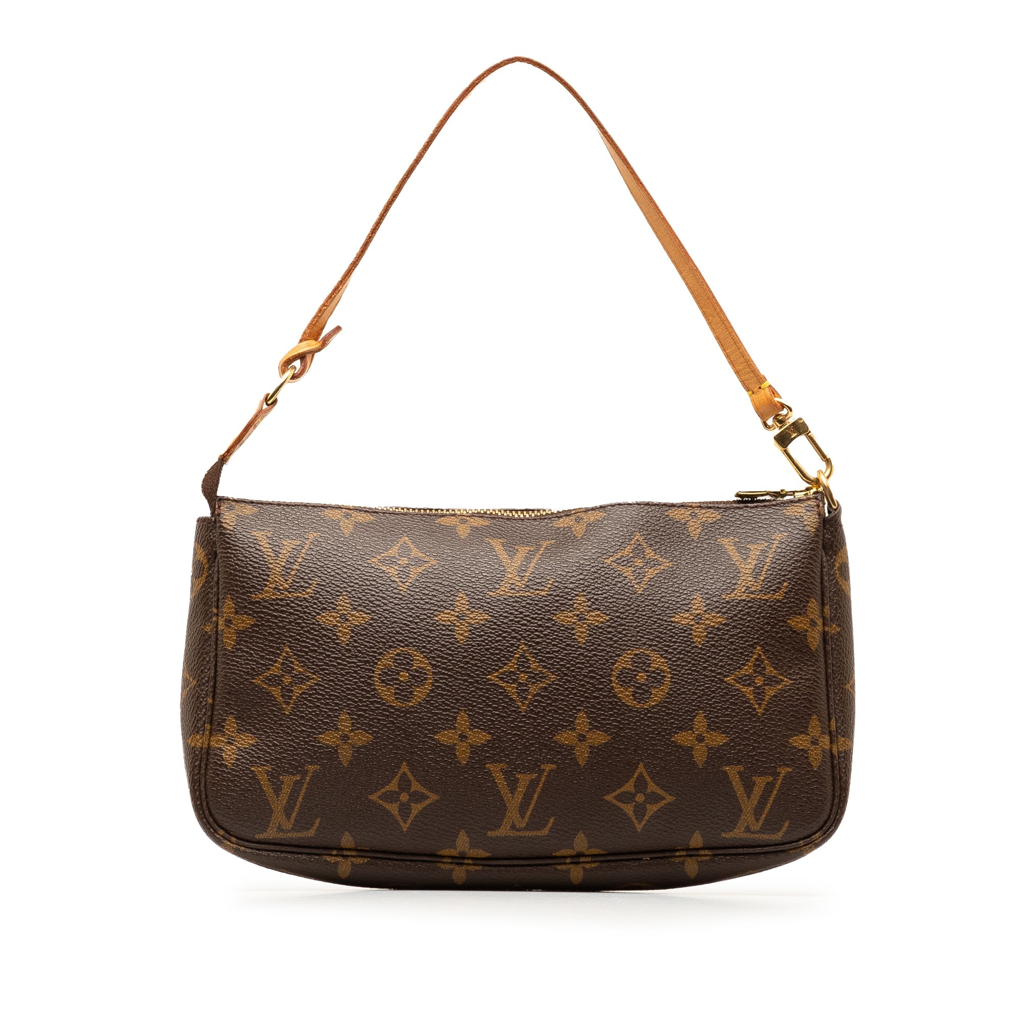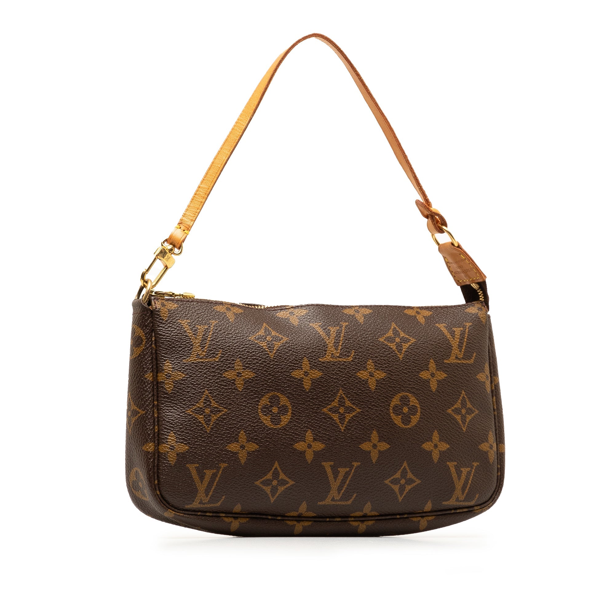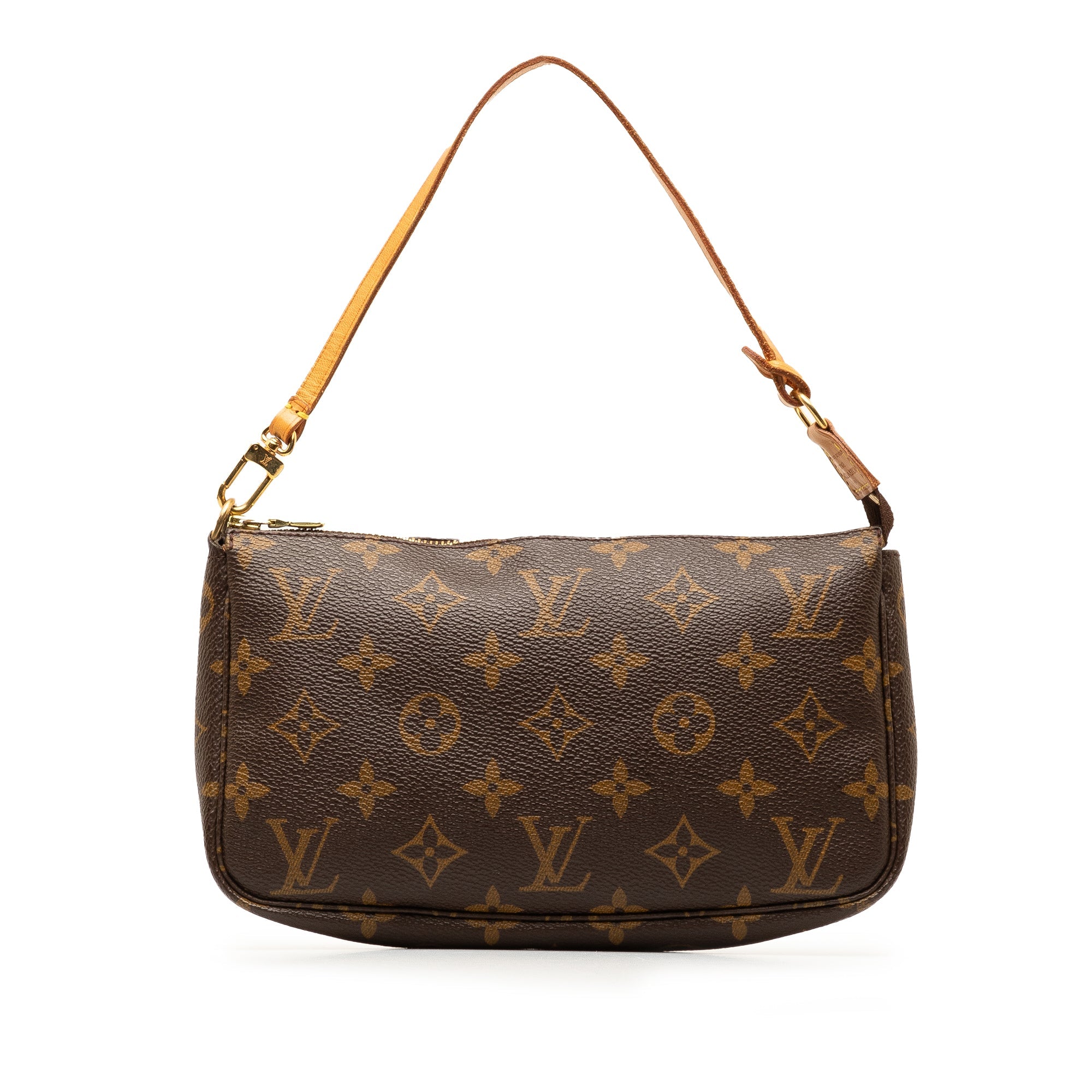 Product Details: Brown LV Monogram Pochette Accessoires Shoulder Bag. The Pochette Accessoires features a monogram canvas body, a flat vachetta leather handle, and a top zip closure. 5.1″ L x 8.3″ W x 1.2″ D, 5.7″ drop. Serial number AR1000.
