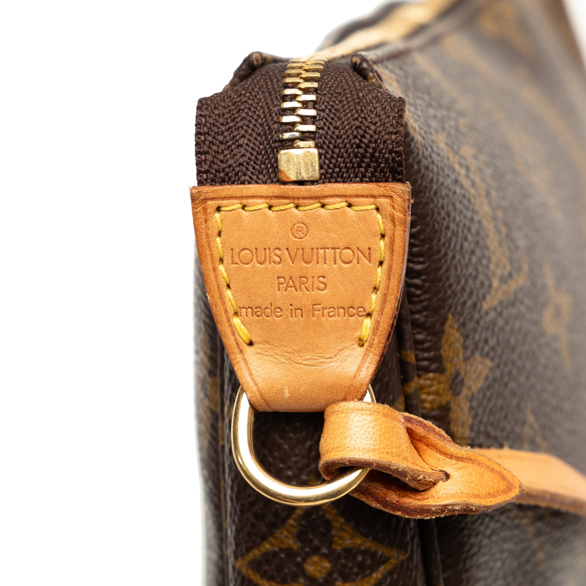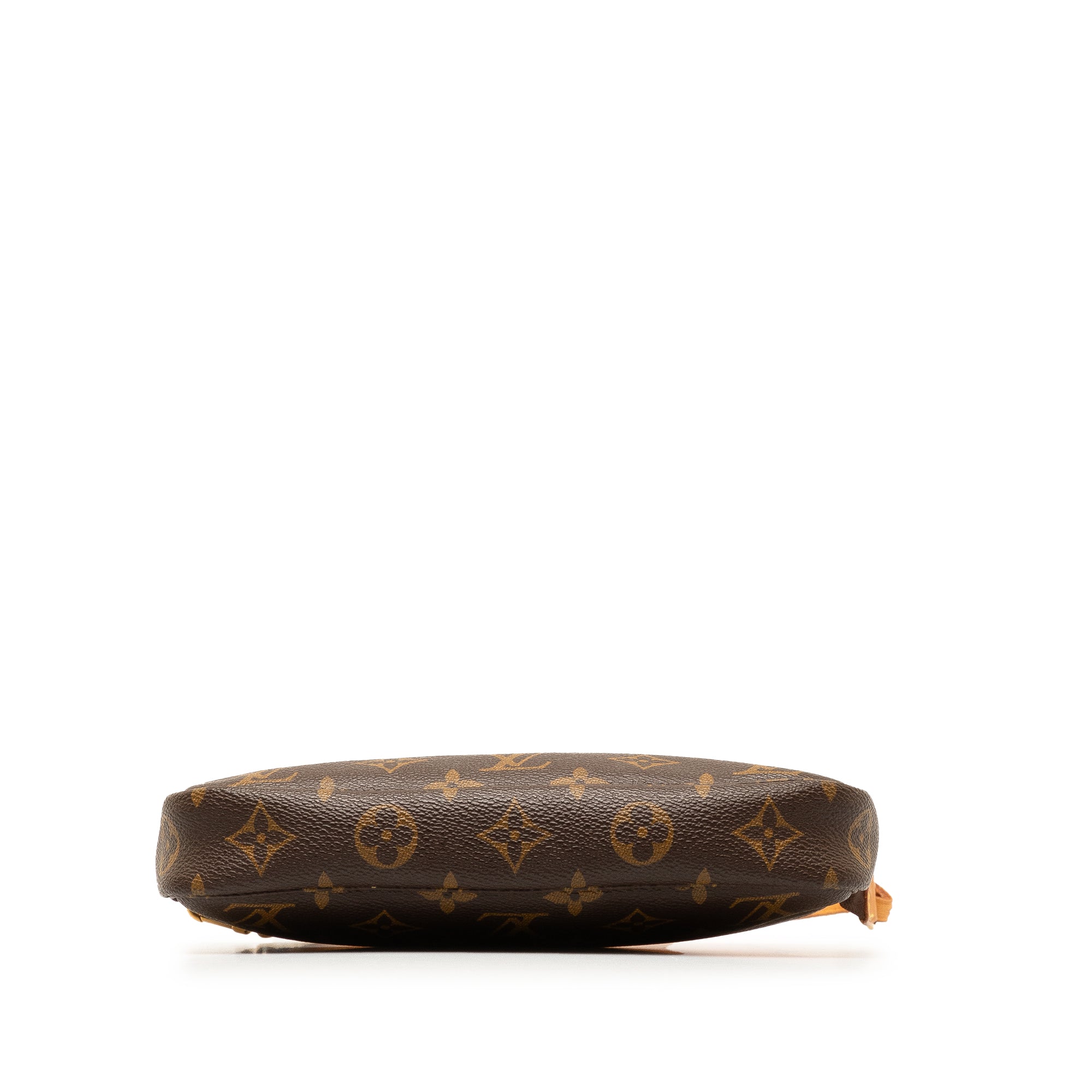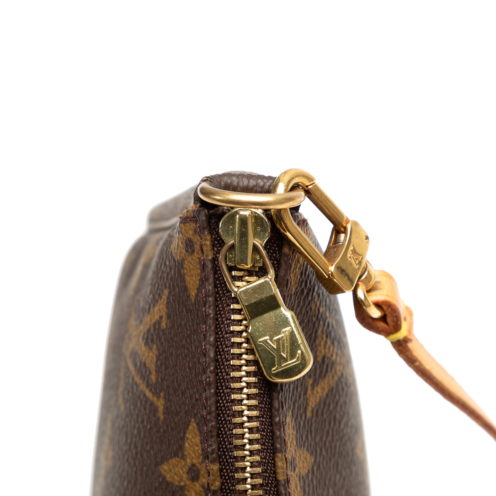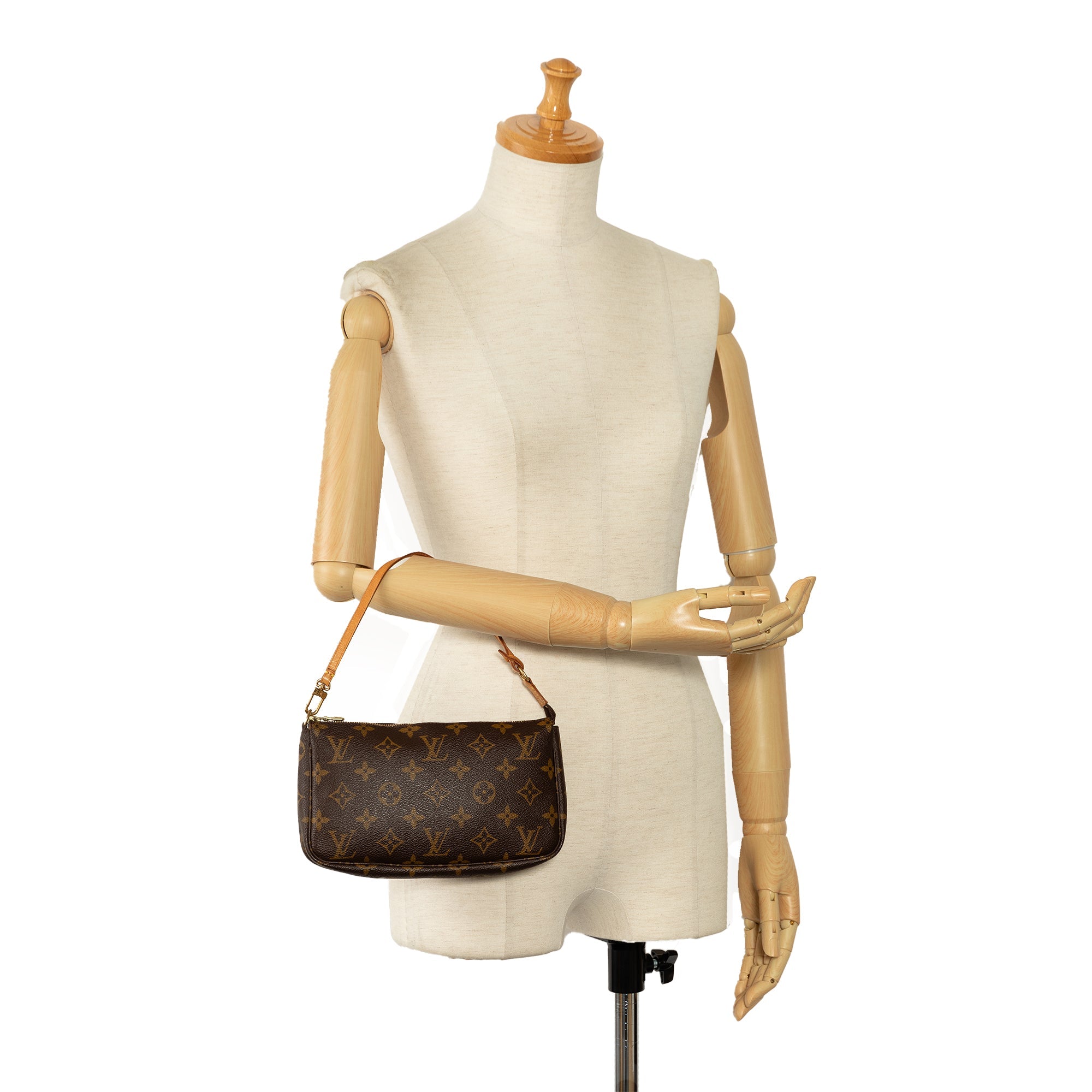Product Details: Brown LV Monogram Pochette Accessoires Shoulder Bag. The Pochette Accessoires features a monogram canvas body, a flat vachetta leather handle, and a top zip closure. 5.1″ L x 8.3″ W x 1.2″ D, 5.7″ drop. Serial number AR1000.