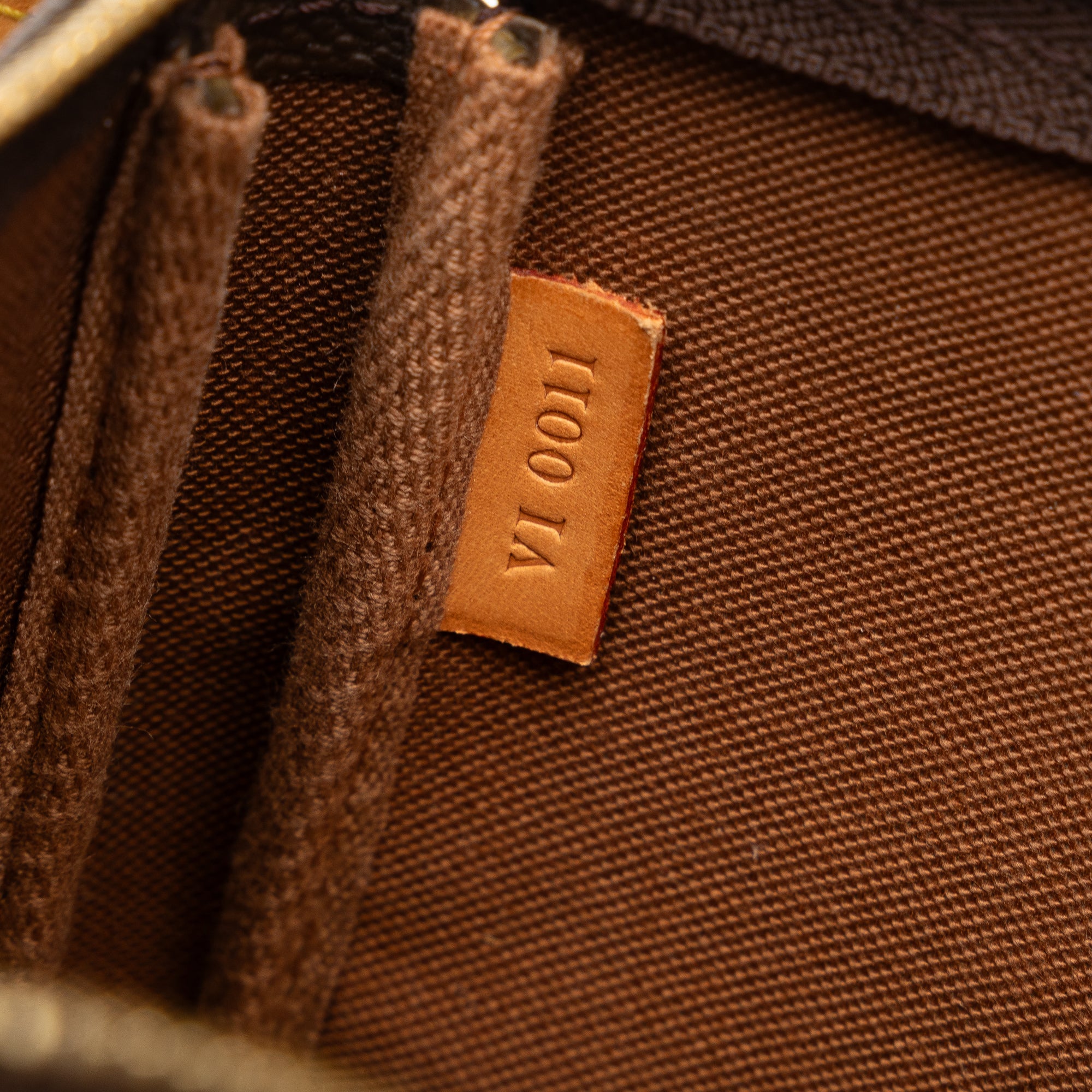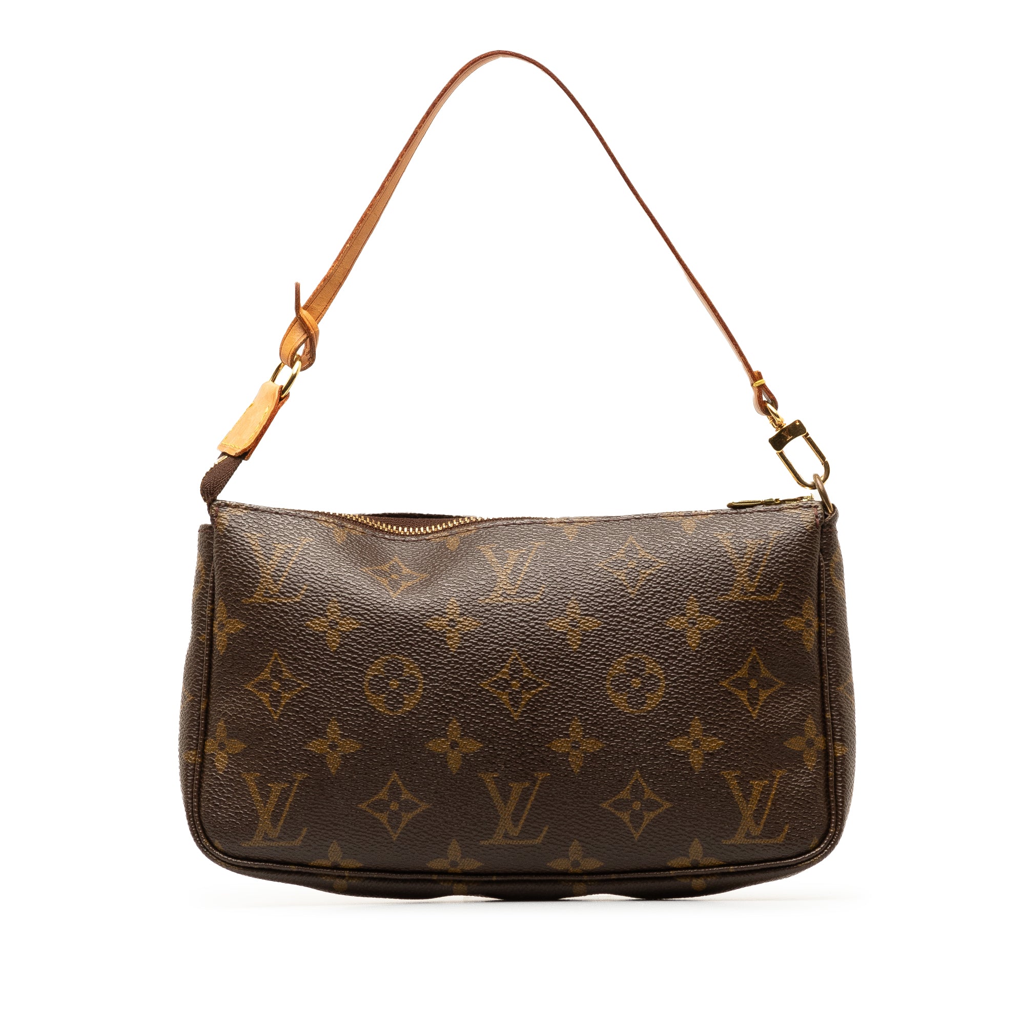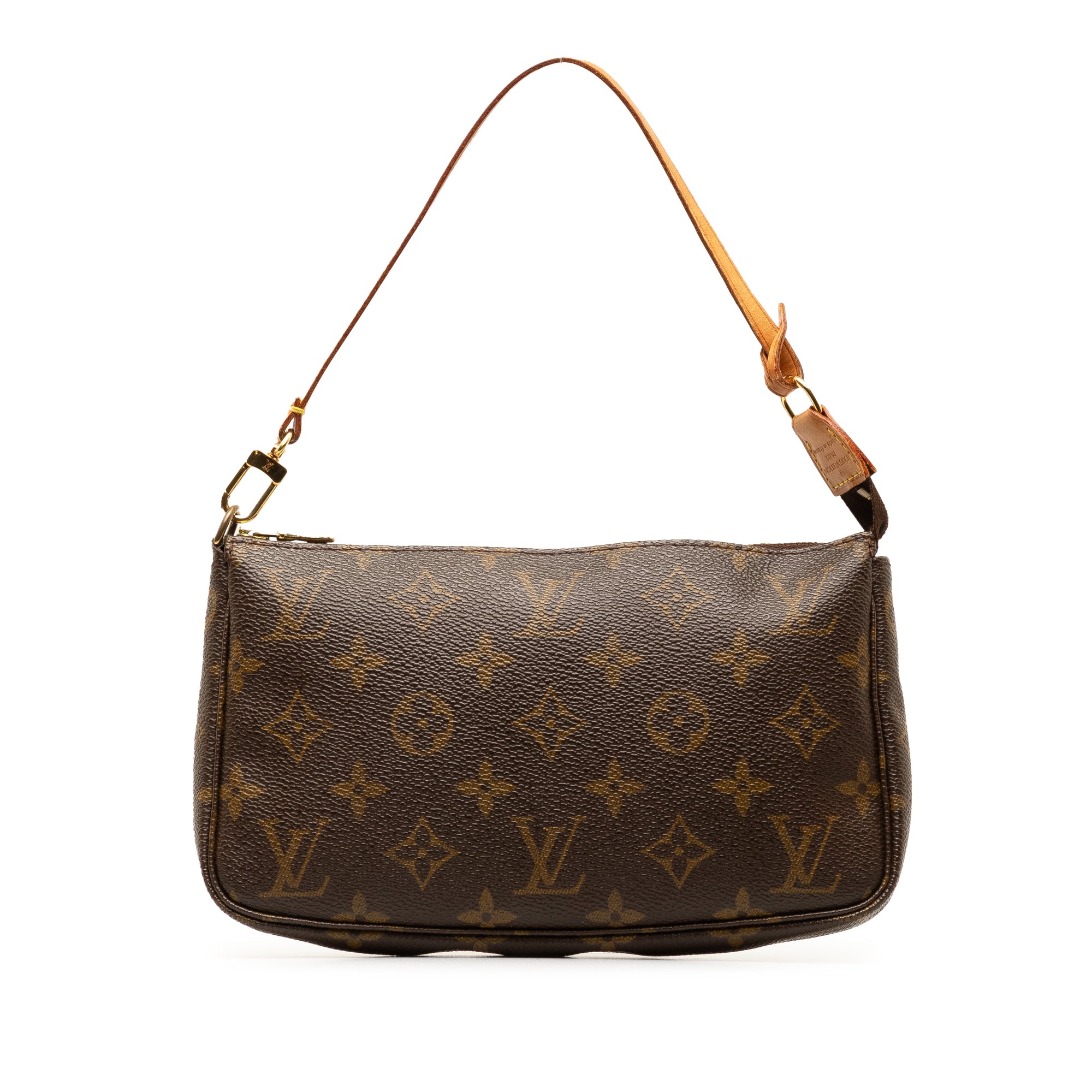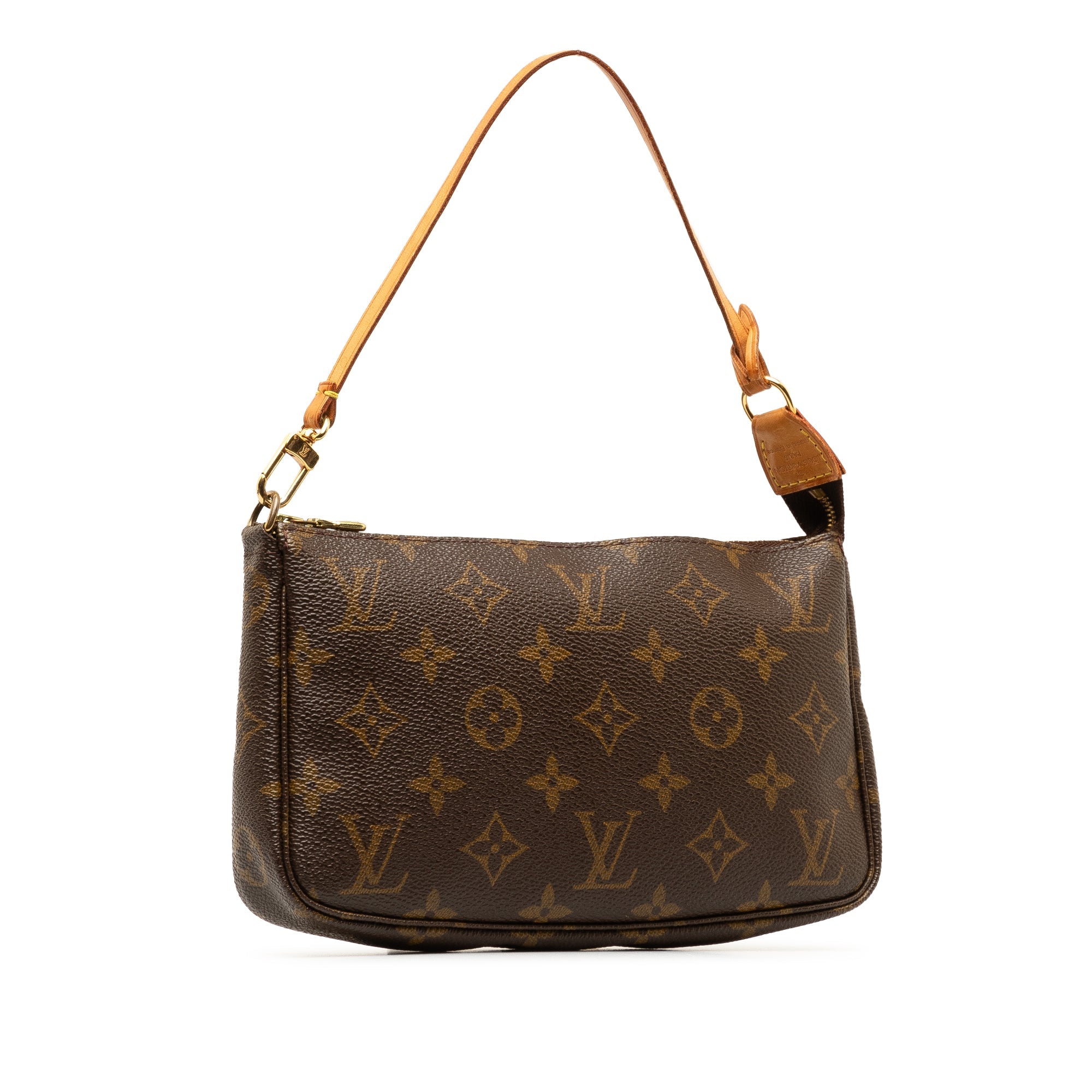 Product Details: Brown LV Monogram Pochette Accessoires Shoulder Bag. The Pochette Accessoires features a monogram canvas body, a flat vachetta leather strap, and a top zip closure. 5.1″ L x 8.3″ W x 1.2″ D, 5.7″ drop. Serial number VI0011.