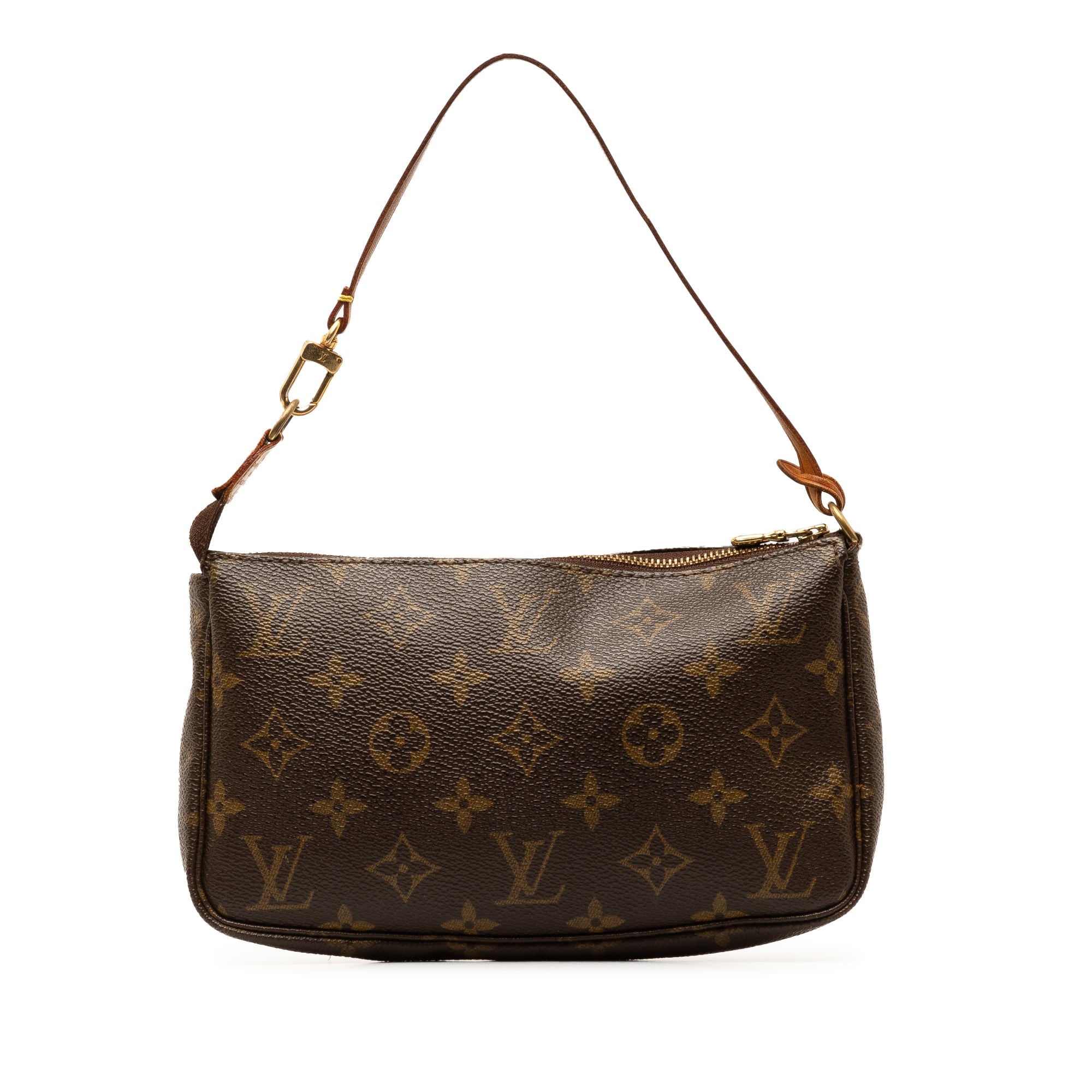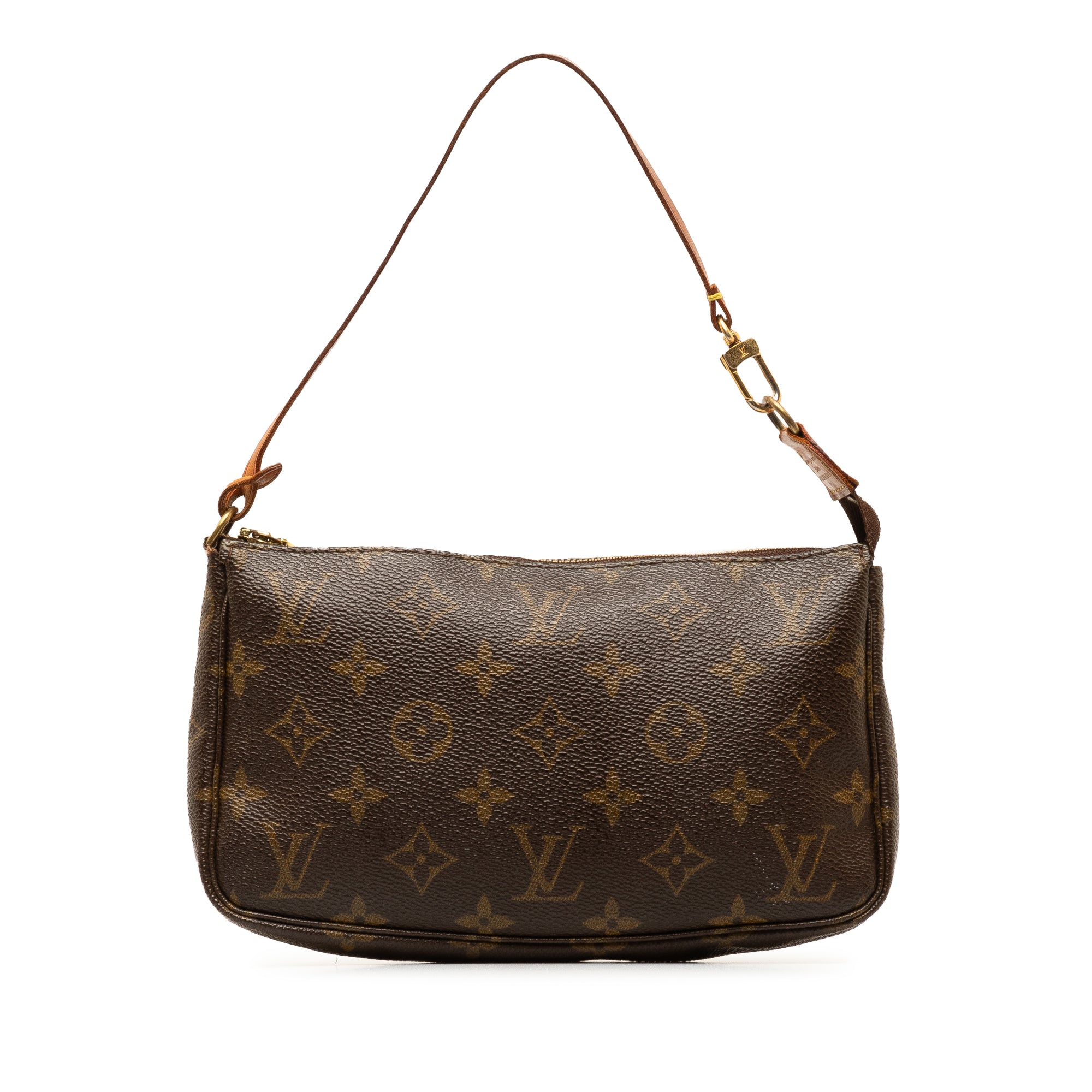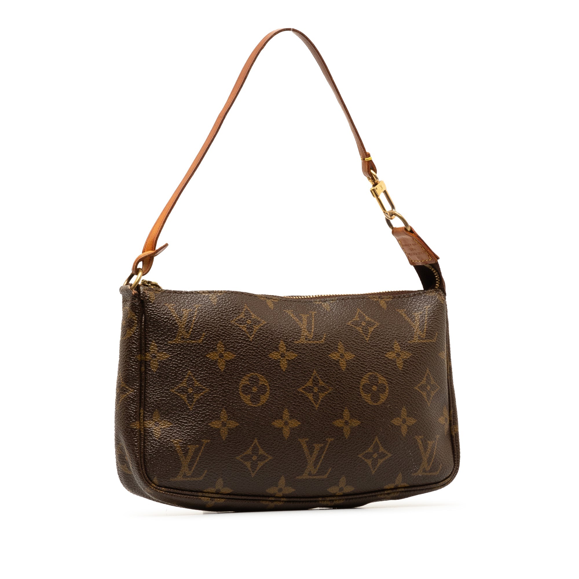 Product Details: Brown LV Monogram Pochette Accessoires Shoulder Bag. The Pochette Accessoires features a monogram canvas body, a flat vachetta leather handle, and a top zip closure. 5.1″ L x 8.3″ W x 1.2″ D, 5.7″ drop. Serial number VI0091.