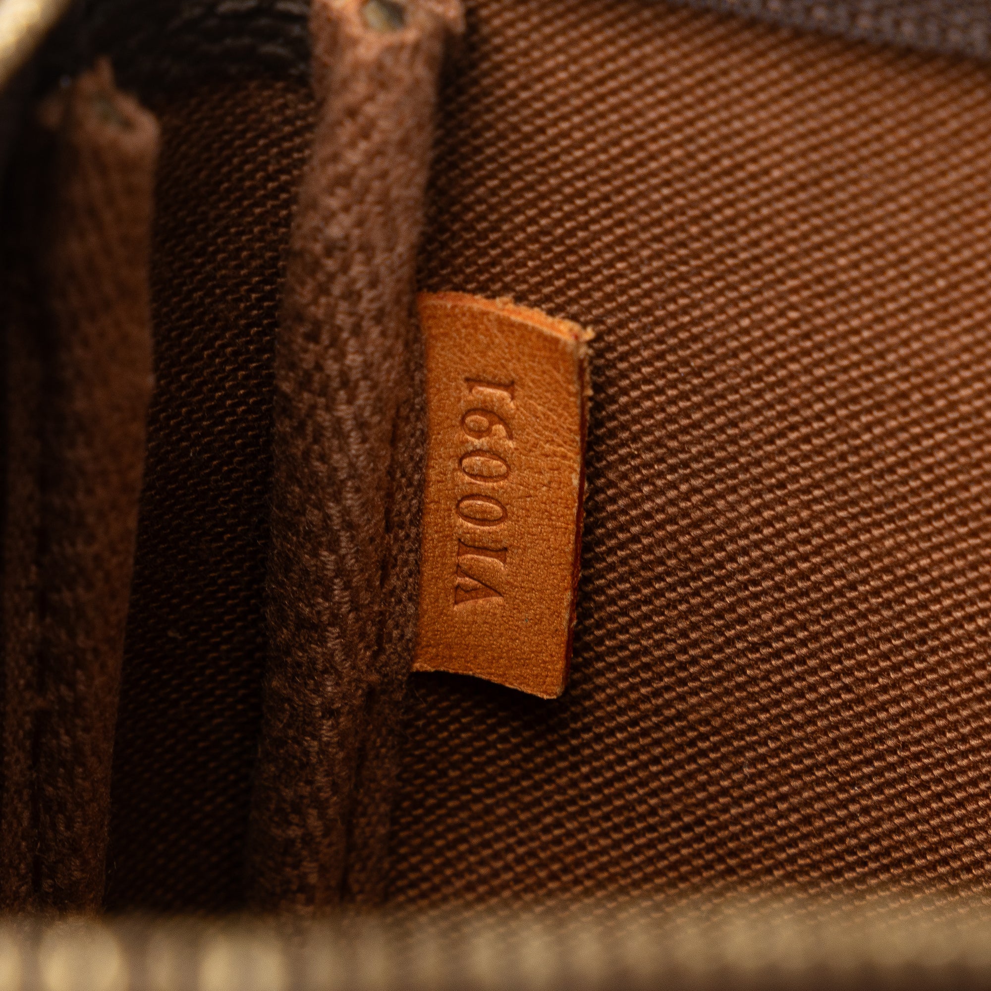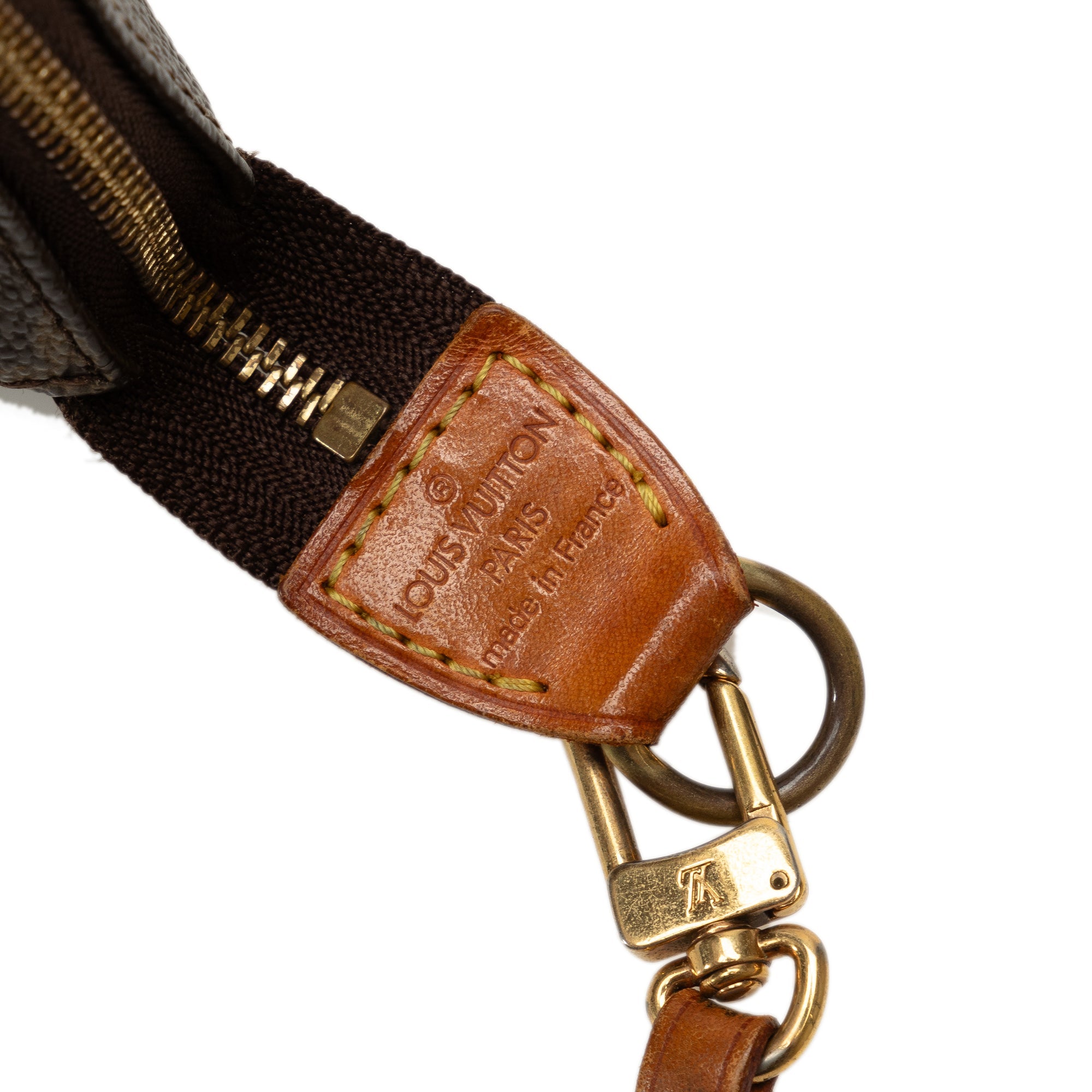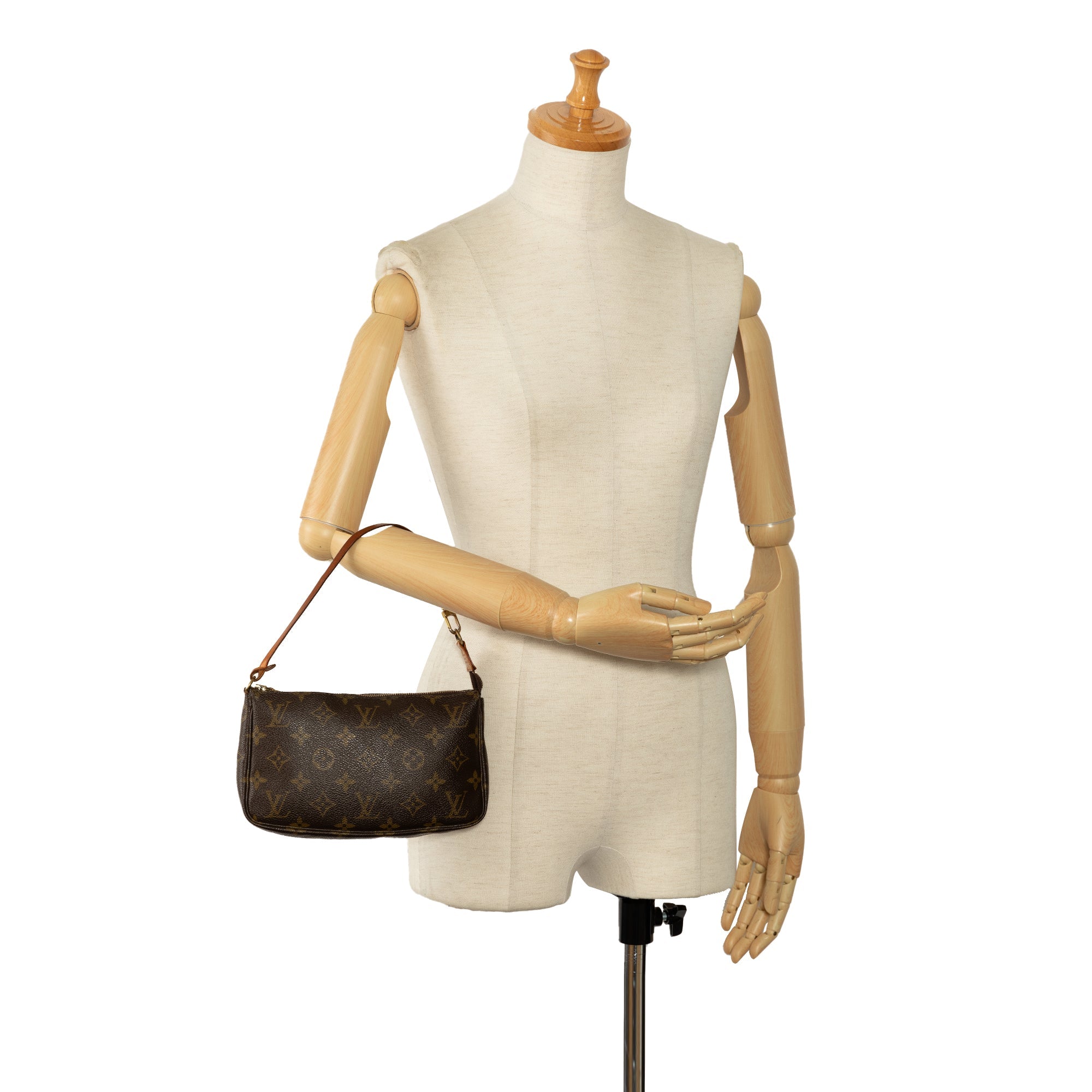 Product Details: Brown LV Monogram Pochette Accessoires Shoulder Bag. The Pochette Accessoires features a monogram canvas body, a flat vachetta leather handle, and a top zip closure. 5.1″ L x 8.3″ W x 1.2″ D, 5.7″ drop. Serial number VI0091.