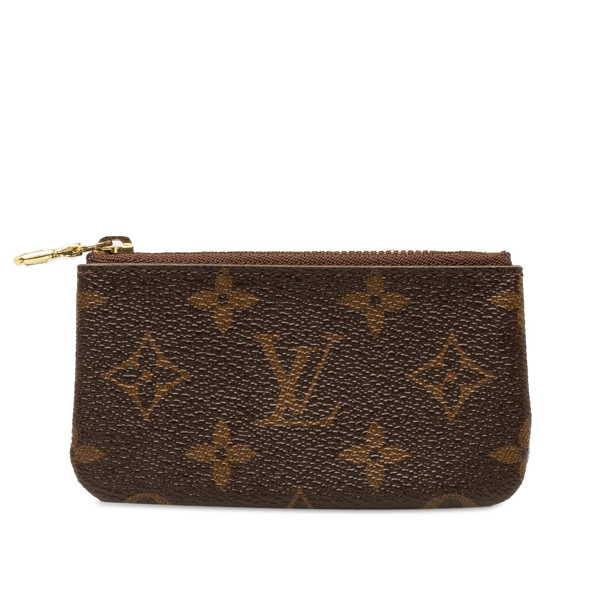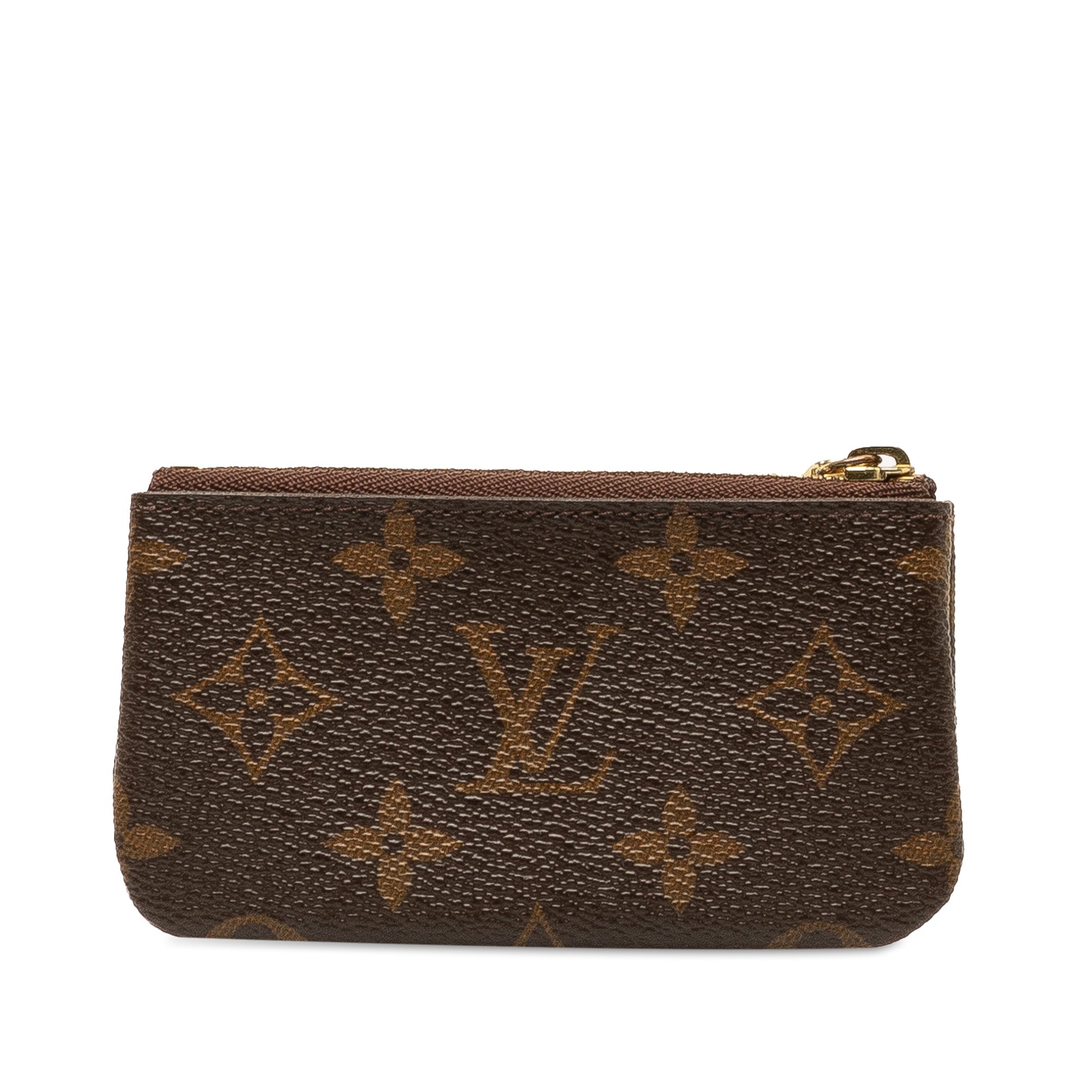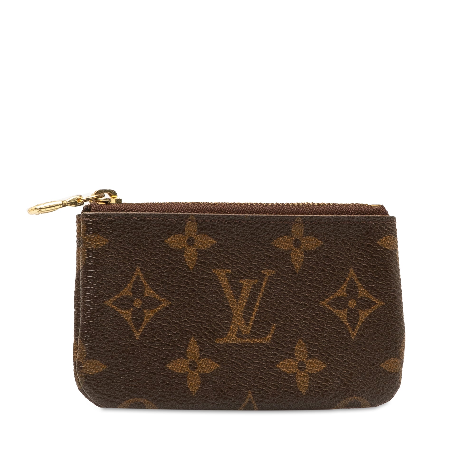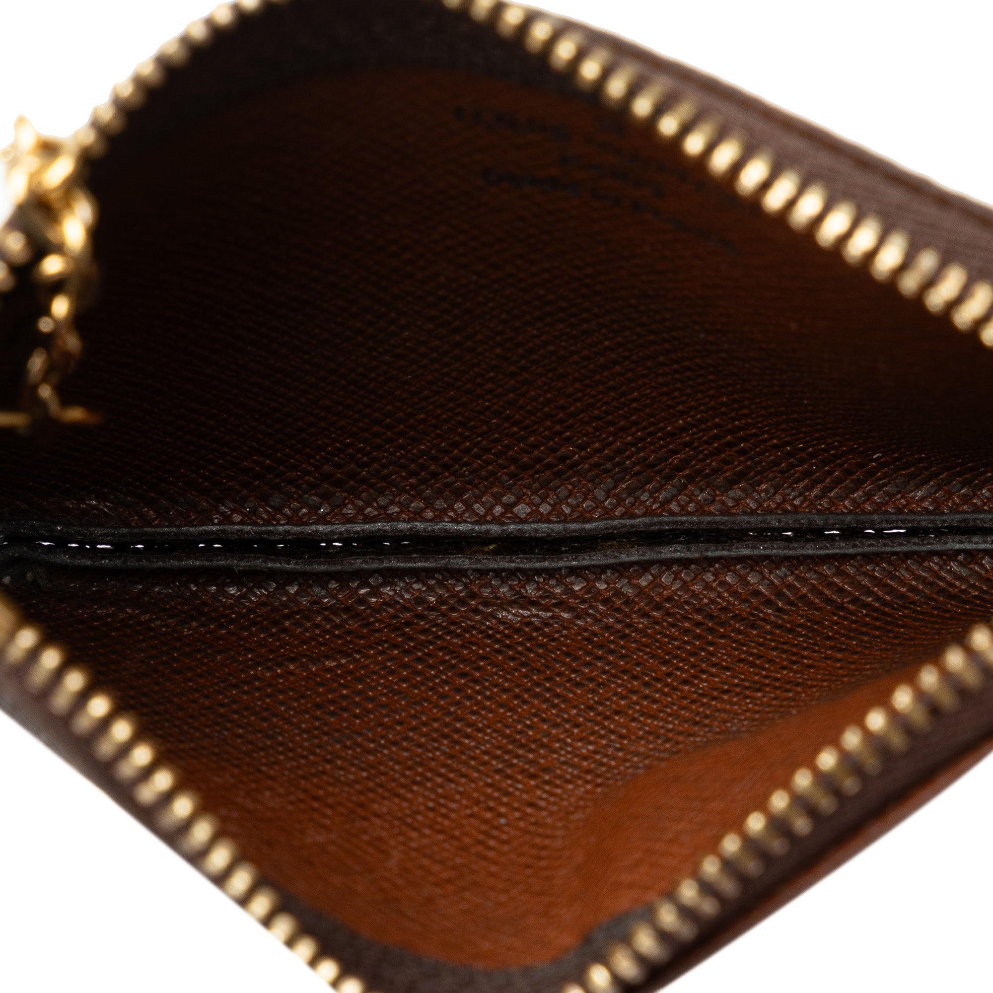 Product Details: Brown LV Monogram Pochette Cles Coin Pouch. The Pochette Cles coin pouch features a monogram canvas body and a top zip closure. 2.6″ L x 4.5″ W x 0.4″ D. Serial number CT3172.