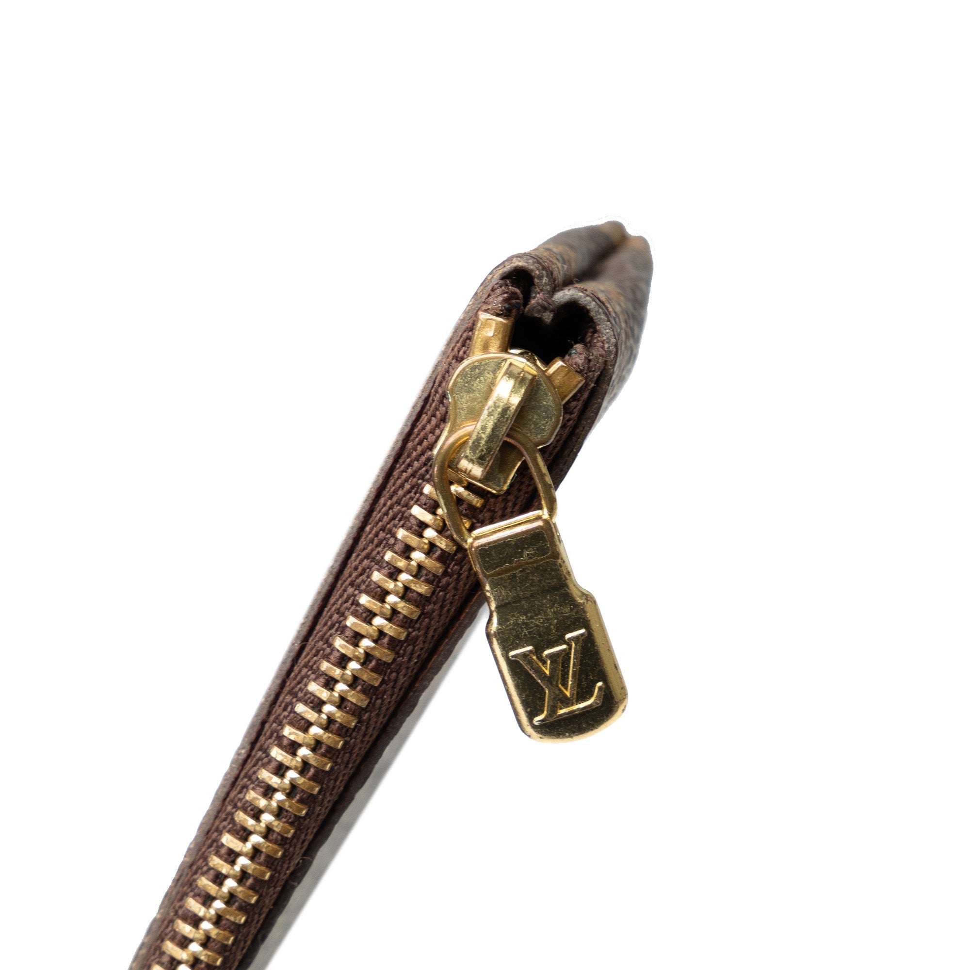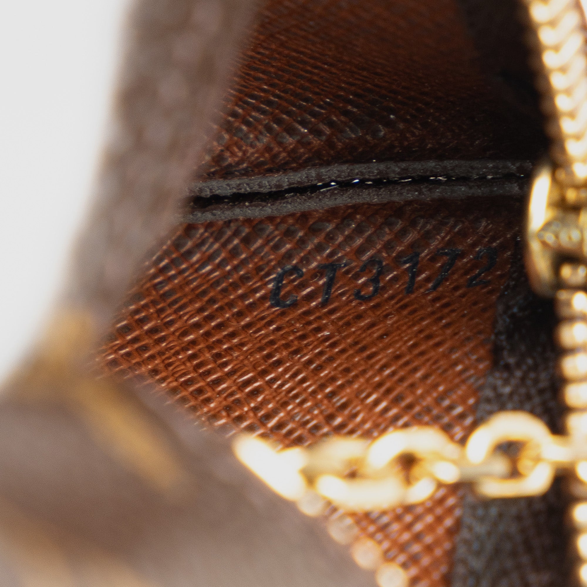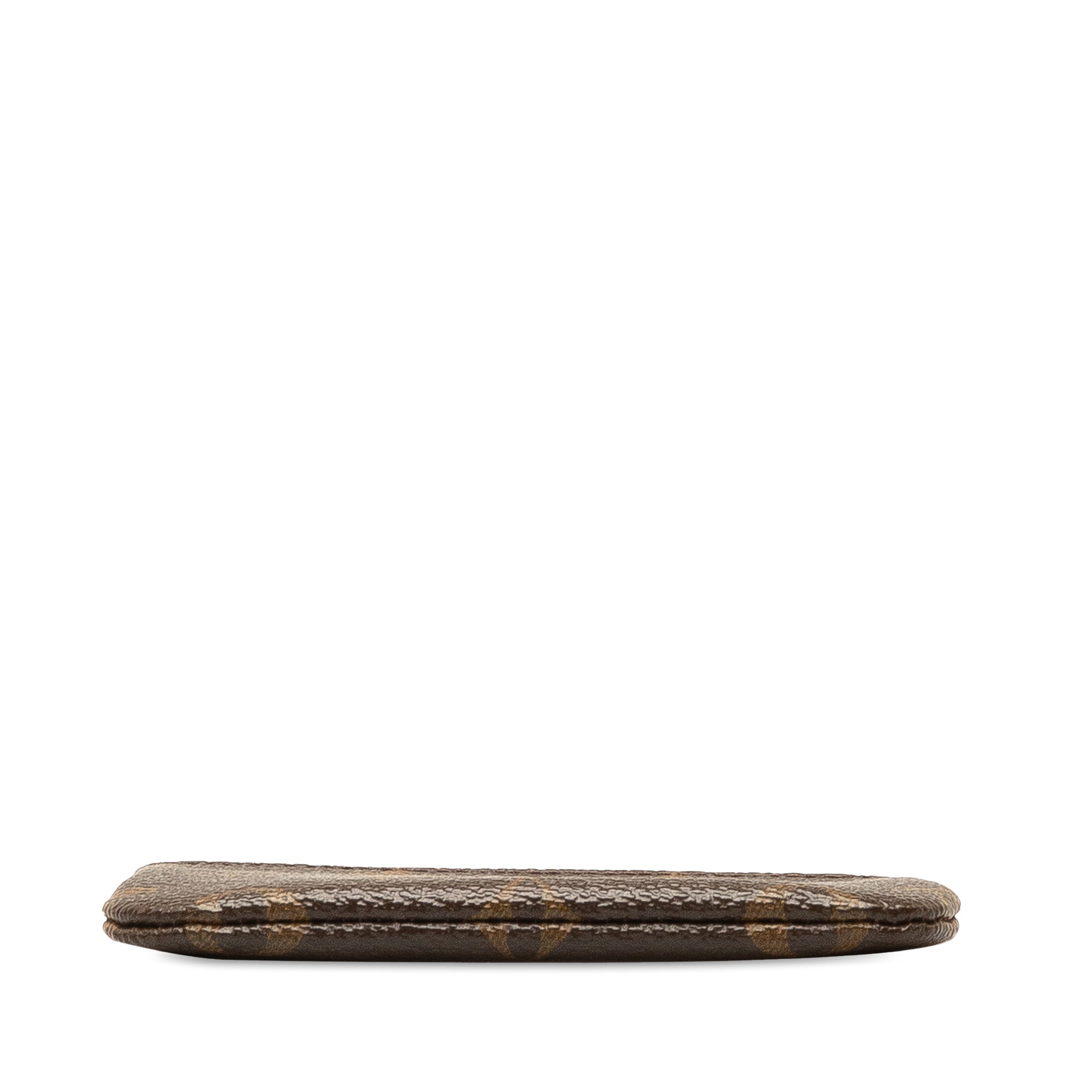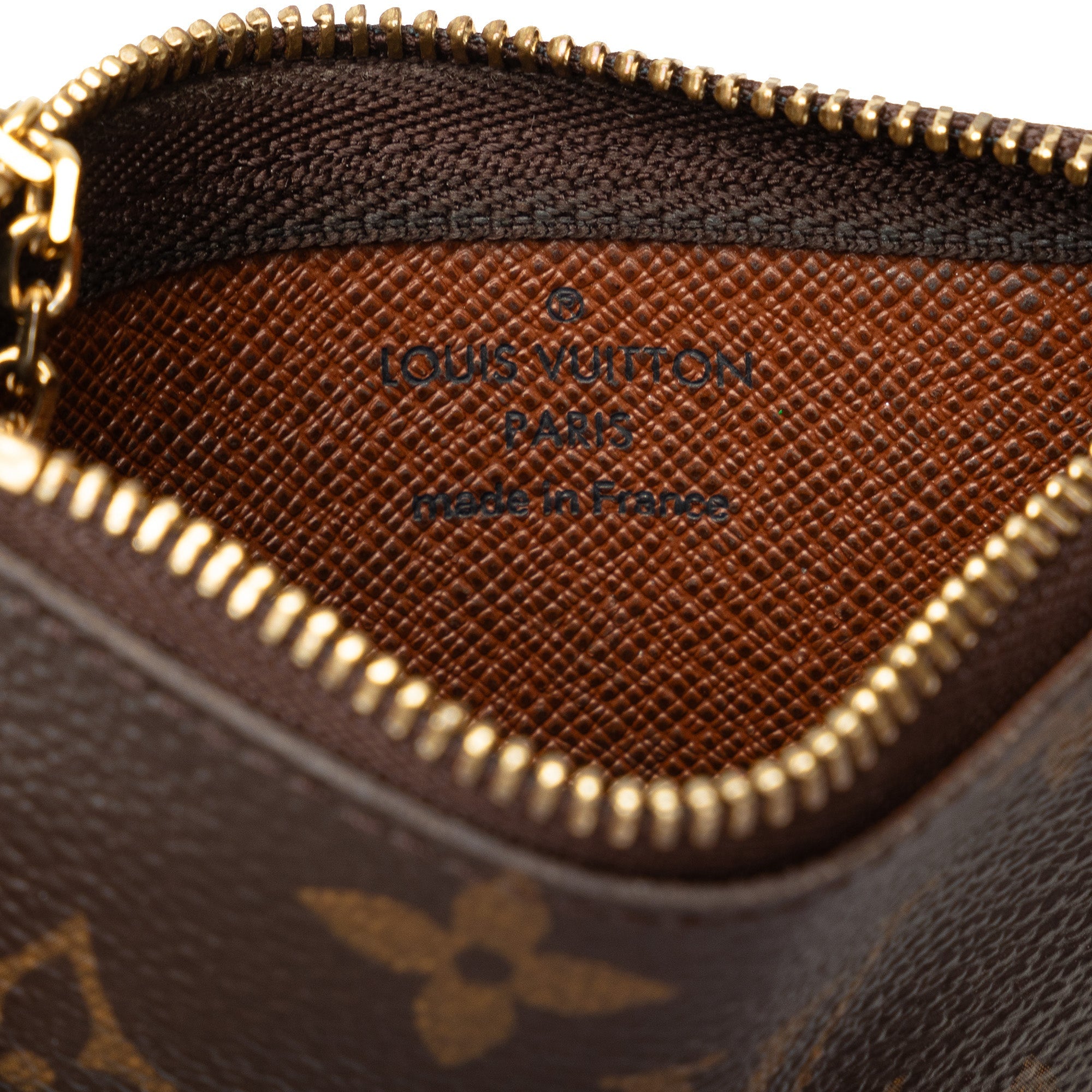 Product Details: Brown LV Monogram Pochette Cles Coin Pouch. The Pochette Cles coin pouch features a monogram canvas body and a top zip closure. 2.6″ L x 4.5″ W x 0.4″ D. Serial number CT3172.