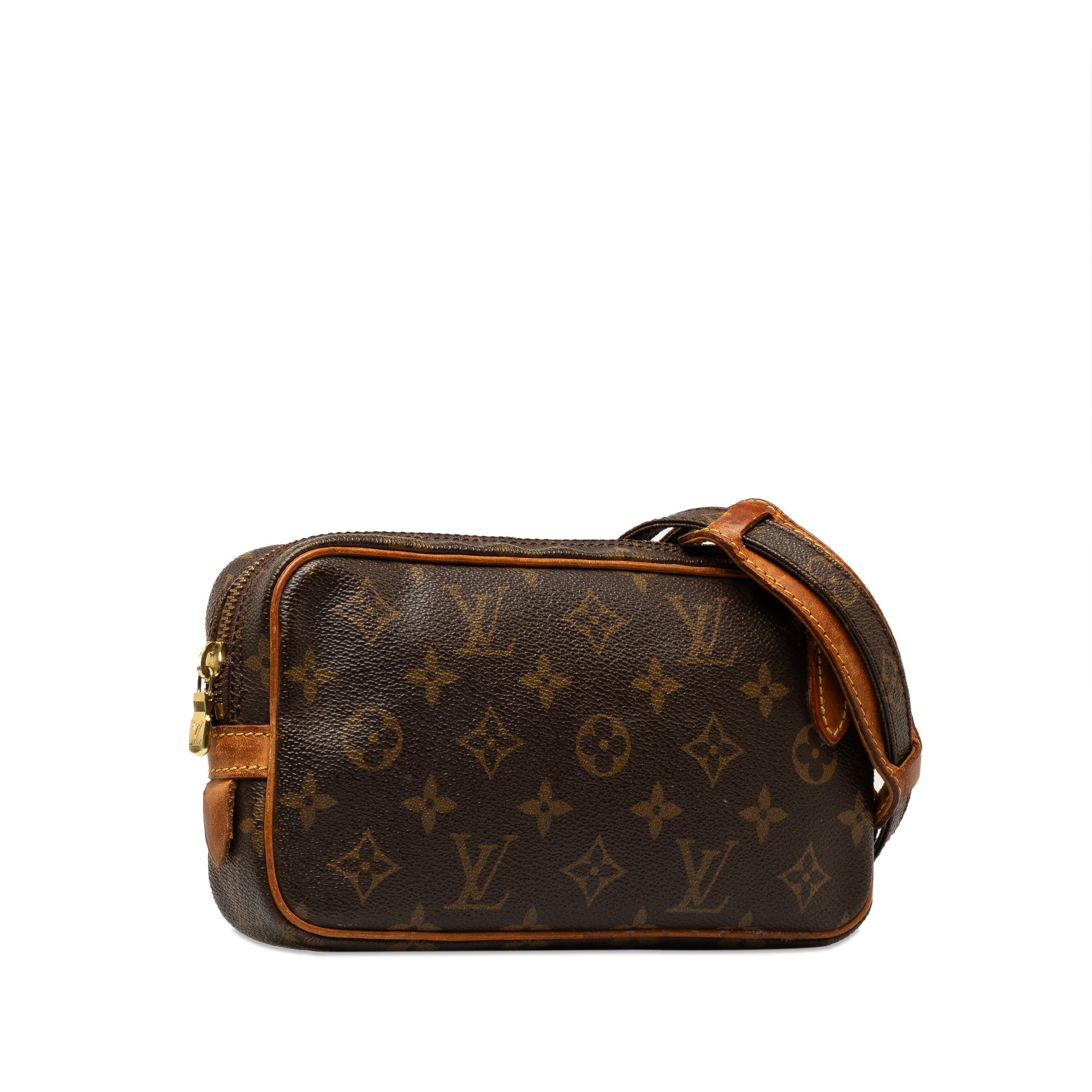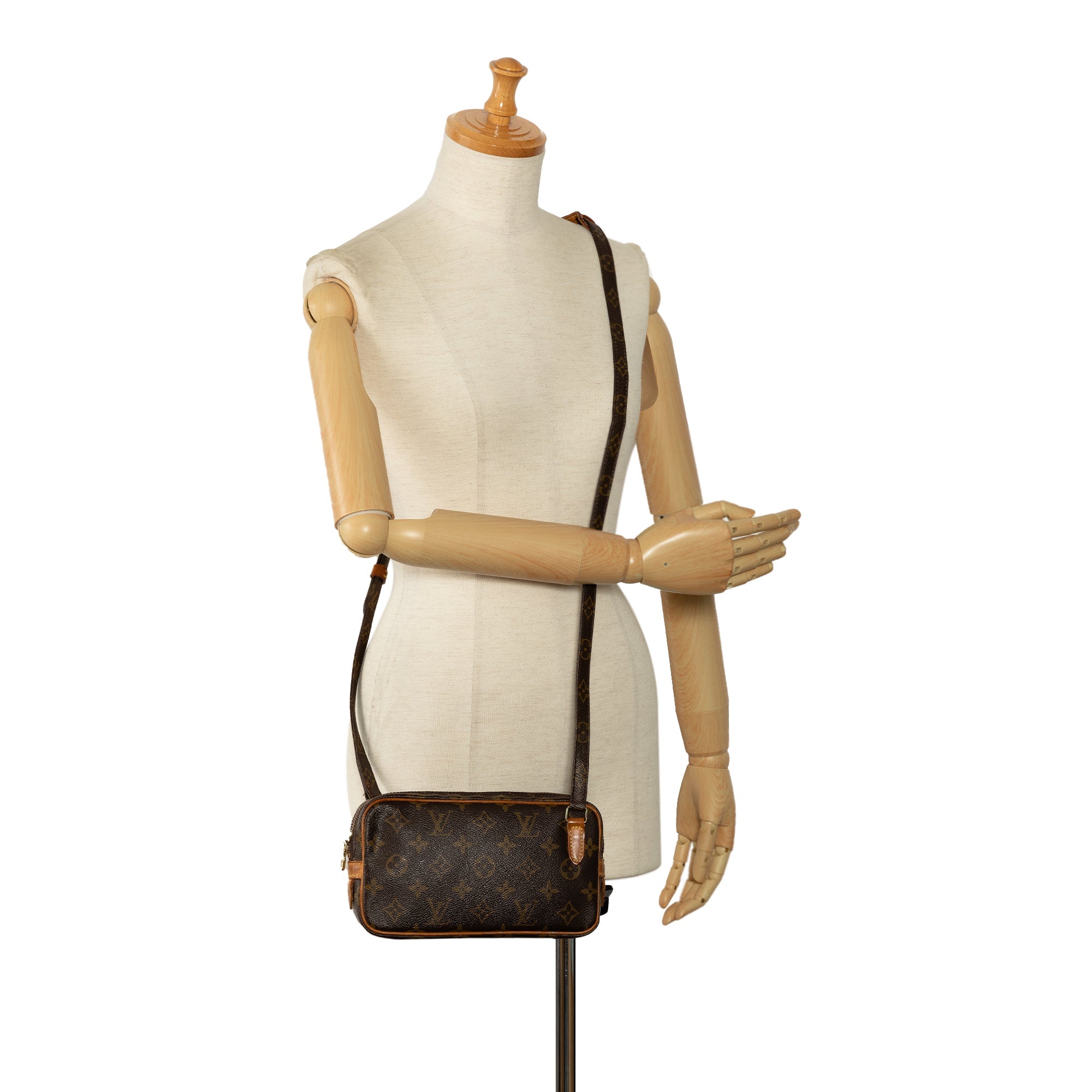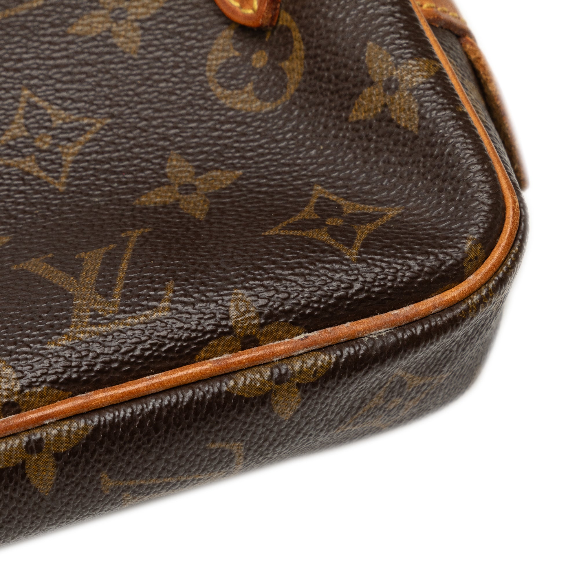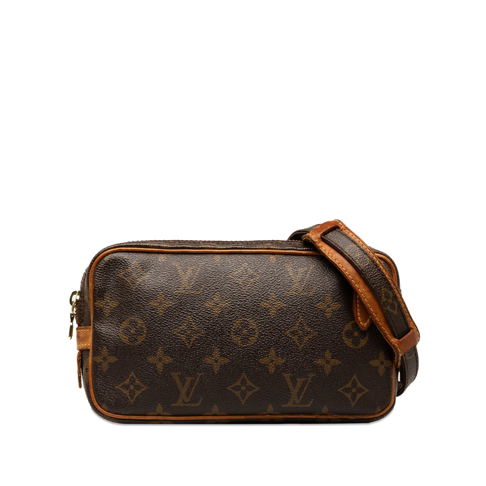 Product Details: Brown LV Monogram Pochette Marly Bandouliere Crossbody Bag. The Marly Bandouliere features a monogram canvas body, an adjustable shoulder strap, and a top zip closure. 4.7″ L x 8.7″ W x 1.6″ D. Serial number 884TH.