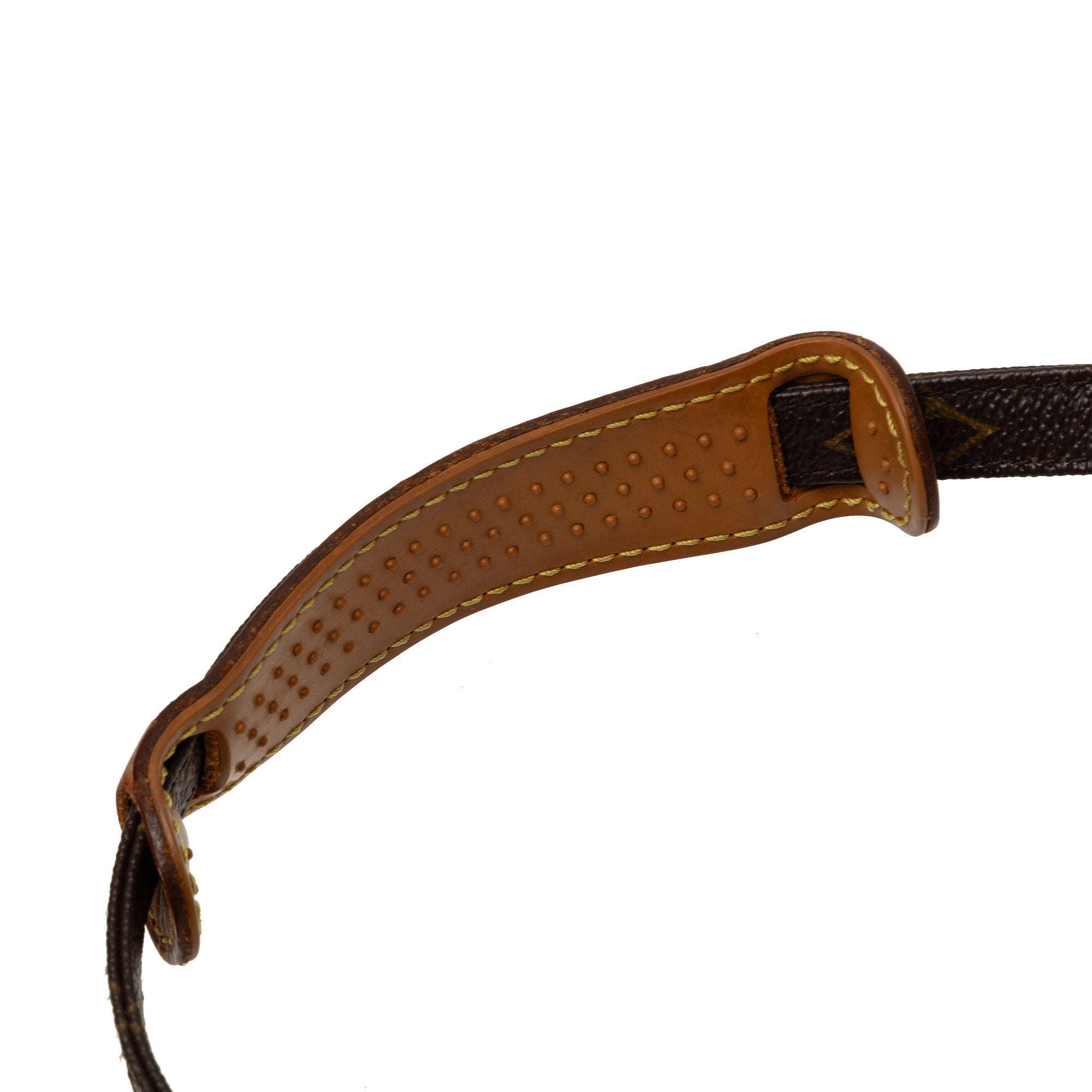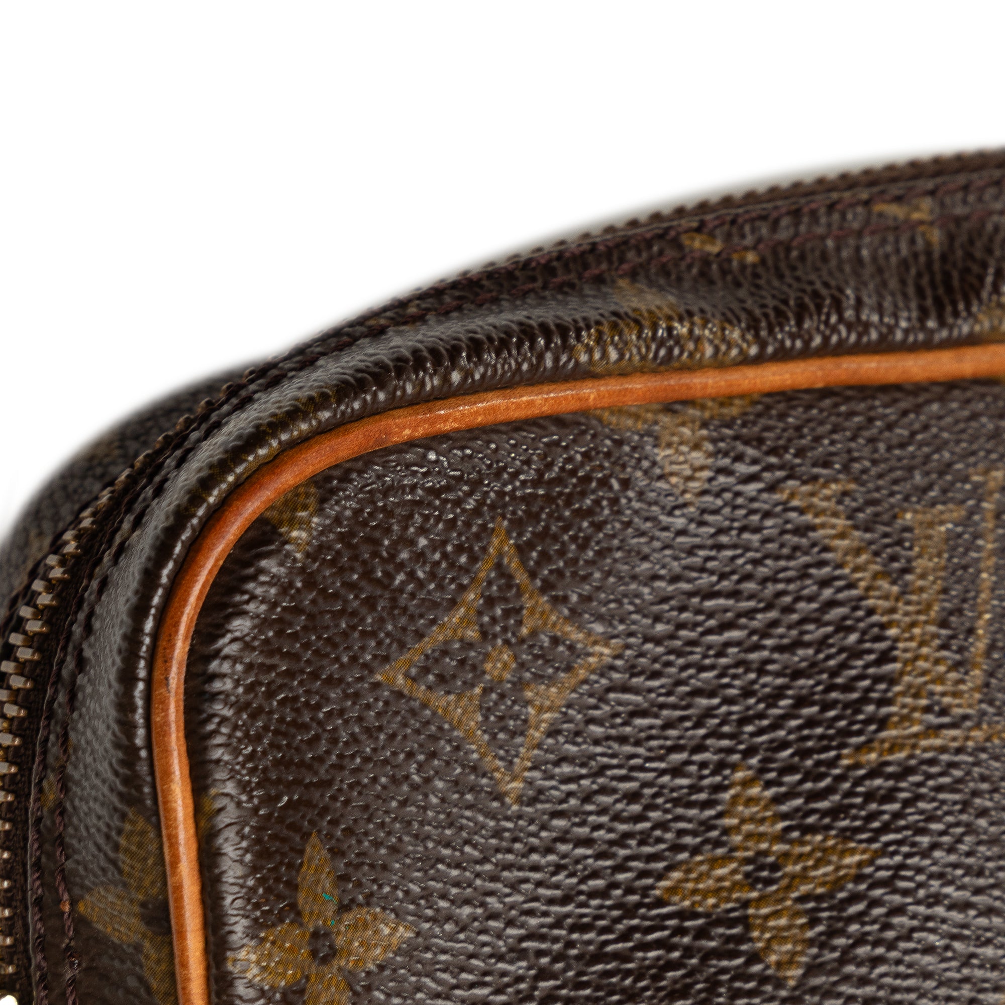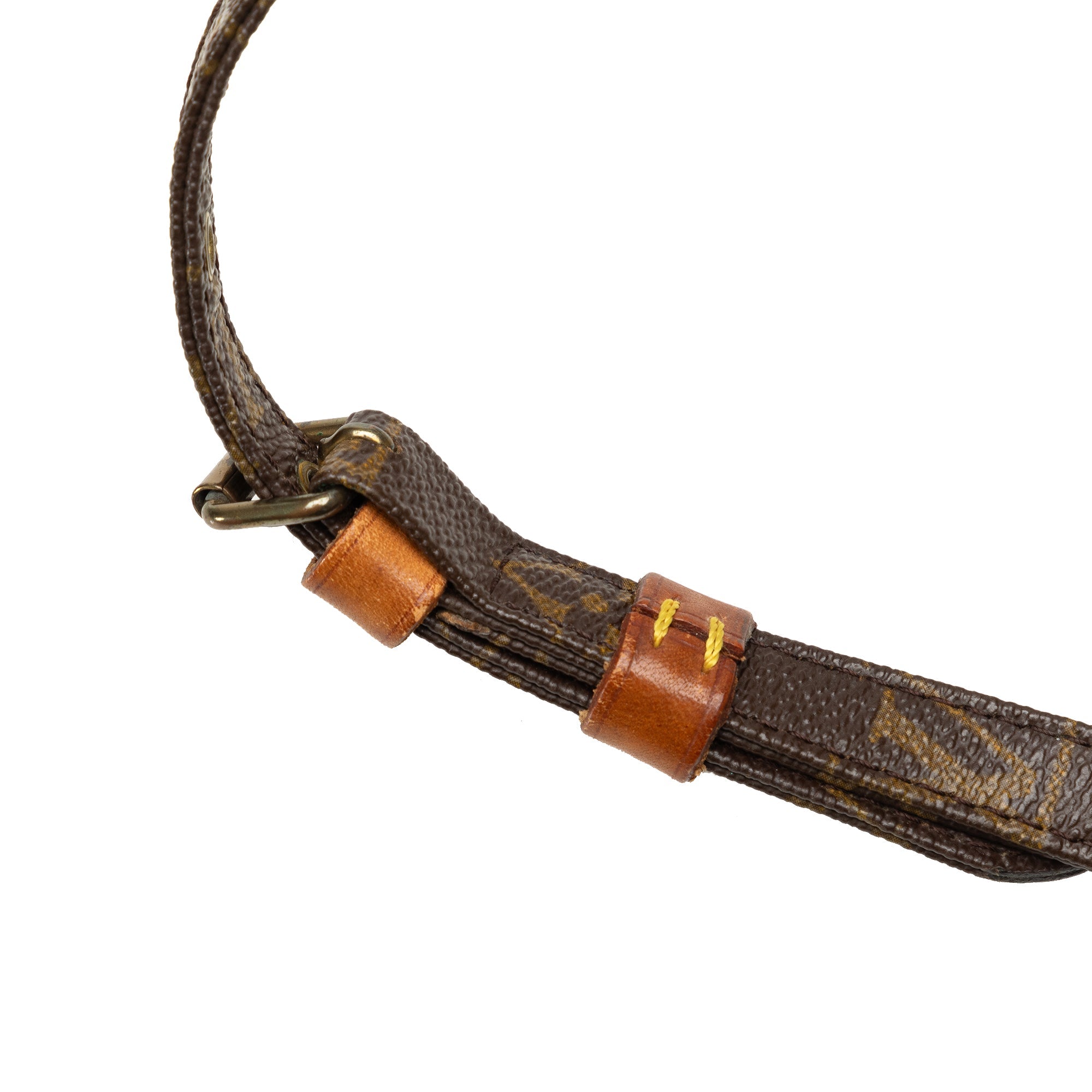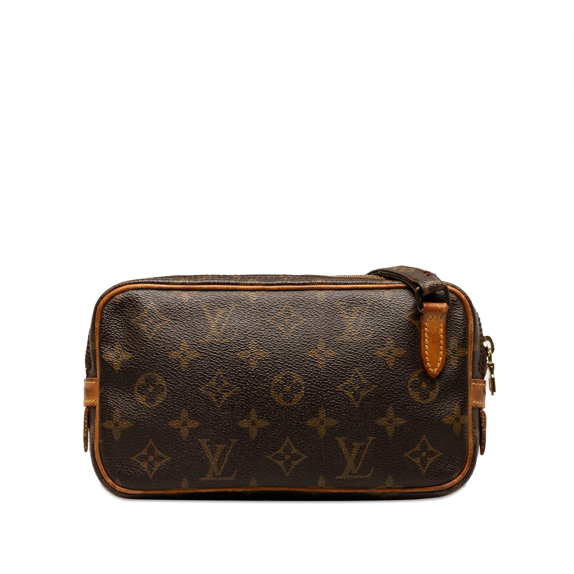 Product Details: Brown LV Monogram Pochette Marly Bandouliere Crossbody Bag. The Marly Bandouliere features a monogram canvas body, an adjustable shoulder strap, and a top zip closure. 4.7″ L x 8.7″ W x 1.6″ D. Serial number 884TH.