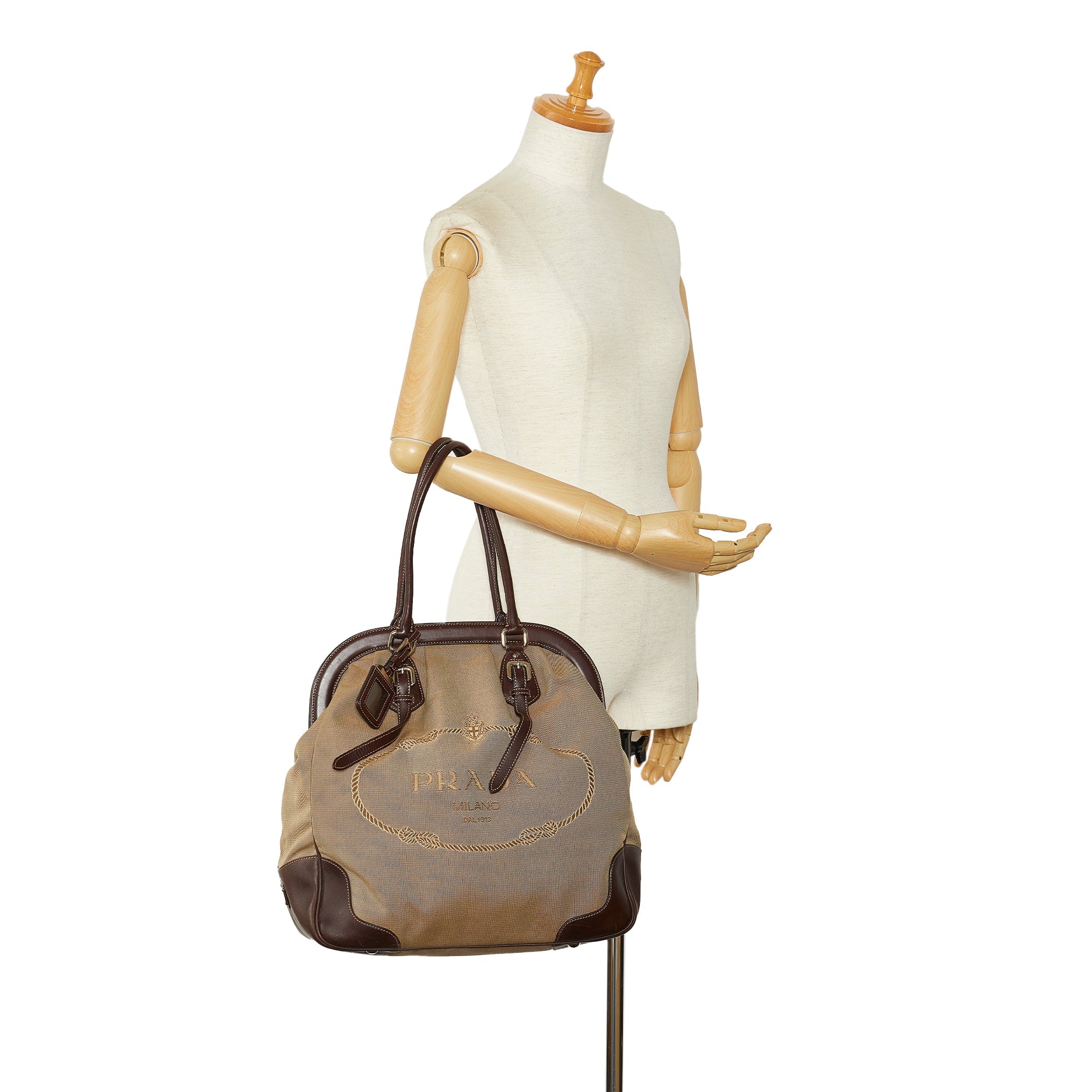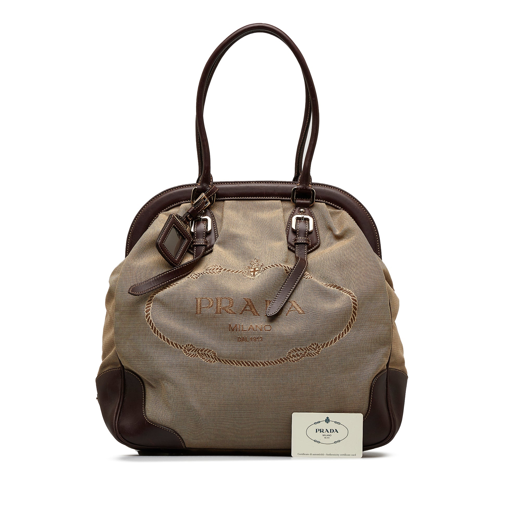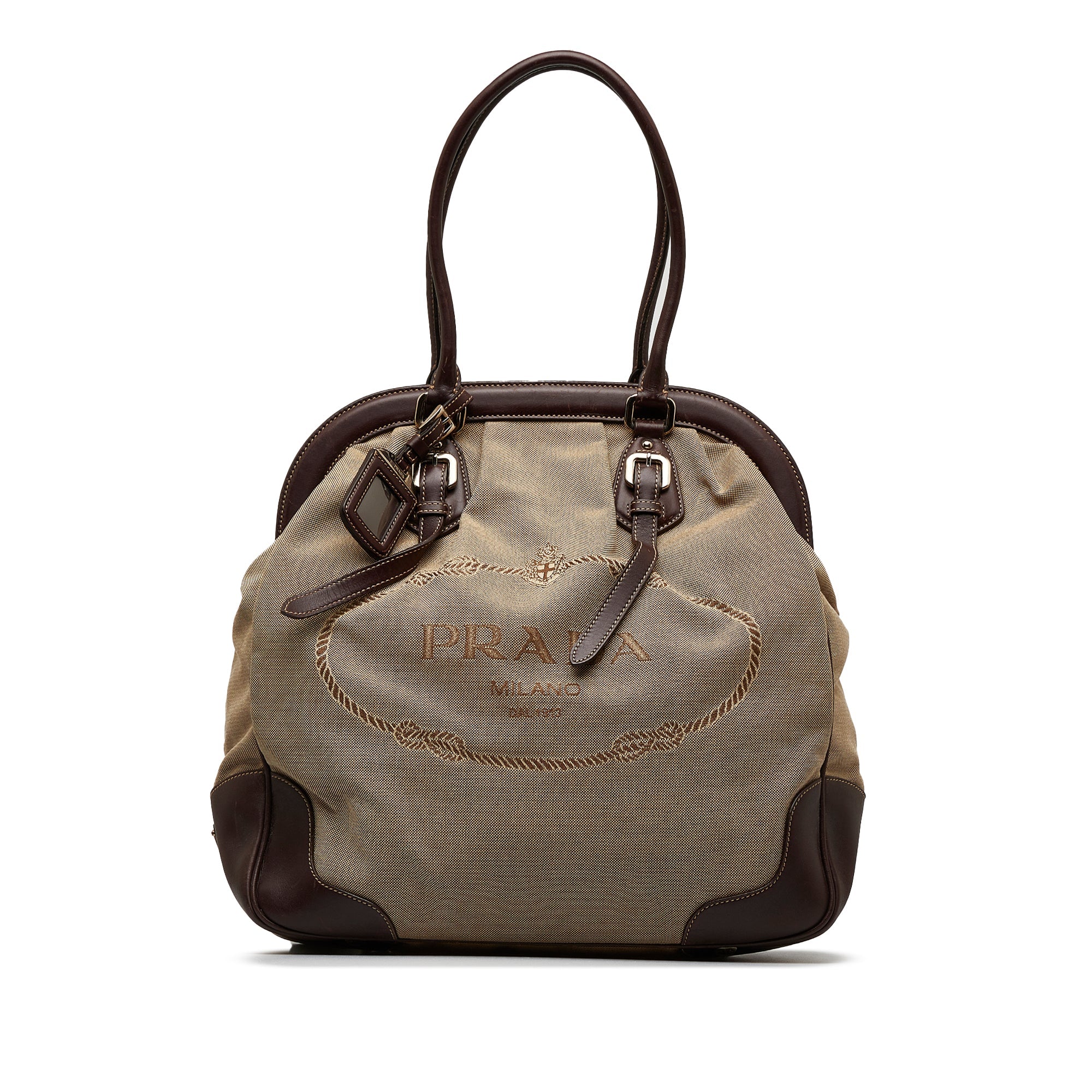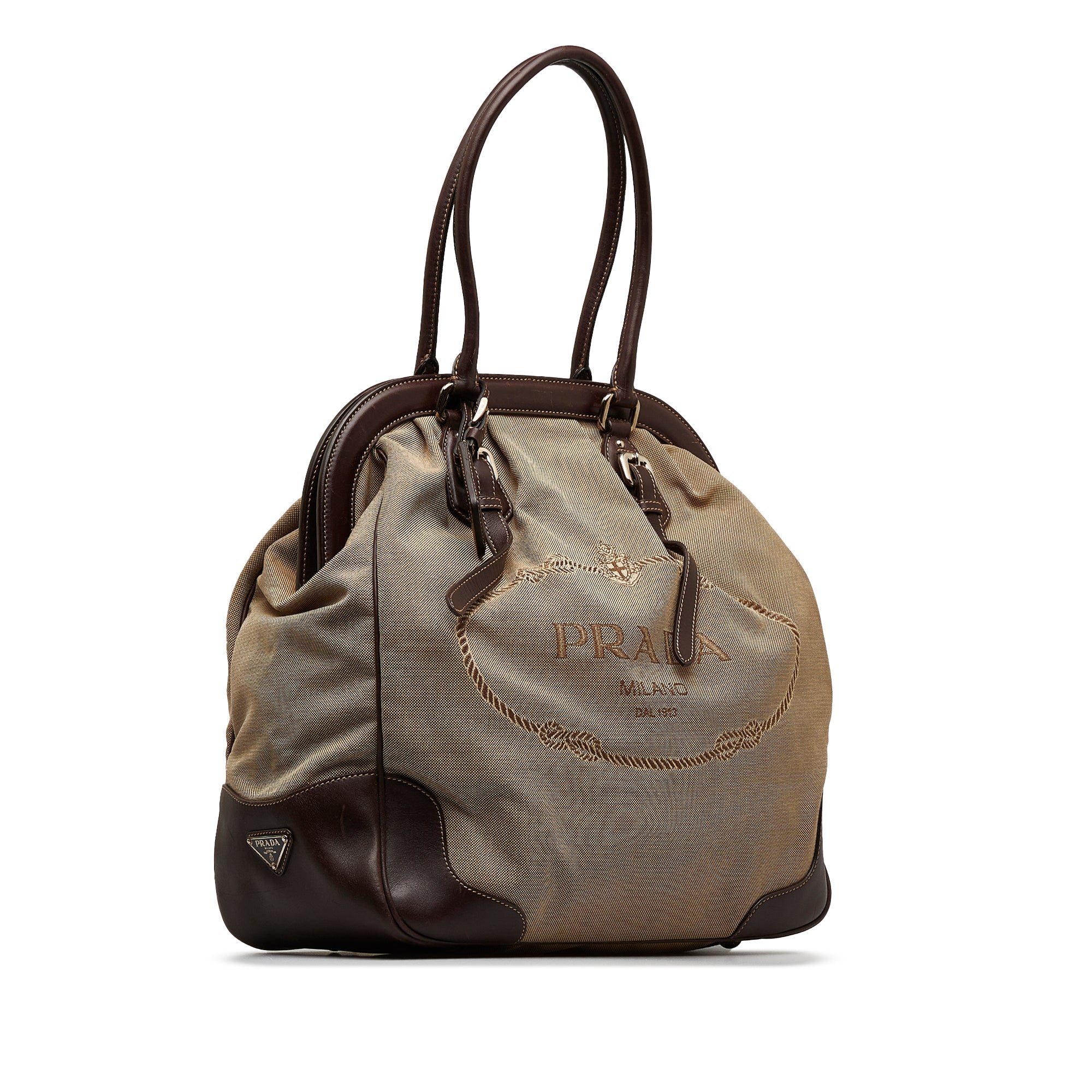 Product Details: Brown Prada Canapa Logo Frame Tote Bag. This tote bag features a canvas body with leather trim, rolled leather handles, a frame with magnetic closure, and an interior zip pocket. 14.2″ L x 13.2″ W x 5.3″ D, 4.9″ drop. Serial number BR3511.