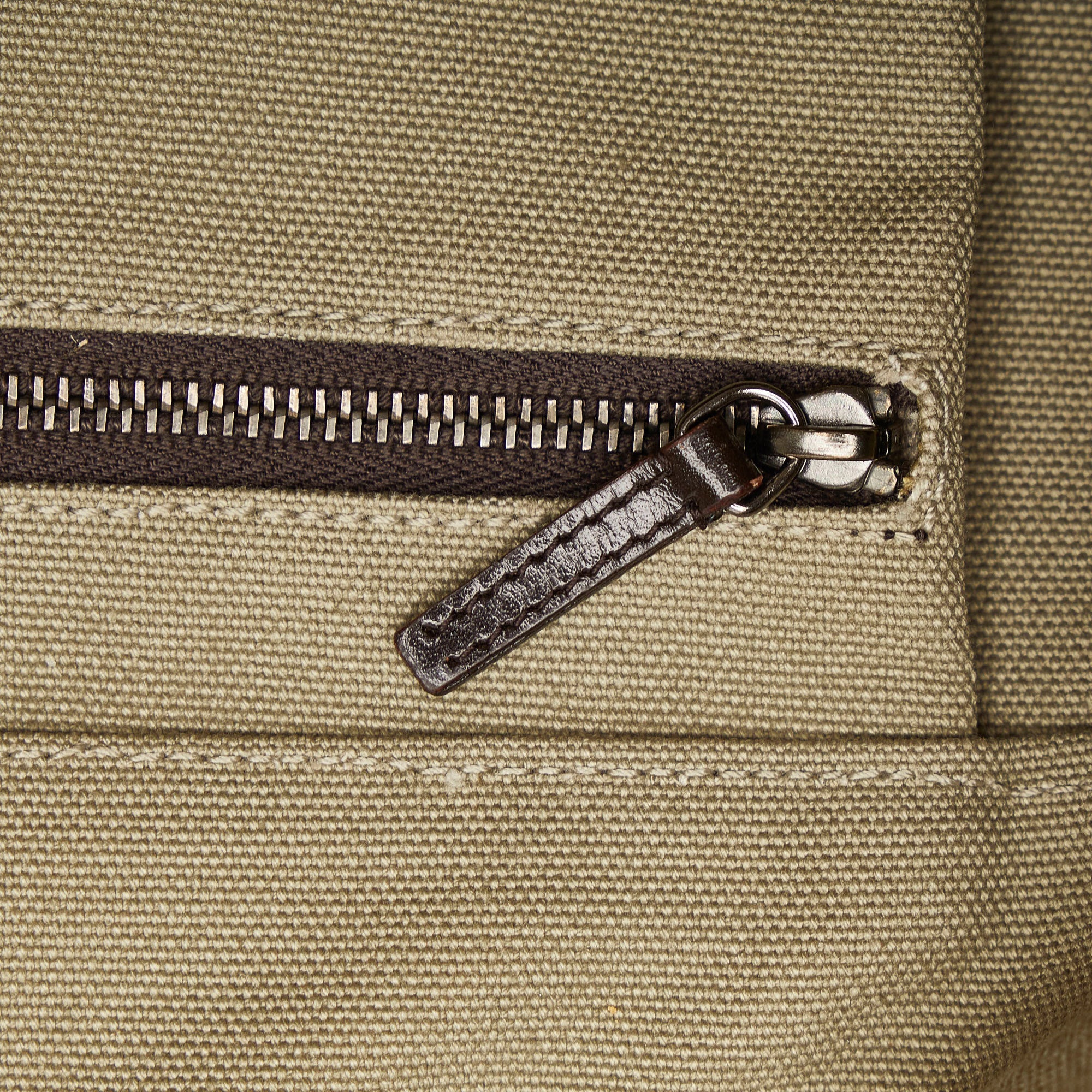 Product Details: Brown Prada Canvas Tote Bag. This tote bag features a canvas body with leather trim, rolled leather handles, a top zip closure, and an interior zip pocket. 12.6″ L x 15.7″ W x 0.4″ D, 5.1″ drop.