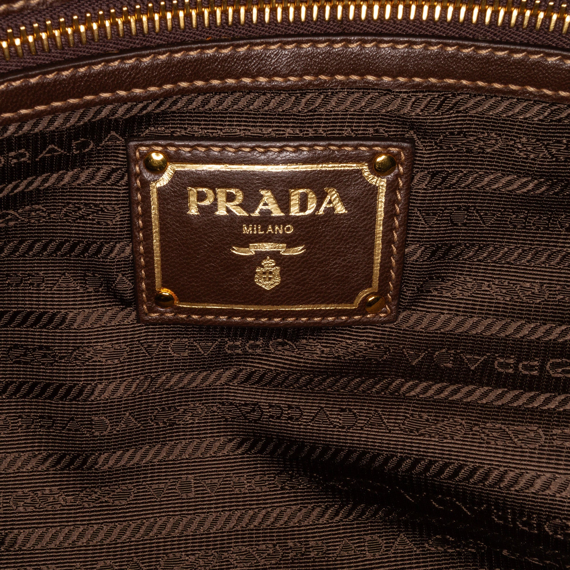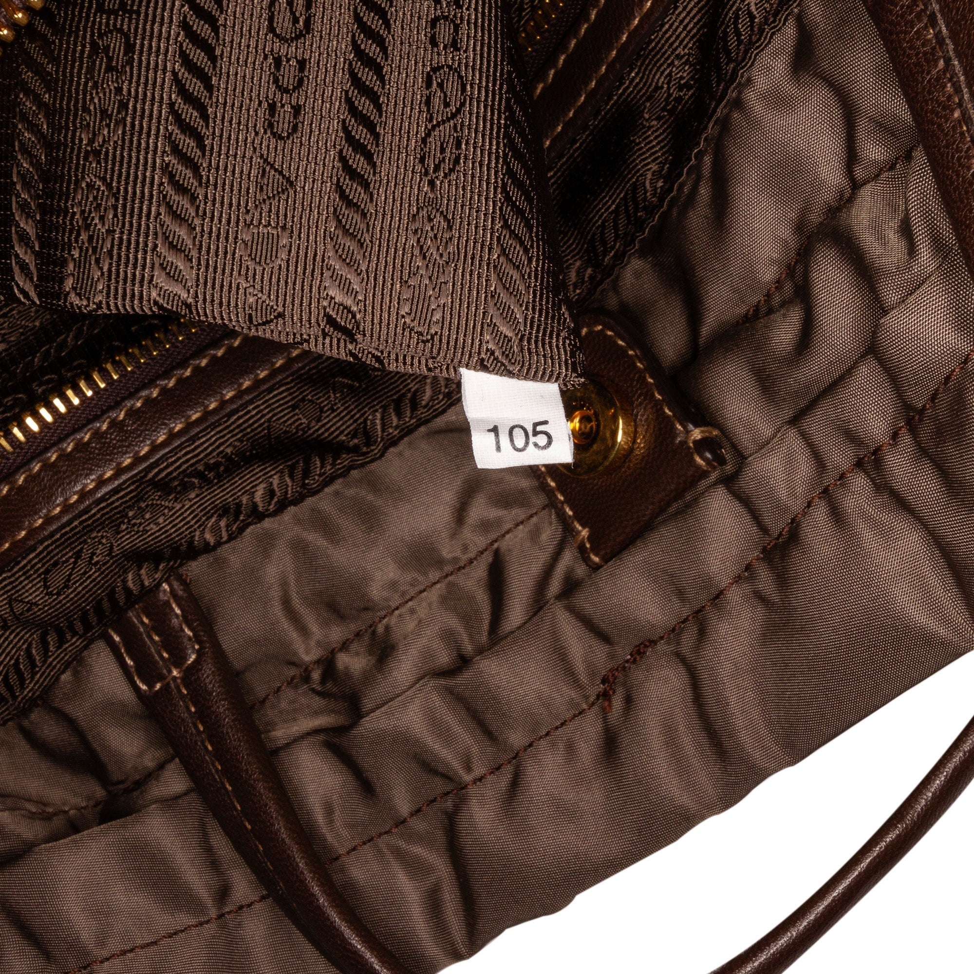Product Details: Brown Prada Logo Tessuto Drawstring Tote Bag. This tote bag features a nylon body, flat leather straps, a drawstring closure, and an interior zip pocket. 13.8″ L x 12.2″ W x 3.9″ D, 7.9″ drop. Serial number 105.