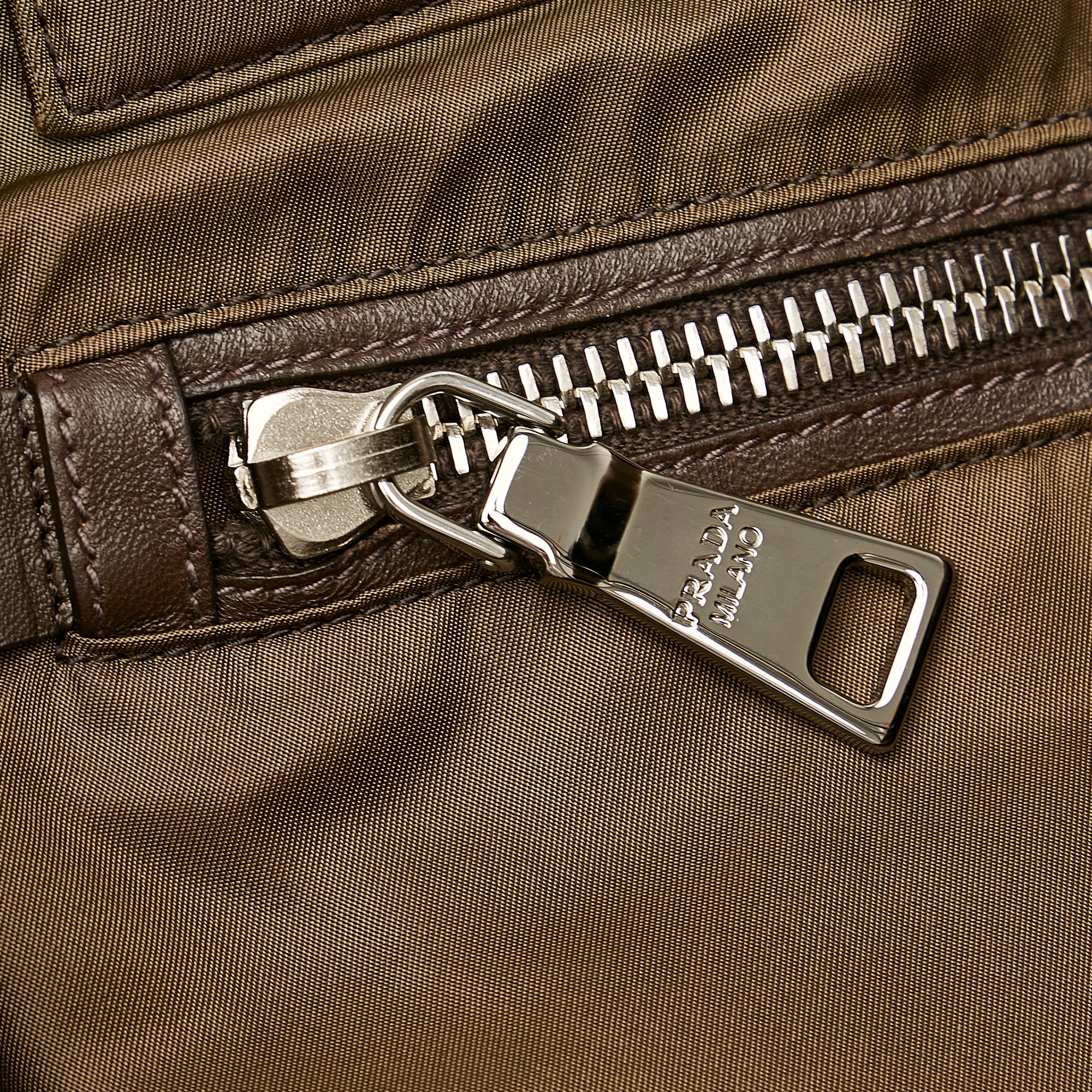 Product Details: Brown Prada Tessuto Reversible Tote Bag. This tote bag features a nylon body, rolled handles, a detachable flat shoulder strap, an open top, an exterior front zip pocket, and an interior zip pocket. 14.6″ L x 16.1″ W x 6.9″ D.