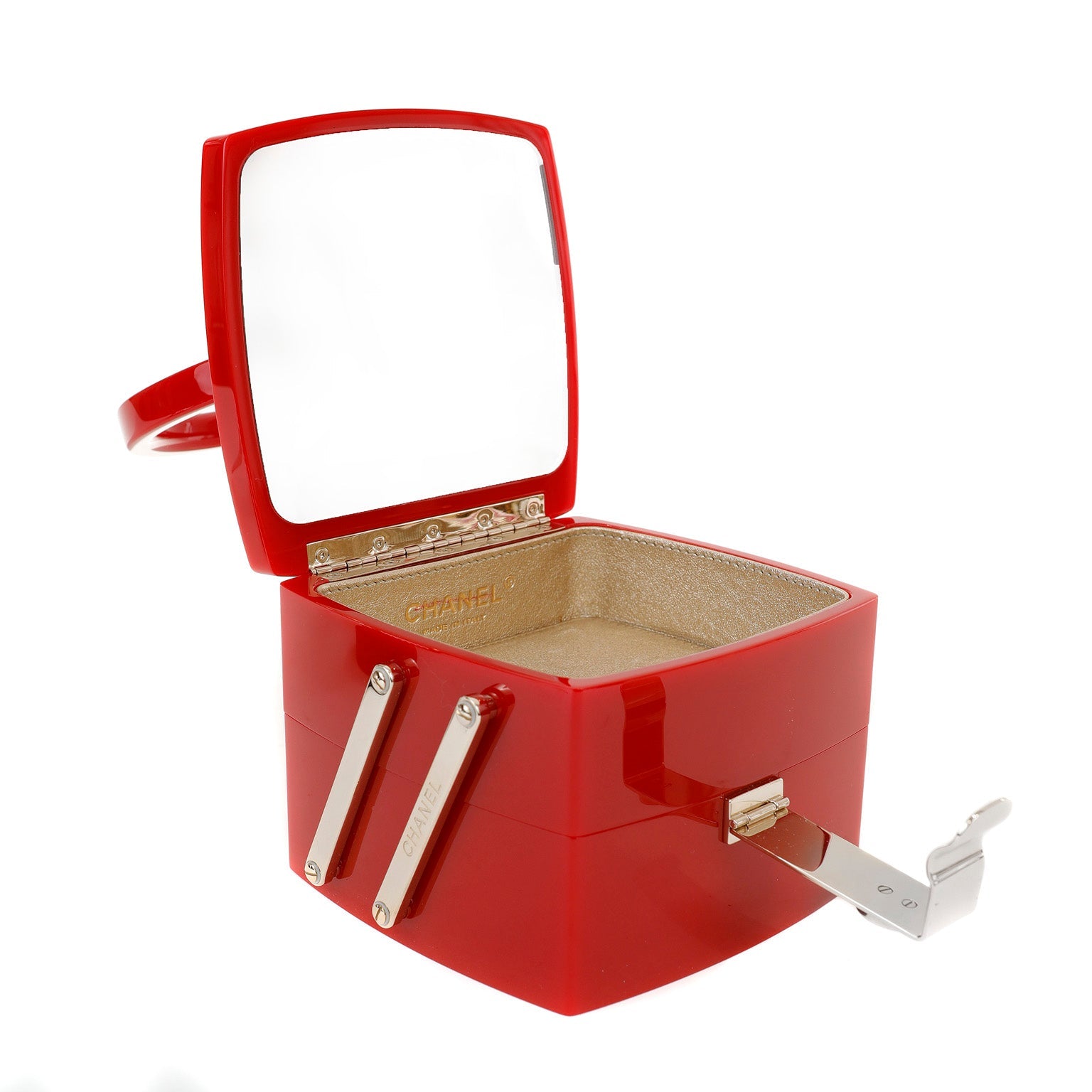 This Chanel Red Lucite Devil Wears Prada Evening Bag is a Runway piece in pristine condition. Lipstick red Lucite with shiny silver hardware. Hinged top with round handle. Dust bag included.