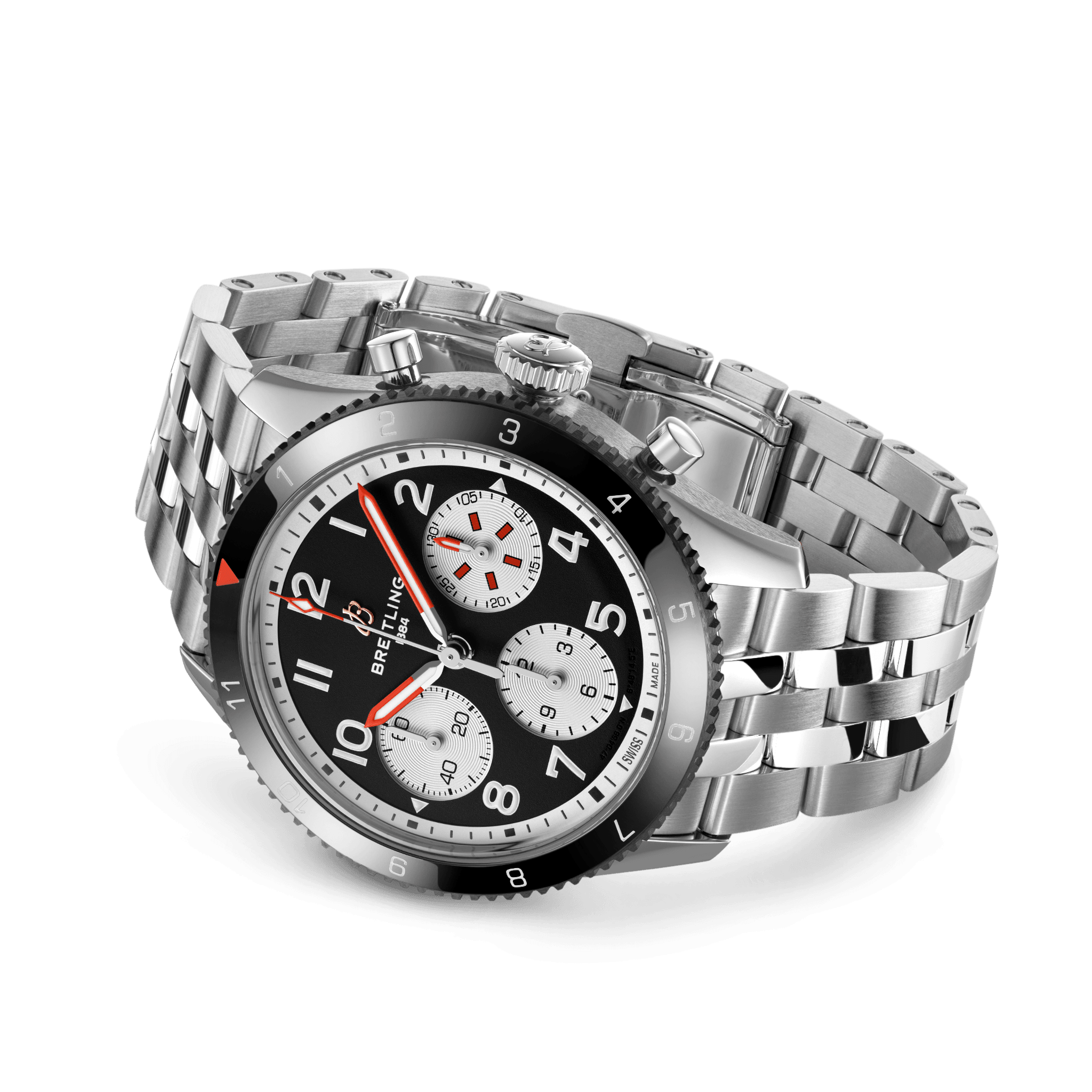 As a true pilot’s watch designed to withstand the rigors of a vintage cockpit, the Classic AVI Mosquito features large, highly legible Arabic numerals on the dial and bezel. The knurled bezel on the 42mm case provides optimal grip, even in a pilot’s gloved hands. Top-stitched calfskin straps give a nod to the seams found on classic flight gear, while the stainless-steel bracelet provides an elegant alternative. Pilots and other travelers will appreciate its legibility, wearability, and understated style. The engine of the Classic AVI is the COSC-certified Breitling Caliber 23 movement, which provides approximately 48-hours of power reserve.