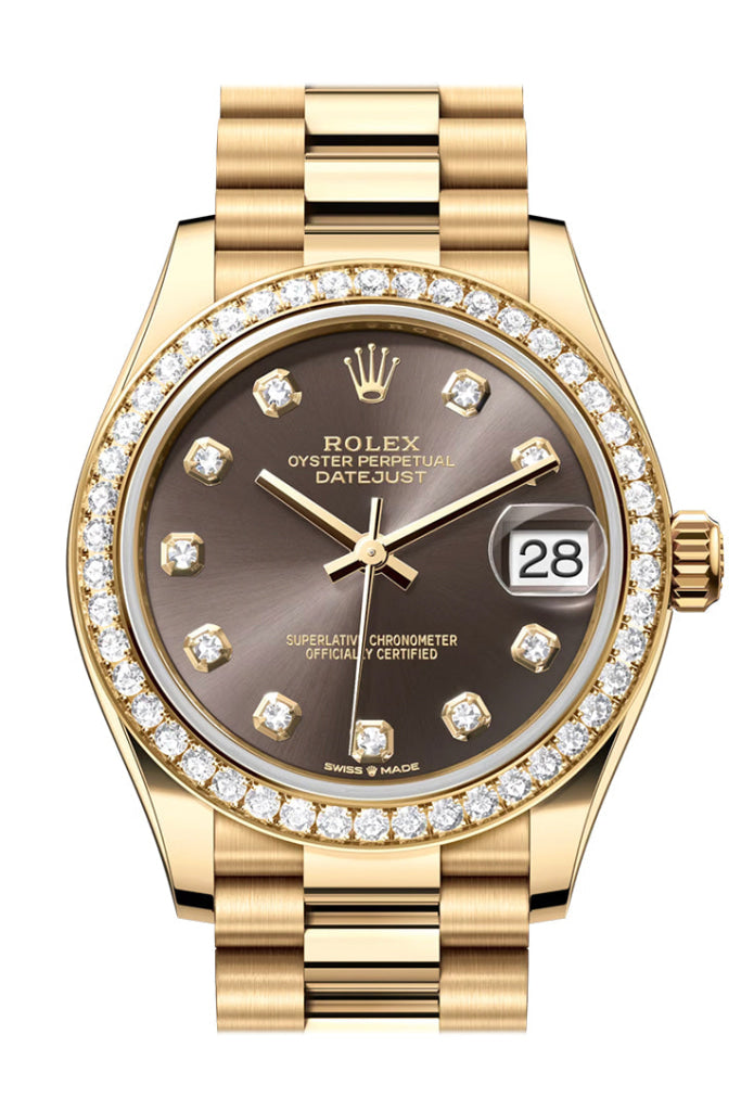 18kt yellow gold case with a 18kt yellow gold president bracelet. Fixed, fluted bezel with diamond set. Dark Grey Diamond dial with yellow gold hands. Dial Type: Analog. Date display at the 3 o’clock position. Calibre 2236 Automatic movement, based upon 2235, containing 31 Jewels, bitting at 28800 vph, and has a power reserve of approximately 55 hours. Scratch resistant sapphire crystal. Screw down crown. Solid case back. Round case shape, case size: 31 mm. Concealed folding crown clasp. Water resistant at 100 meters / 330 feet. Functions: date, hour, minute, second. Additional Info: dial set with 24 diamonds in 18 ct gold settings. Datejust 31 Series. Luxury watch style. Watch label: Swiss Made. Datejust 31 Olive-Green Diamond Dial Automatic Ladies 18kt Yellow Gold President Watch