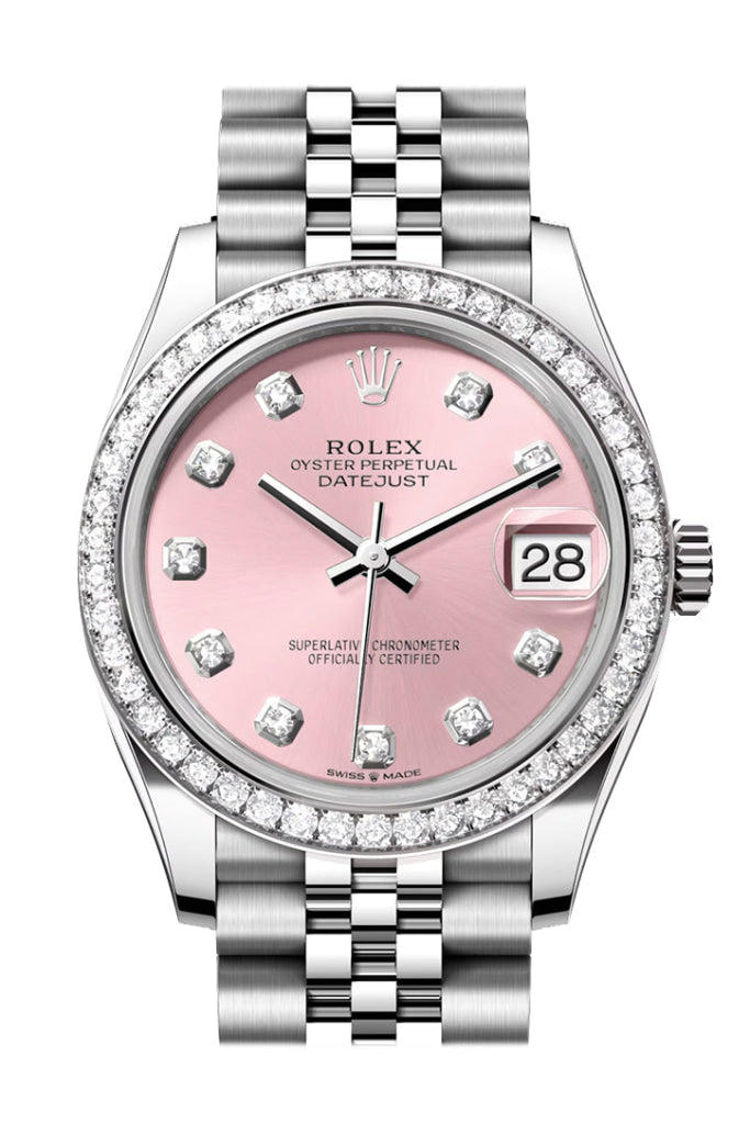 stainless steel/18k white gold case with a silver-tone stainless steel jubilee bracelet. Silver-tone diamond set bezel. Pink Diamond dial with silver-tone hands and Diamond numeral hour markers. Dial Type: Analog. Date display at the 3 o’clock position. Calibre 2236 Automatic movement, based upon 2235, containing 31 Jewels, bitting at 28800 vph, and has a power reserve of approximately 55 hours. Scratch resistant sapphire crystal. Screw down crown. Screw-down case back. Round case shape, case size: 31 mm. Folding clasp. Water resistant at 100 meters / 330 feet. Functions: date, hour, minute, second. Datejust 31 Series. Dress watch style. Watch label: Swiss Made. Datejust 31 Automatic Diamond Ladies Watch
