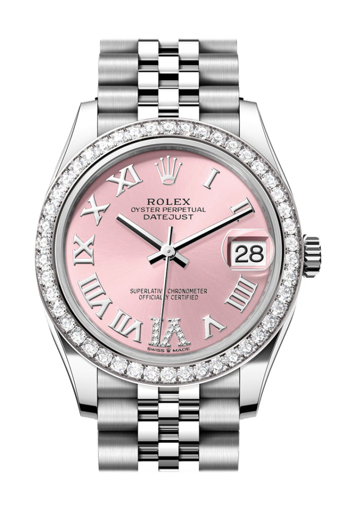 stainless steel/18k white gold case with a silver-tone stainless steel jubilee bracelet. Silver-tone diamond set bezel. Pink dial with silver-tone hands and Roman numeral hour markers. Dial Type: Analog. Date display at the 3 o’clock position. Calibre 2236 Automatic movement, based upon 2235, containing 31 Jewels, bitting at 28800 vph, and has a power reserve of approximately 55 hours. Scratch resistant sapphire crystal. Screw down crown. Screw-down case back. Round case shape, case size: 31 mm. Folding clasp. Water resistant at 100 meters / 330 feet. Functions: date, hour, minute, second. Datejust 31 Series. Dress watch style. Watch label: Swiss Made. Datejust 31 Automatic Diamond Ladies Watch
