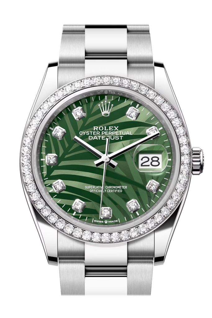 Stainless steel case with a stainless steel jubilee bracelet. Fixed stainless steel bezel set with diamonds. Green palm Motif dial with luminous silver-tone hands and Diamond hour markers. Minute markers around the outer rim. Dial Type: Analog. Luminescent hands and markers. Date display at the 3 o’clock position. calibre 3235 automatic movement, based upon 3035, containing 31 Jewels, bitting at 28800 vph, and has a power reserve of approximately 70 hours. Scratch resistant sapphire crystal. Screw down crown. Solid case back. Round case shape. Case size: 36 mm. Fold over clasp. Water resistant at 100 meters / 330 feet. Functions: date, hour, minute, second. Datejust 36 Series. Luxury watch style. Watch label: Swiss Made. Datejust 36 Silver Dial Automatic Jubilee Watch
