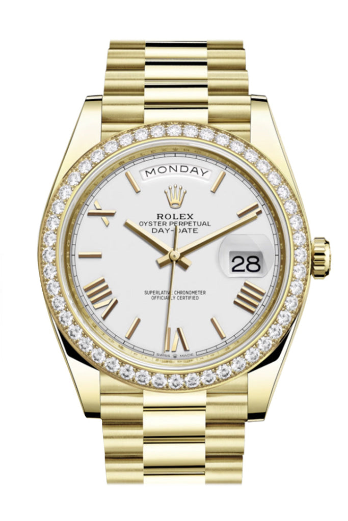Day-Date 40 White Roman Dial Diamond Bezel 18K Yellow Gold President Automatic Men's Watch 228348Day-Date 40 White Roman Dial Diamond Bezel 18K Yellow Gold President Automatic Men’s Watch 228348