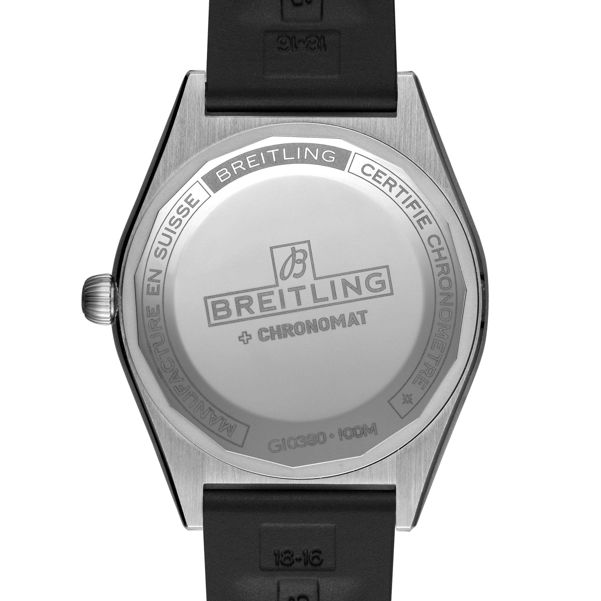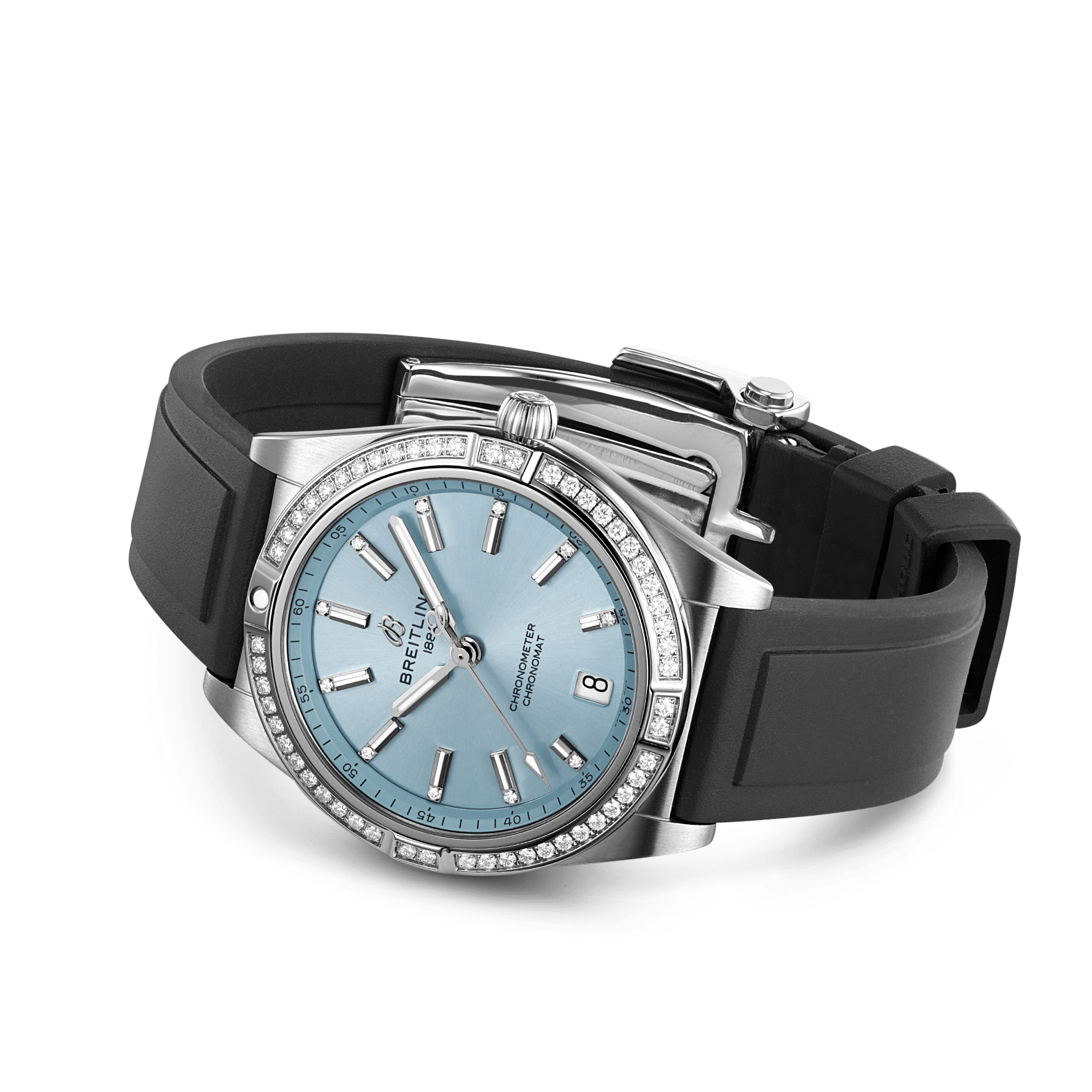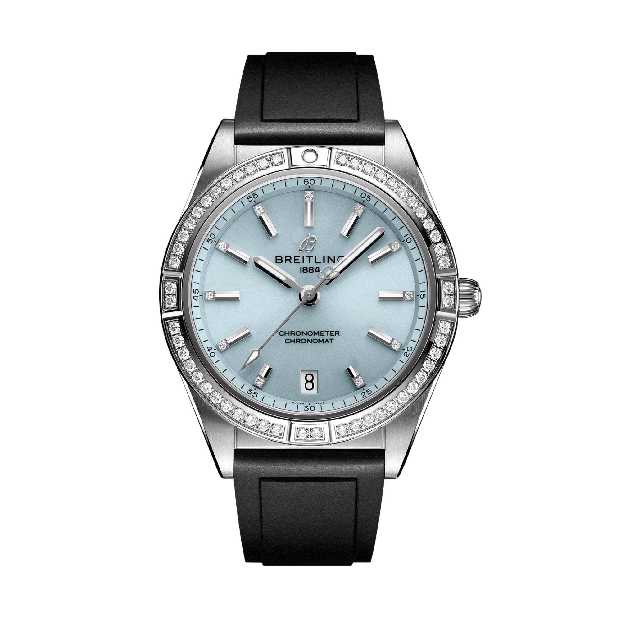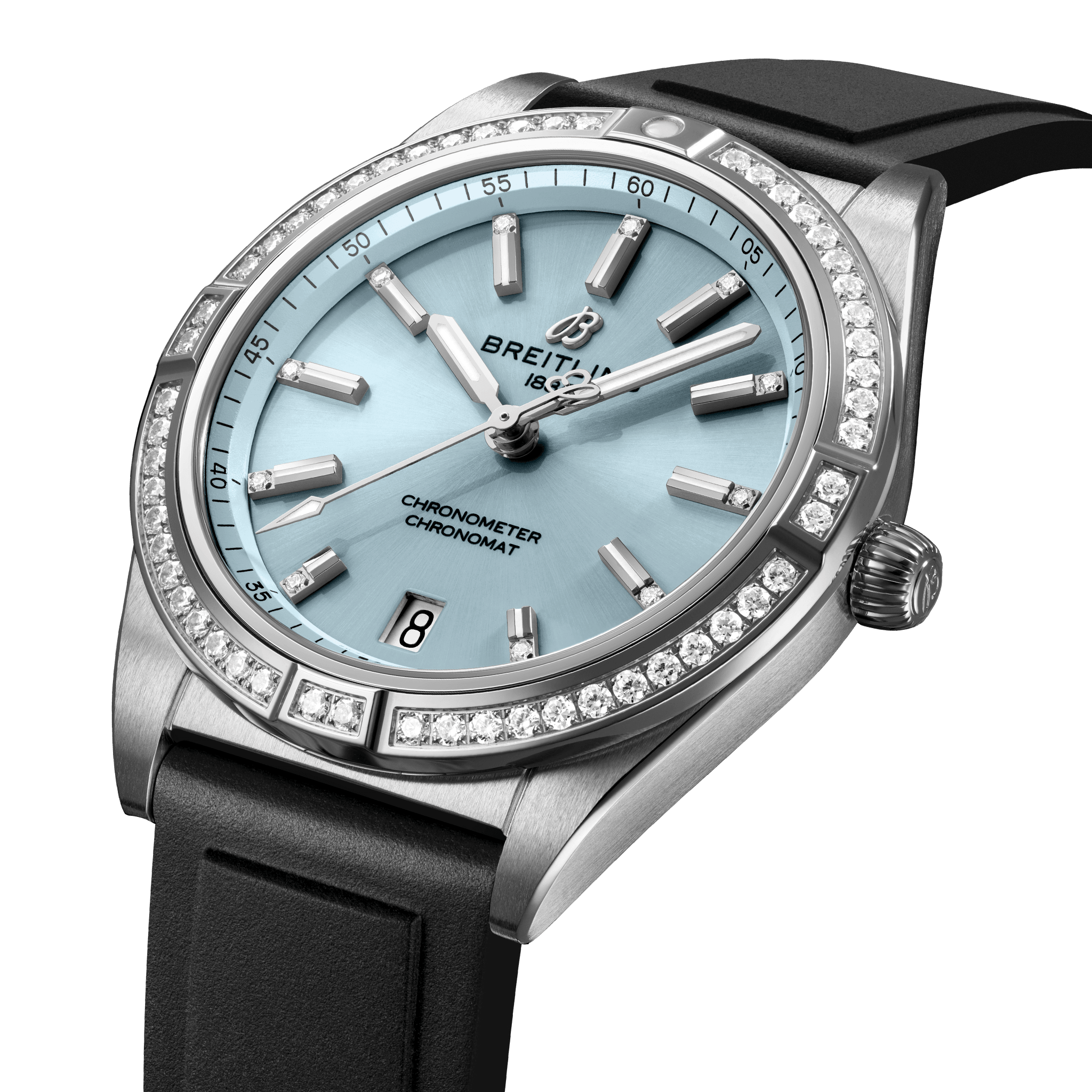 Stylish yet elegant, the modern-retro inspired Chronomat Automatic 36 is the versatile sporty and chic watch for any occasion. This specific Chronomat Automatic 36 features a stainless steel case with an 18k grey gold gem-set bezel matched to an Ice Blue dial. Available with a rubber strap only, this Chronomat is powered by the Breitling Caliber 10, a COSC-certified chronometer.